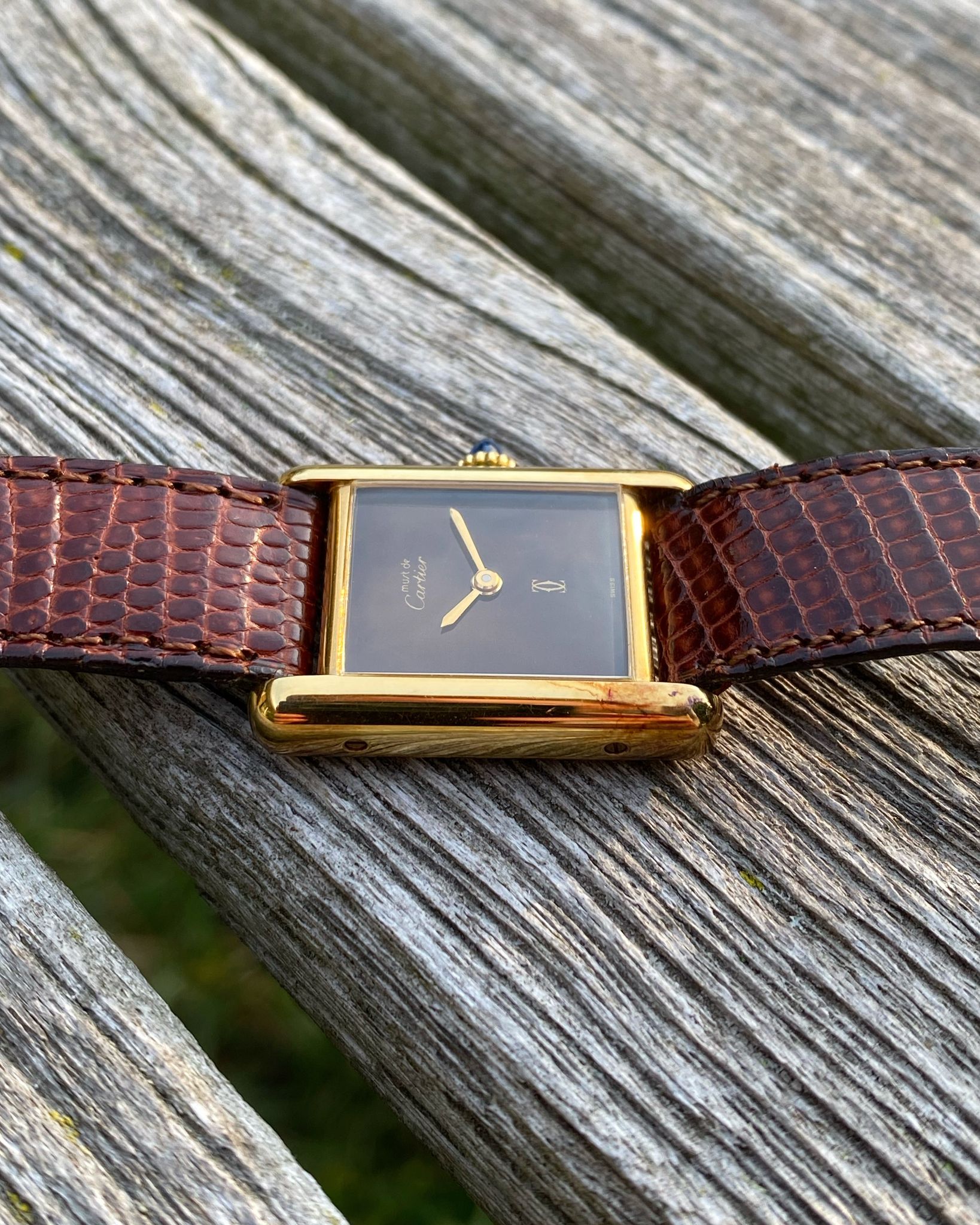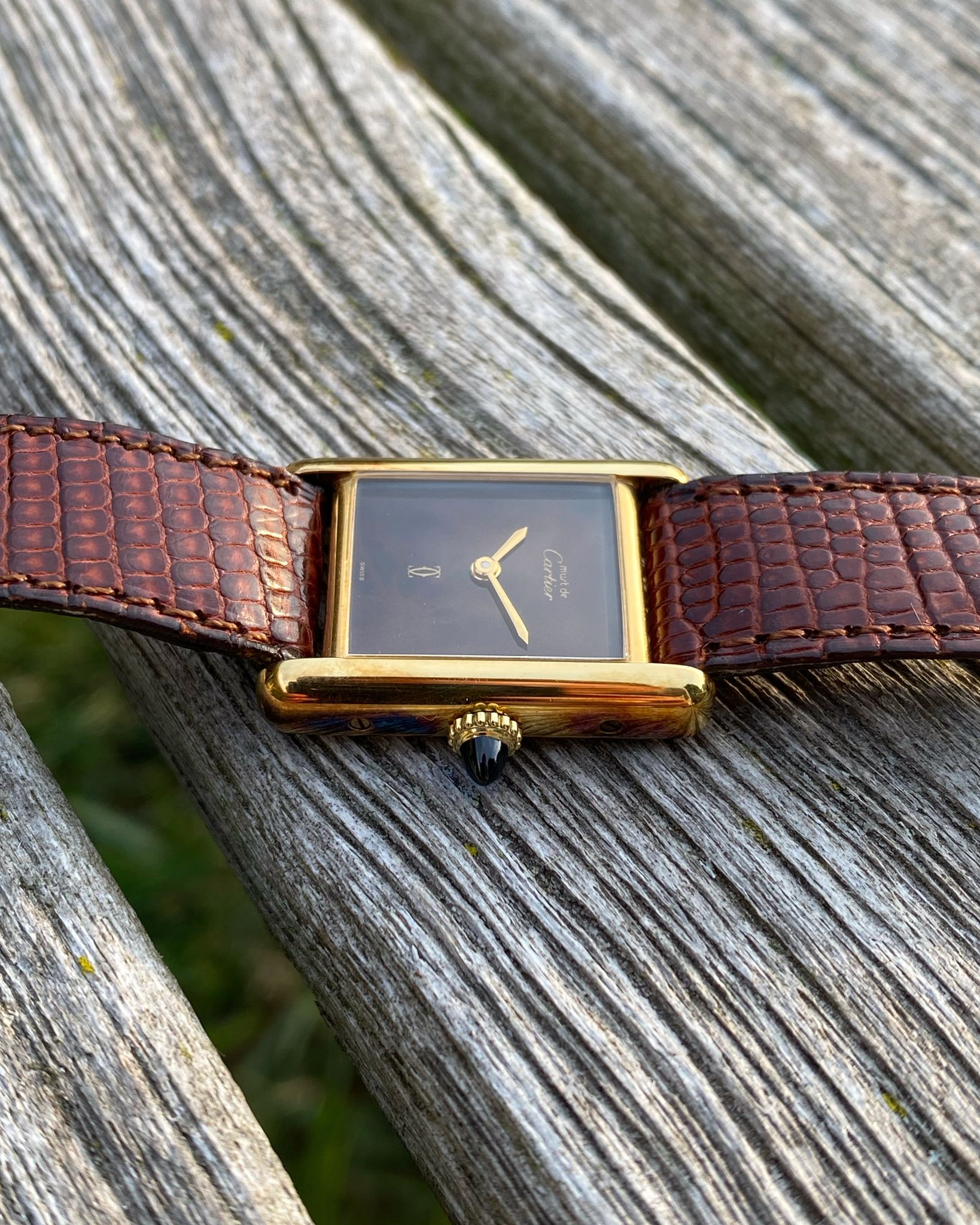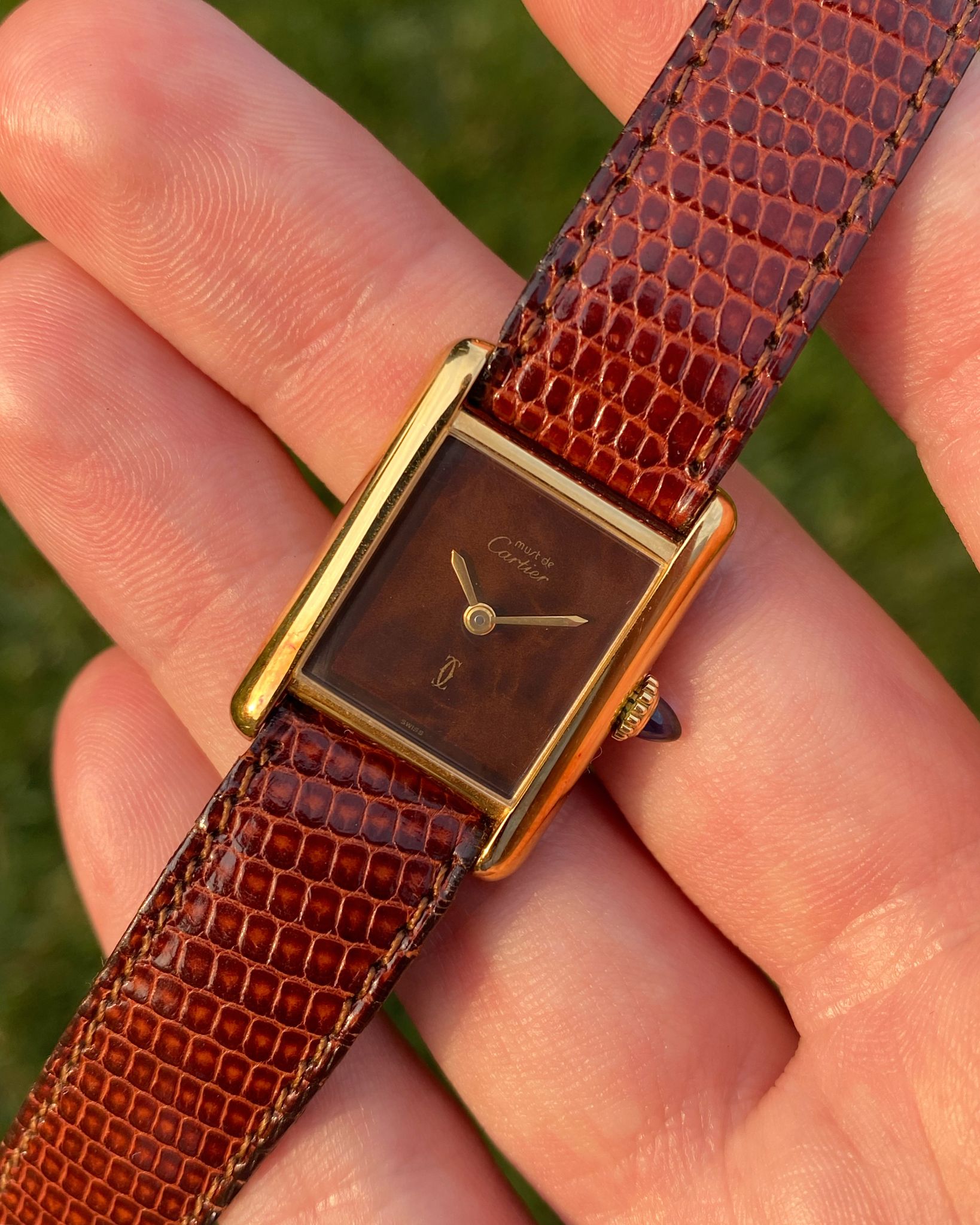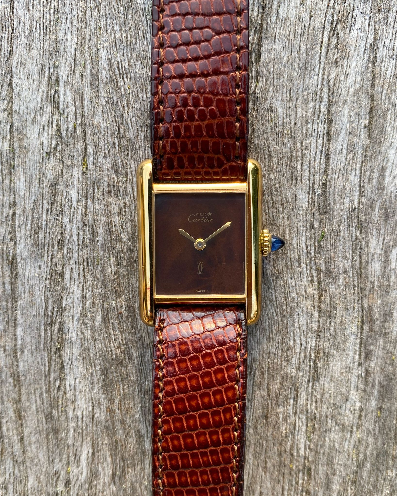 The Cartier features a gold plated 925 solid sterling silver Vermeil case, which is fitted with a gold cabochon sapphire cabochon set crown. Those with a keen eye will note the seldom-seen long cabochon crown, a style commonly found on Tank Louis models of the era and, on rare occasions, factory-fitted to early Vermeils due to their shared case architecture. The tank is mounted on its original red-undertoned mahogany brown colored lizard skin Cartier strap, which is secured by its original gold plated Cartier ardillon tang buckle. The Tank Vermeil features a rare ‘turtle shell’ brown lacquered wood dial, which is accented by polished gold hands. The Tank uses a manual wind movement, which is running as it should.