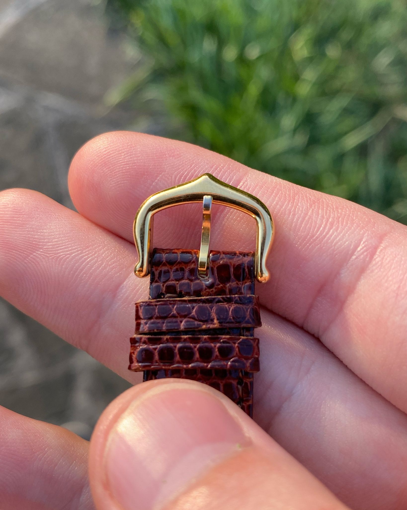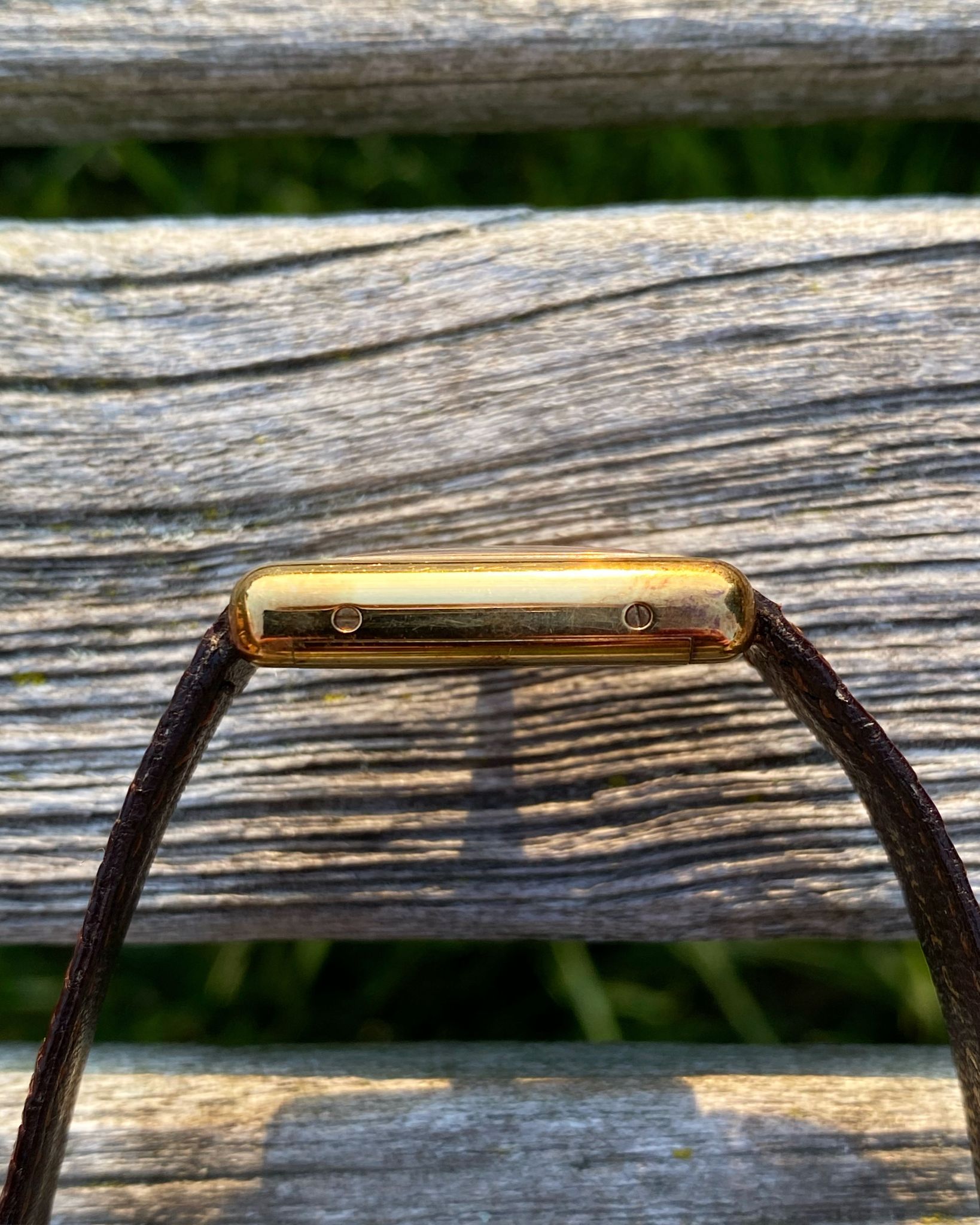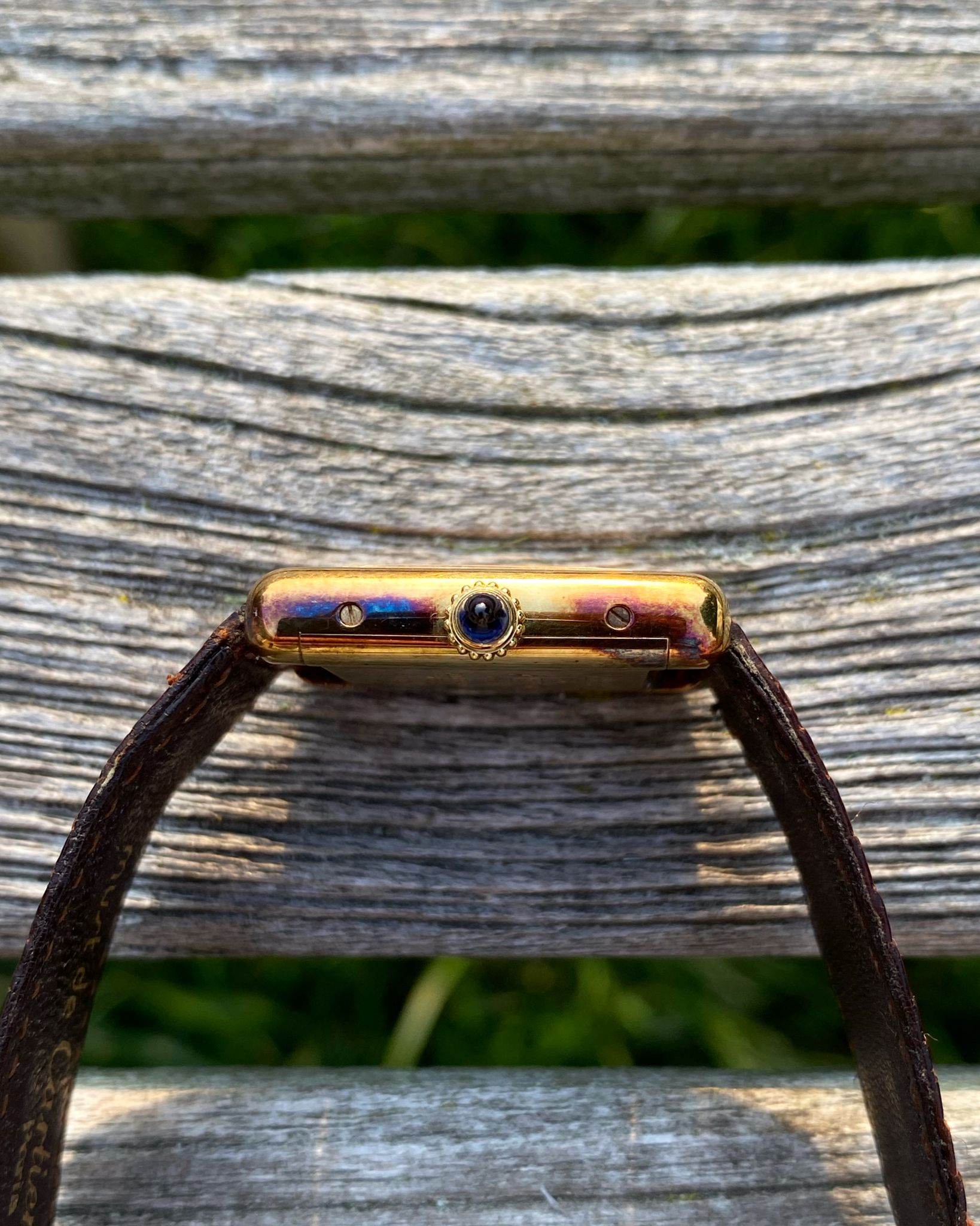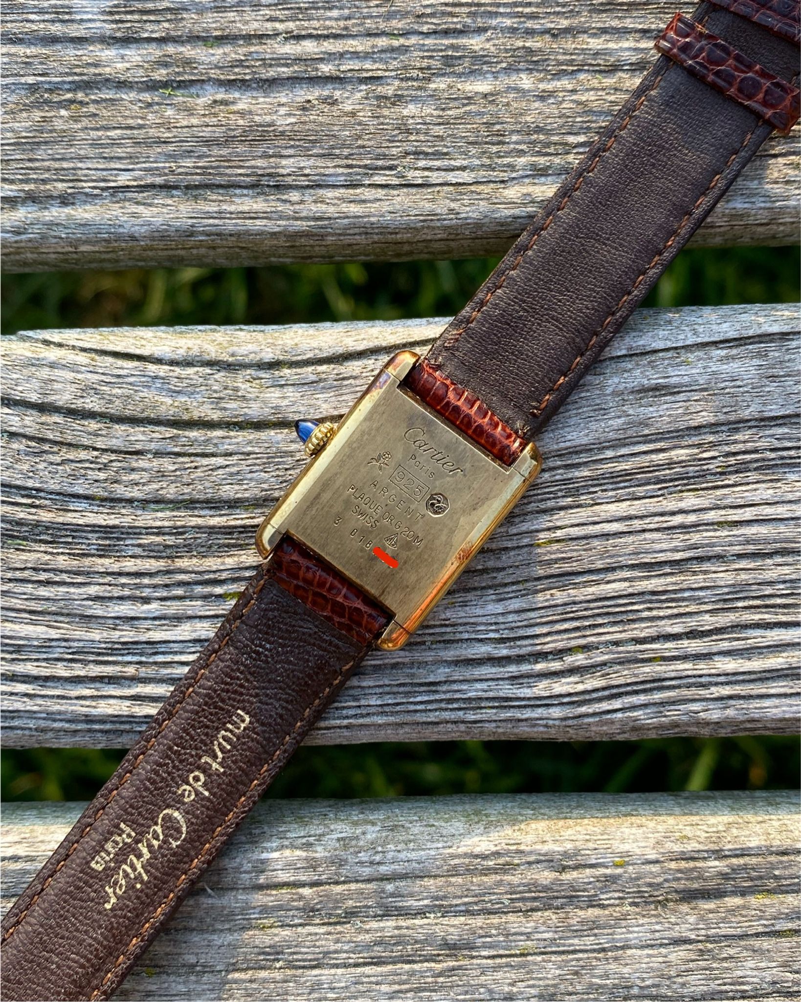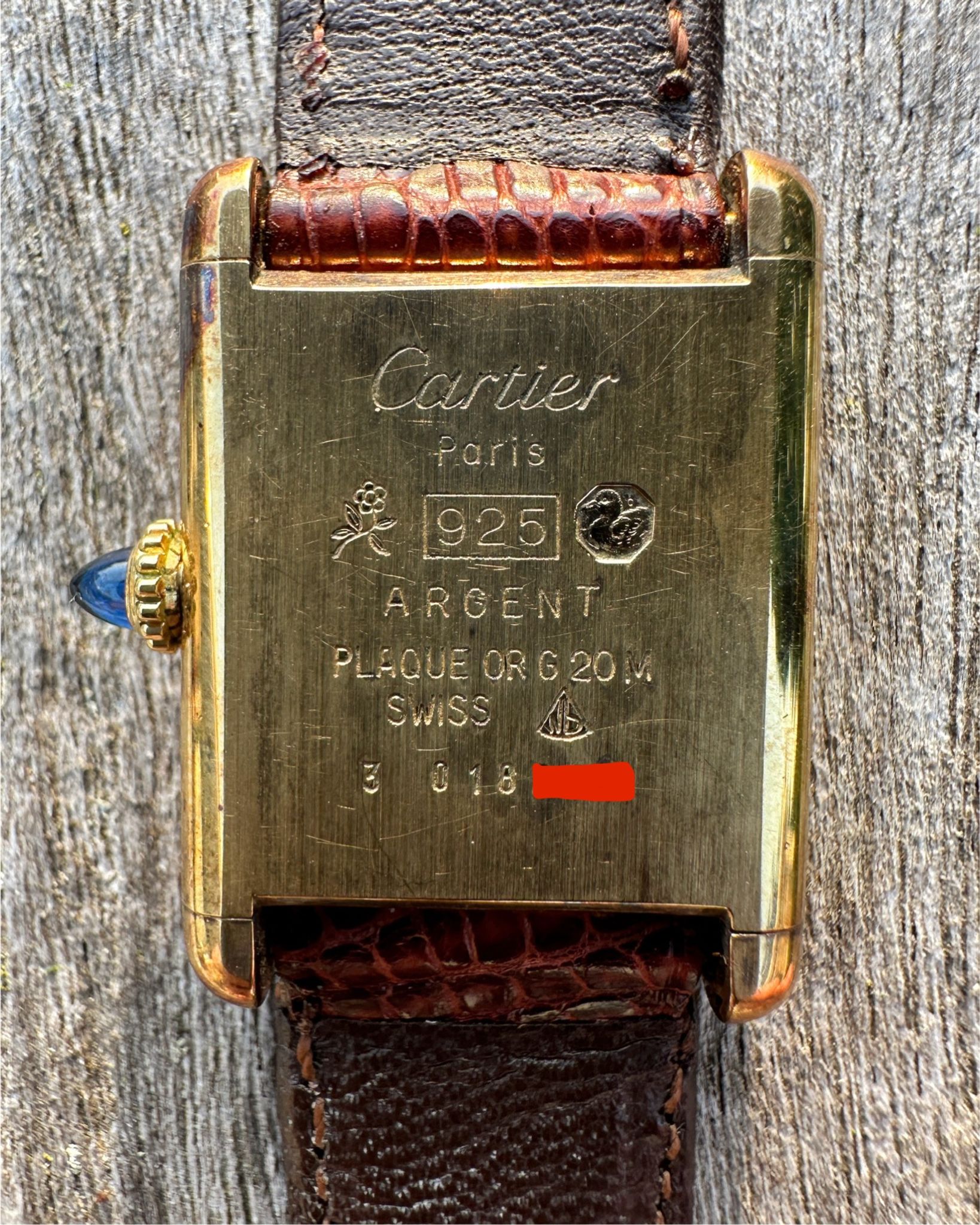 The Cartier features a gold plated 925 solid sterling silver Vermeil case, which is fitted with a gold cabochon sapphire cabochon set crown. Those with a keen eye will note the seldom-seen long cabochon crown, a style commonly found on Tank Louis models of the era and, on rare occasions, factory-fitted to early Vermeils due to their shared case architecture. The tank is mounted on its original red-undertoned mahogany brown colored lizard skin Cartier strap, which is secured by its original gold plated Cartier ardillon tang buckle. The Tank Vermeil features a rare ‘turtle shell’ brown lacquered wood dial, which is accented by polished gold hands. The Tank uses a manual wind movement, which is running as it should.