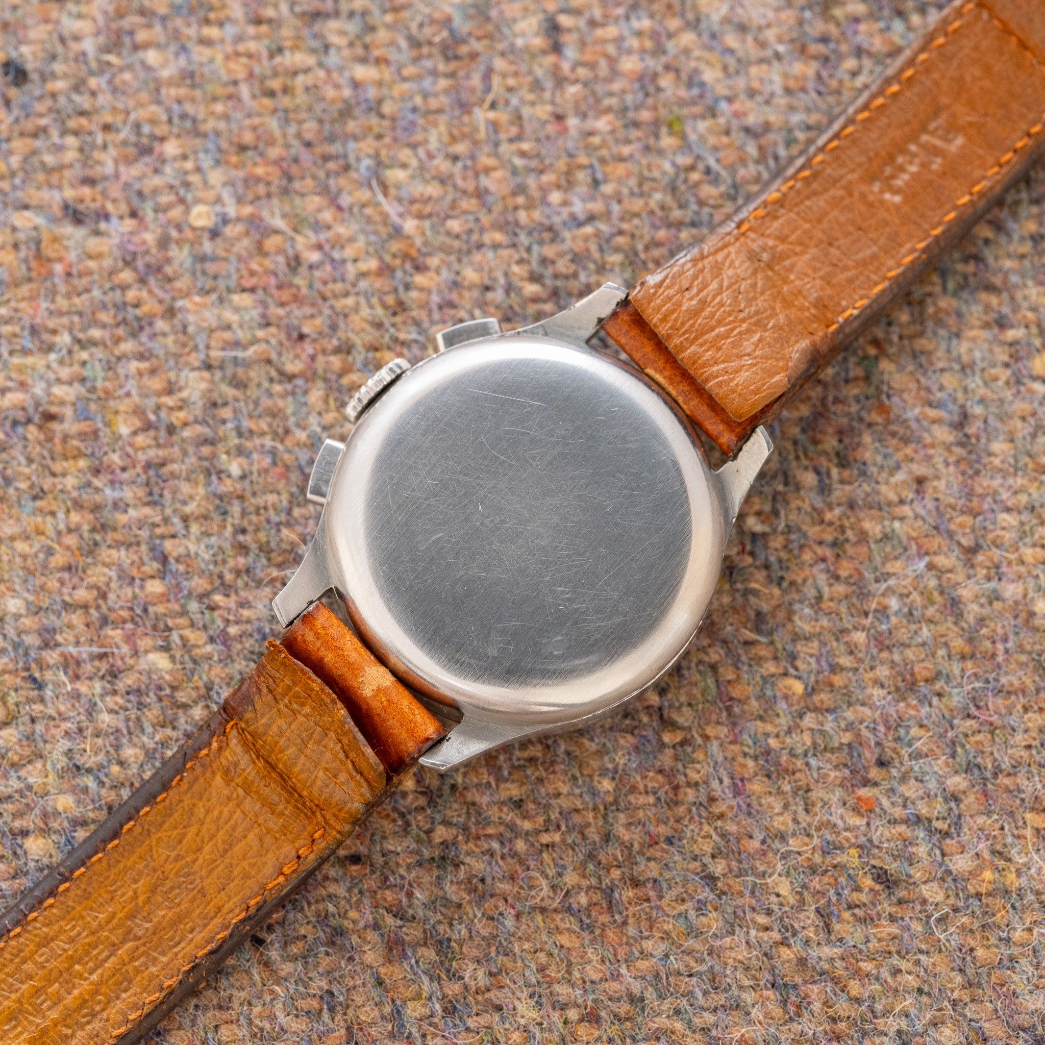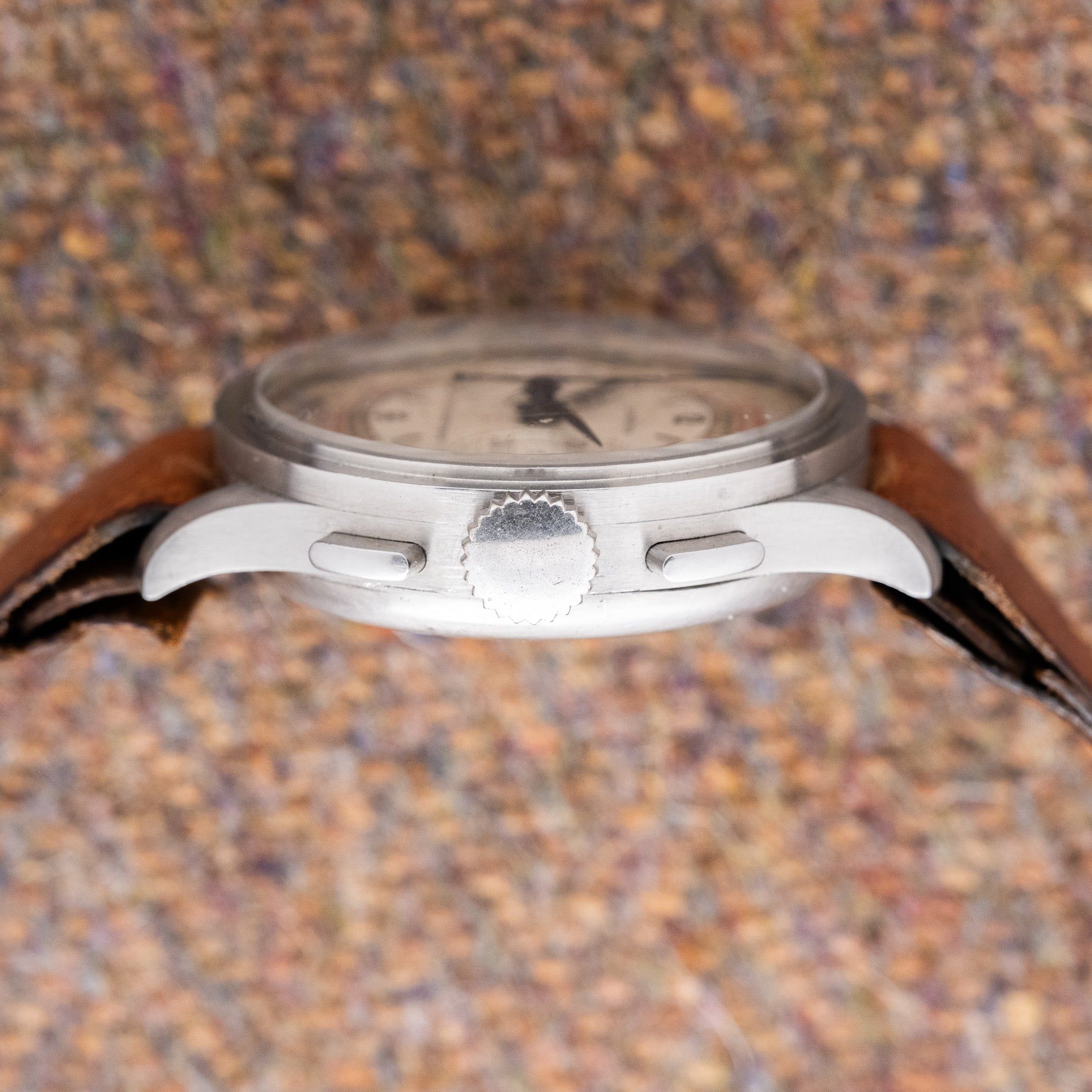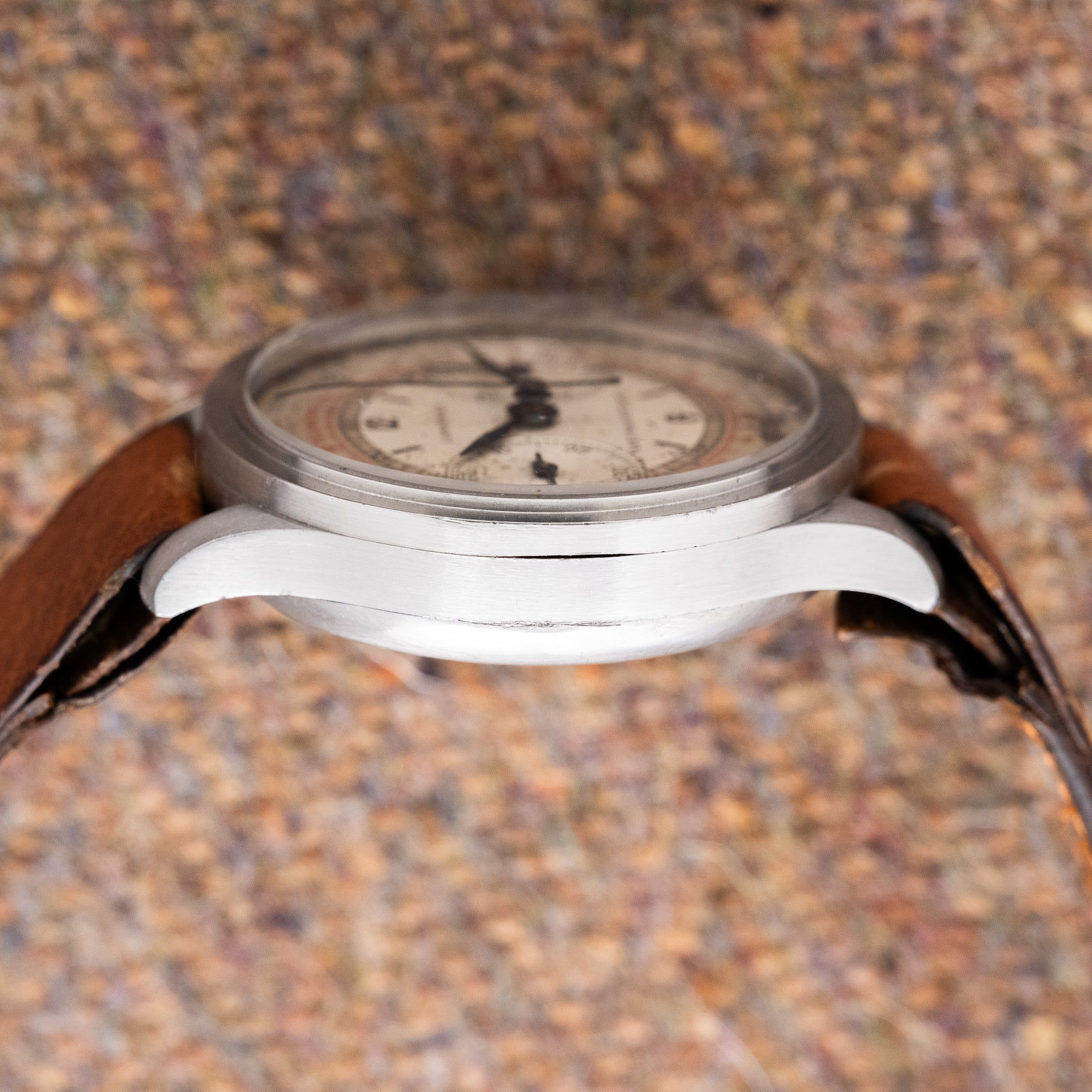 Dial: The original dial is untouched and is still in nice shape. With a two-tone finish and the classic red and blue chronograph indicators, this original dial embodies the 1940s war era design.