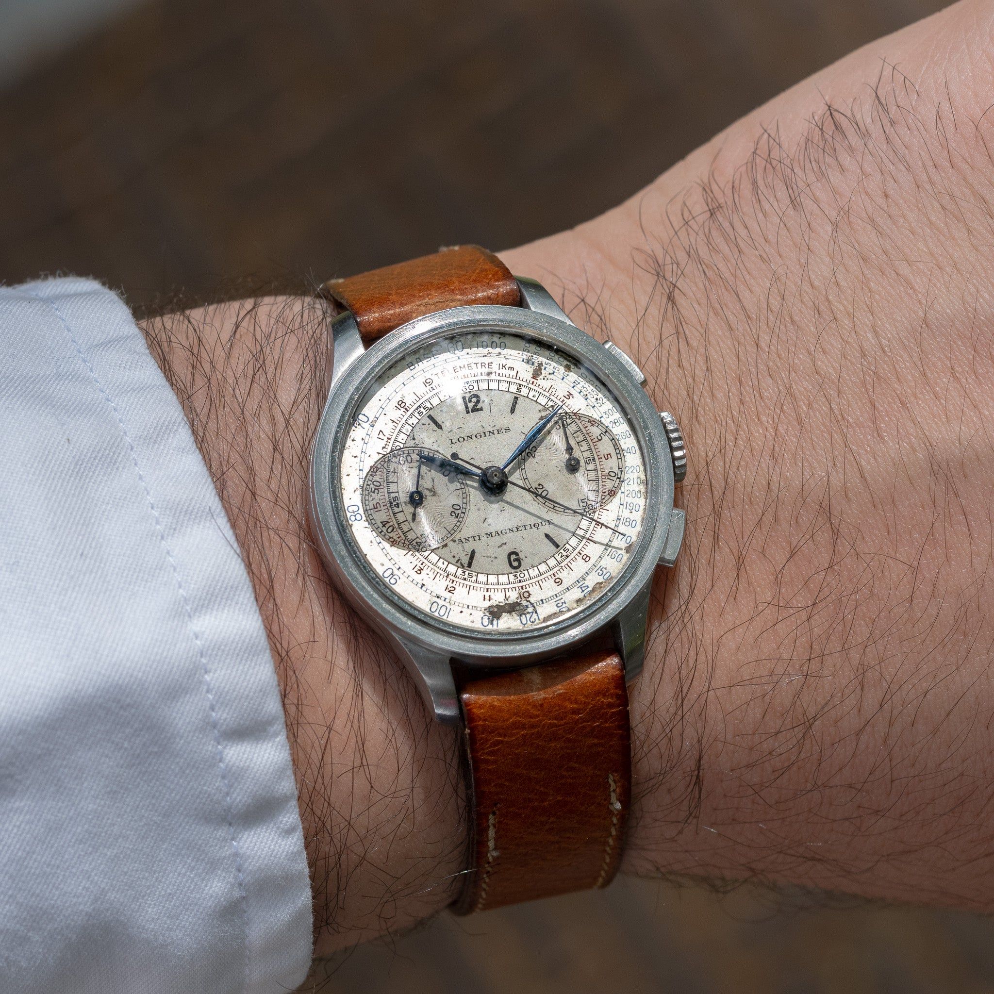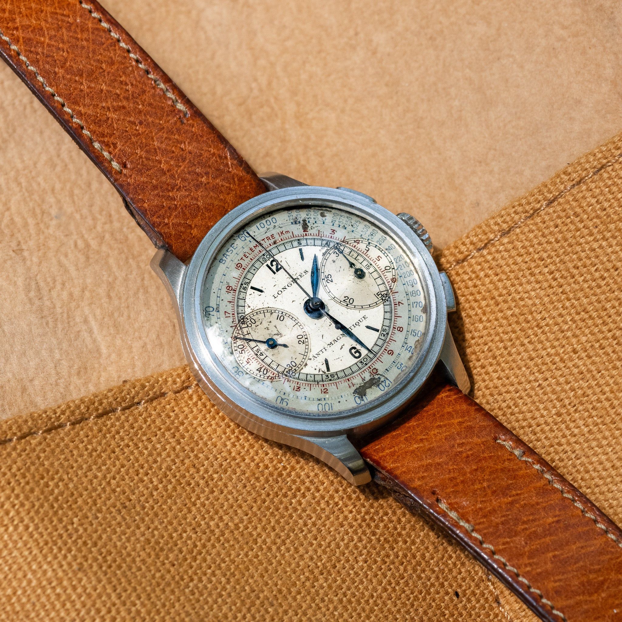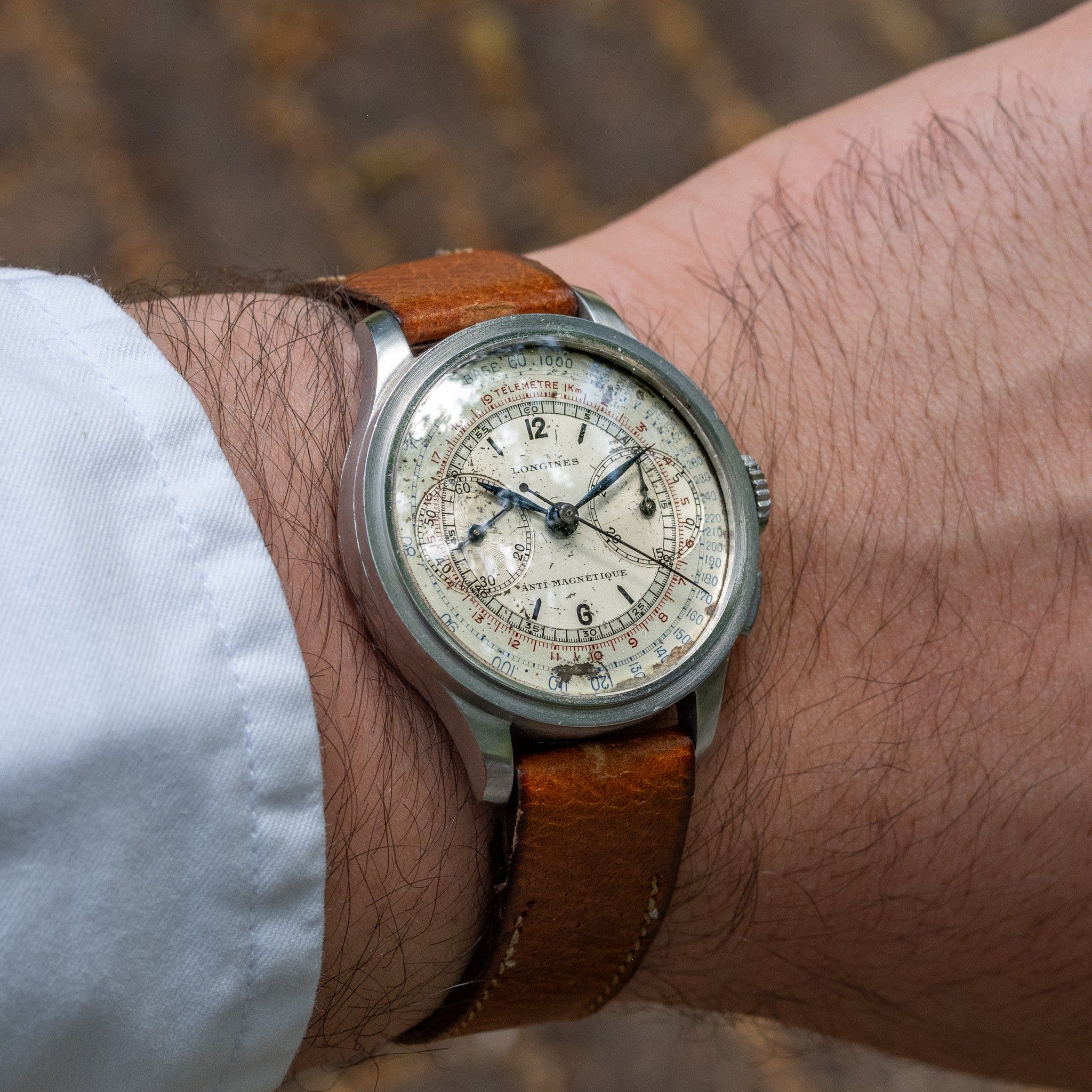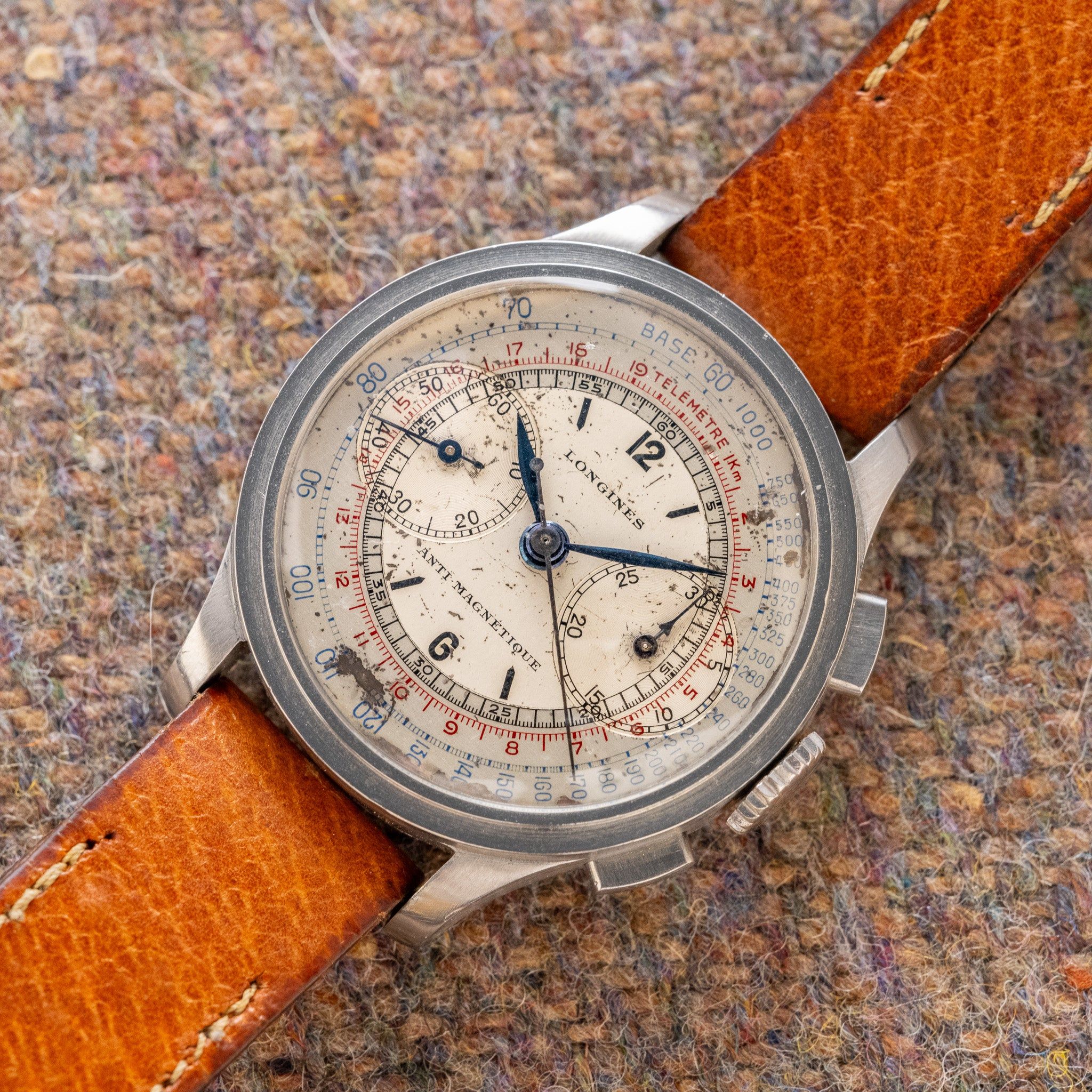 Dial: The original dial is untouched and is still in nice shape. With a two-tone finish and the classic red and blue chronograph indicators, this original dial embodies the 1940s war era design.