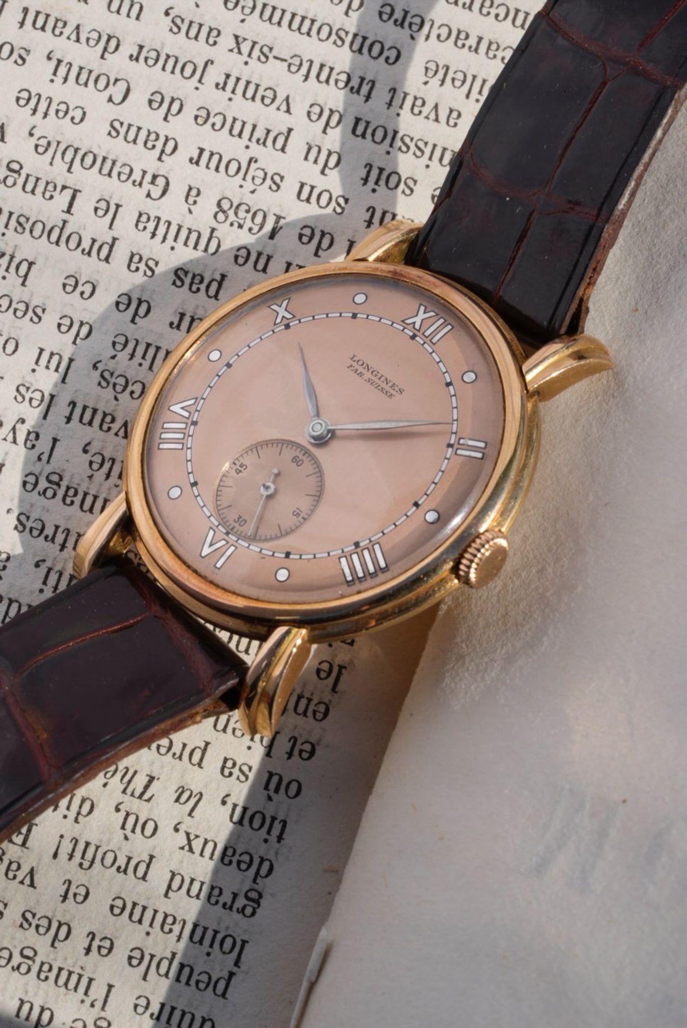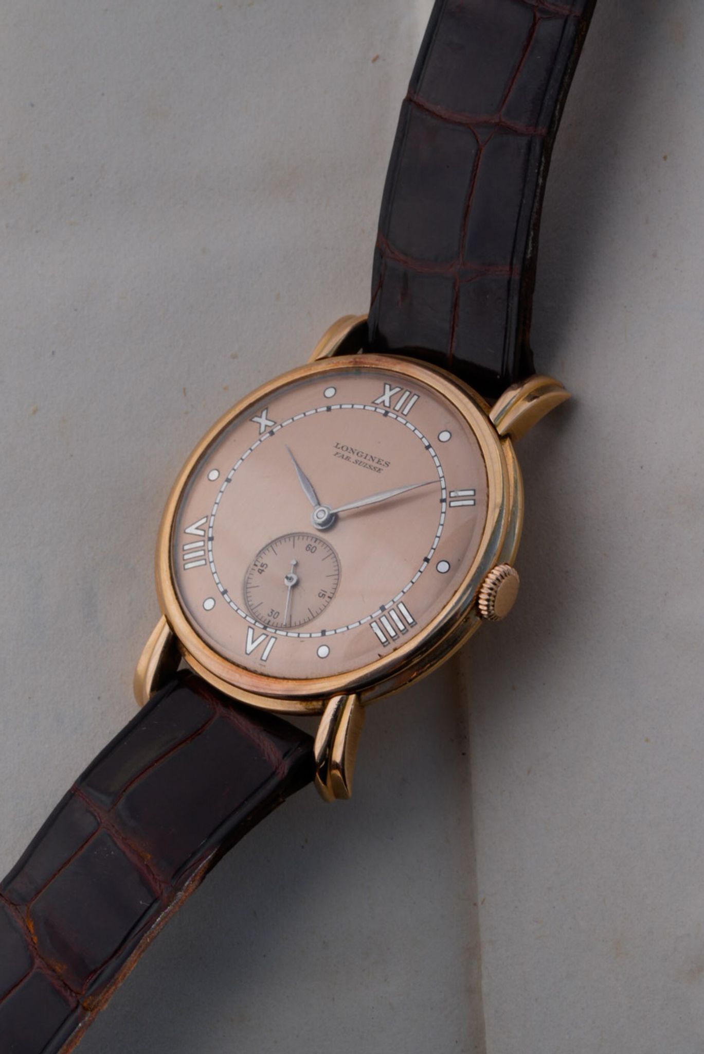 Longines watch intended for the French market, hallmarked with the French eagle’s head and “Fab. Suisse” on the dial. It was invoiced on March 30, 1949, to the Société Française Longines (S.F.L) in Paris.