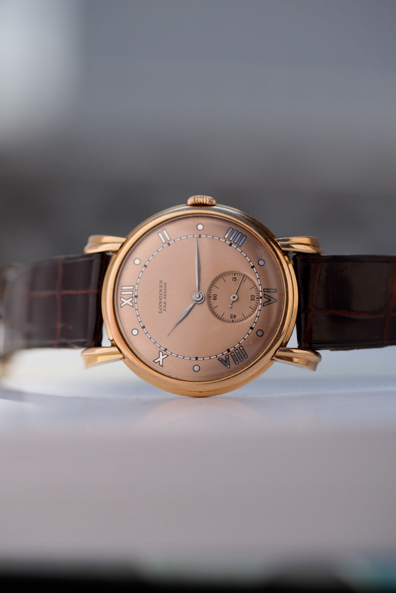 The salmon-colored dial displays silver mirror-finished Roman numerals, a minute track, leaf hands, and a small seconds subdial at 6 o’clock.