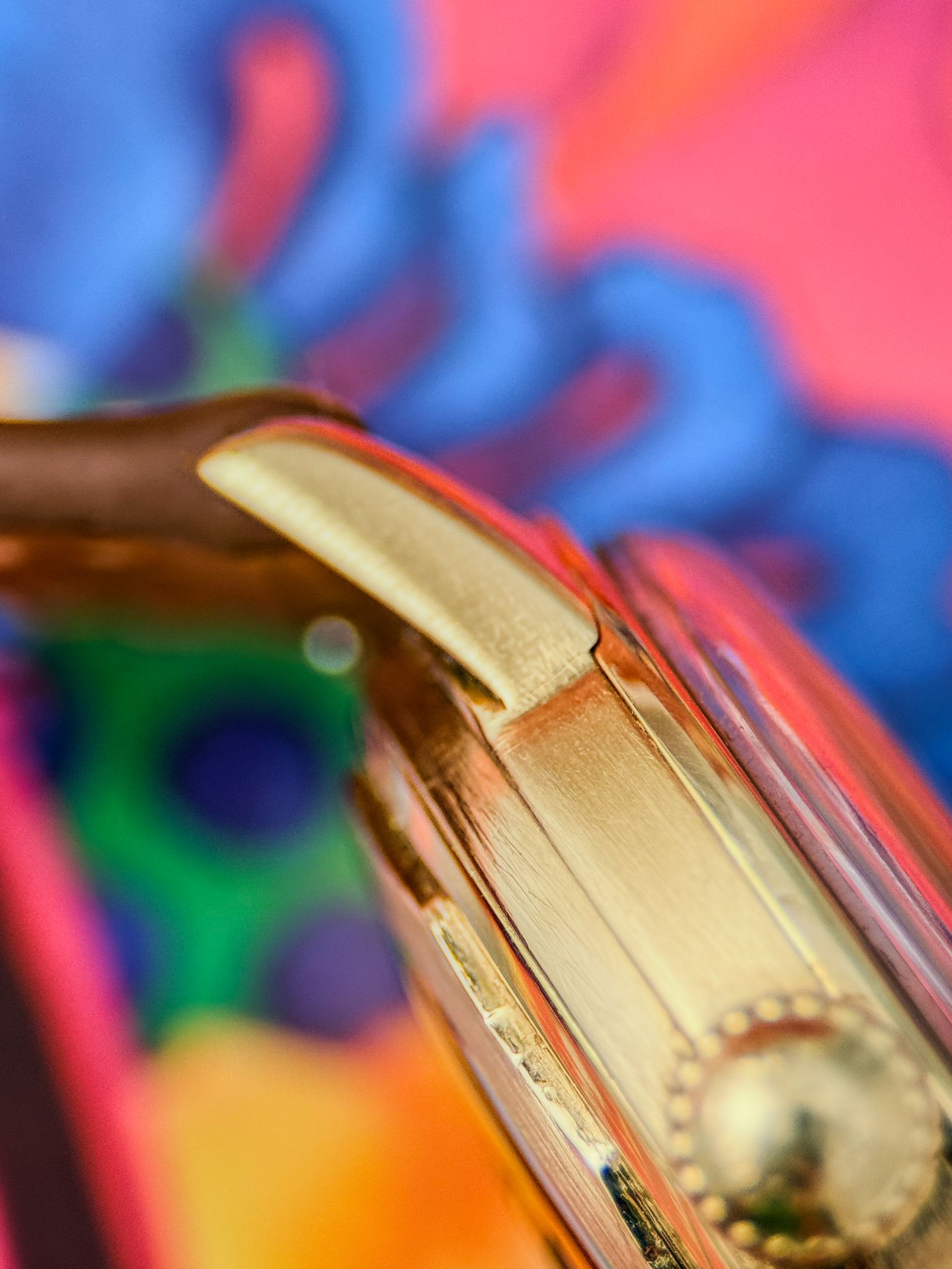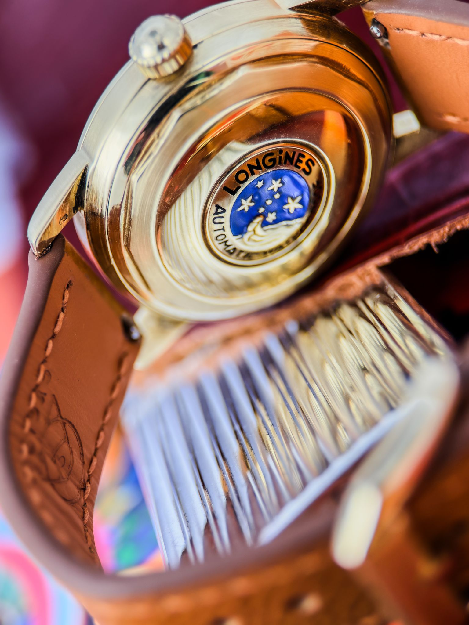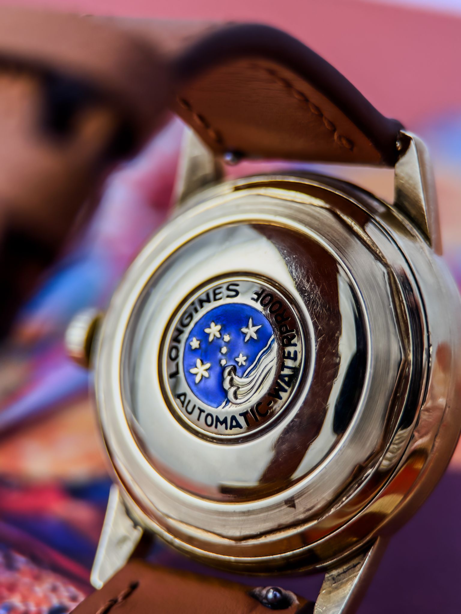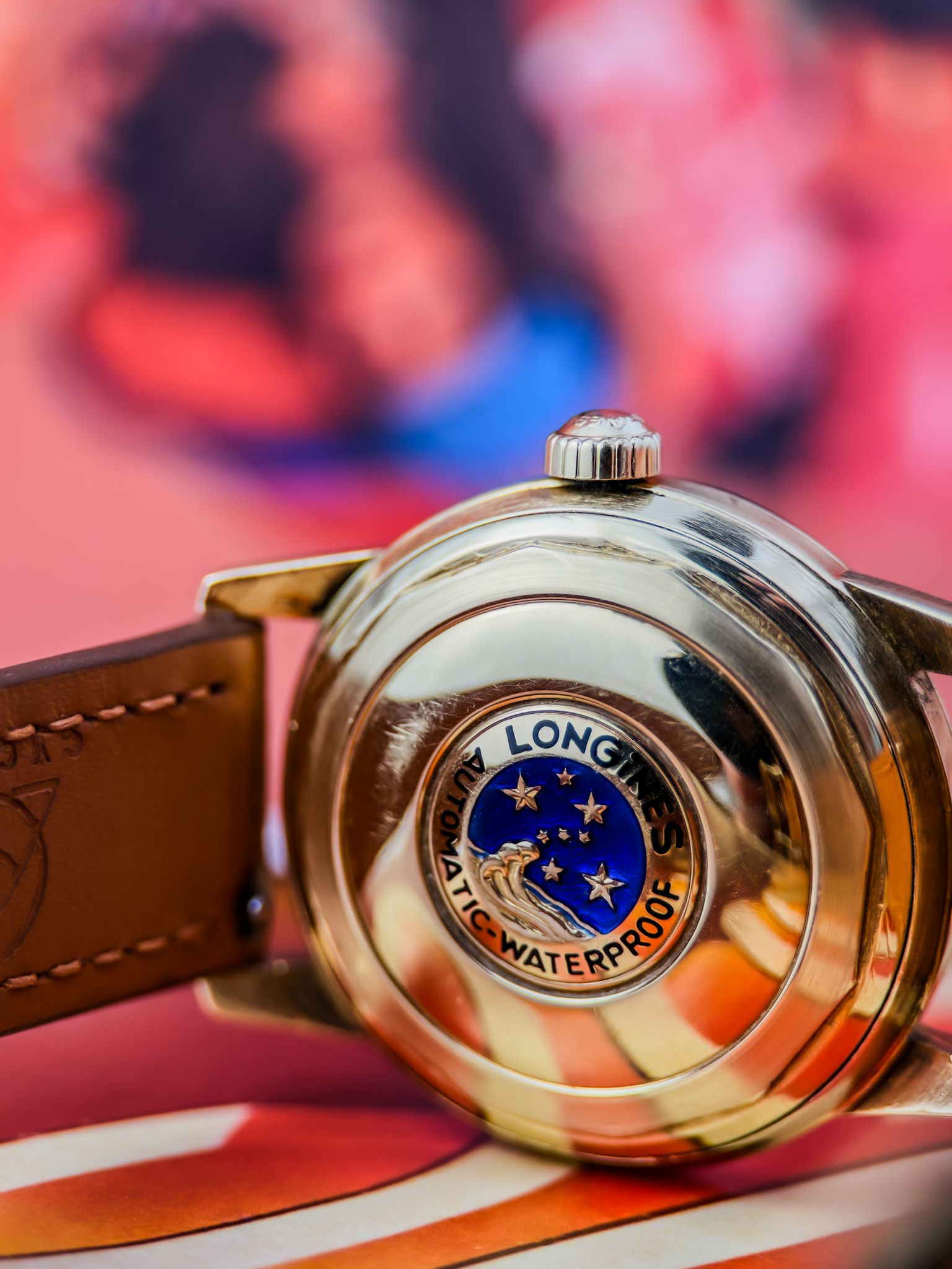 * Caseback: Solid screw-down caseback in 18k yellow gold, featuring an iconic blue enamel medallion depicting waves under a starry night sky