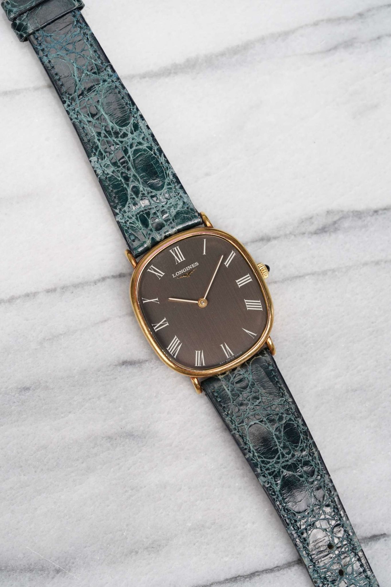 Here's a vintage Longines Ellipse manual wind in 18K yellow gold with a grey Roman numeral dial from the 1970s to 1980s. Keeps great time and is fully functional. Measurements include a 32mm case across and an 18mm lug width. On an aftermarket blue crocodile leather strap. White hands and Roman numerals. Blue cabochon crown. Yellow gold case and bracelet. The piece is unisex it can be worn by both men and women. A great alternative to the Patek Philippe Ellipse. The piece is great alternative and value from other pieces offered by AP. All parts are original including the dial, case, and movement. the dial and case are in great cosmetic, untouched condition.