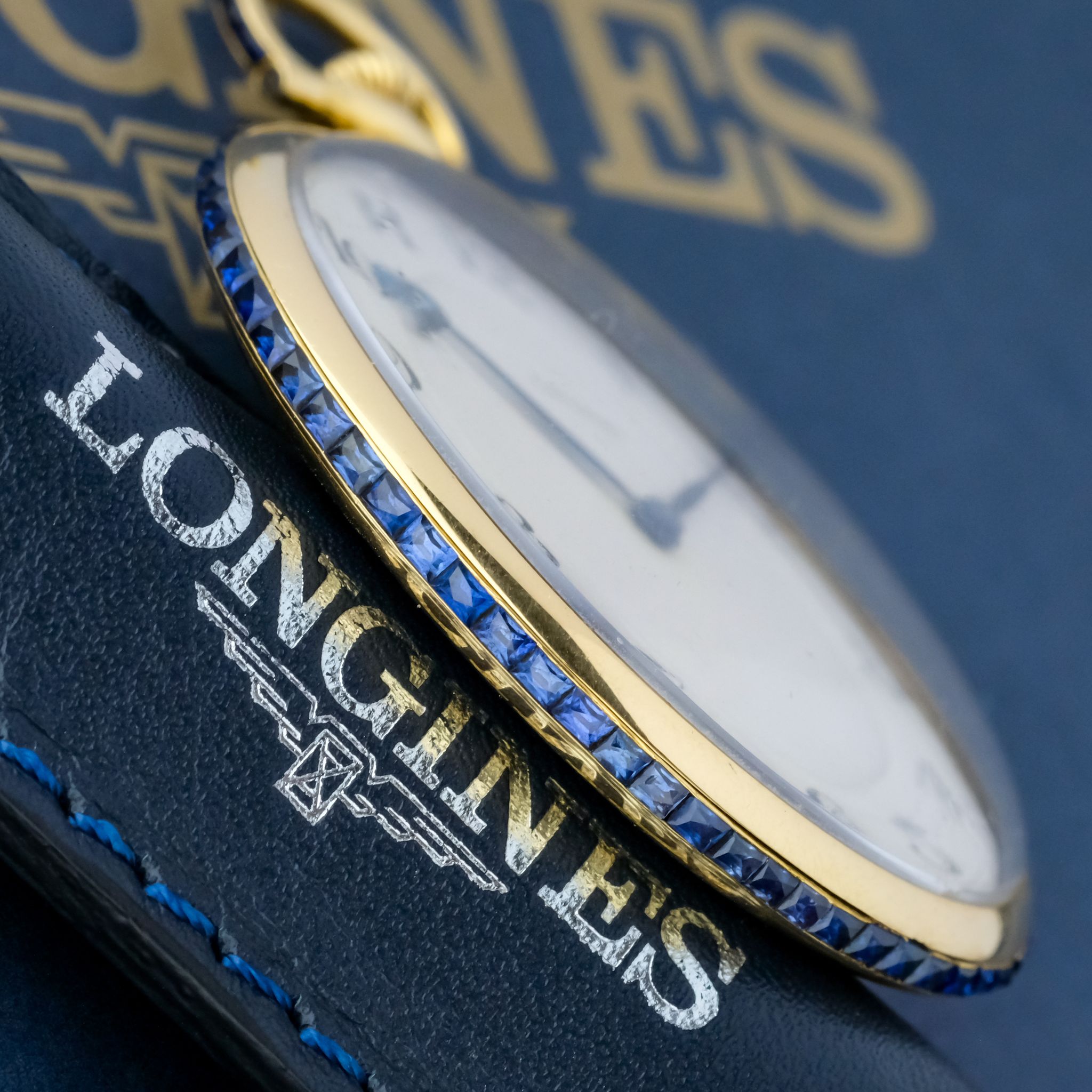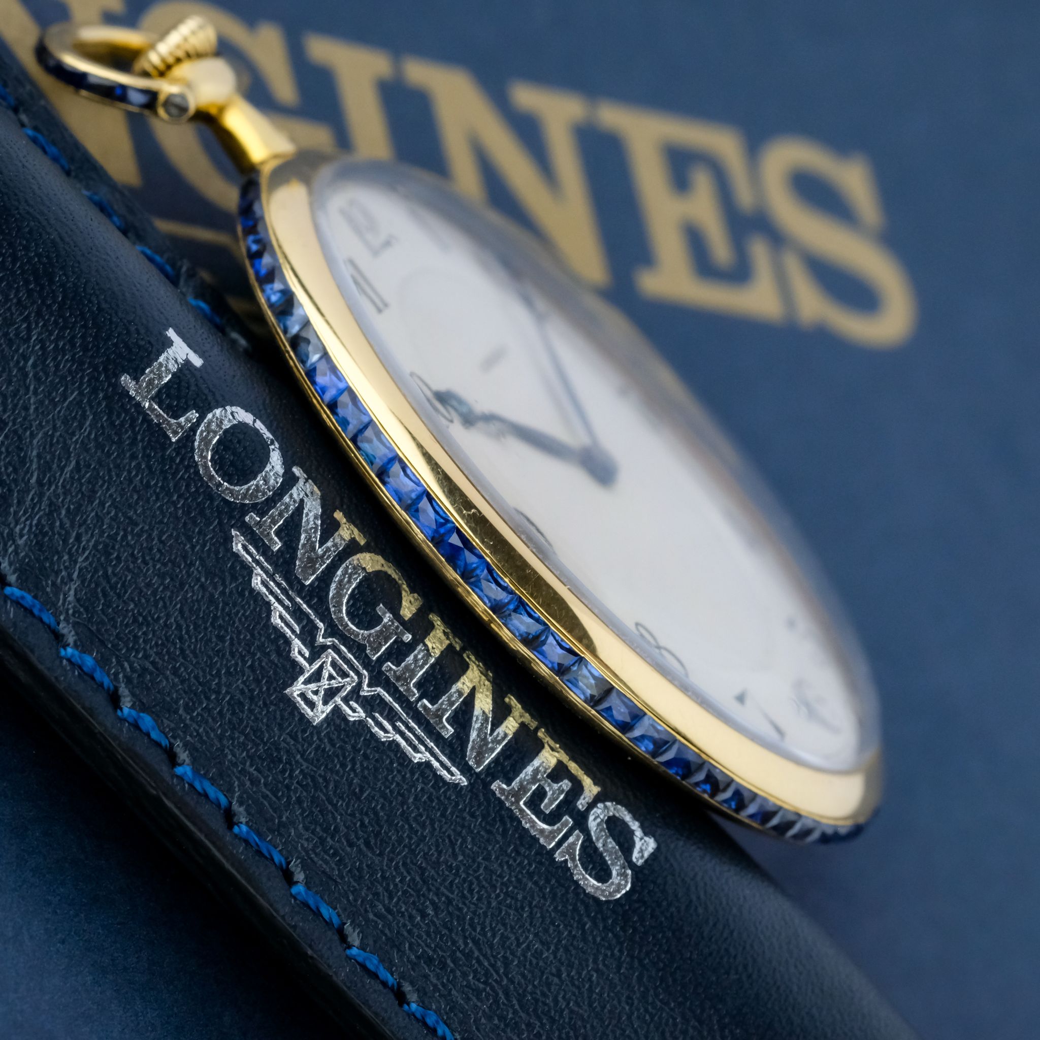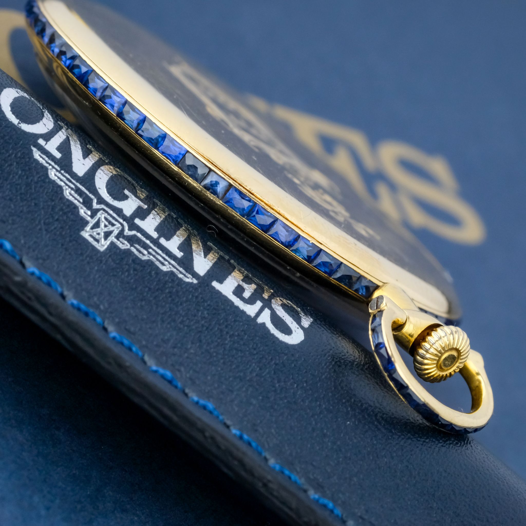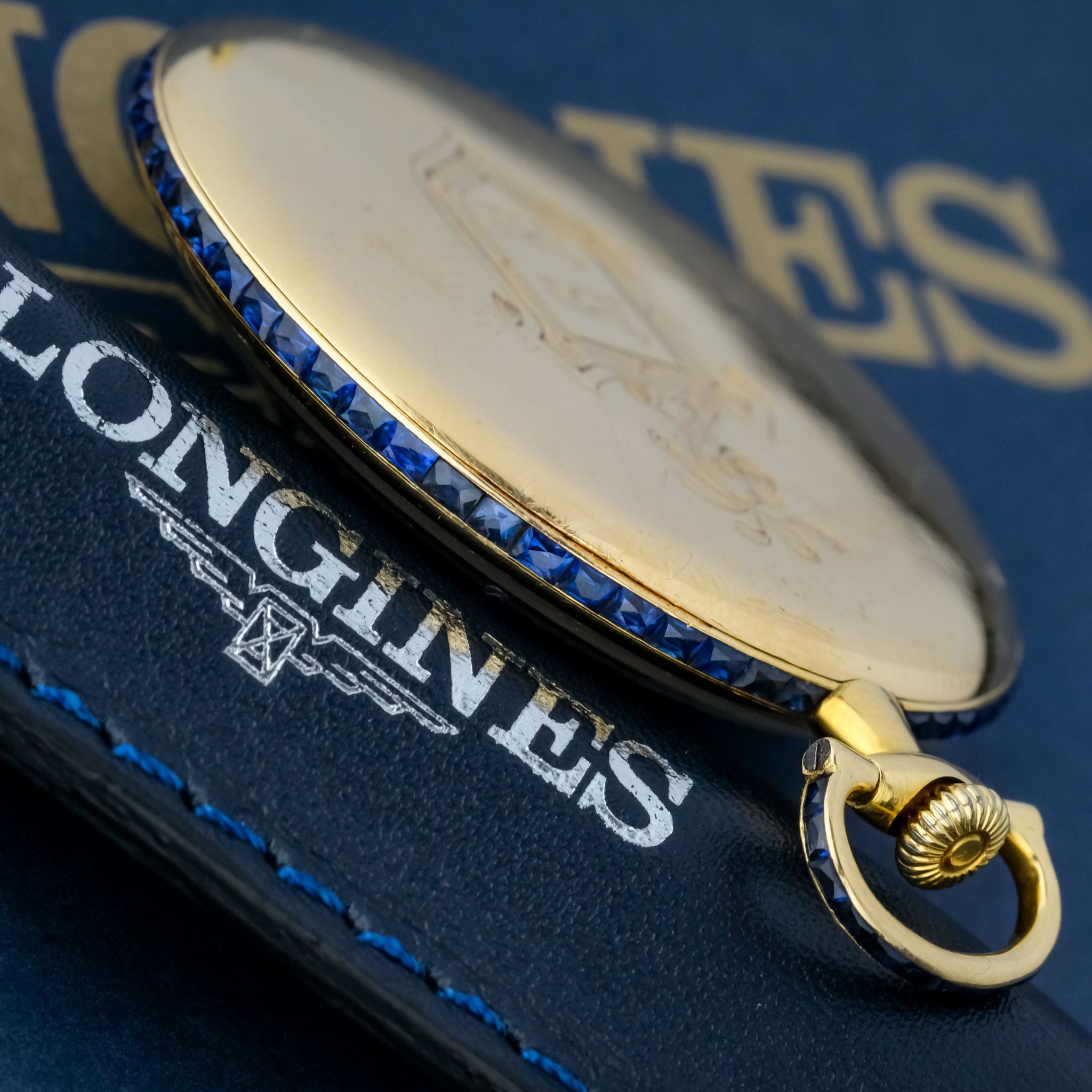 Fabulous Longines pocket watch from ca. 1910 with factory sapphire setting on the bevels of the case as well as surrounding of the winding crowning beautiful condition. The dial has been preserved in beautiful condition and the original blued steel hands still look amazing, especially reminiscing the blue sapphires. The caseback is engraved with a family crest which appears to be as old as the watch. The movement is running but not tested for accuracy.