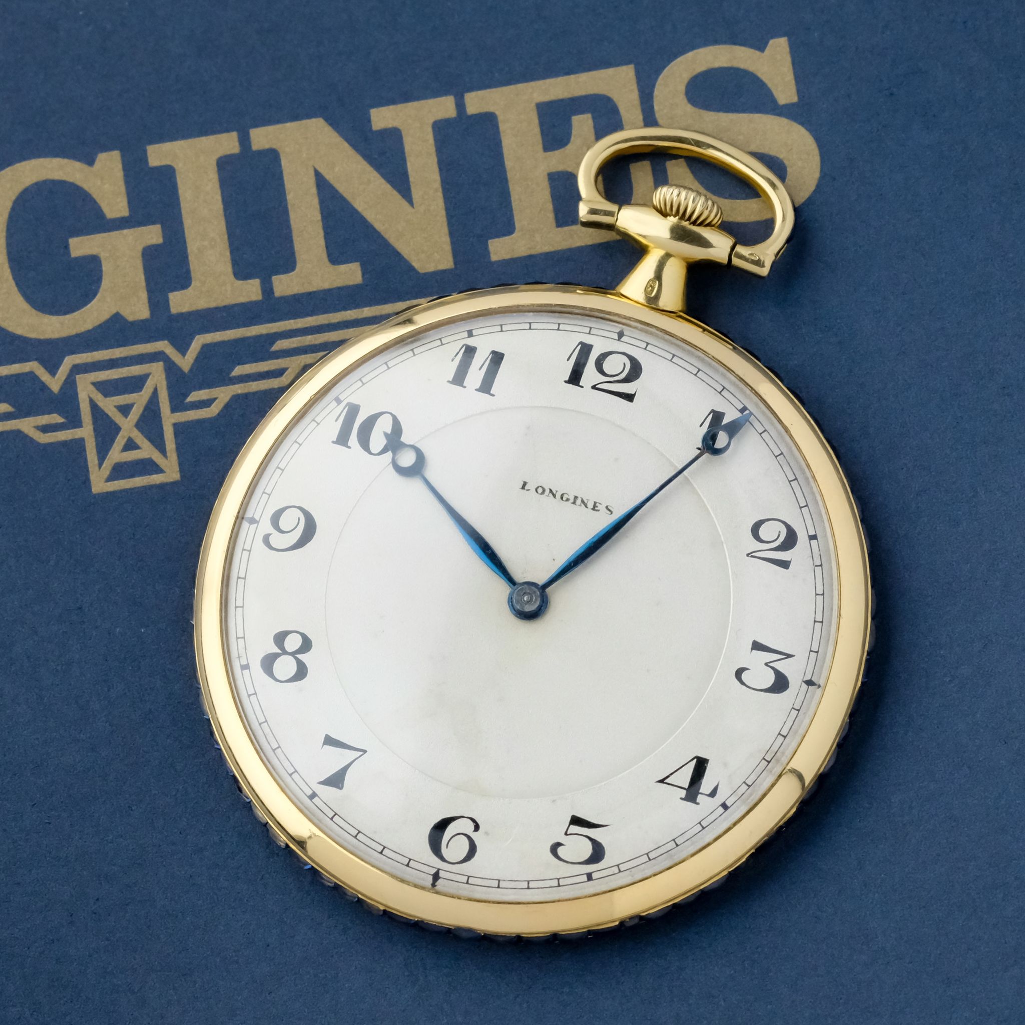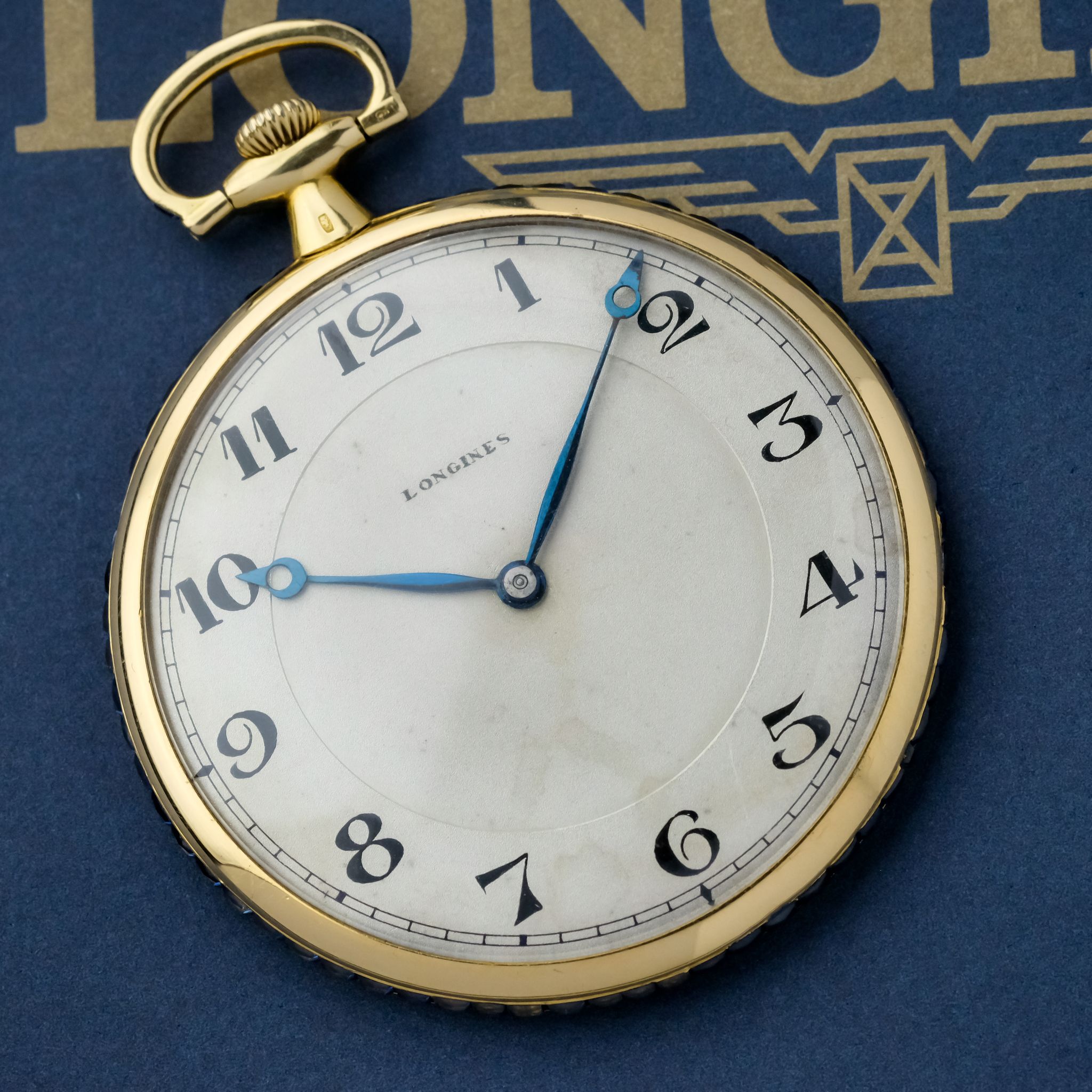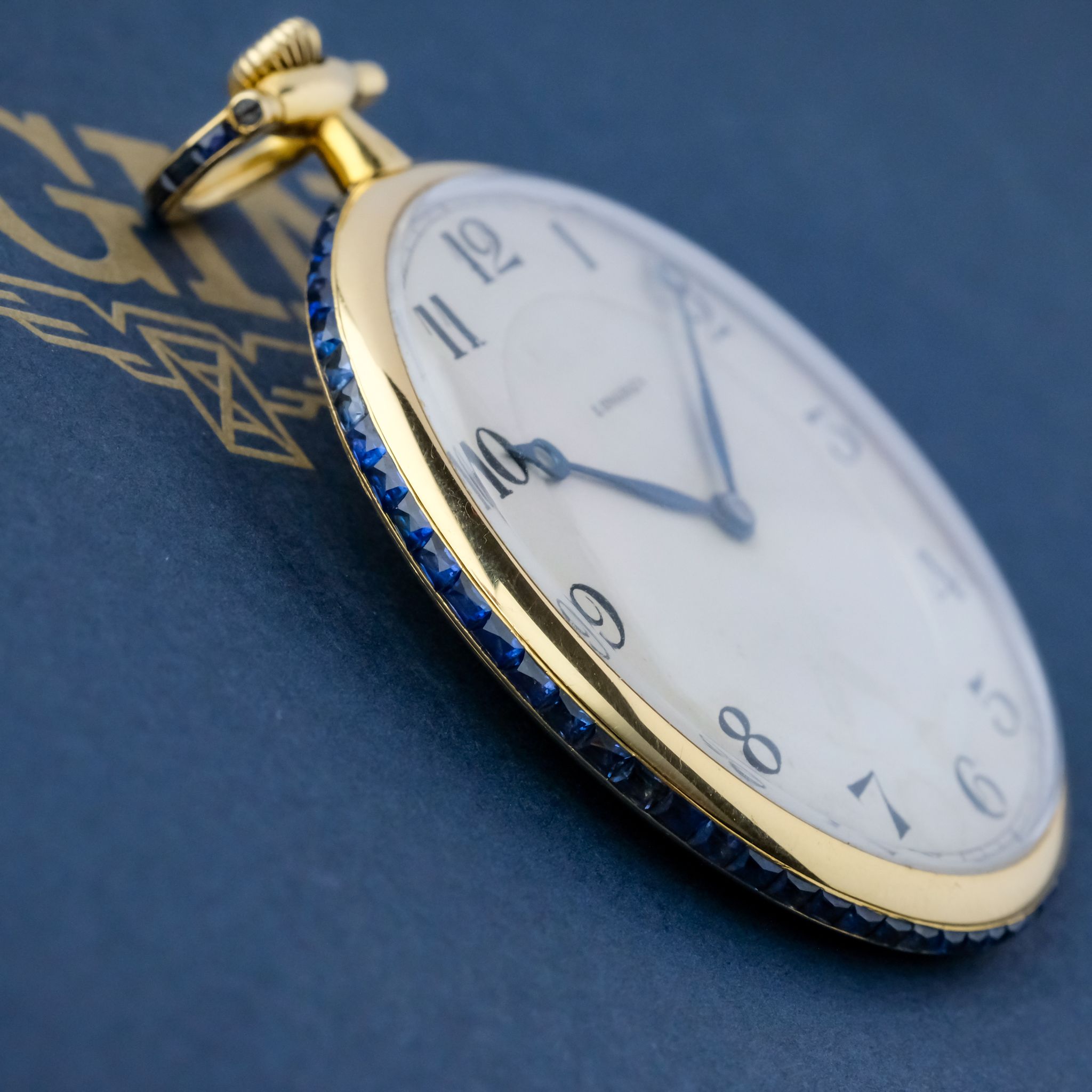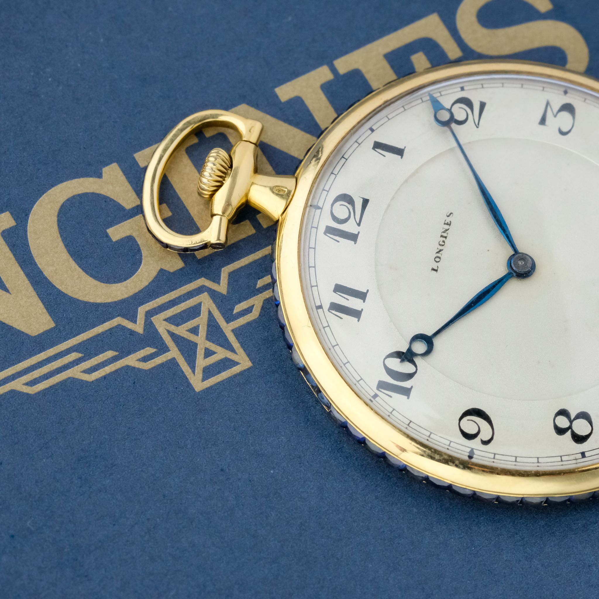 Fabulous Longines pocket watch from ca. 1910 with factory sapphire setting on the bevels of the case as well as surrounding of the winding crowning beautiful condition. The dial has been preserved in beautiful condition and the original blued steel hands still look amazing, especially reminiscing the blue sapphires. The caseback is engraved with a family crest which appears to be as old as the watch. The movement is running but not tested for accuracy.