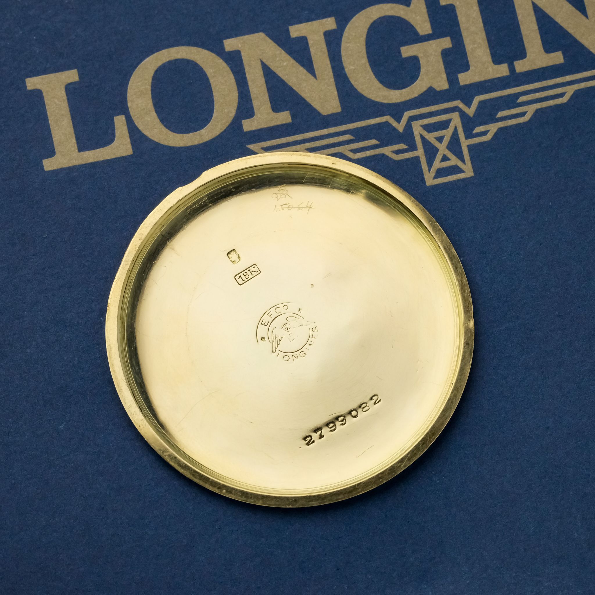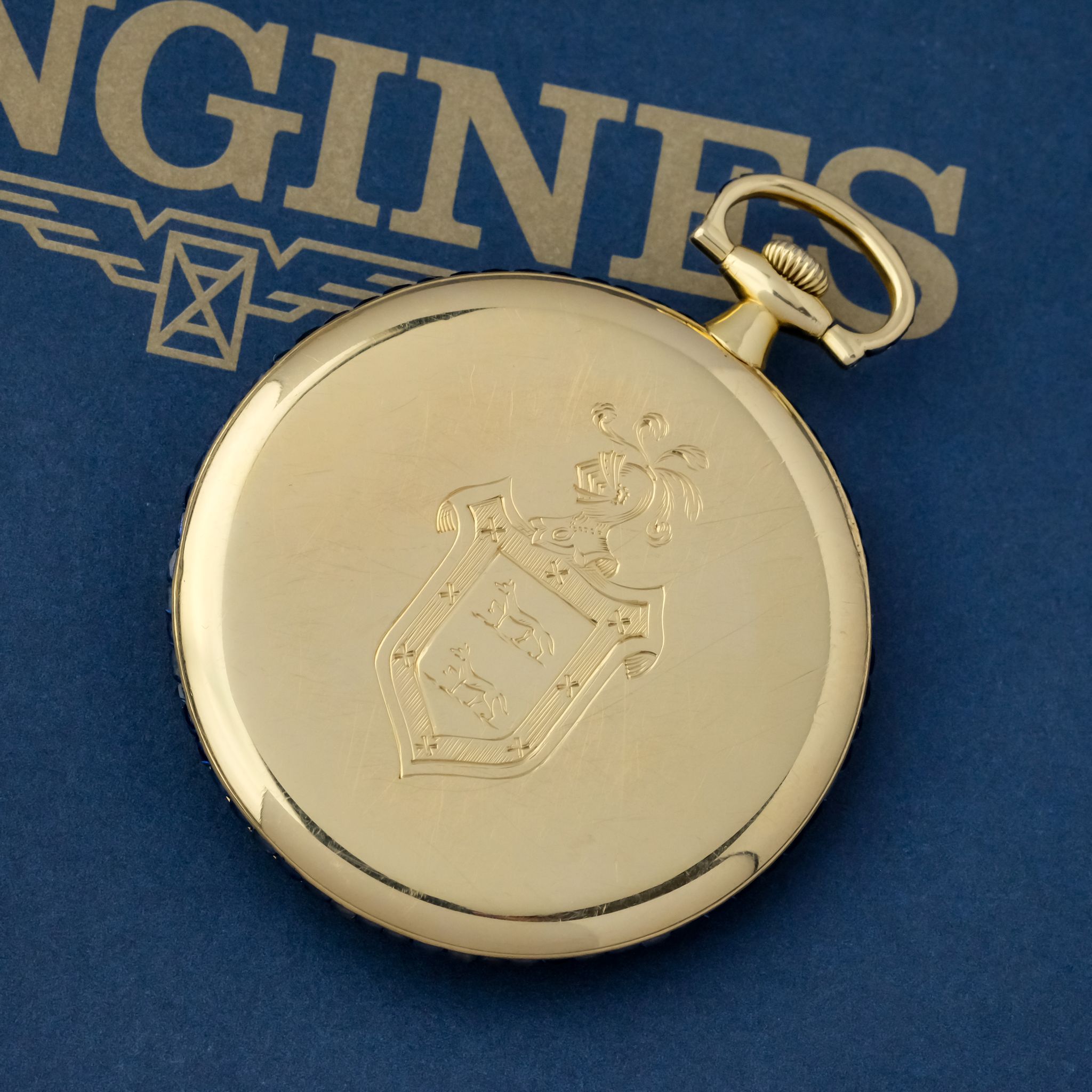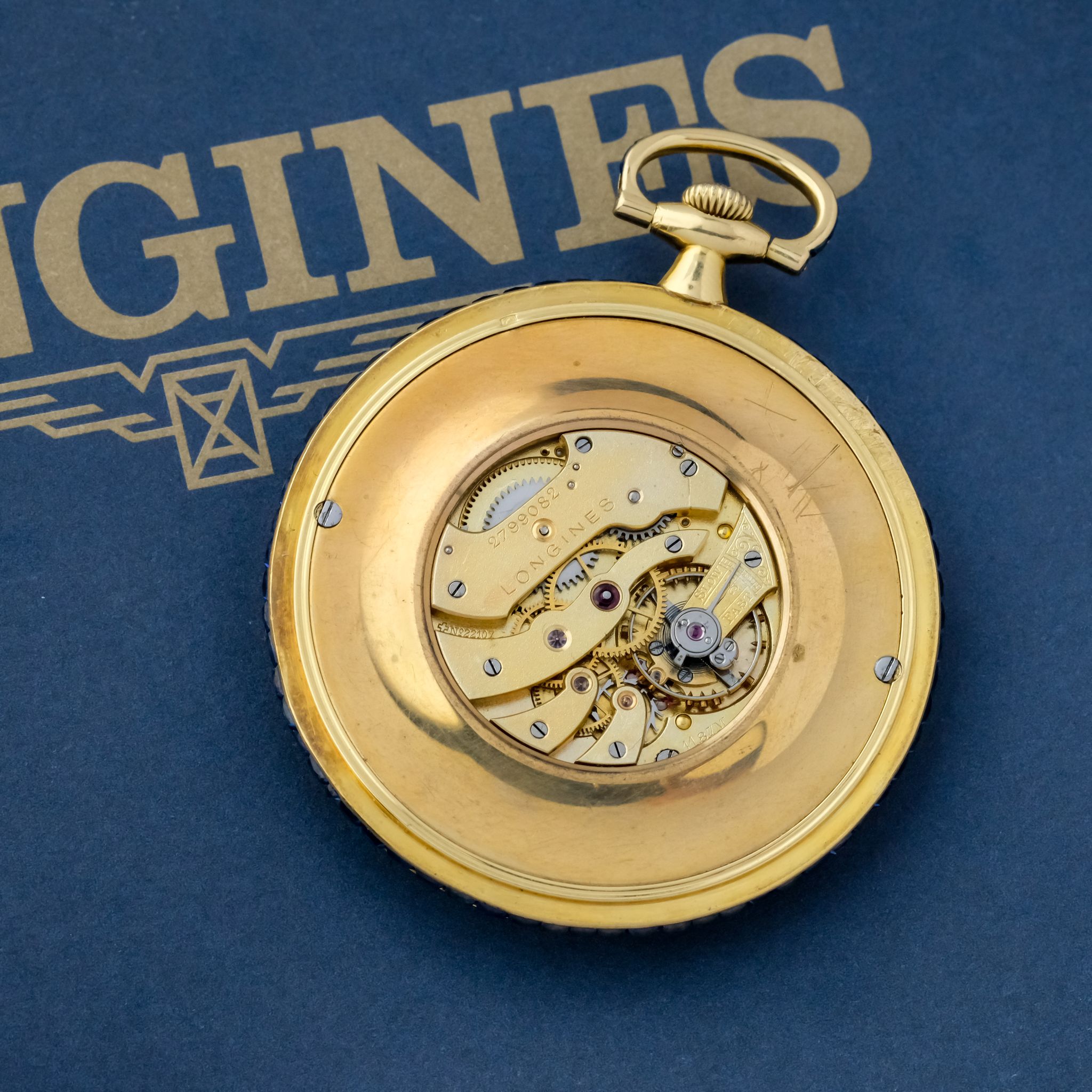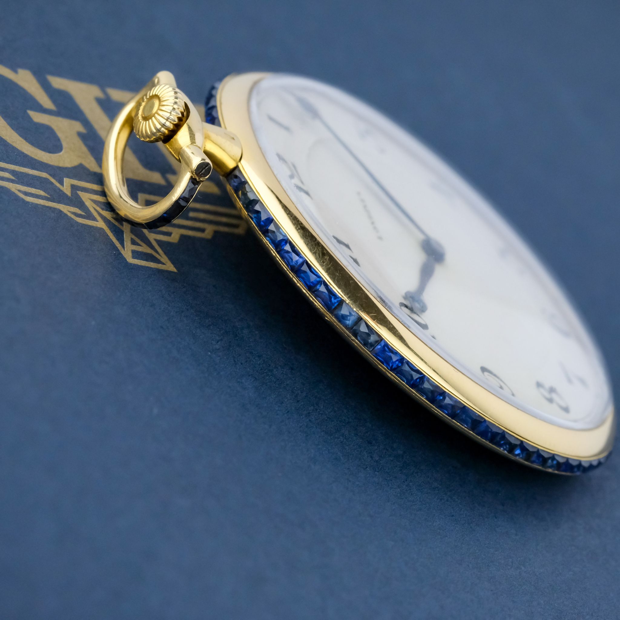 Fabulous Longines pocket watch from ca. 1910 with factory sapphire setting on the bevels of the case as well as surrounding of the winding crowning beautiful condition. The dial has been preserved in beautiful condition and the original blued steel hands still look amazing, especially reminiscing the blue sapphires. The caseback is engraved with a family crest which appears to be as old as the watch. The movement is running but not tested for accuracy.