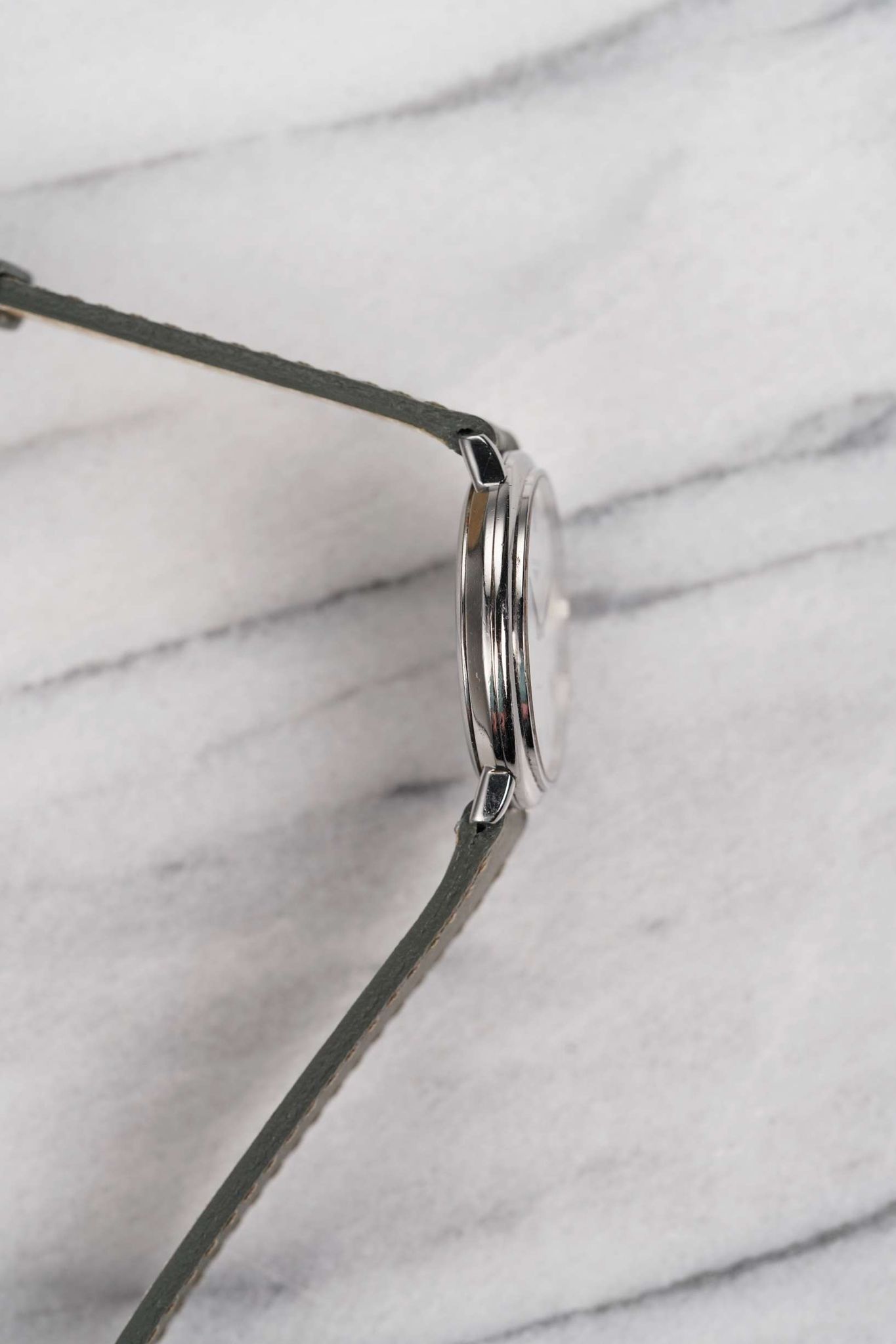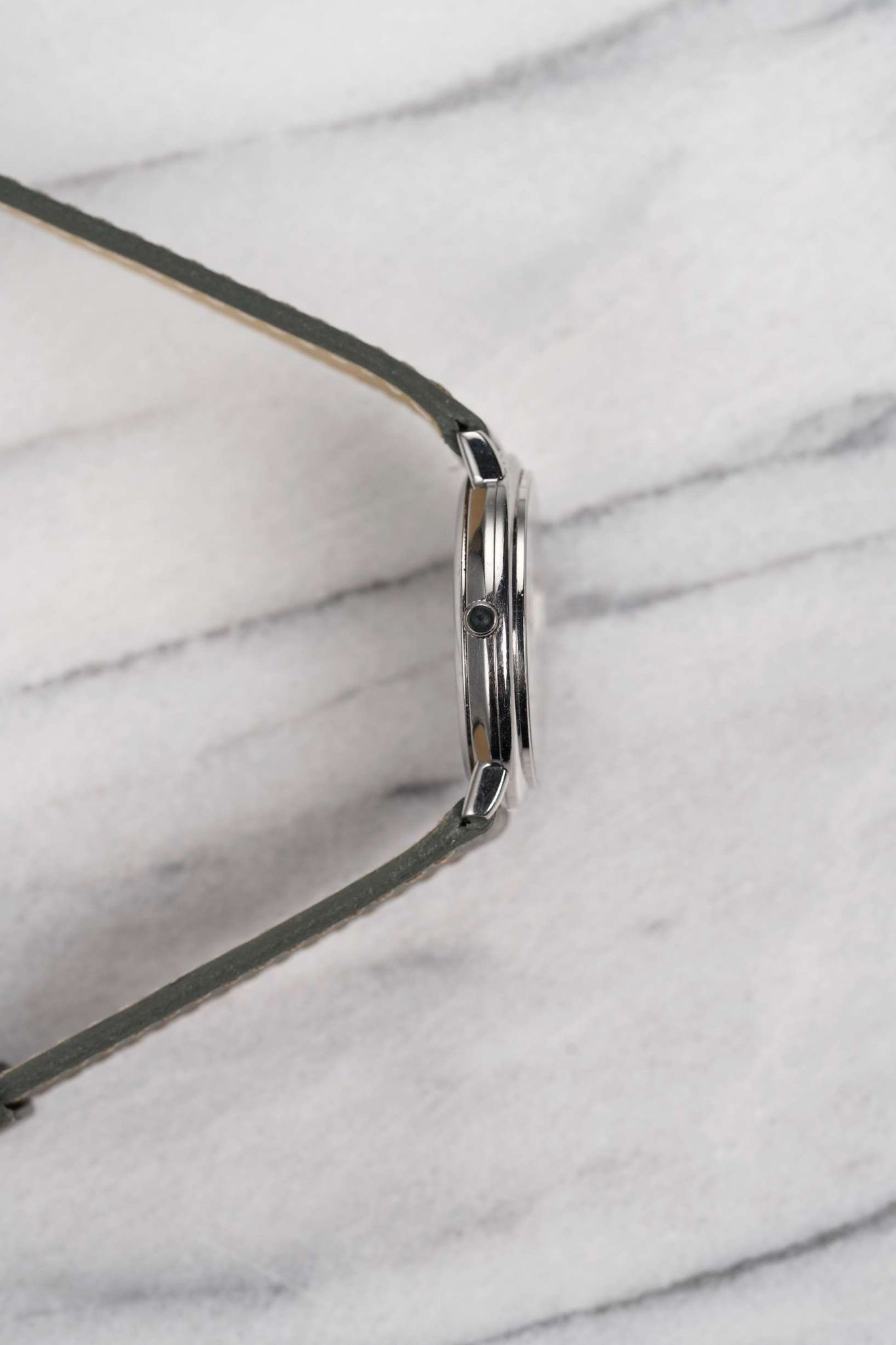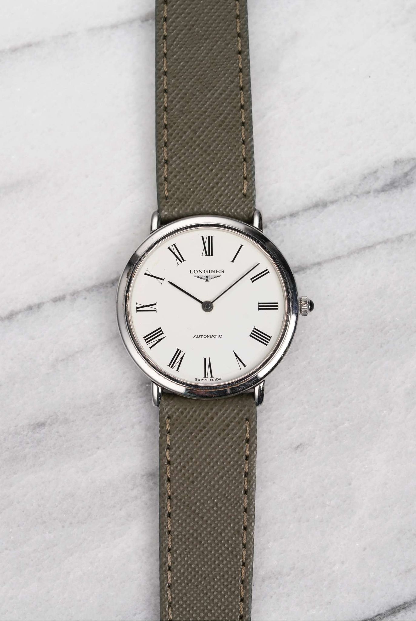 Here's a vintage Longines with a white roman numeral dial from the late 60s, early 70s. Keeps great time and is fully functional. Measurements include a 32mm case size and 18mm lug width. On a green leather strap (Made in Italy). Time only. Matching stick black hands and roman numerals. Both the dial and crystal are free from any scratches or marks. All parts are original including the signed Longines crown, dial, movement, and caseback. Both the dial and case are in great cosmetic, untouched condition.