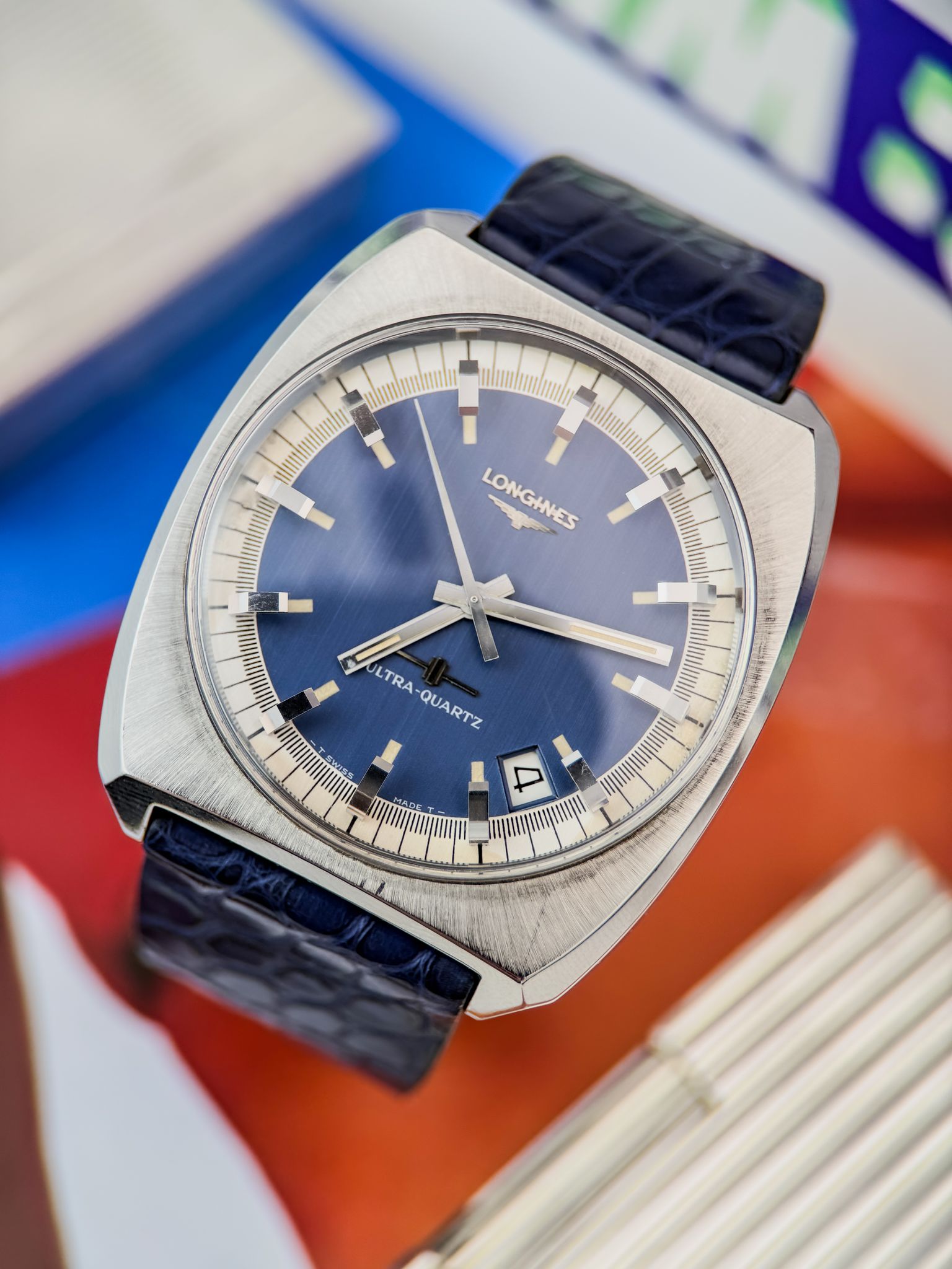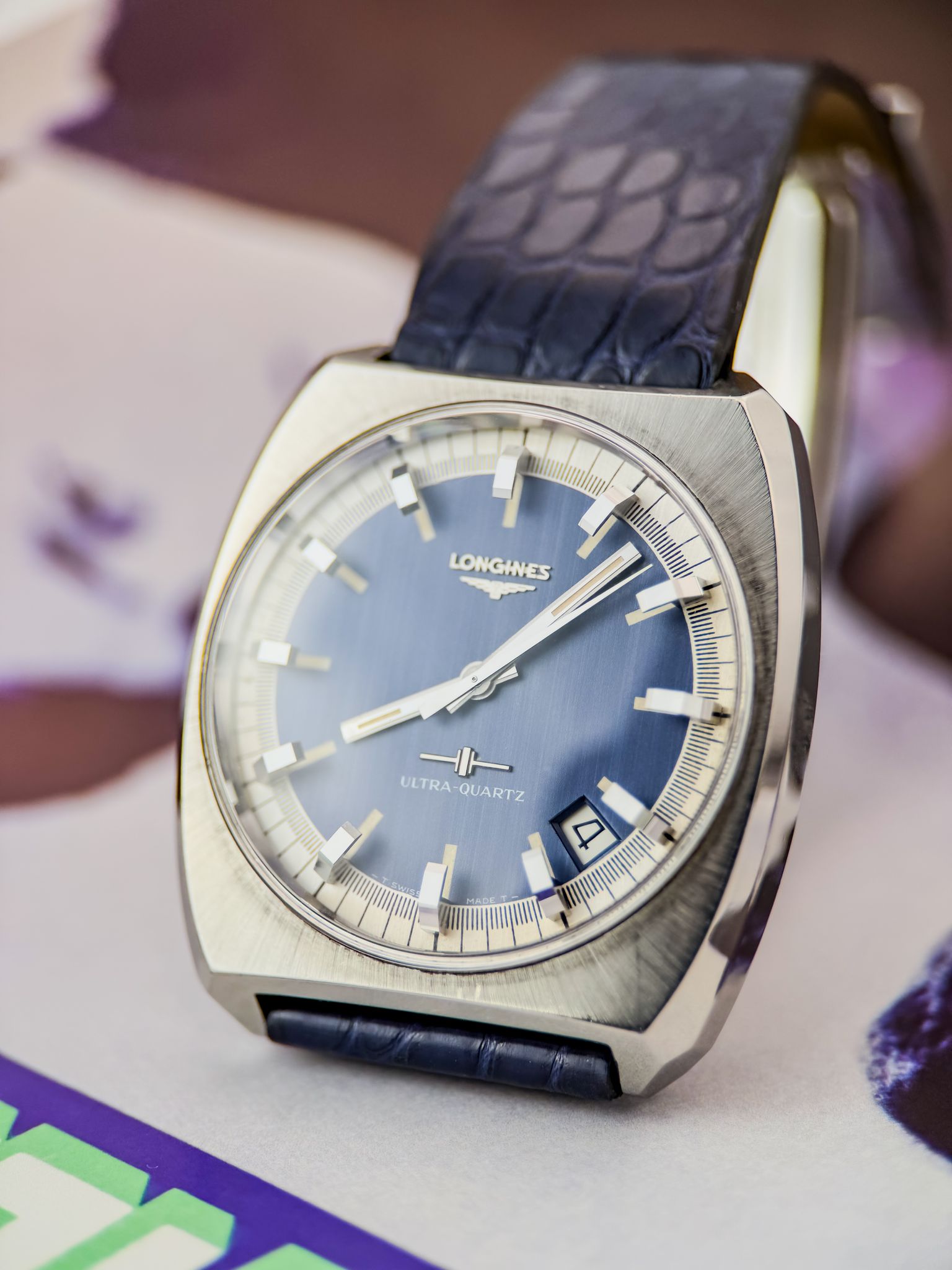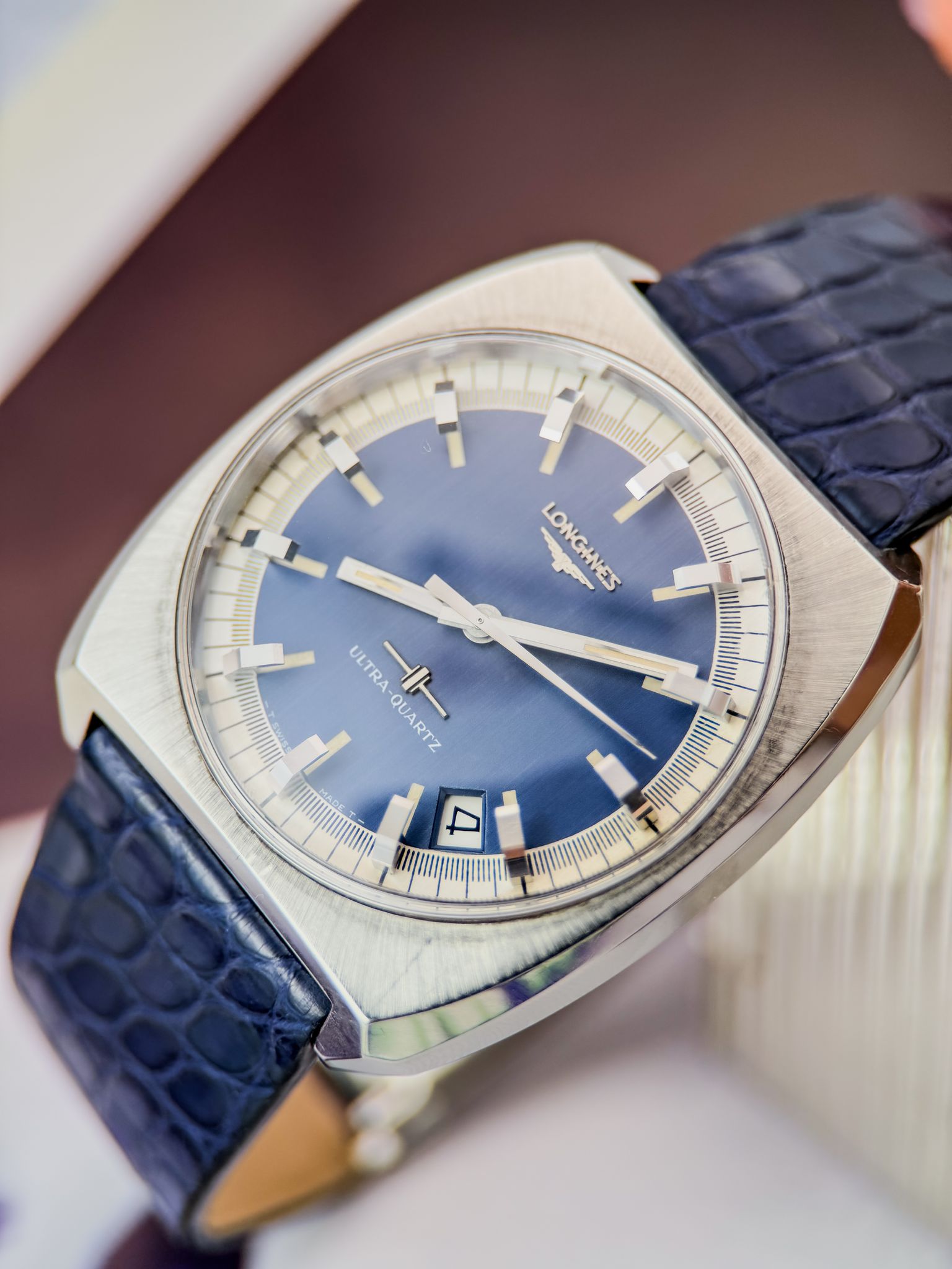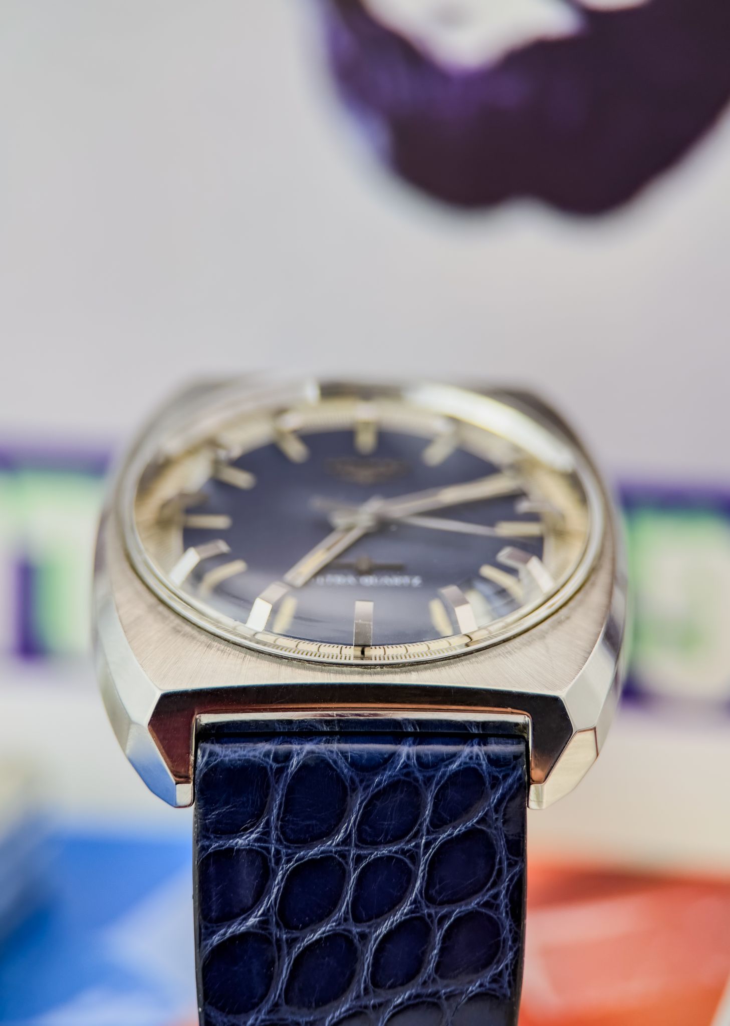 This “cybernetic” architecture made the Ultra-Quartz one of the most ambitious horological projects of its time — and one of the most complex. Its design reflects the era perfectly: a faceted steel case, sunburst blue dial, bold applied indices and luminous hands. Futuristic, in every sense.