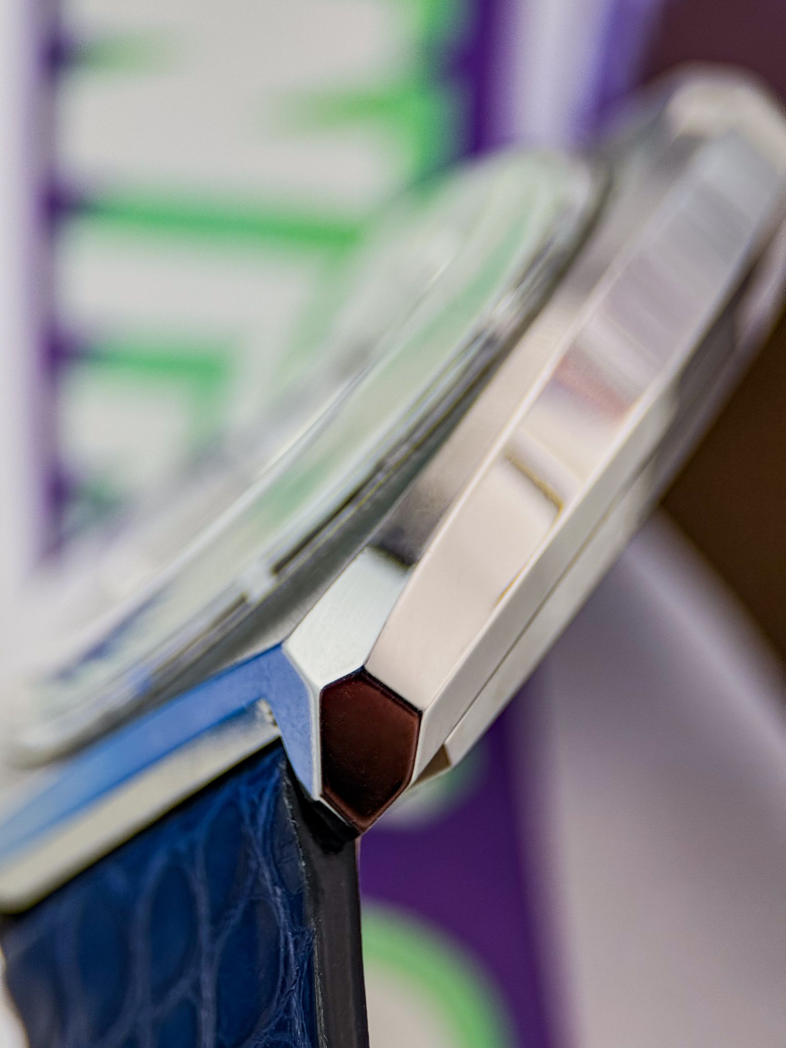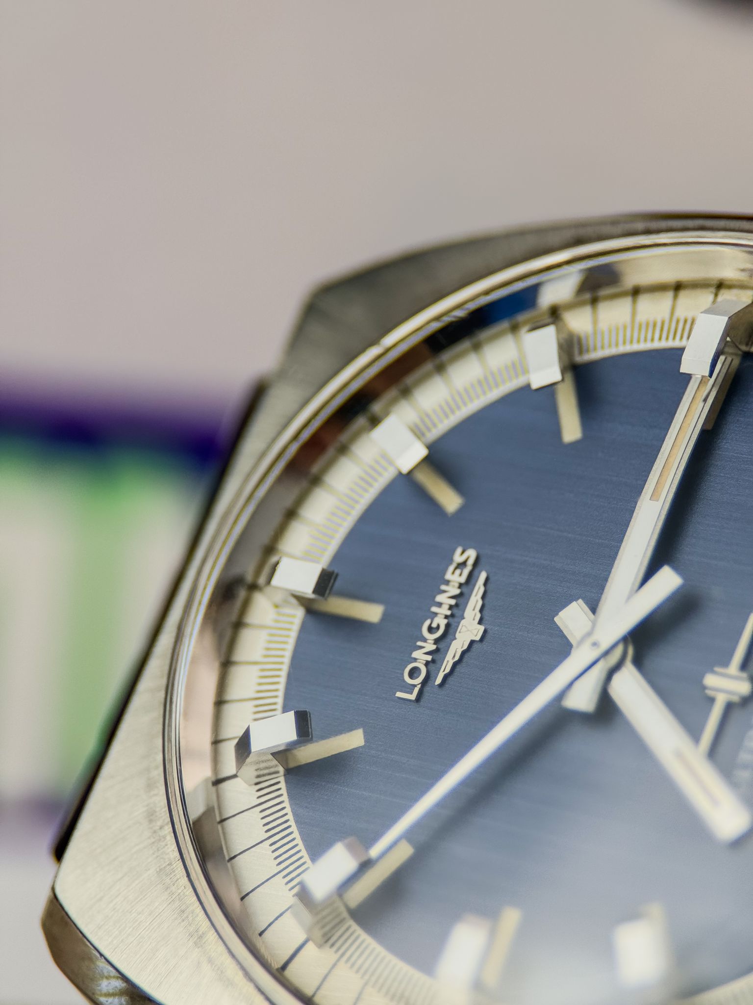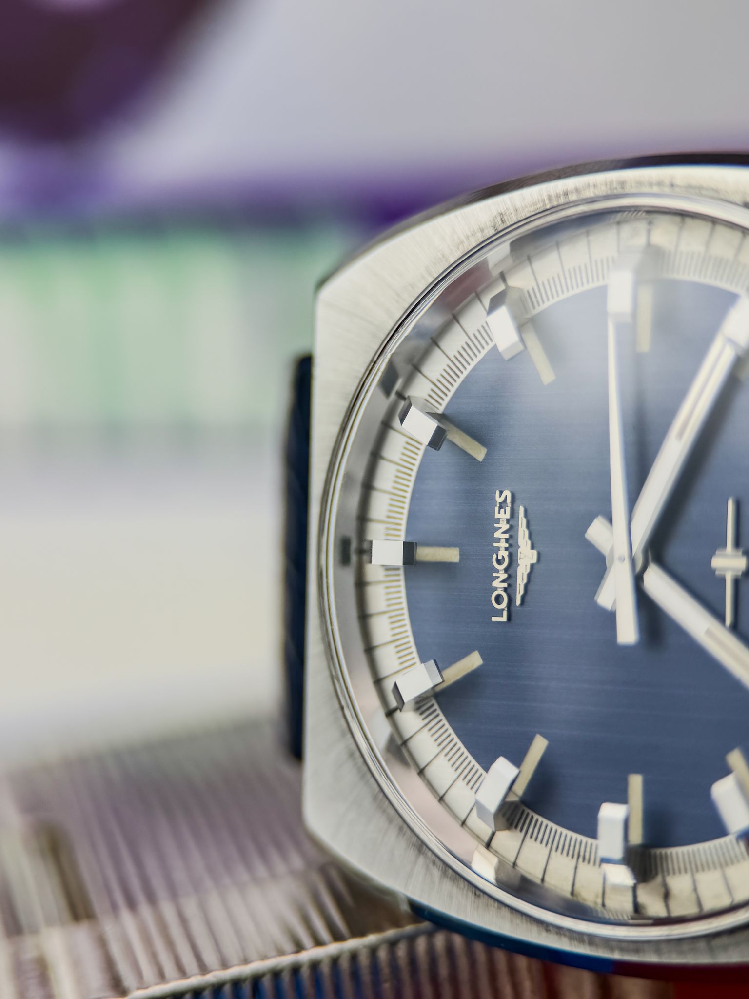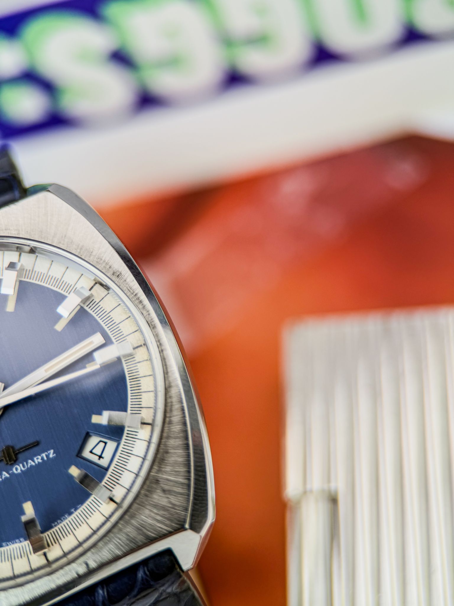 This “cybernetic” architecture made the Ultra-Quartz one of the most ambitious horological projects of its time — and one of the most complex. Its design reflects the era perfectly: a faceted steel case, sunburst blue dial, bold applied indices and luminous hands. Futuristic, in every sense.