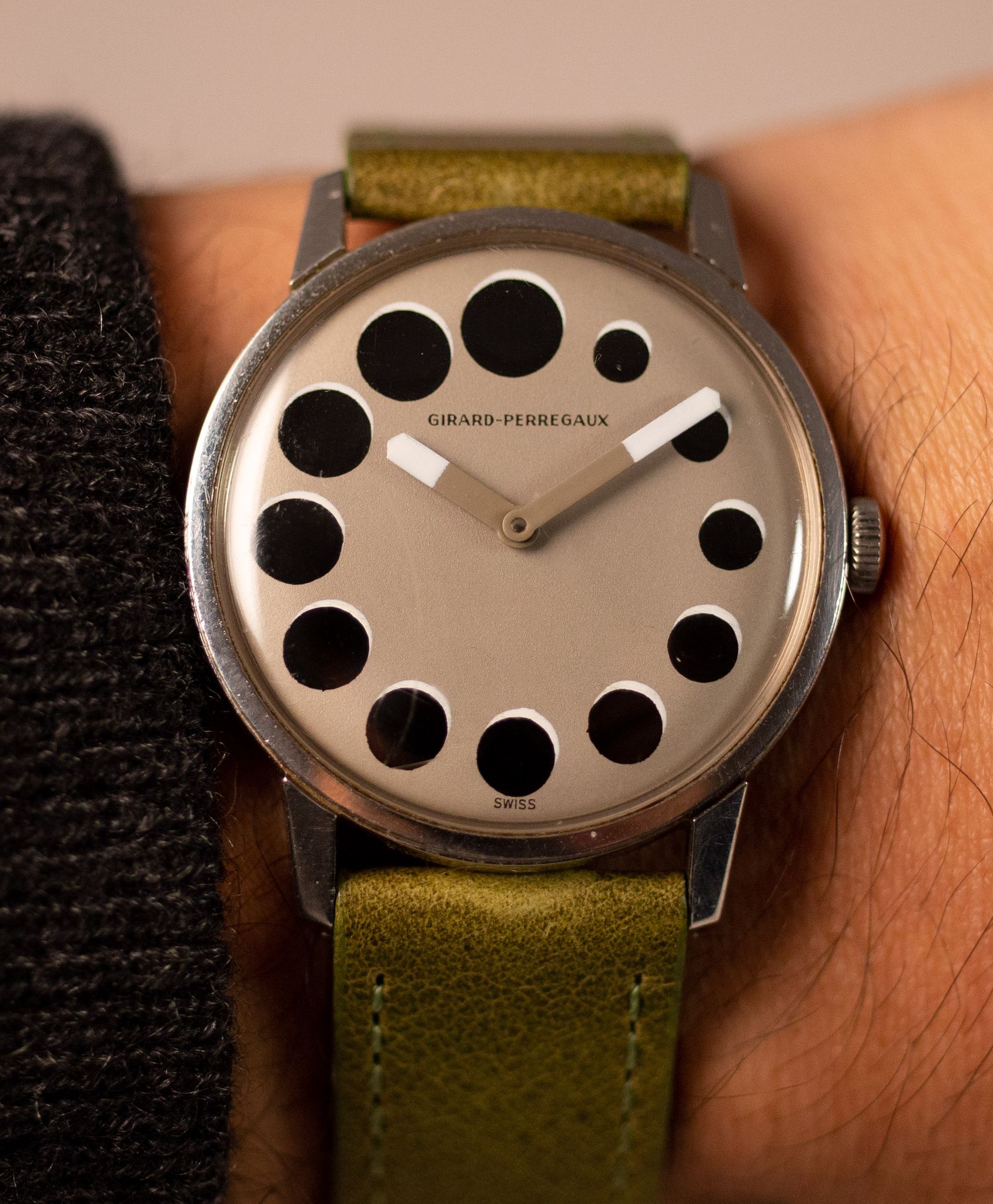 This is a rare Girard Perregaux Lunar Dot watch. The dial is quite unique with hand painted dots that resemble moons. The condition is excellent and original with some crystal scratches. The watch is one of the most aesthetically dynamic watches we have had and is truly fantastic on the wrist!