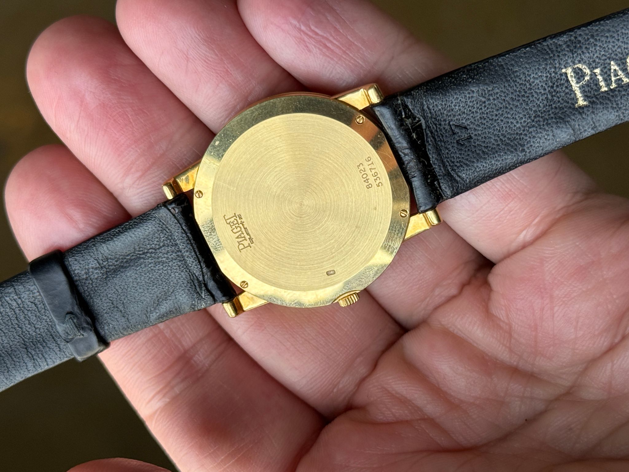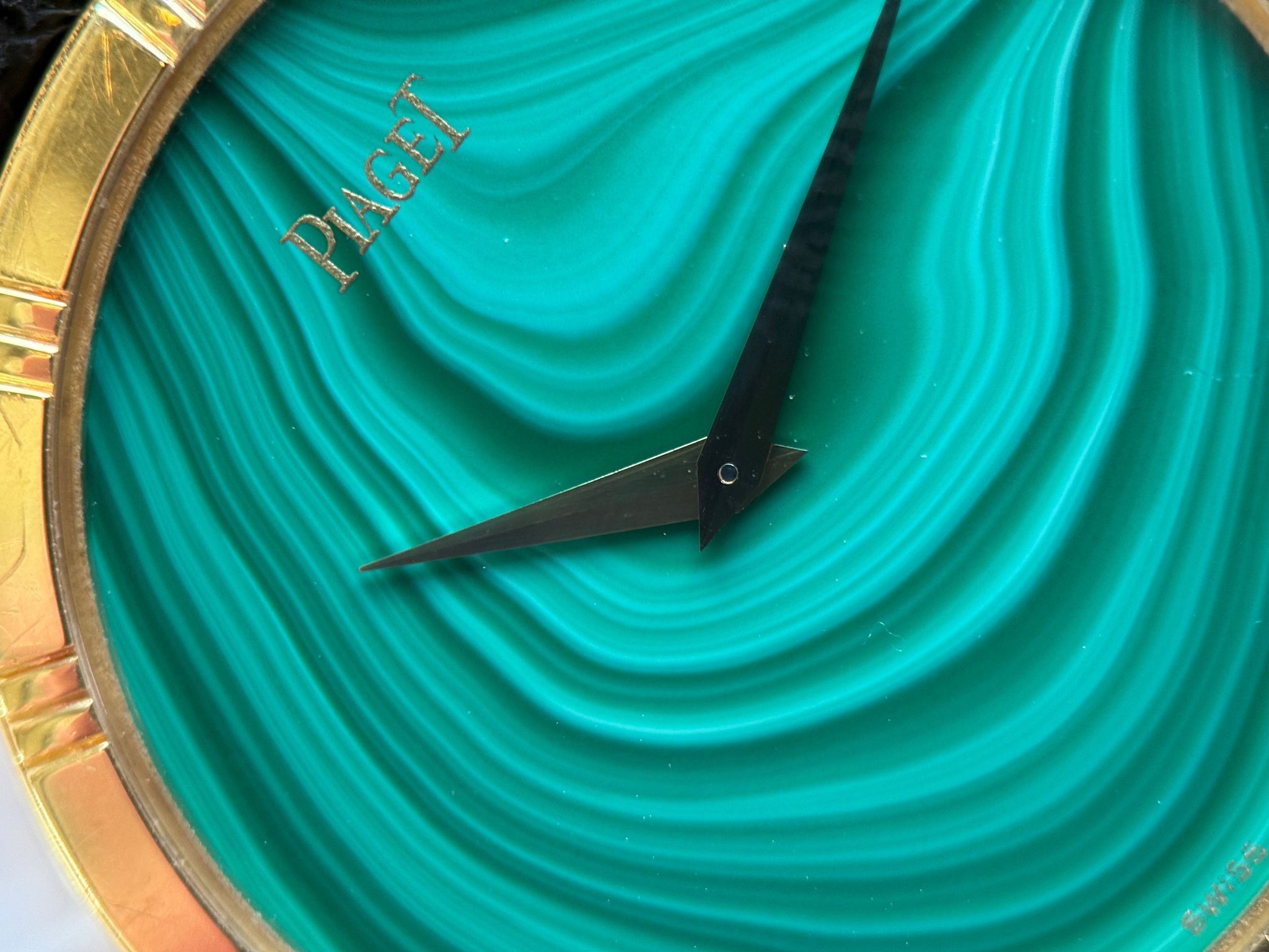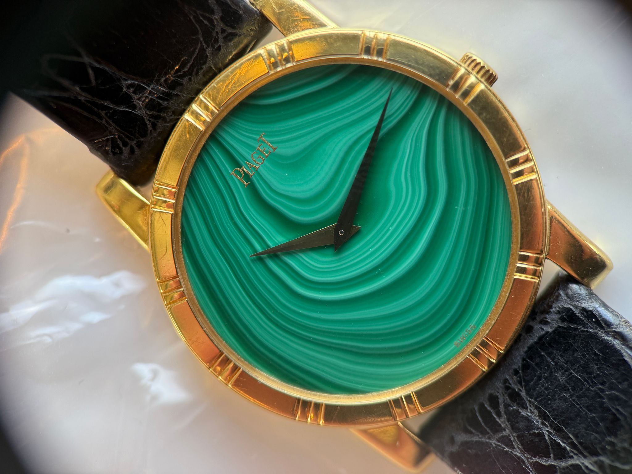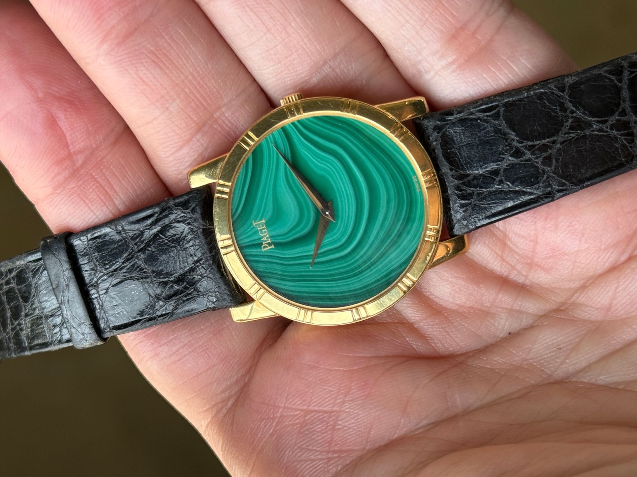 Absolutely stunning Piaget Dancer Calatrava with a jaw-dropping and flawless malachite dial. Quartz movement with original 18k Piaget buckle.