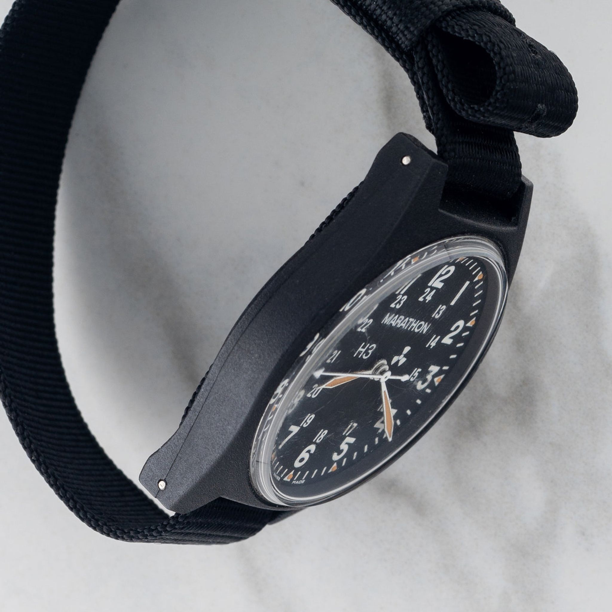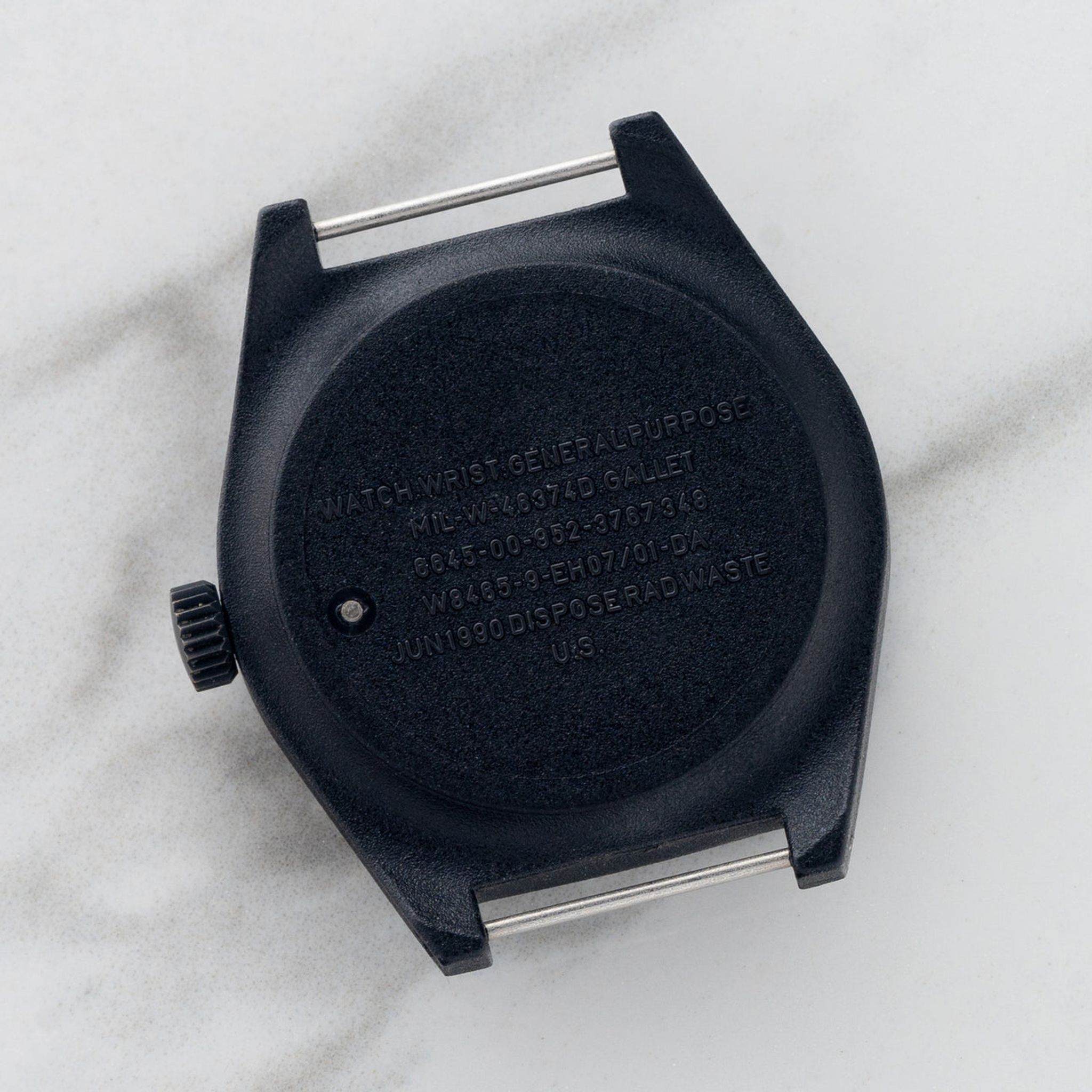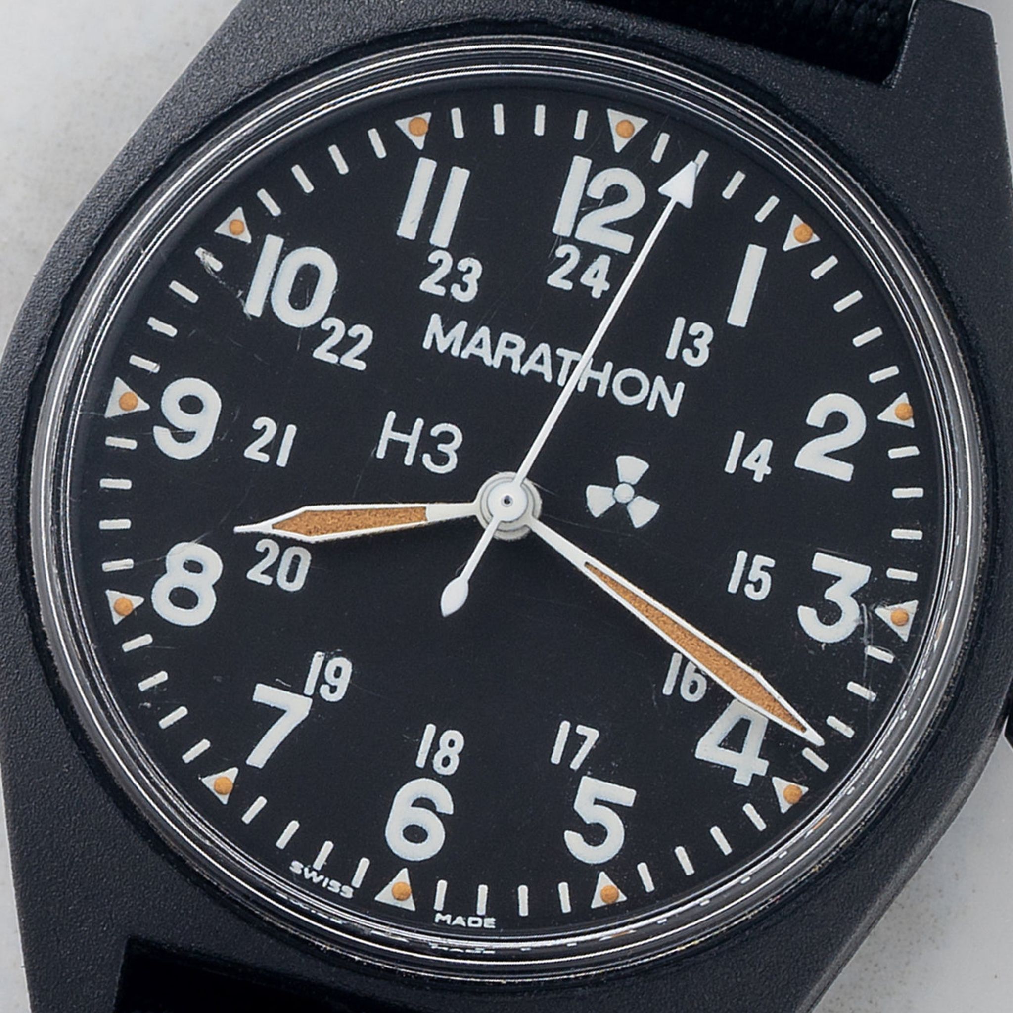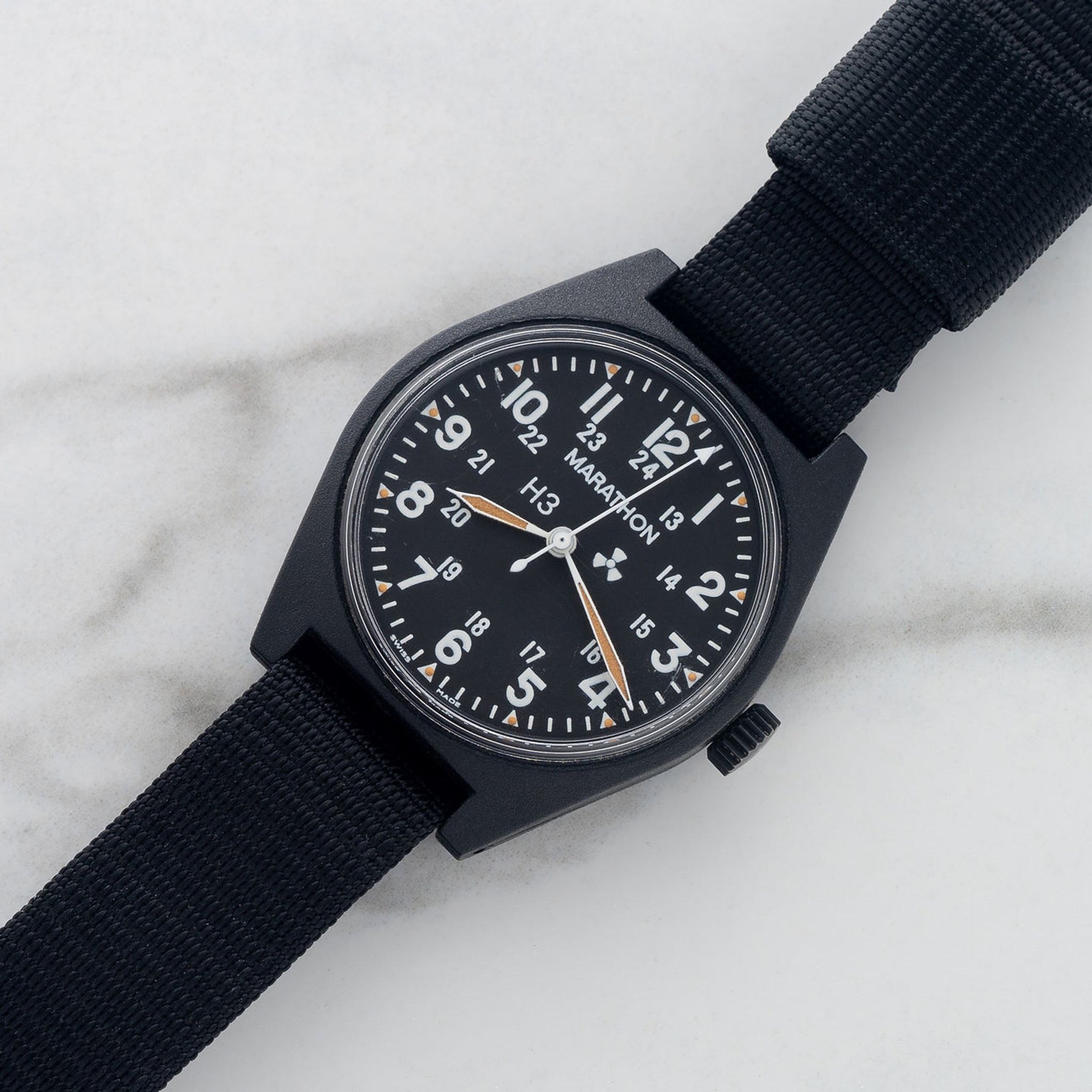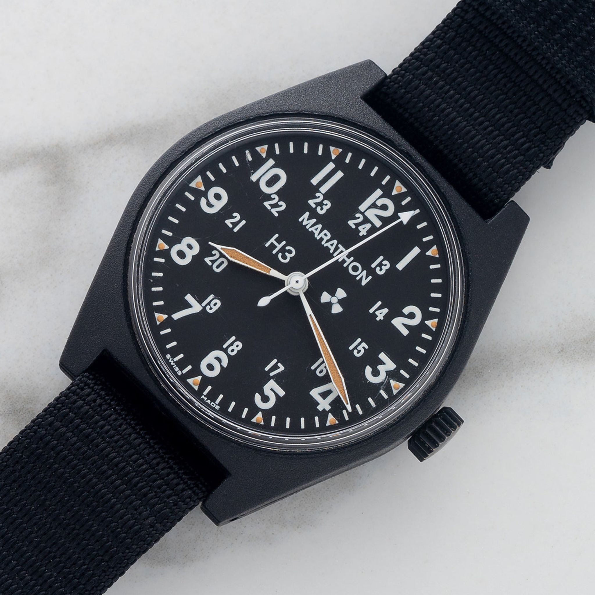 Issued in June of 1990, this Gulf War era Marathon/Gallet is affectionately referred to by collectors as "The Lost Marathon." These pieces are some of the few models that were produced in collaboration with Marathon and Gallet (the ADANAC among other notable ones). We love the lightweight and stealth resin case design as well as large H3 and radiation symbol to show use of tritium for its lume. For more information on the provenance of this this exact piece, it was covered several years ago in our "Field Notes."