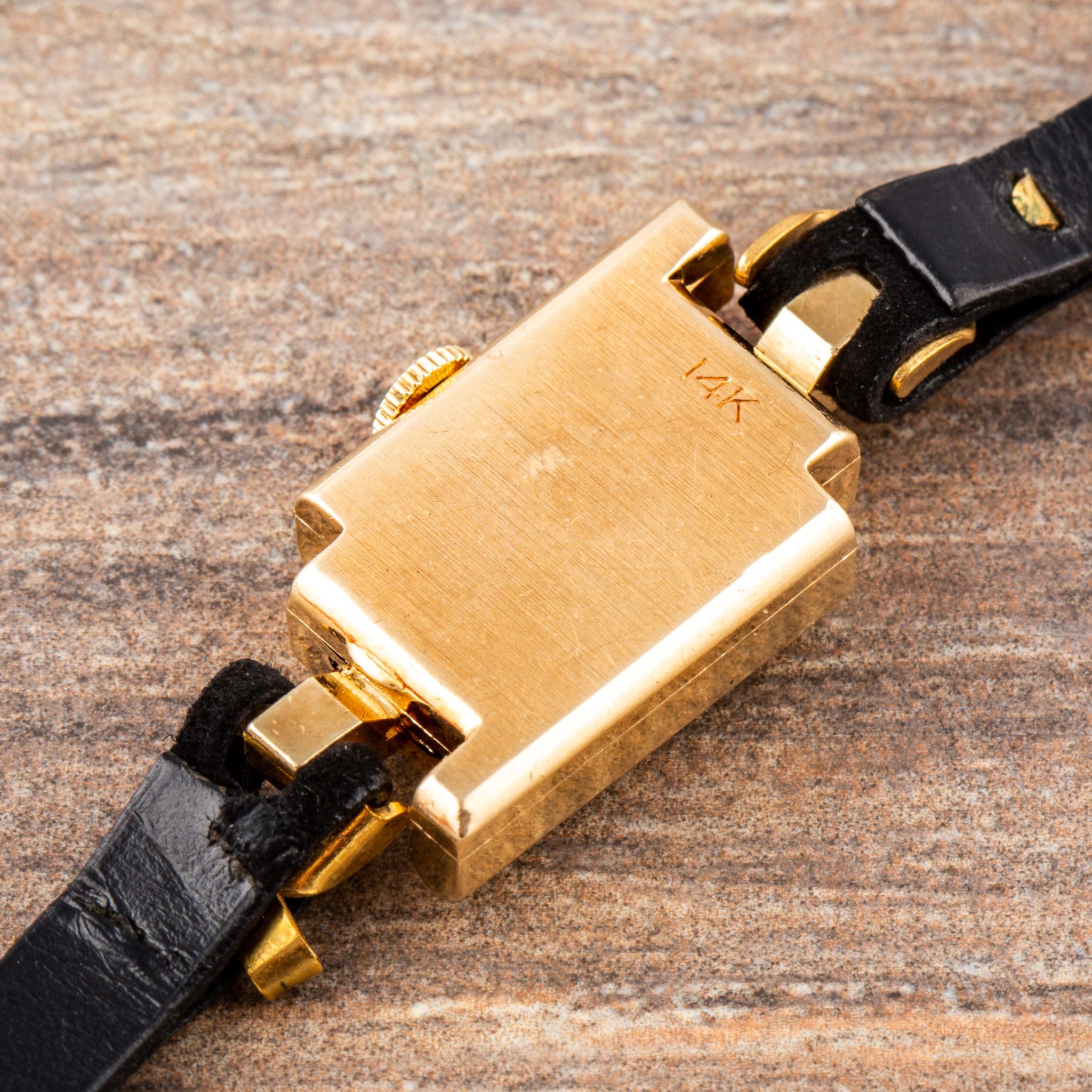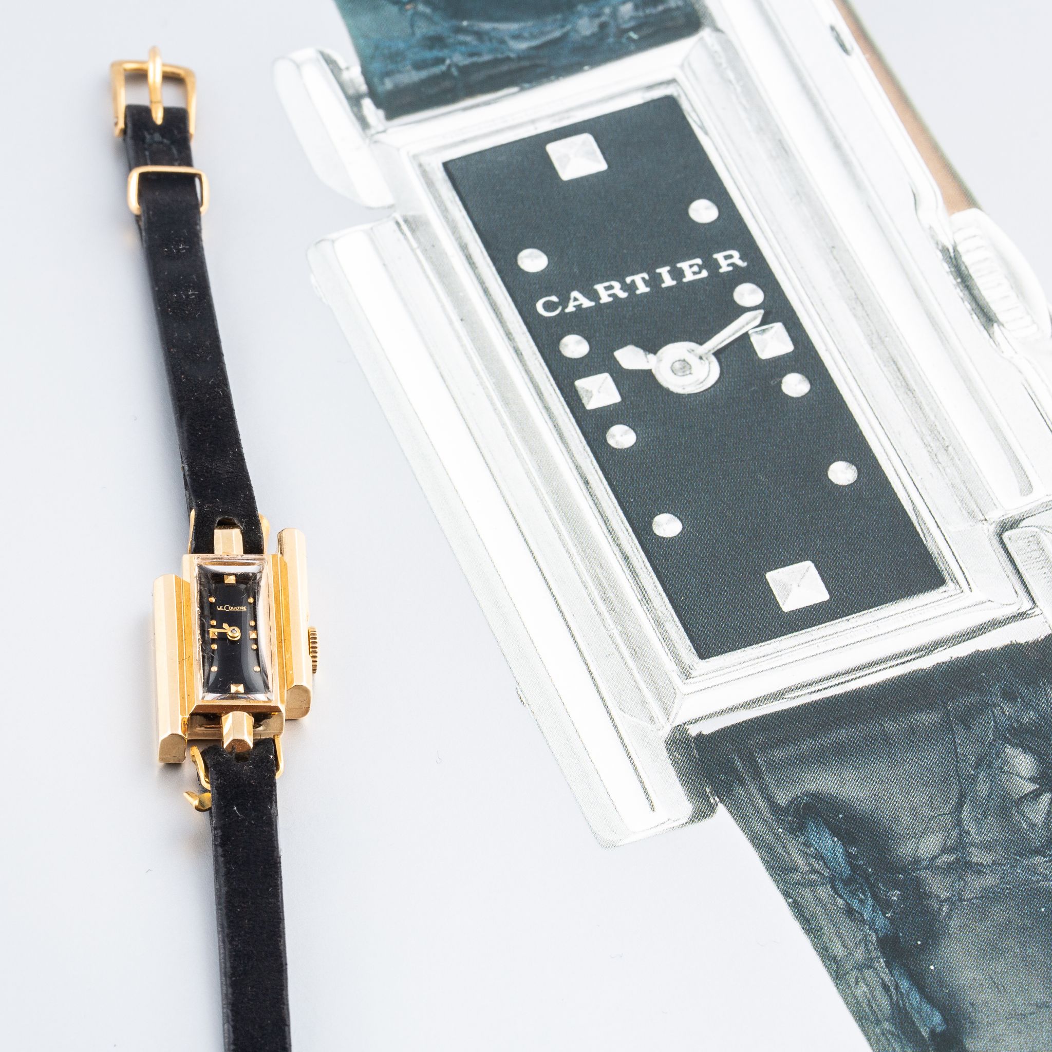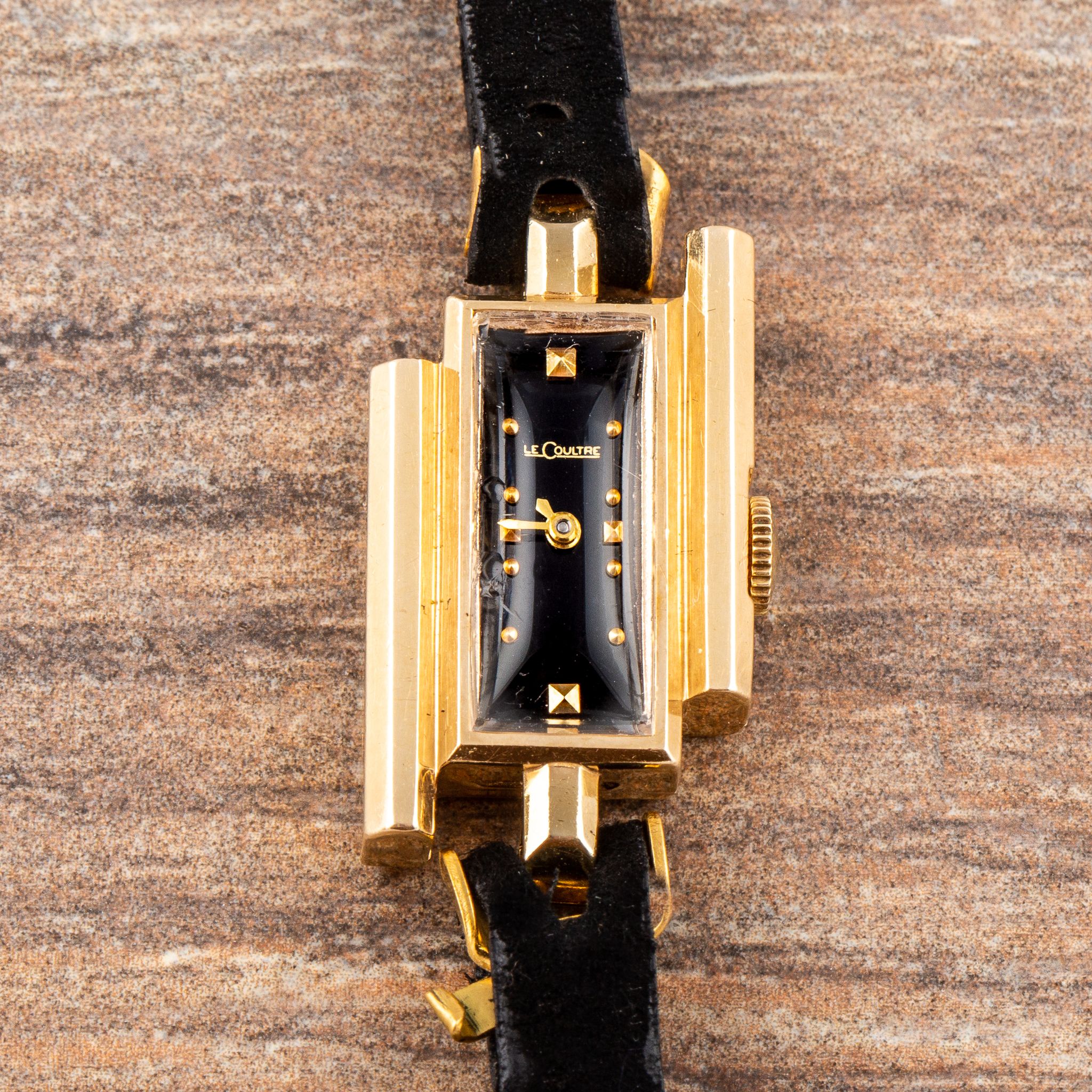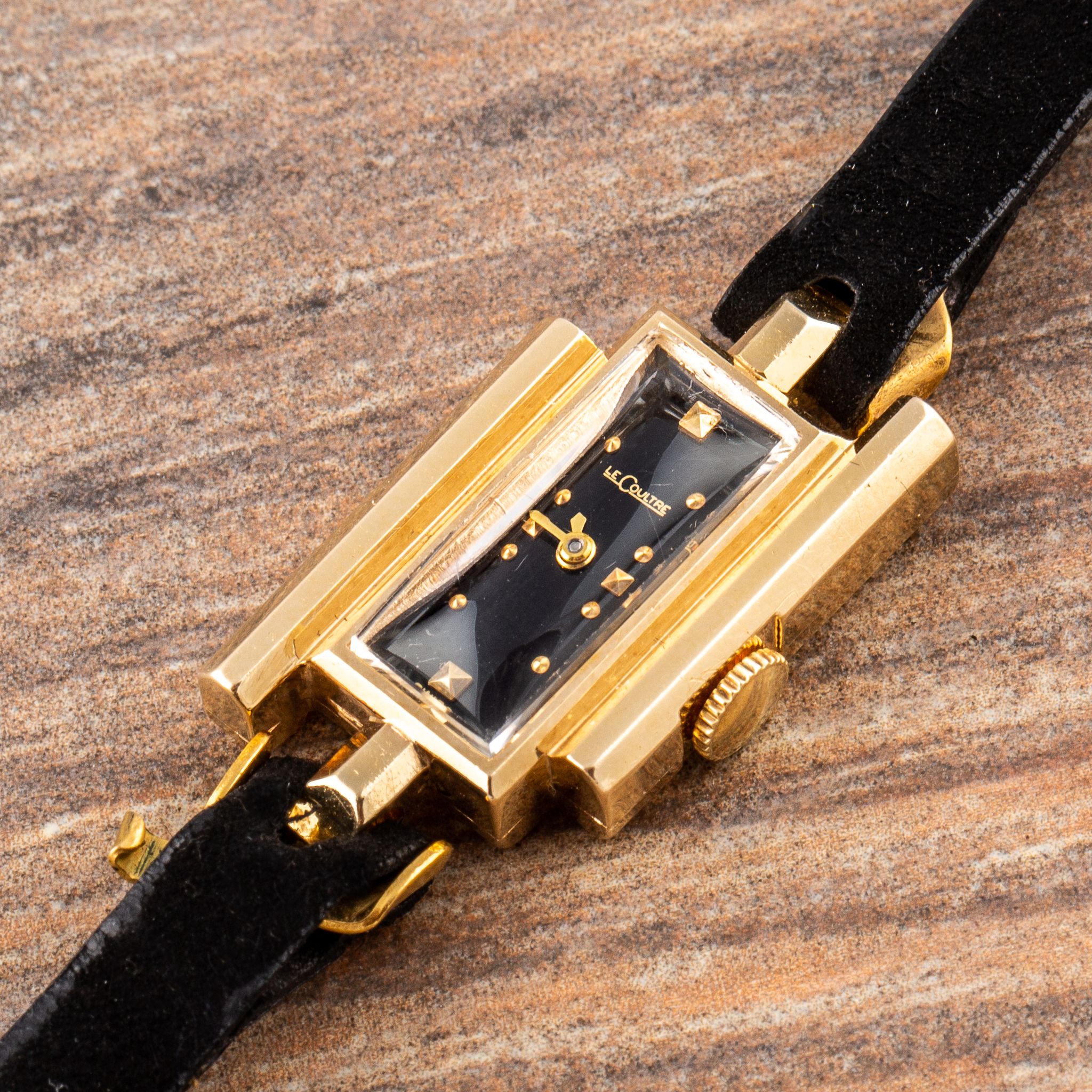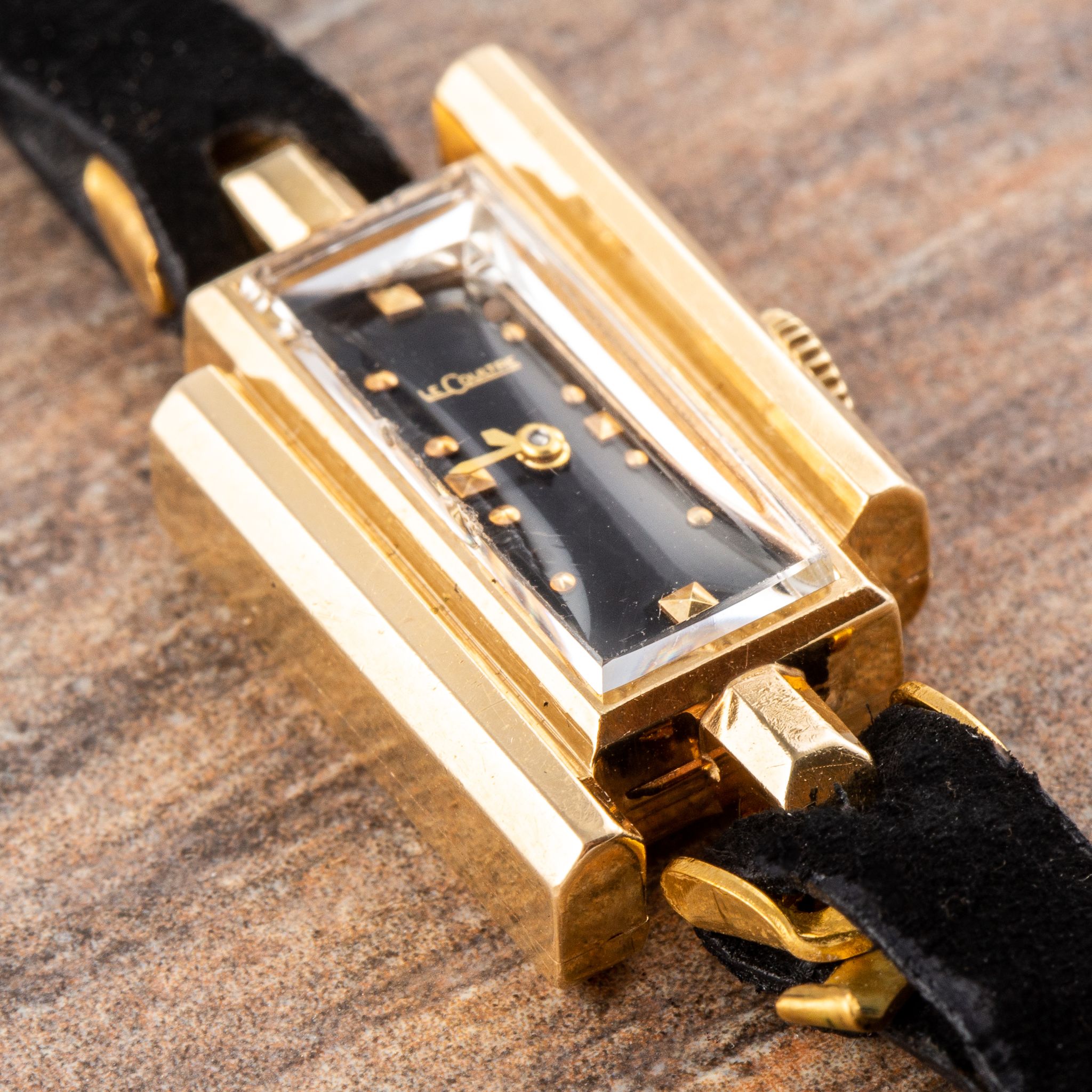 The present Jaeger-LeCoultre Lady wristwatch is a stunning piece from the golden Art Deco era. The 14kt yellow gold case features a very unusual design with an asymmetrical shape. The lugs are different on each side of the watch, creating a fantastic visual effect. Another interesting feature of this wristwatch is the gilt black lacquered dial, signed “LeCoultre,” with geometric gold indexes. Very few watches of this type have surfaced on the market over the years, making this watch extremely sought after by Art Deco wristwatch collectors. The desirability of this watch is further enhanced by its overall quality, featuring a beautifully flawless black gilt dial and a perfectly preserved, likely untouched case. A similar example with a Cartier-signed dial was published in “White Cartier Bianco”, further testifying to the rarity of this model being featured in such an important book.