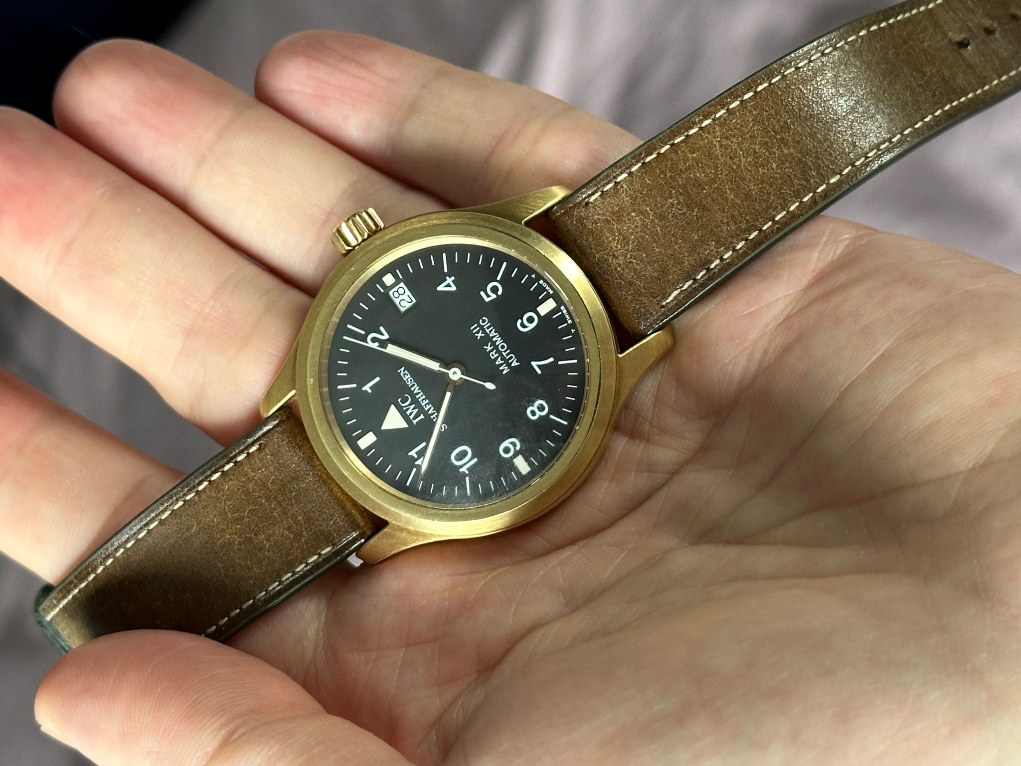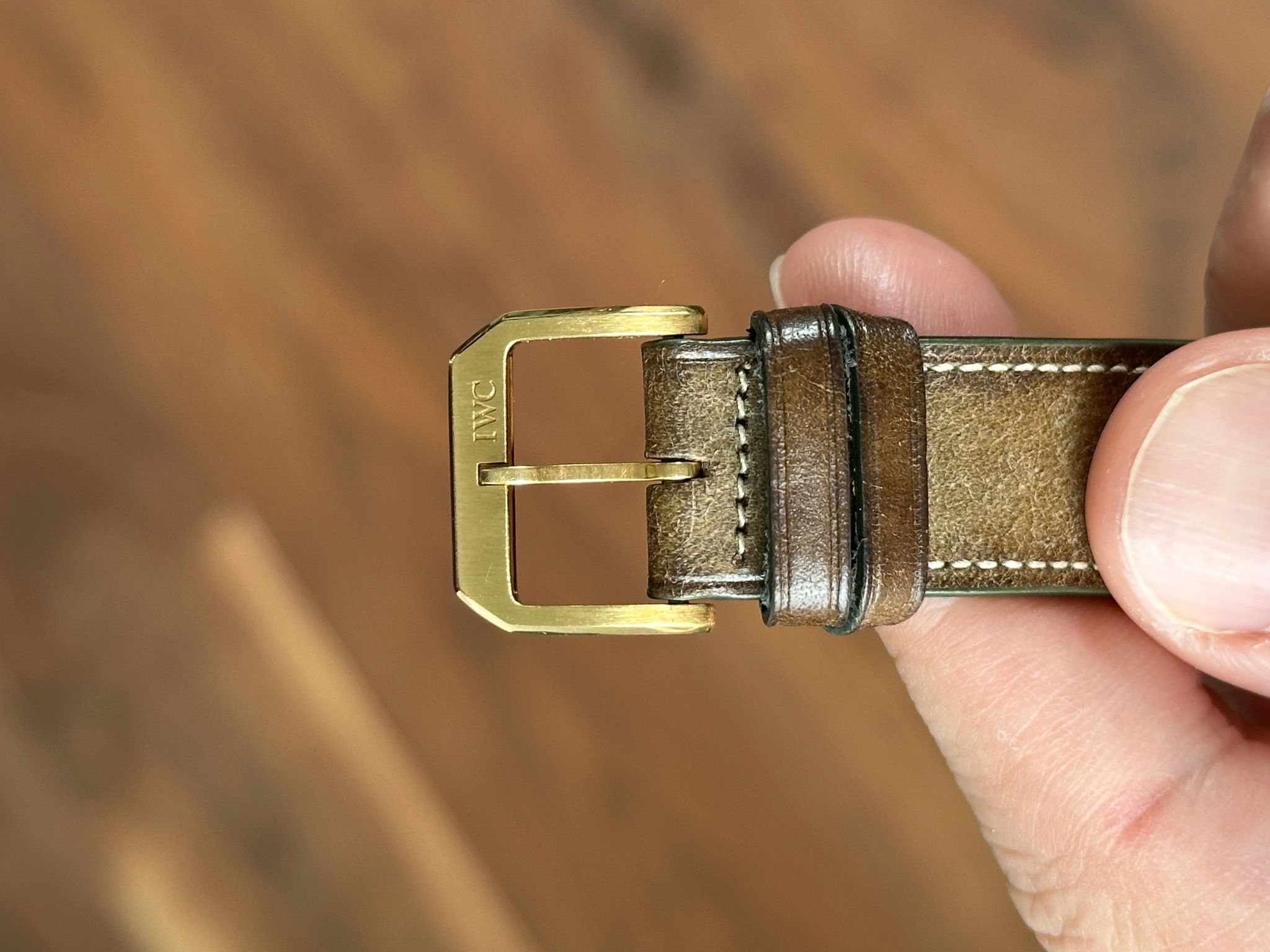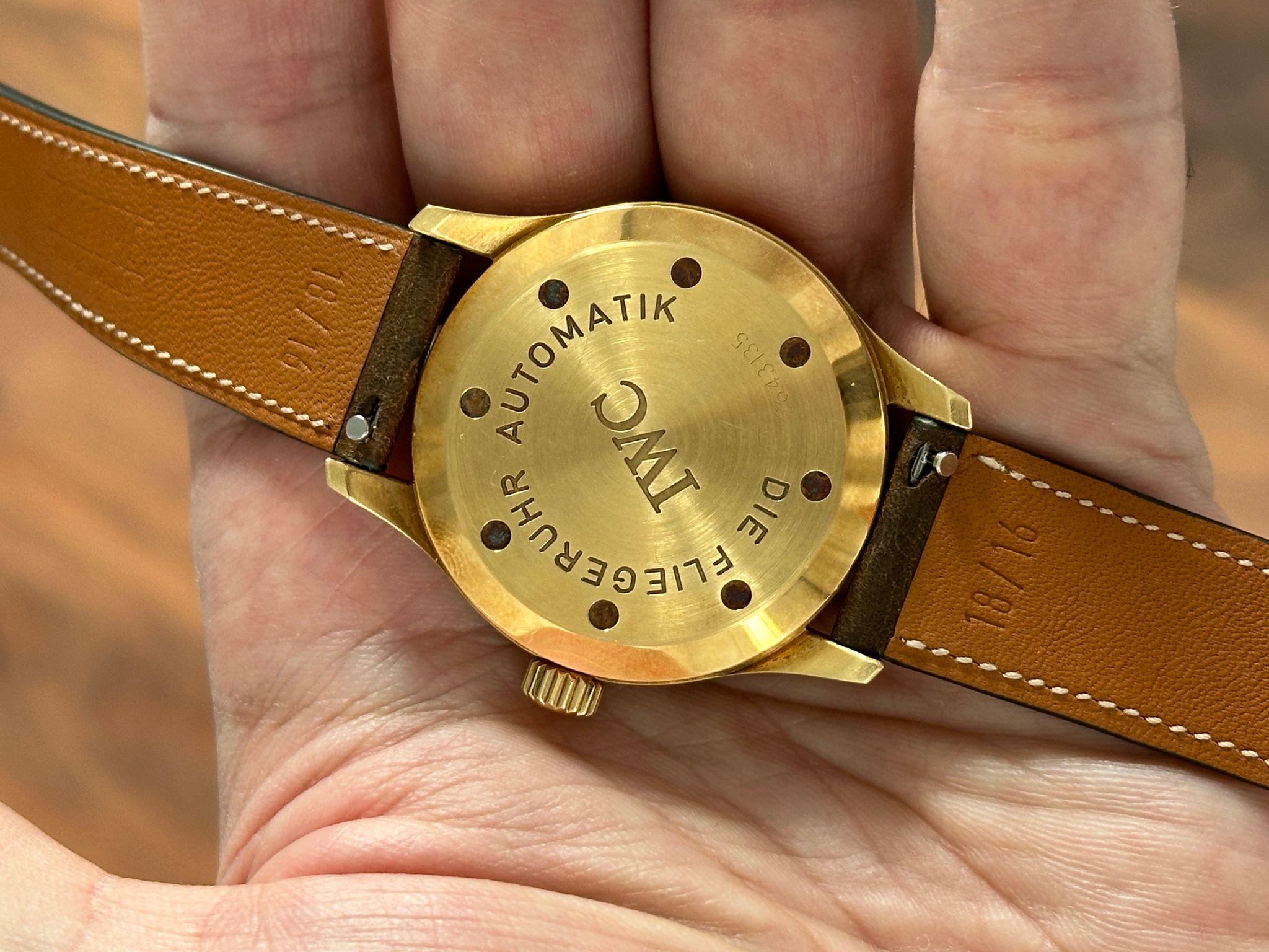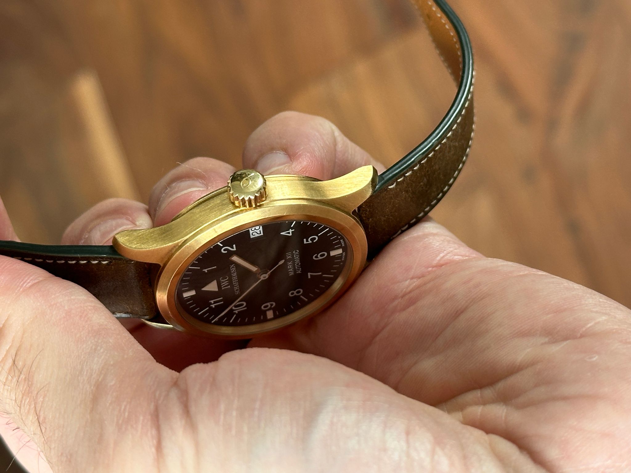 A neo-vintage gem, the 1990s IWC Mark 12, the first IWC Pilots Watch available to civilians. Hard to find in steel, and even more difficult in yellow gold. All hallmarks and engravings are perfect, and watch is likely unpolished. Automatic movement with correct IWC gold clasp.