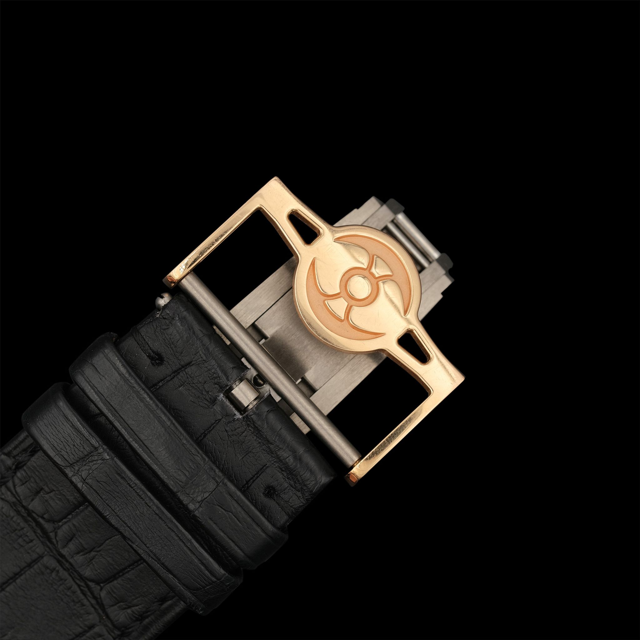 Made from materials such as gold and titanium, it includes a visible date disc and a 22-karat gold rotor. The automatic movement, developed in collaboration with Jean-Marc Wiederrecht of Agenhor, operates at a frequency of 28,800 vibrations per hour and has a power reserve of 42 hours.