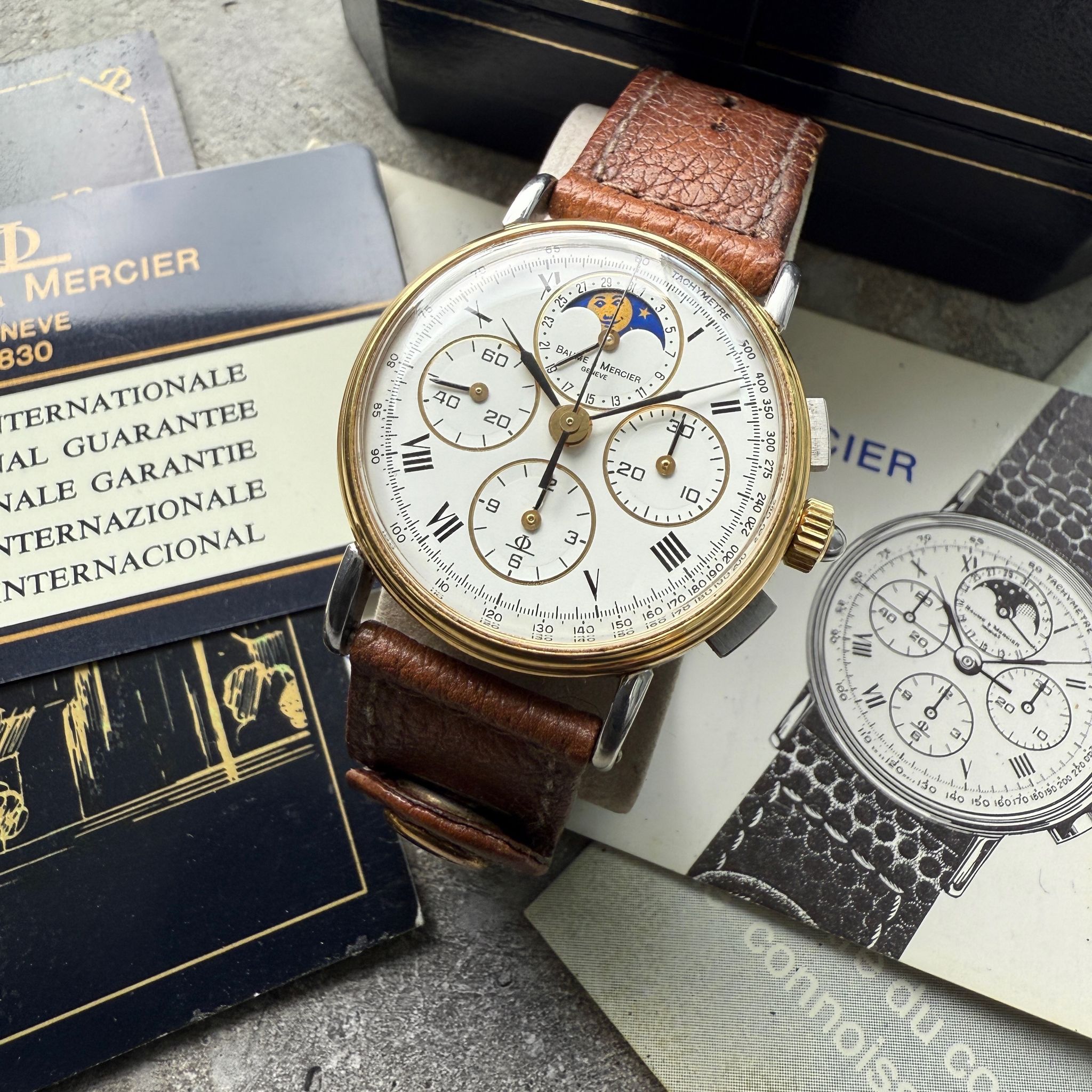 This vintage Baume & Mercier Chronograph, reference 6102.099, is a masterful blend of timeless sophistication and mechanical artistry. Featuring a captivating moon phase complication, prominently displayed on the dial, adds a poetic touch, connecting the wearer to the celestial rhythms that have inspired watchmakers for centuries.