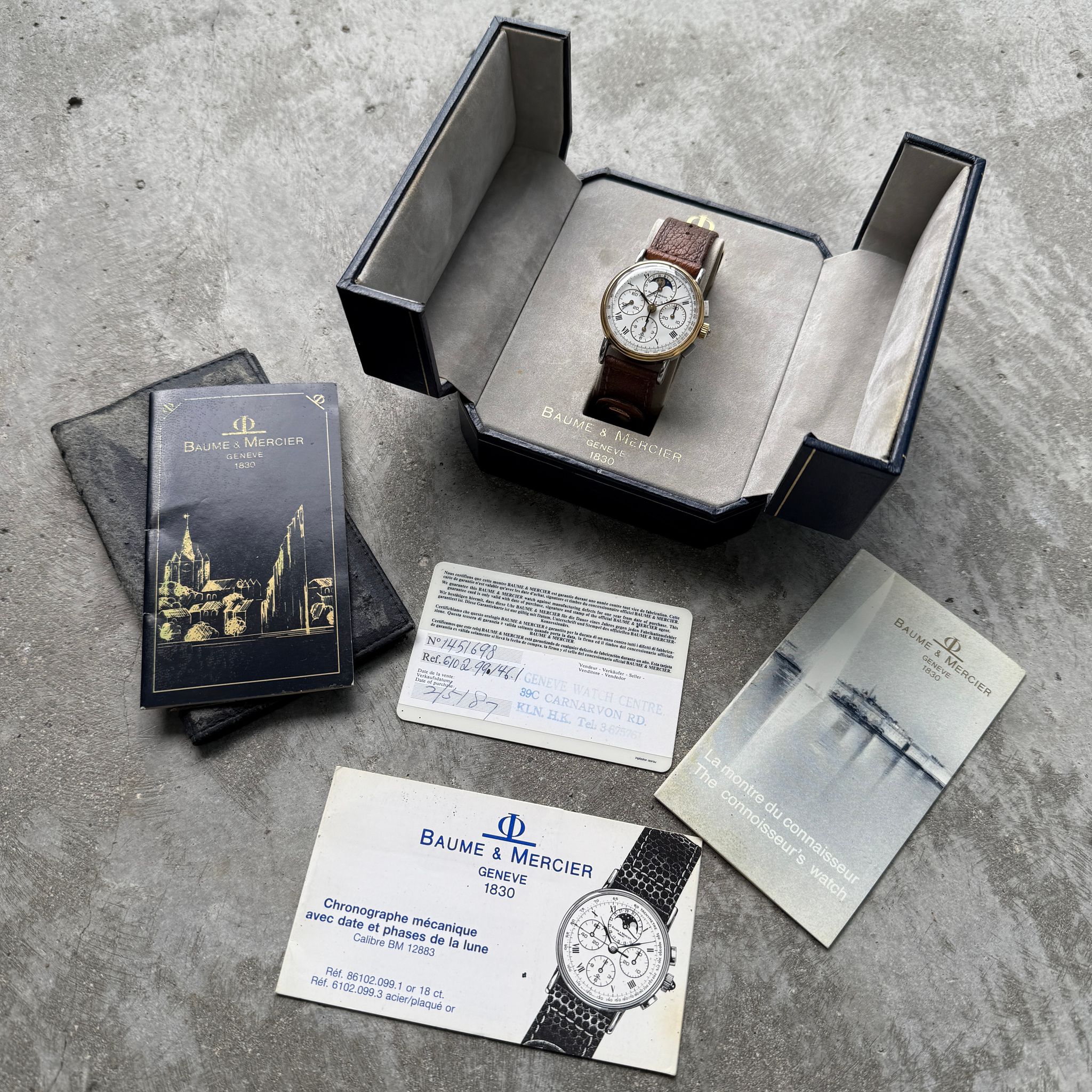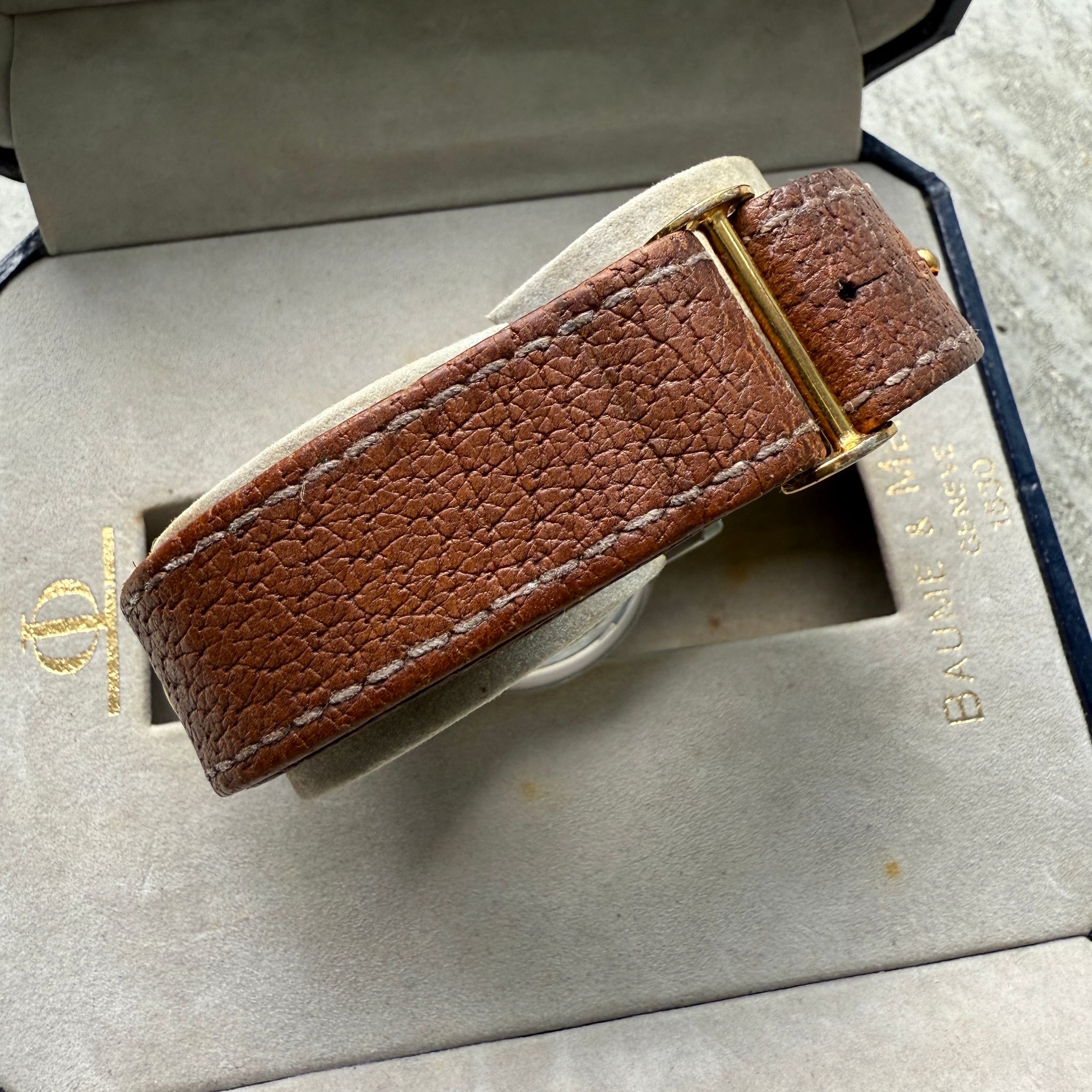 Preserved in outstanding sharp unpolished condition, this Baume & Mercier retains the crisp lines and sharp edges of its original case. Its untouched finish speaks to a careful past, giving it an authentic vintage charm that collectors deeply admire. Complementing this pristine state, the watch comes complete with its seldom-seen original box and warranty card— a rarity that significantly enhances its appeal as a collectible. Such a comprehensive set is a treasure for collectors, amplifying the watch’s desirability and historical significance.