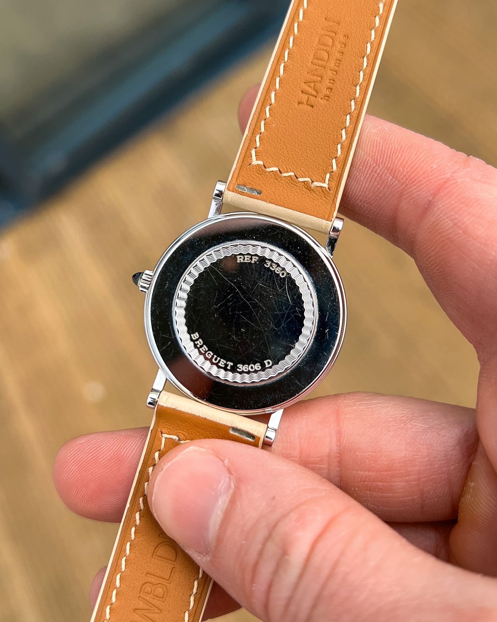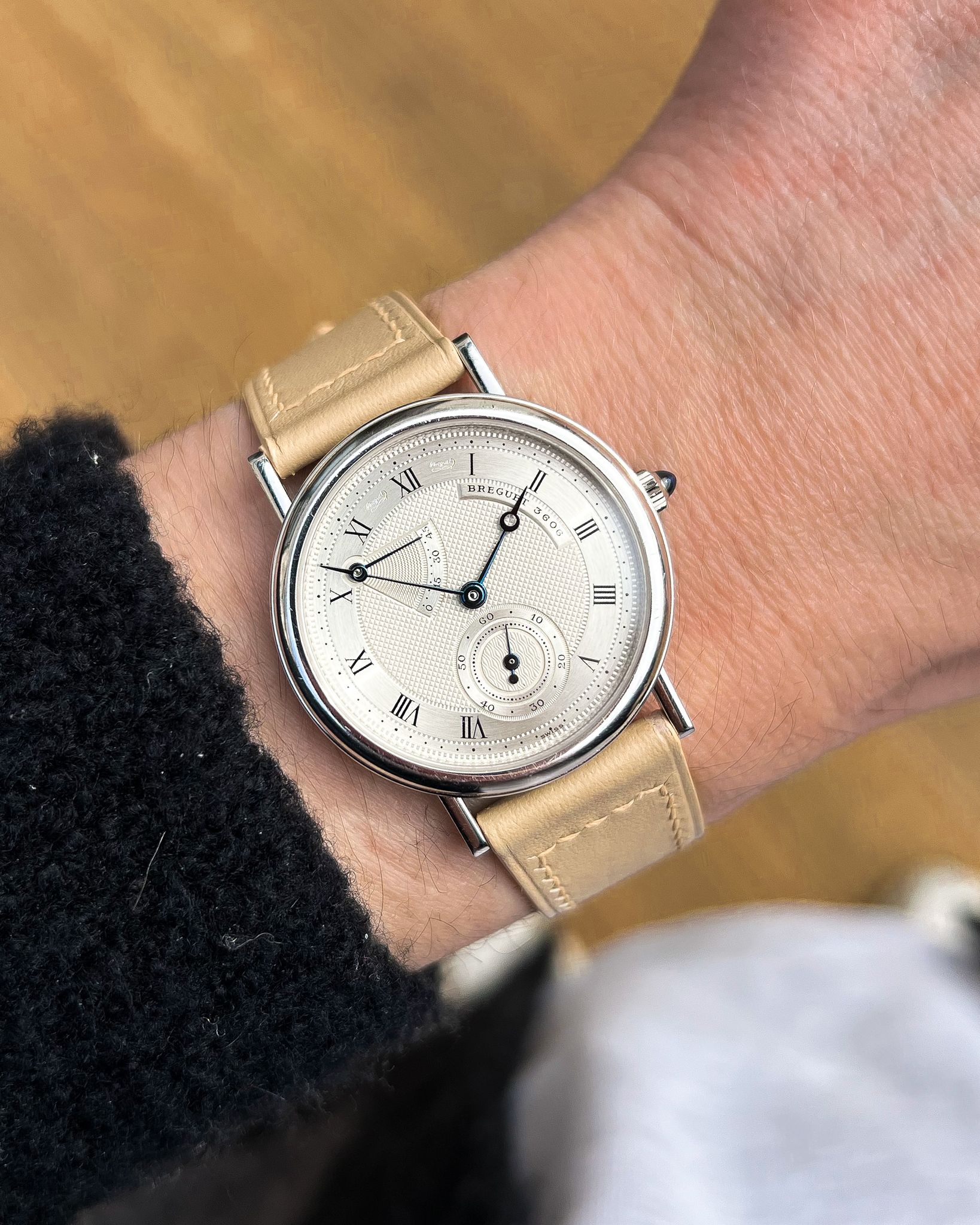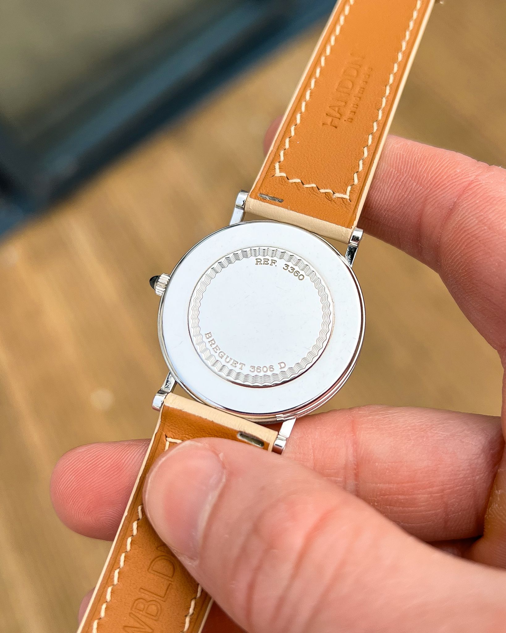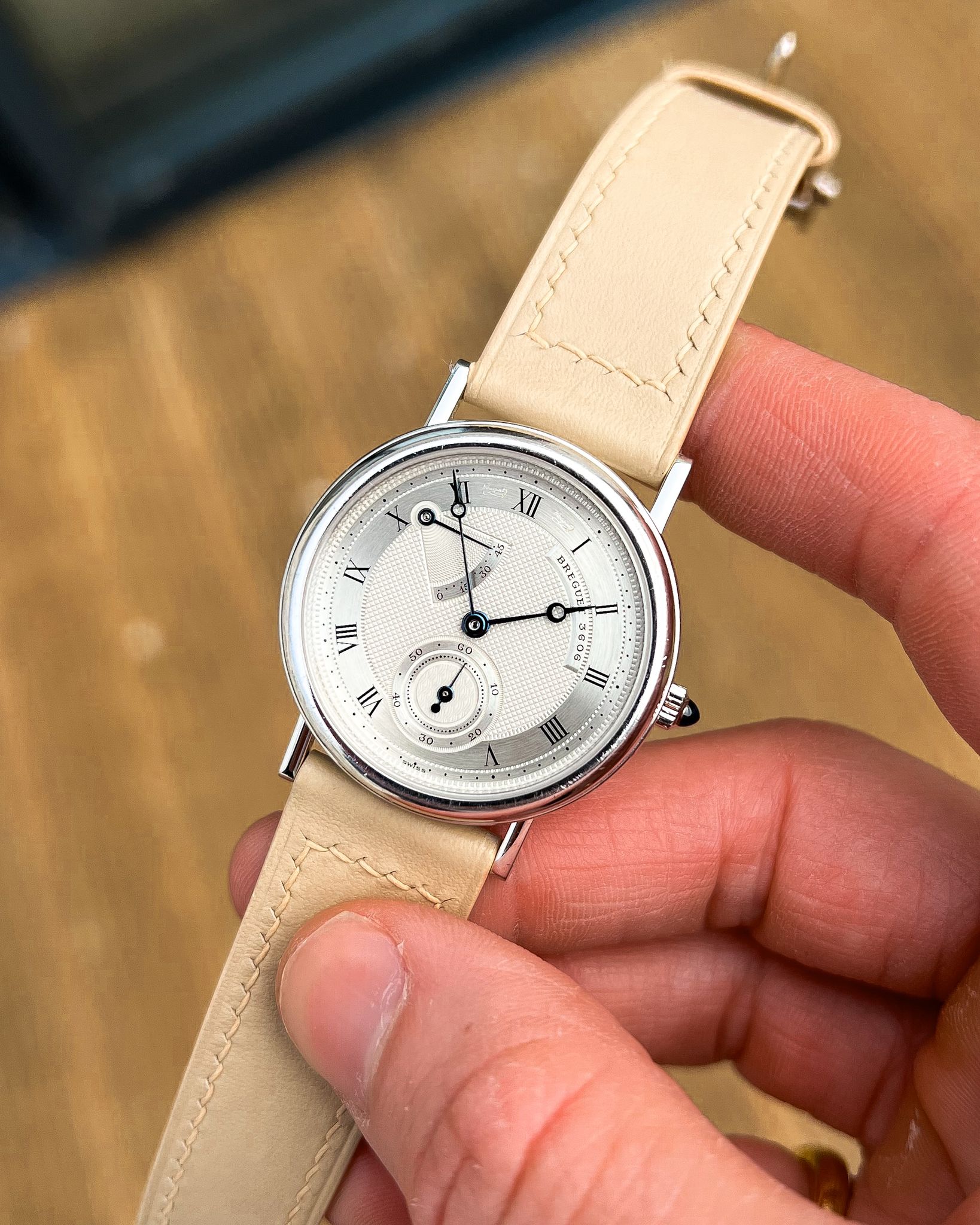 *What I love —* Unpolished example of a relatively rare reference. Beautiful and classic Breguet aesthetic with the dial in perfect condition. Original 18k white gold buckle fitted to a custom Handdn strap (original Breguet strap also included). Deep blue cabochon complimenting the blued hands against the white metal. All engravings deep and crisp.