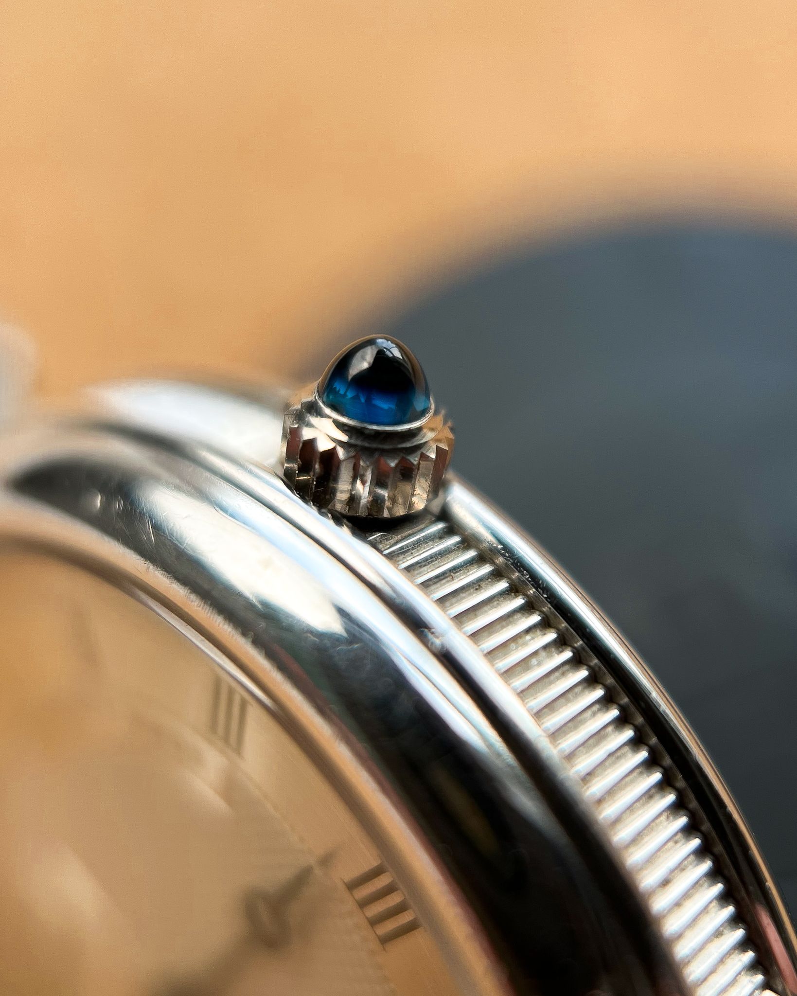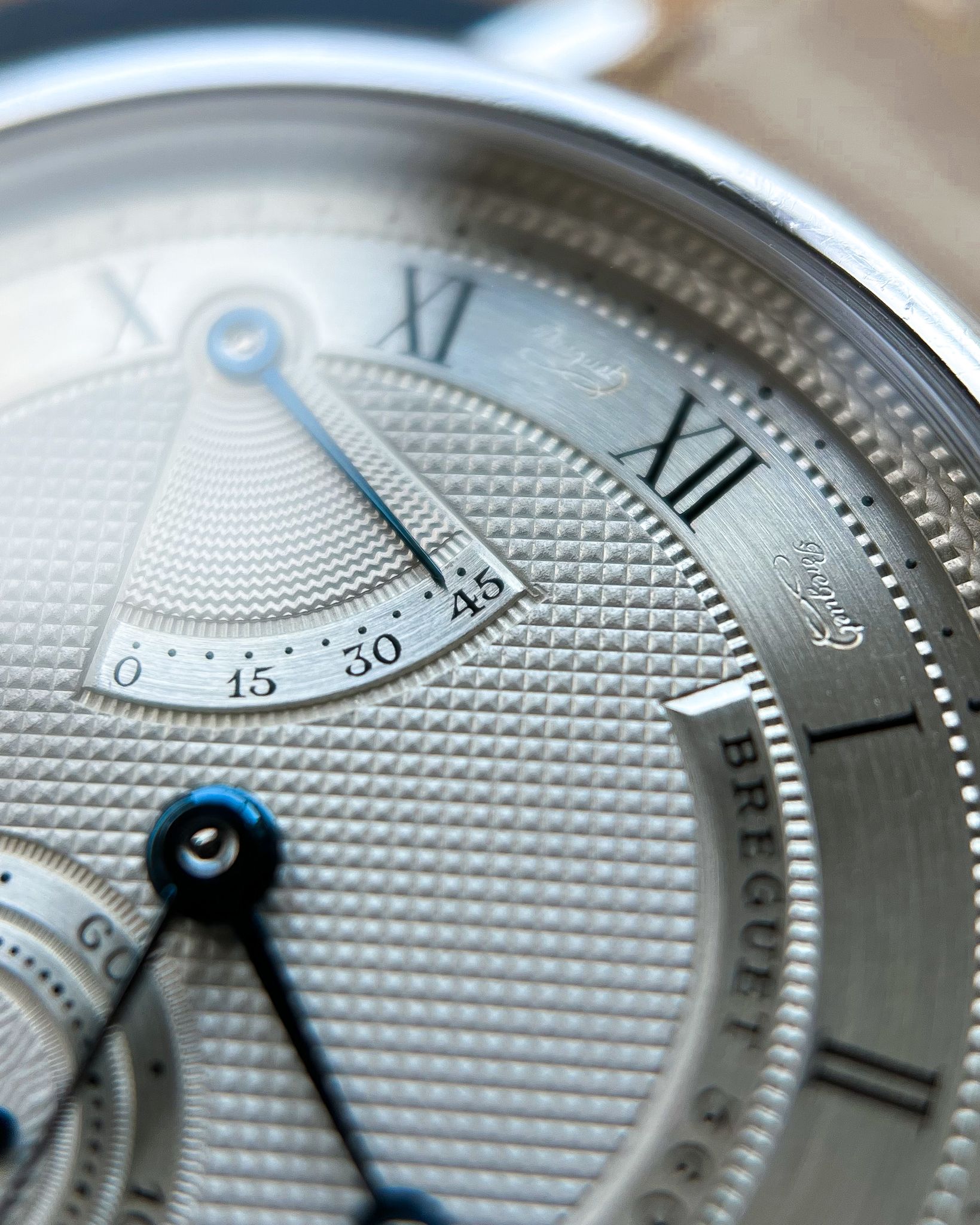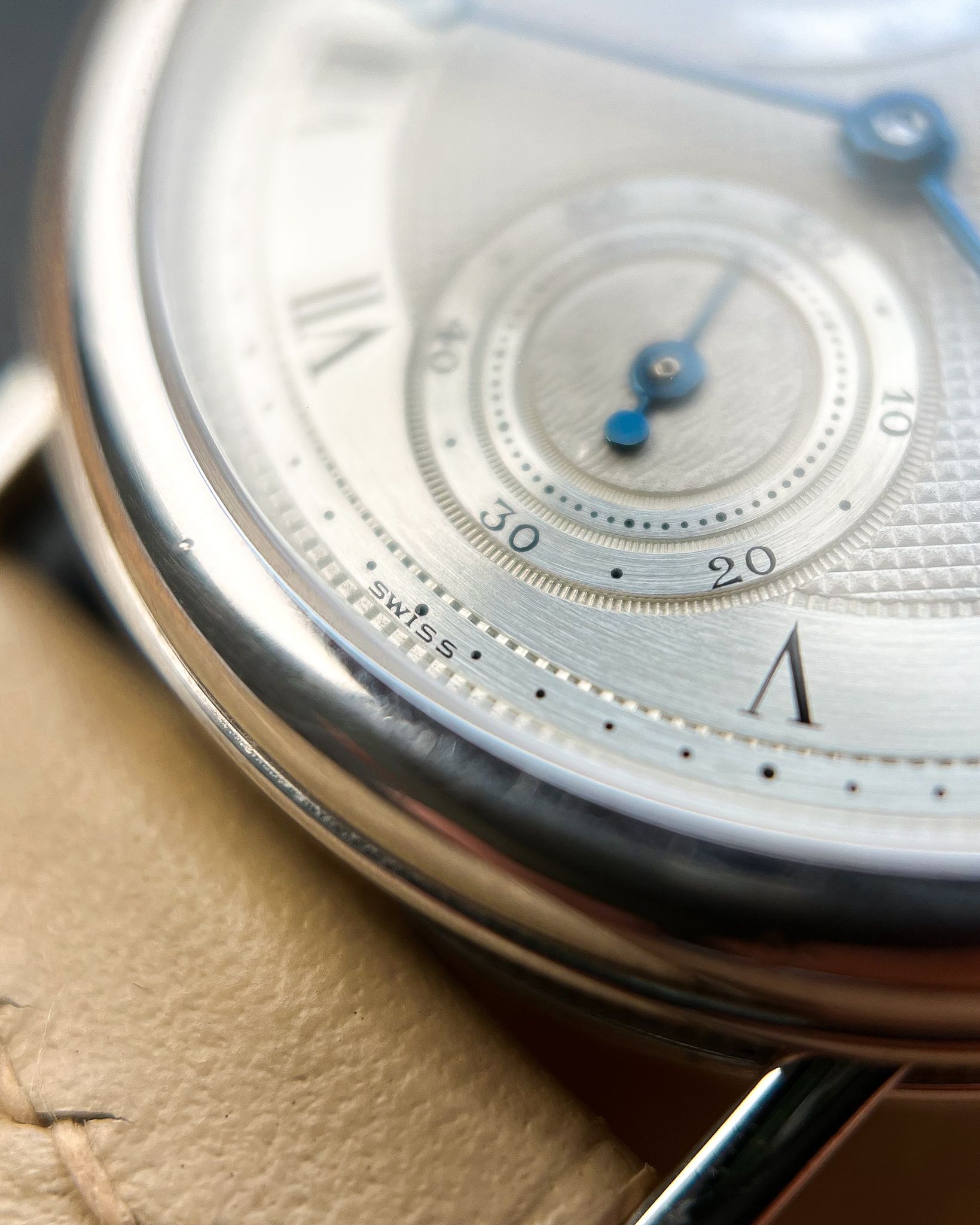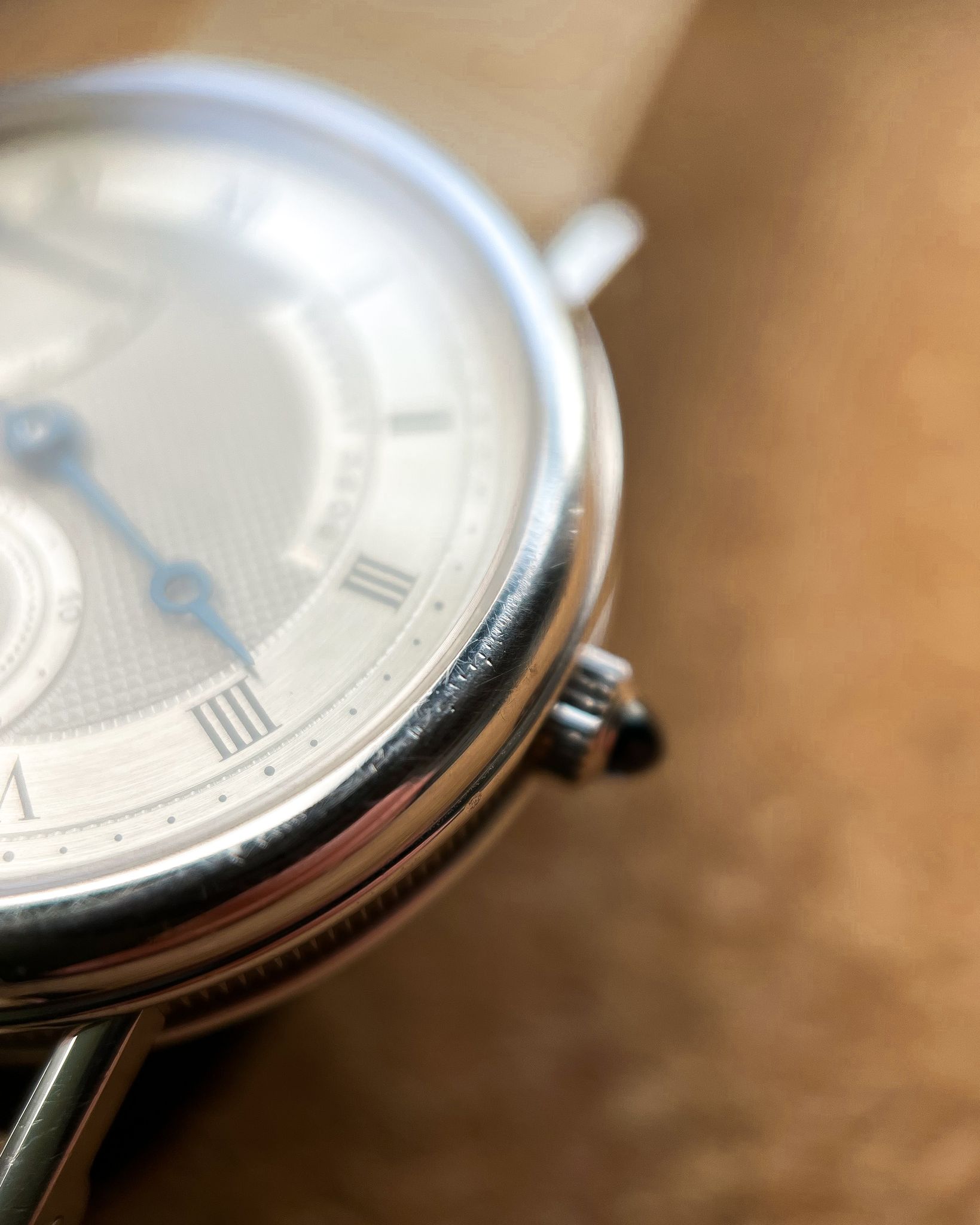 *What I love —* Unpolished example of a relatively rare reference. Beautiful and classic Breguet aesthetic with the dial in perfect condition. Original 18k white gold buckle fitted to a custom Handdn strap (original Breguet strap also included). Deep blue cabochon complimenting the blued hands against the white metal. All engravings deep and crisp.