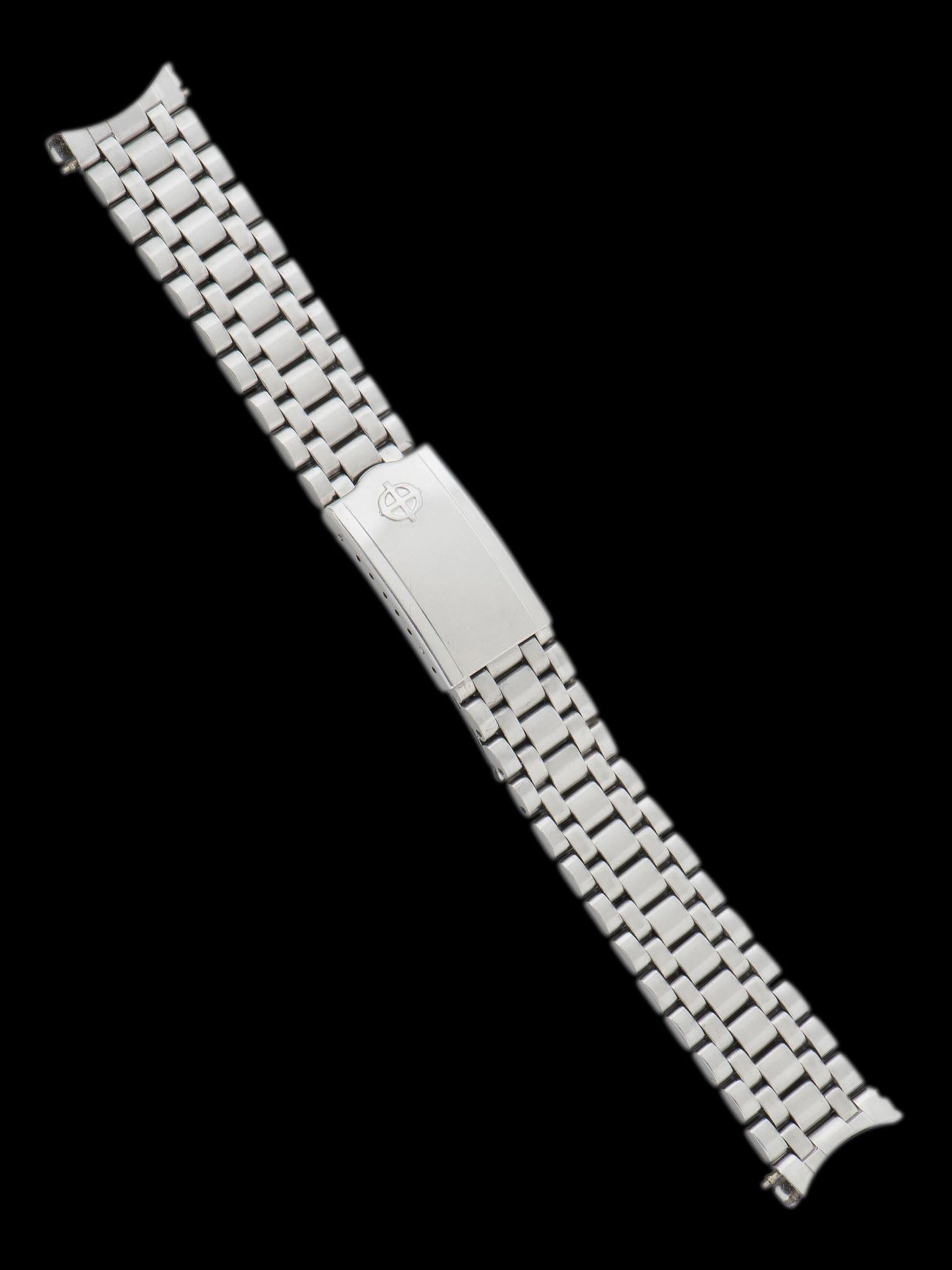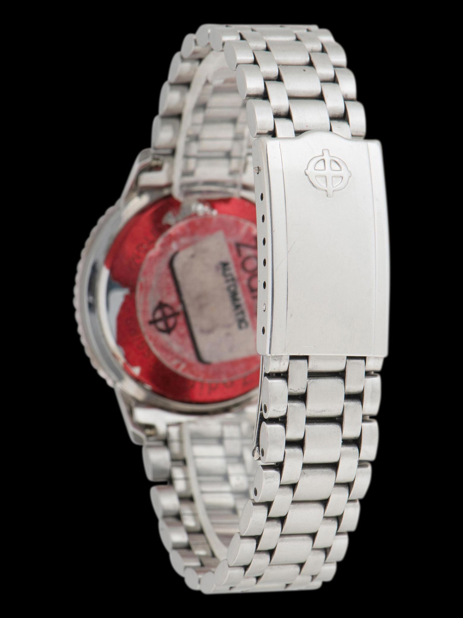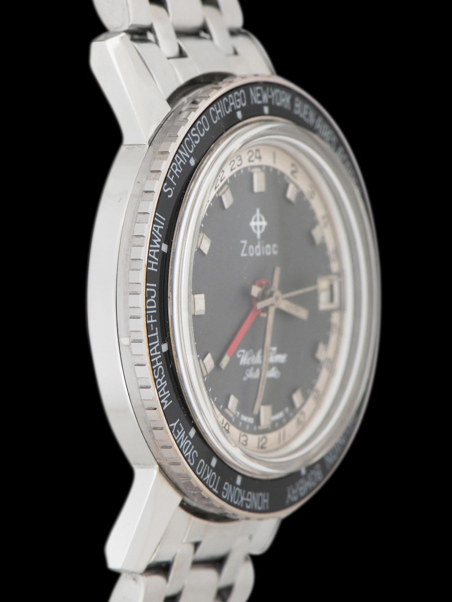 The incredible case is in mint condition, showing no evidence of being previously polished with only nominal signs of previous wear. The orignal black bakelite World Time bezel is also in exceptional condition with no crack present and only minor signs of use. The Zodiac signed button crown is orignial to the watch and operates the quickset date function. The case back retains most of its original factory protective red film, along with the original case back sticker. The watch comes on its original JB Champion-made stainless steel Zodiac bracelet with 22 links that show minimal stretch for the style and age of the bracelet. The watch will fit up to a 7.5-inch wrist.