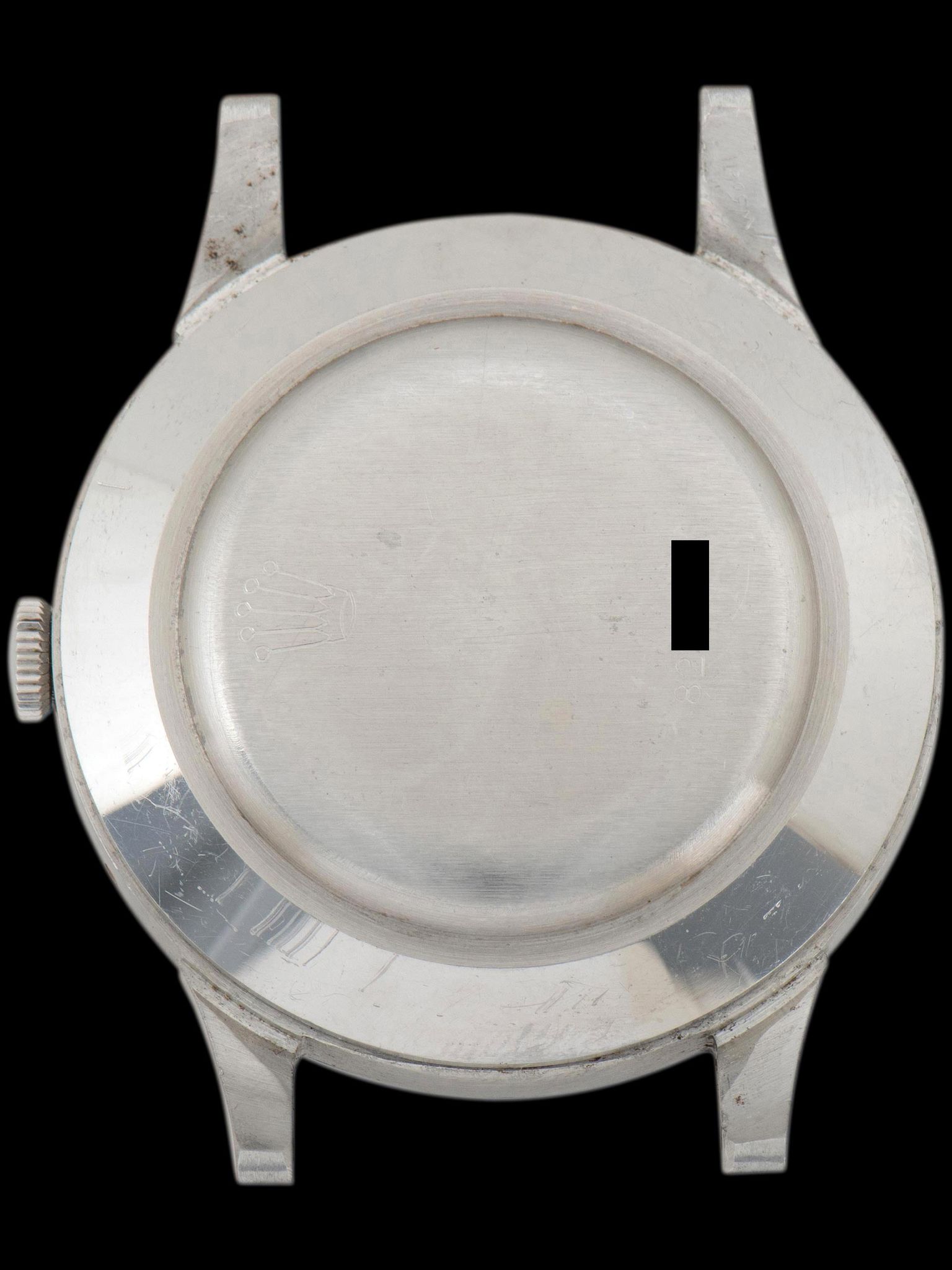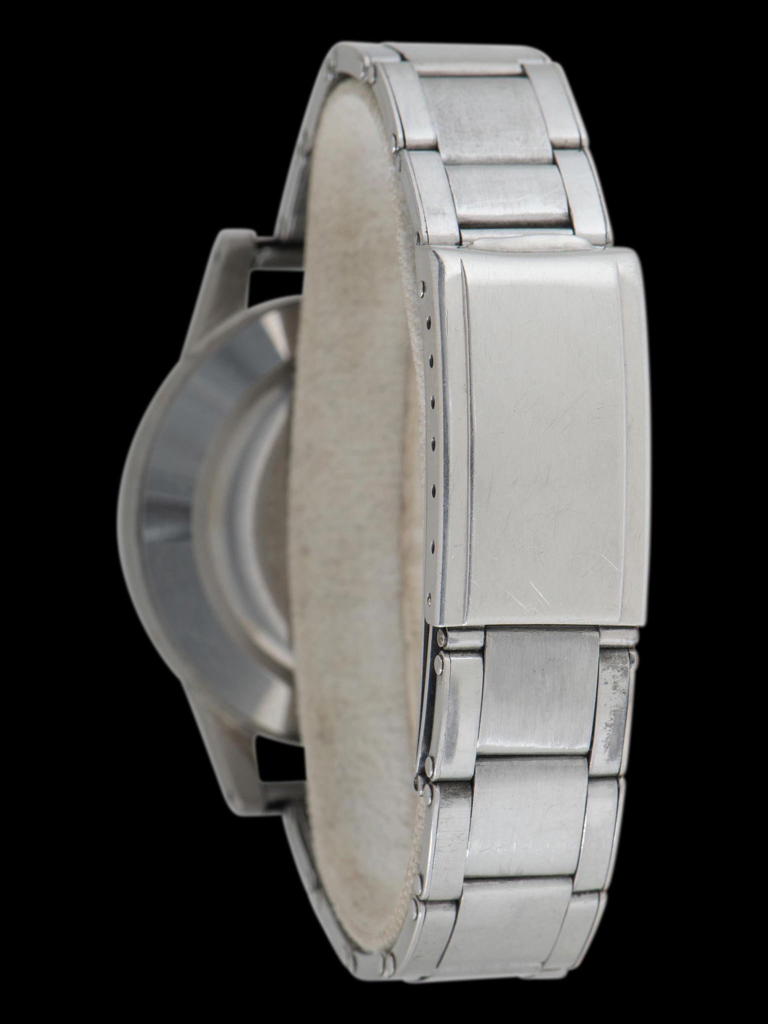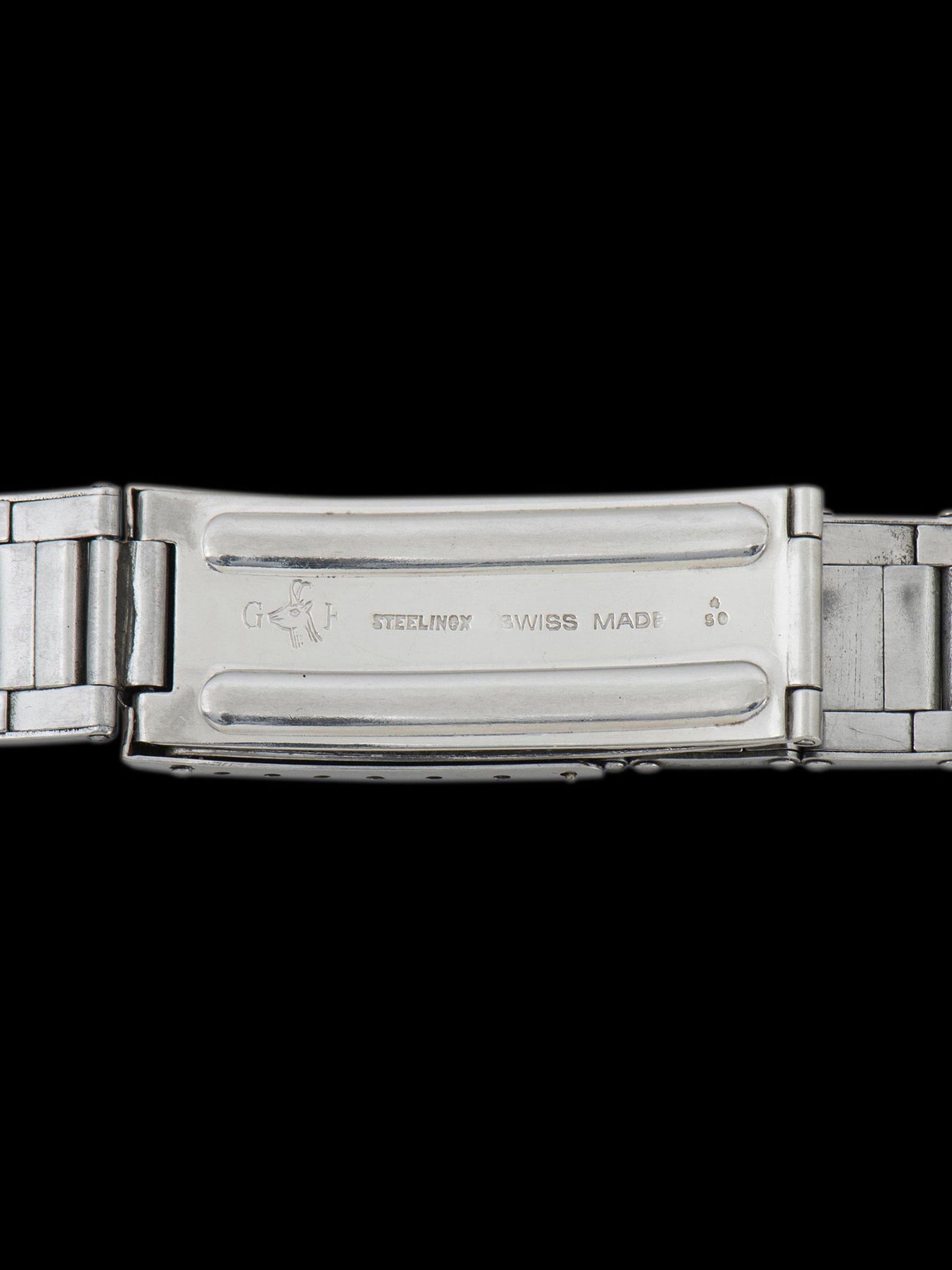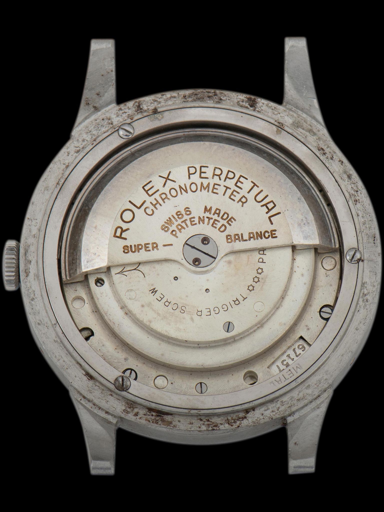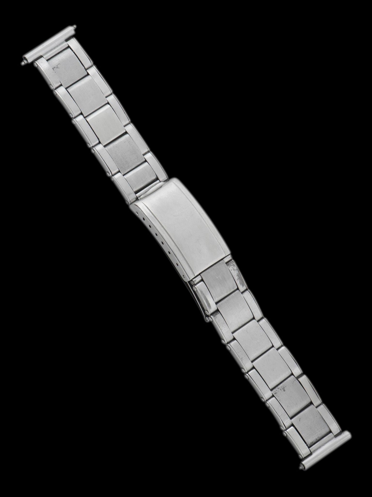 The incredible case is believed to remain unpolished, retaining factory-sharp finishing, lug holes, and edges throughout with no evidence of restoration present. There are honest signs of gentle wear throughout the case, though no notable dents or scratches are present. There is a light amount of corrosion present on the back of the lugs and inside the case back, which is expected for non-waterproof watches of this age. The case retains the original unsigned crown. The small brass calendar setting pushers located on the side of the case at 2, 4, 8, and 10 o'clock are original as well. The case back also remains unpolished, retaining the Rolex coronet engraving and serial number, which were faintly applied at the factory and are commonly lost to polishing. Sourced on the watch is an era-correct and very rare Gay-Freres stretch-link Oyster bracelet with straight end pieces, stamped 4th quarter of 1950. The bracelet exhibits almost no stretch from wear and will fit up to a 7-inch wrist.