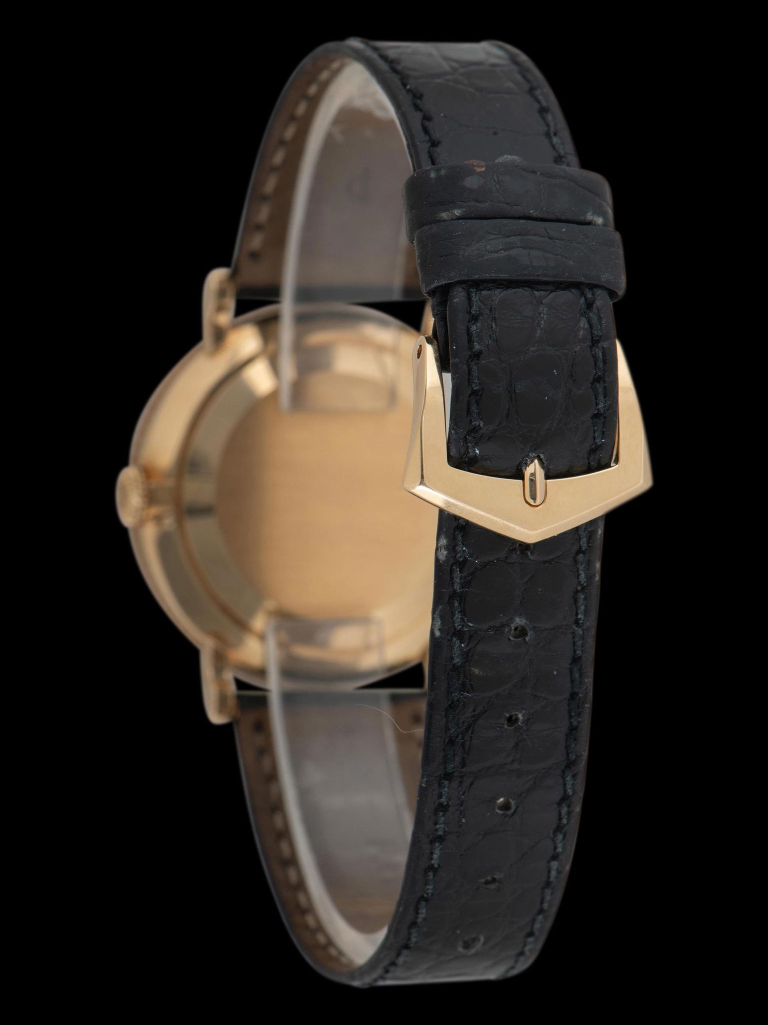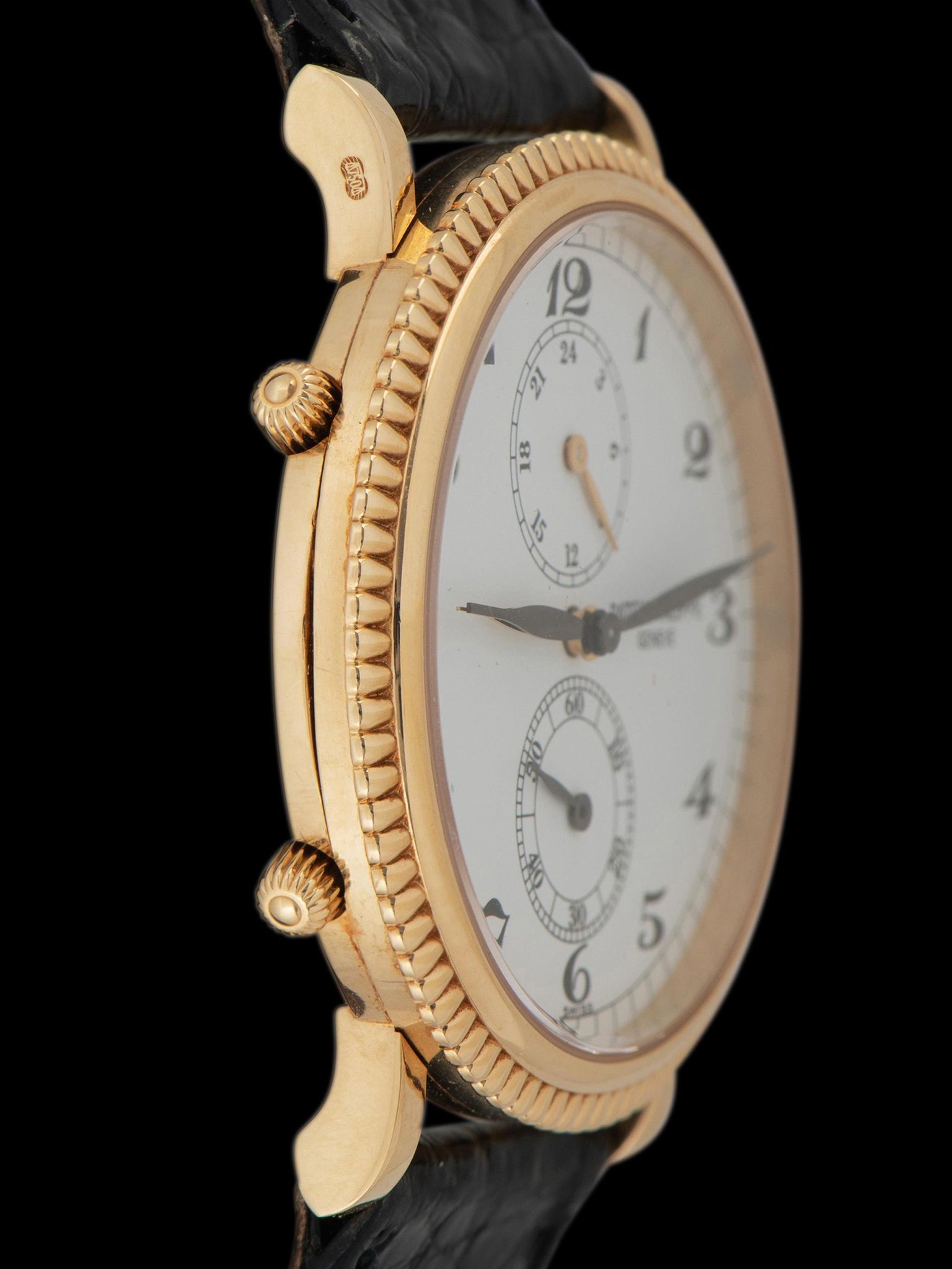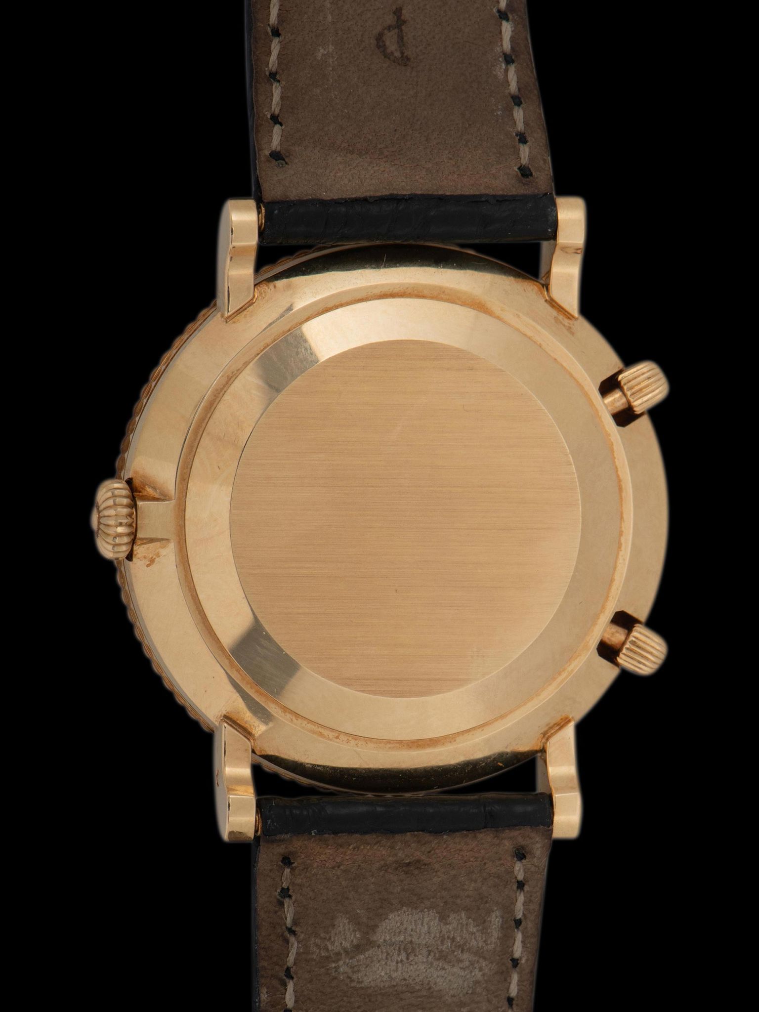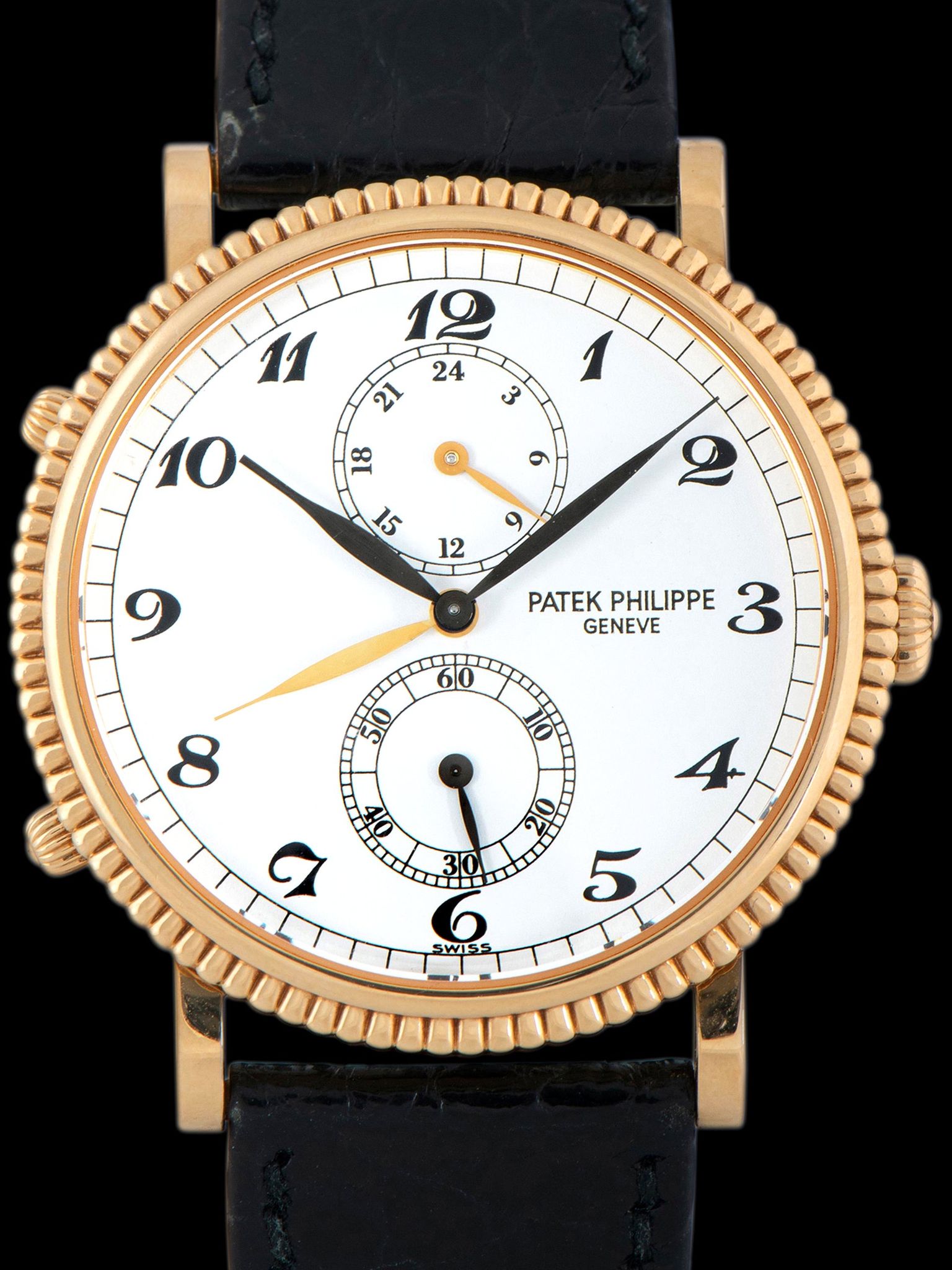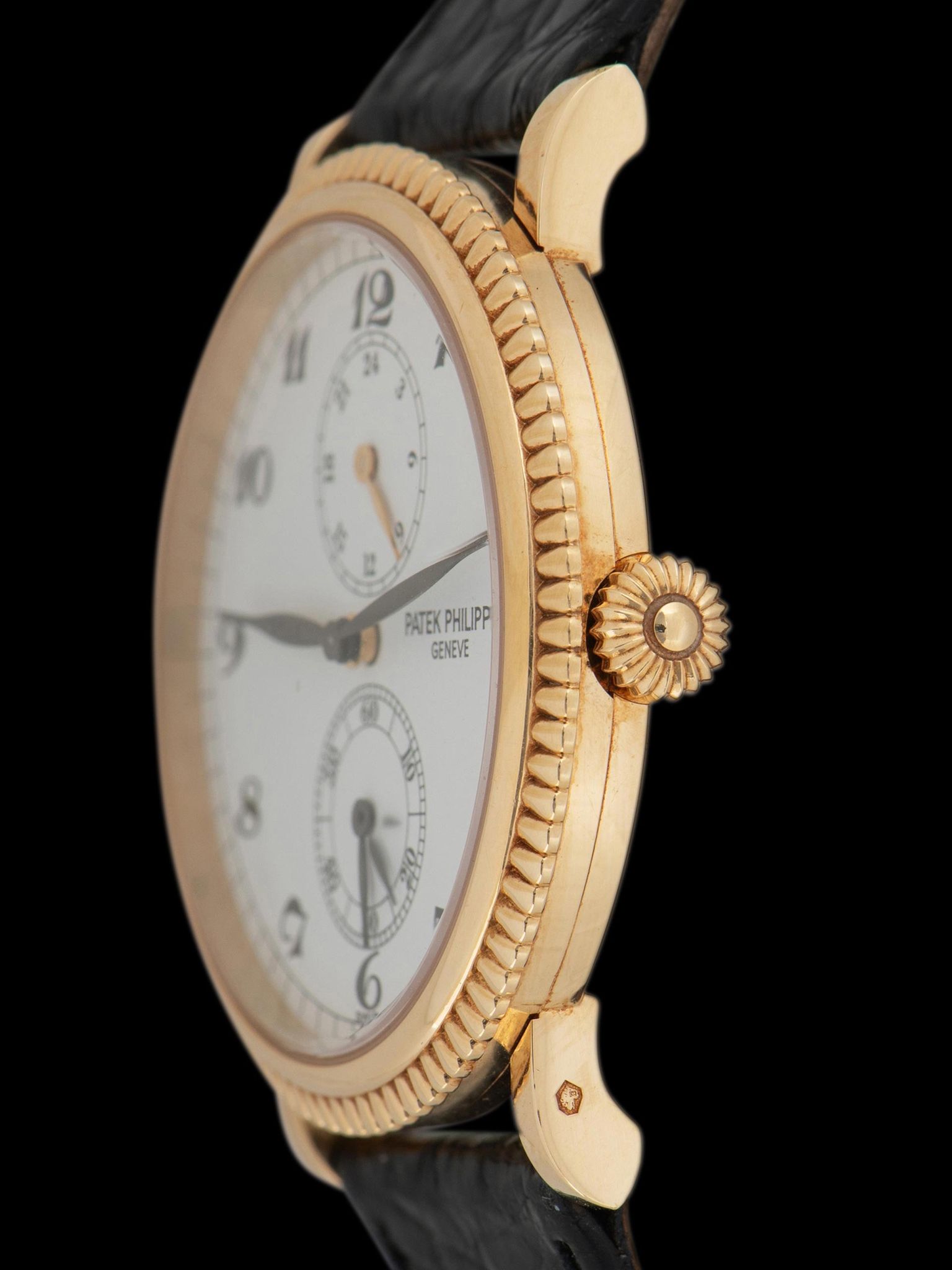 The unpolished 18k yellow gold case is in extremely well-preserved condition, retaining its factory finishing on the case and clean lugs, showing only very light signs of use. The ornately knurled 18k yellow gold bezel is also in excellent condition with little signs of use present. The watch retains its original onion-style crown and setting pushers located at 8 and 10 o'clock. The case back also remains in very crisp and excellent condition. The watch is finished with its original black alligator leather strap with a matching Patek Philippe signed 18K yellow gold tang buckle.