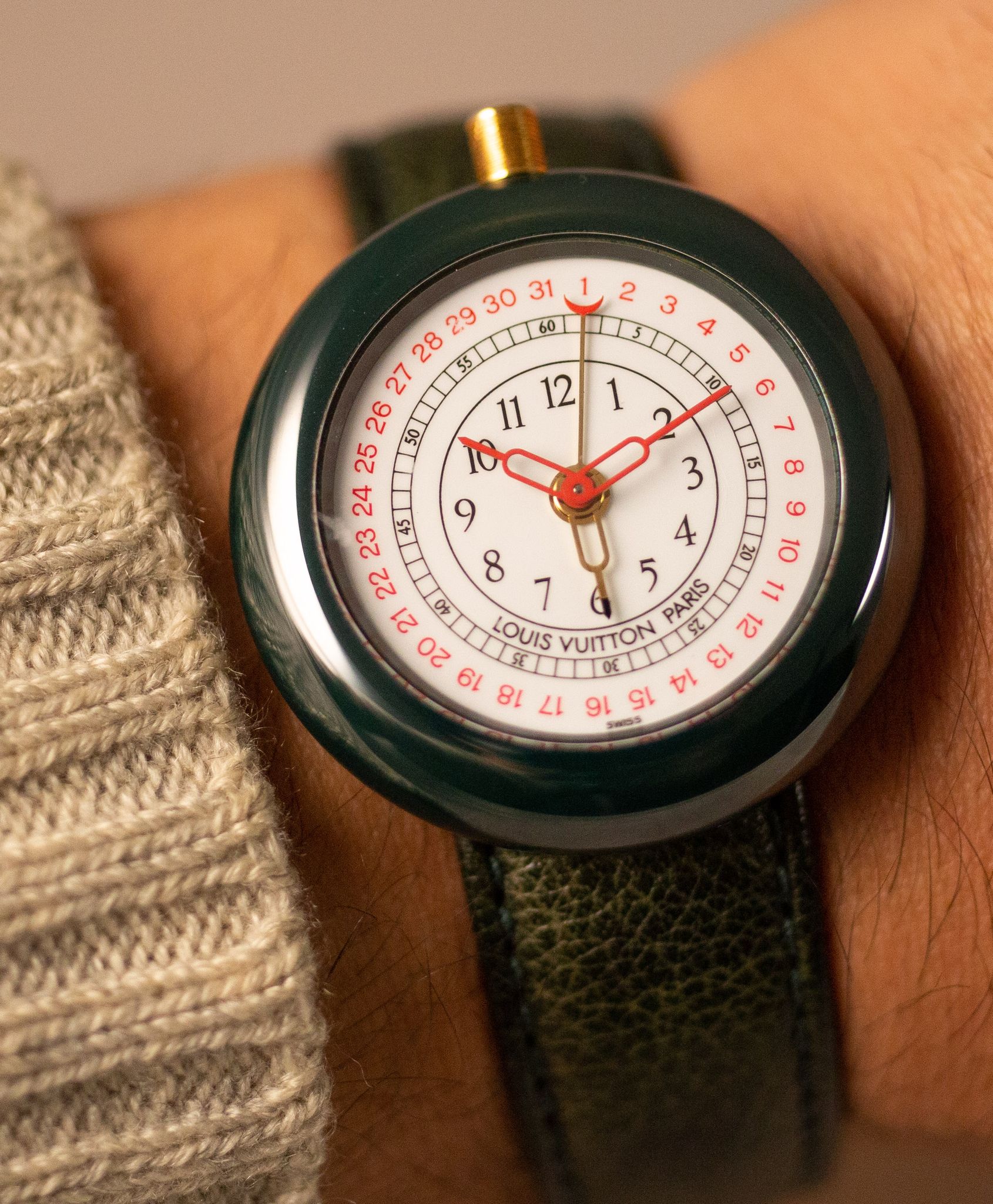 This is a rare Louis Vuitton Monterey 2 designed by Italian architect Gae Aulenti in 1988. The watch came in both black and green ceramic, with the green ceramic being far rarer. This example has its original green LV strap with LV buckle. Additionally, the watch is working properly including the alarm which is often broken on these watches. The movement on this reference was designed by IWC and it is truly one of the most aesthetically unique wrist watches ever made.