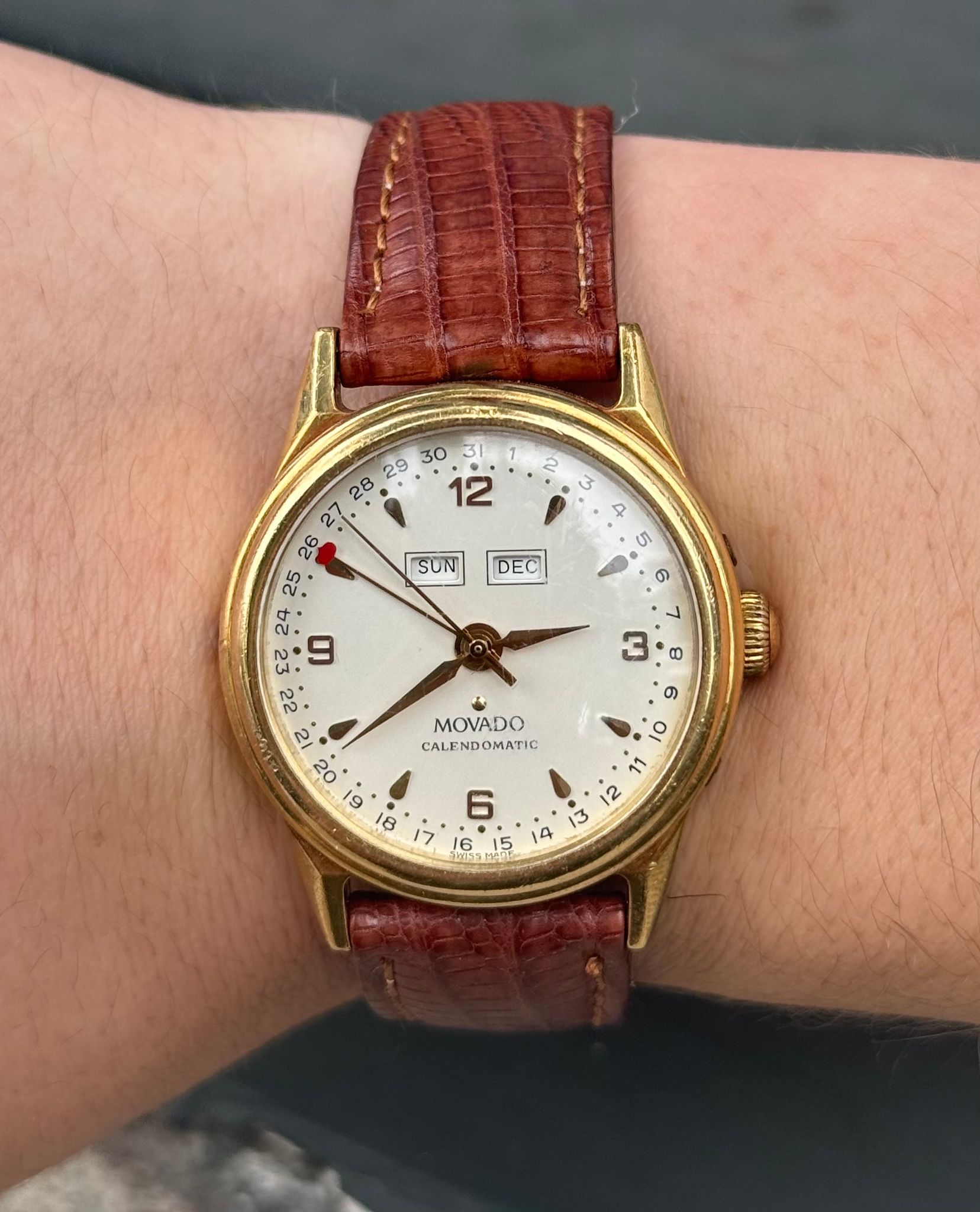 Movado 18K Gold Calendomatic Triple Calendar 40.B1.880. Watch is in honest pre owned condition, crystal has some scratches and minor knicks on case. All functions working. On aftermarket strap and buckle.