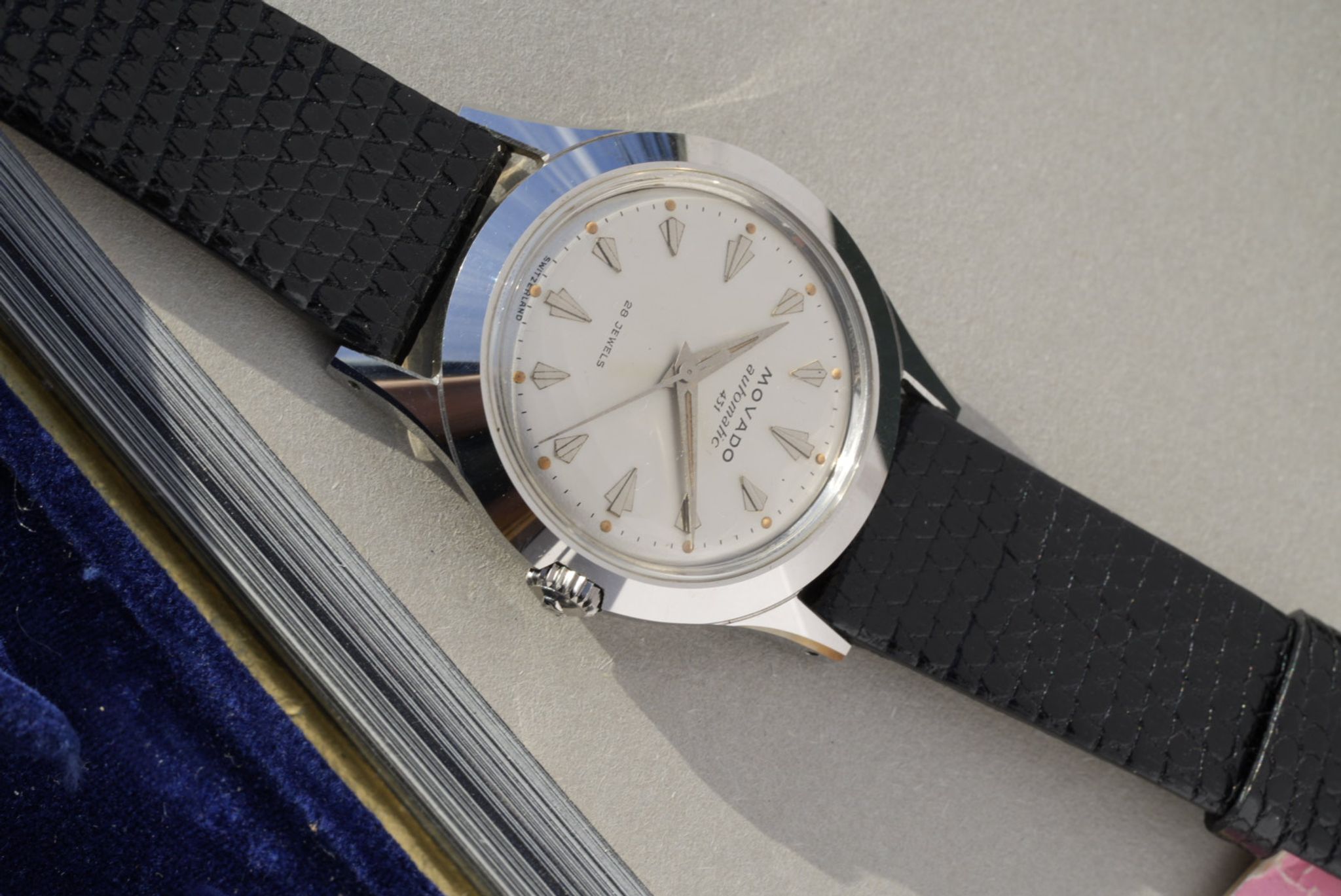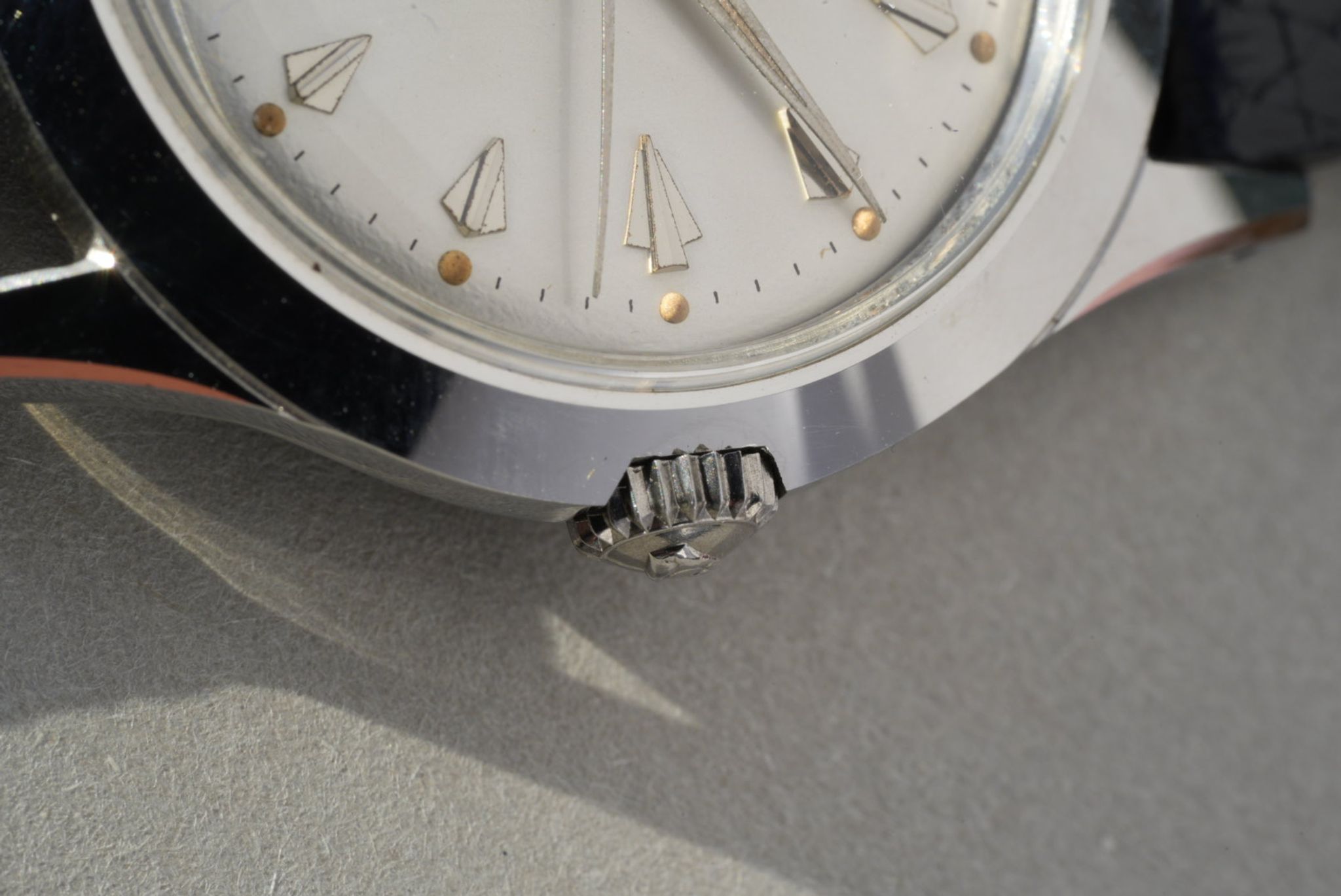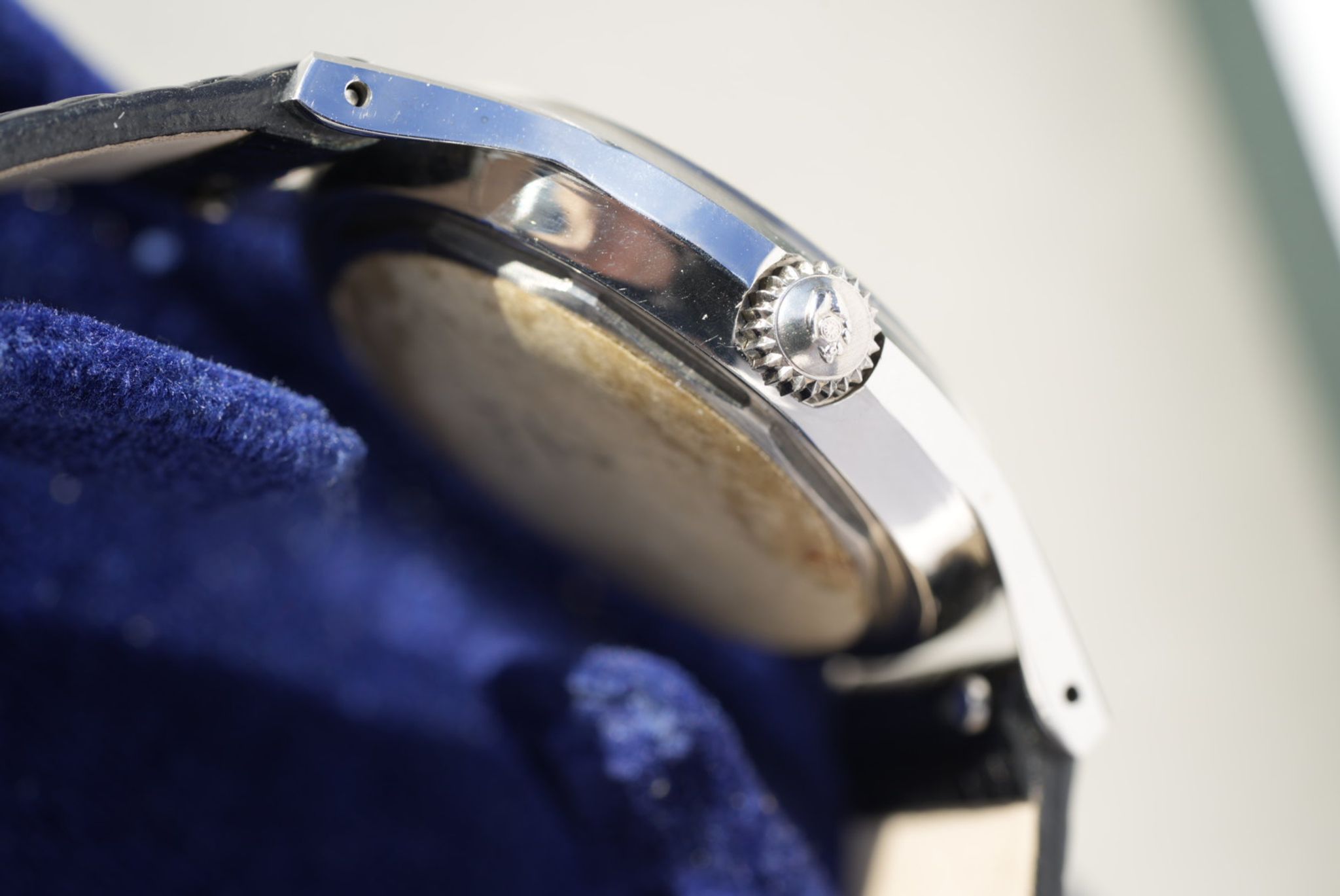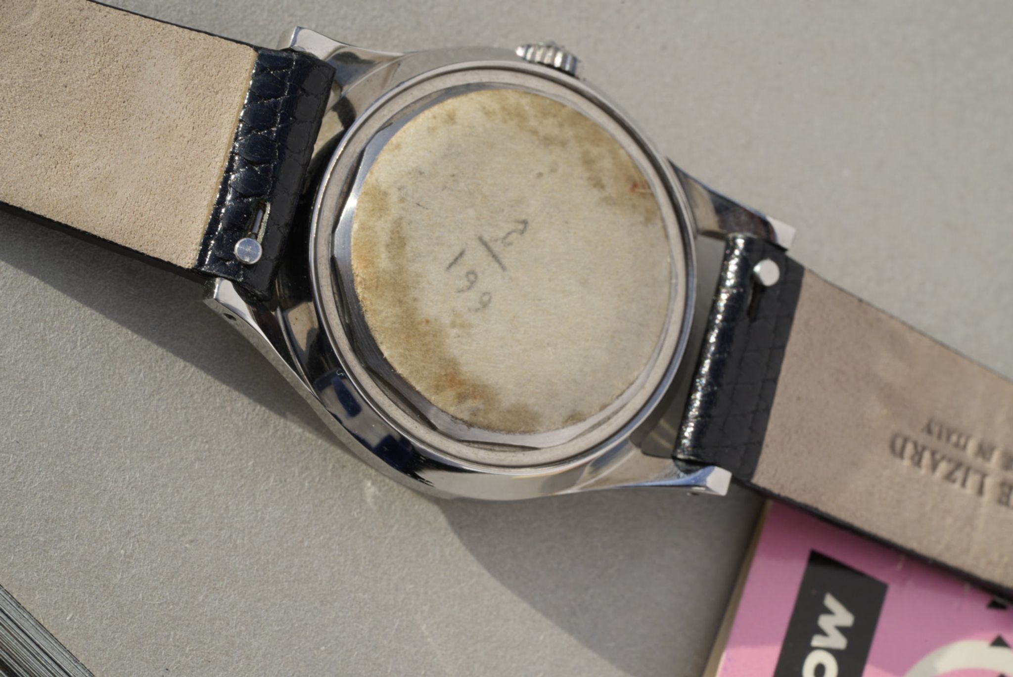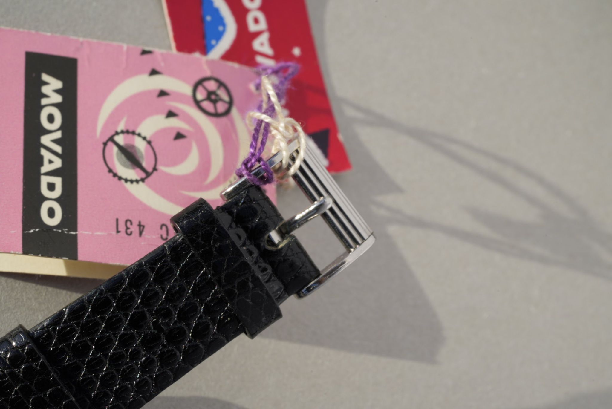 Movado 431, 35 mm stainless steel case signed by François Borgel, recognizable by its recessed “bowler” crown. Unworn watch in original condition, featuring an unpolished case, period-correct dial, and original luminous material. Comes with its original box, tags, strap, and Movado buckle. A representative example of Movado’s high-quality craftsmanship from the 1940s–1950s.