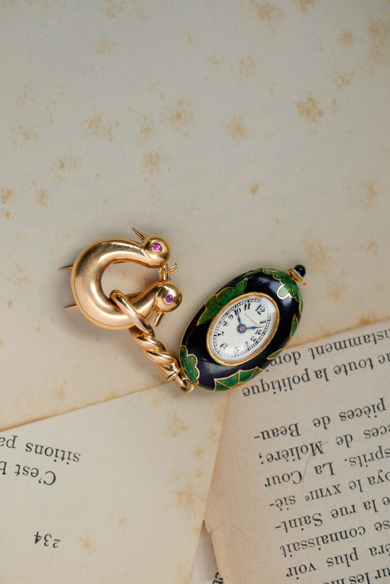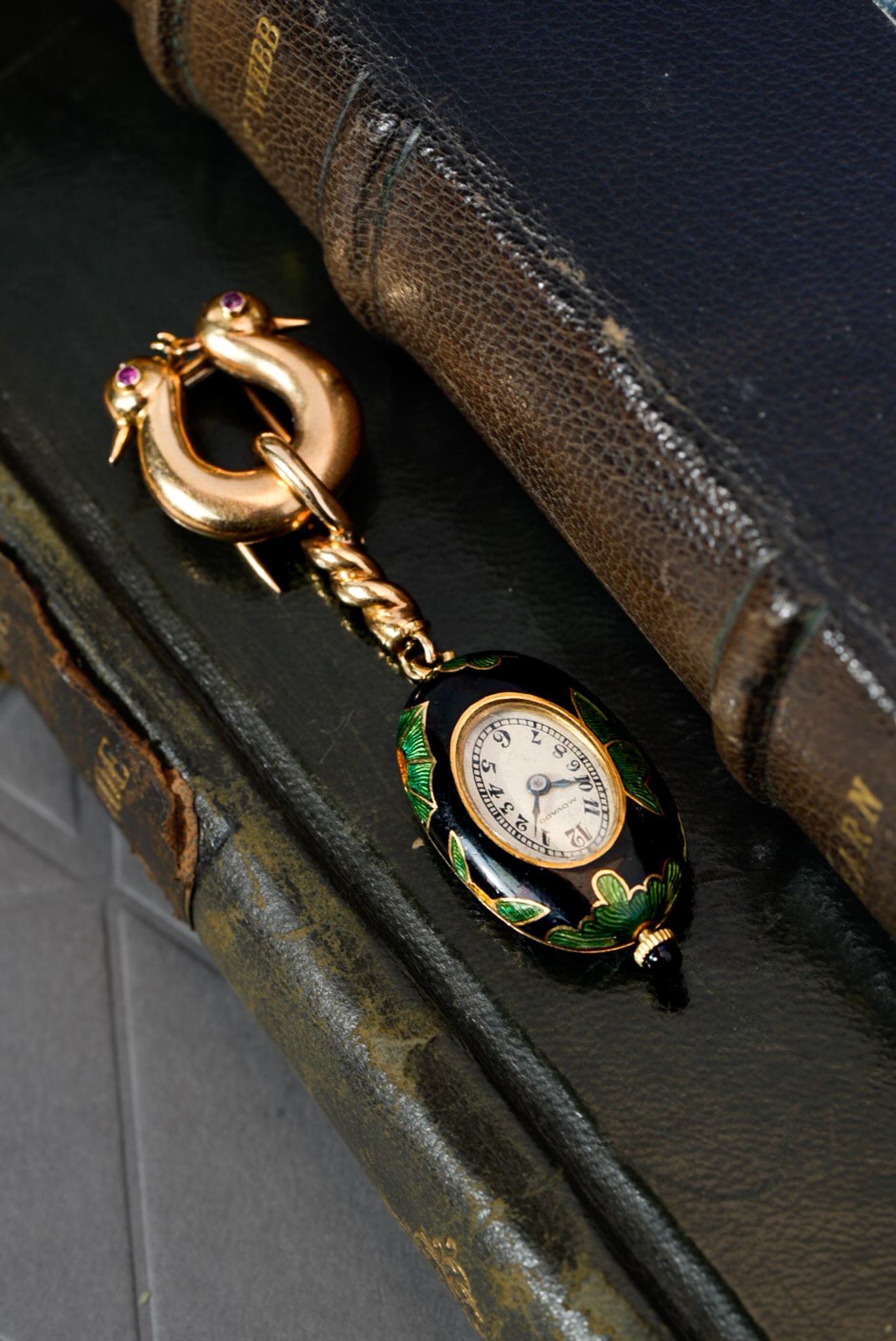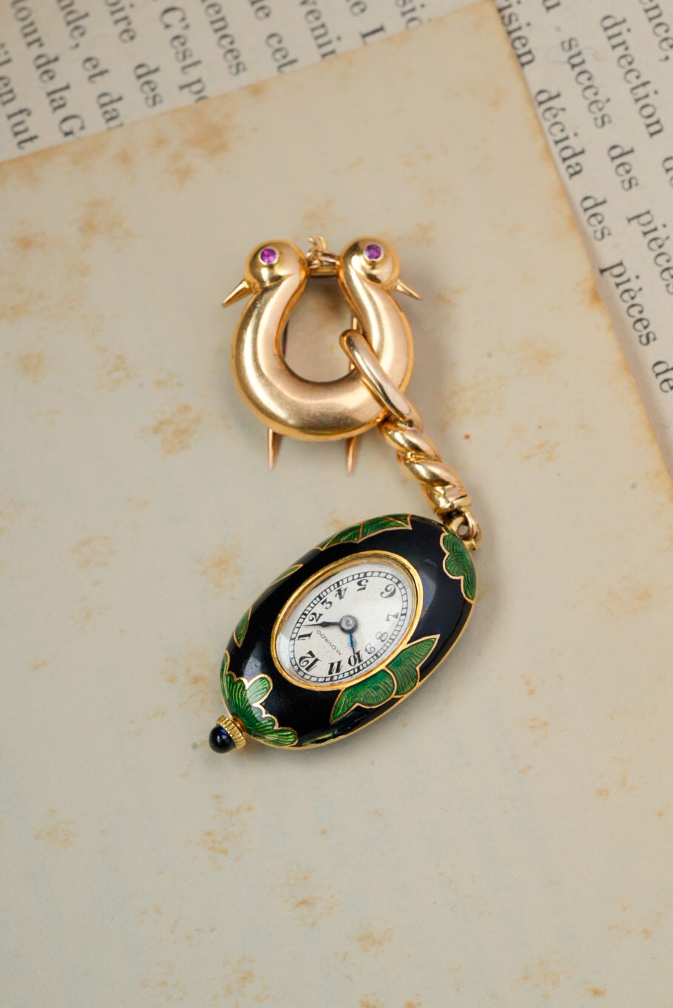 The brooch and case are made of 18k yellow gold, with vibrant enamel delicately applied to the case. The clasp is adorned with a pair of swallows’ heads, each set with ruby eyes.