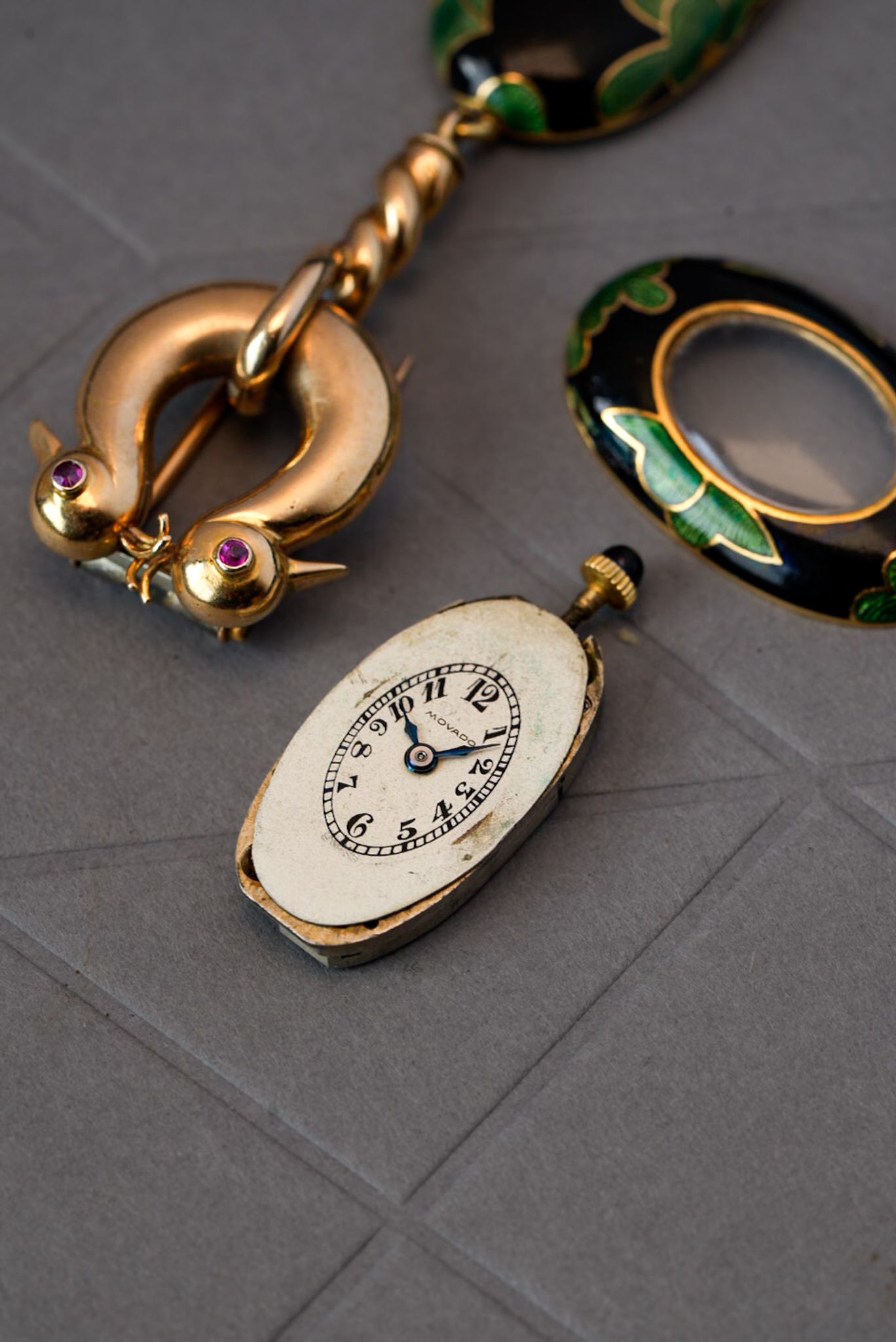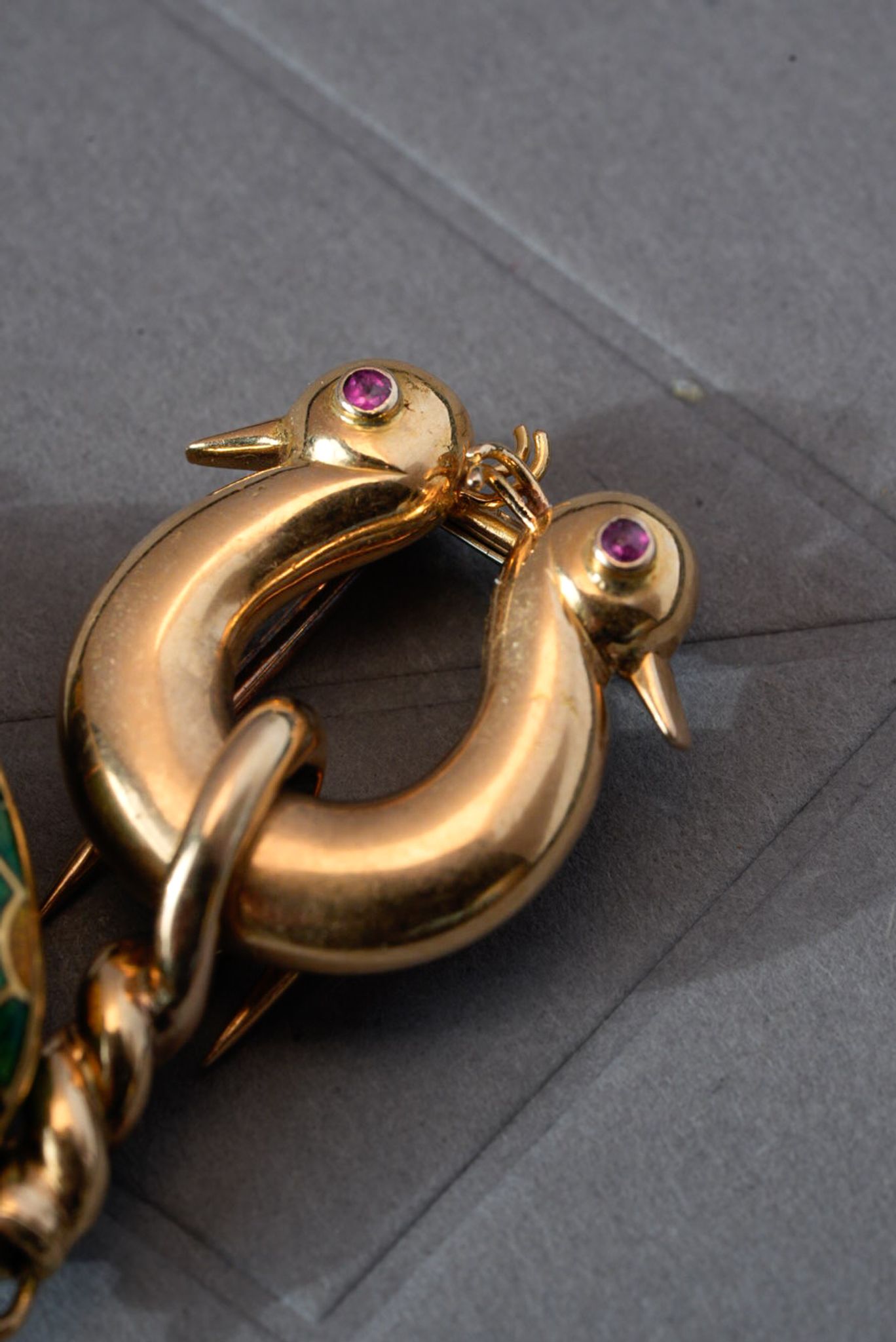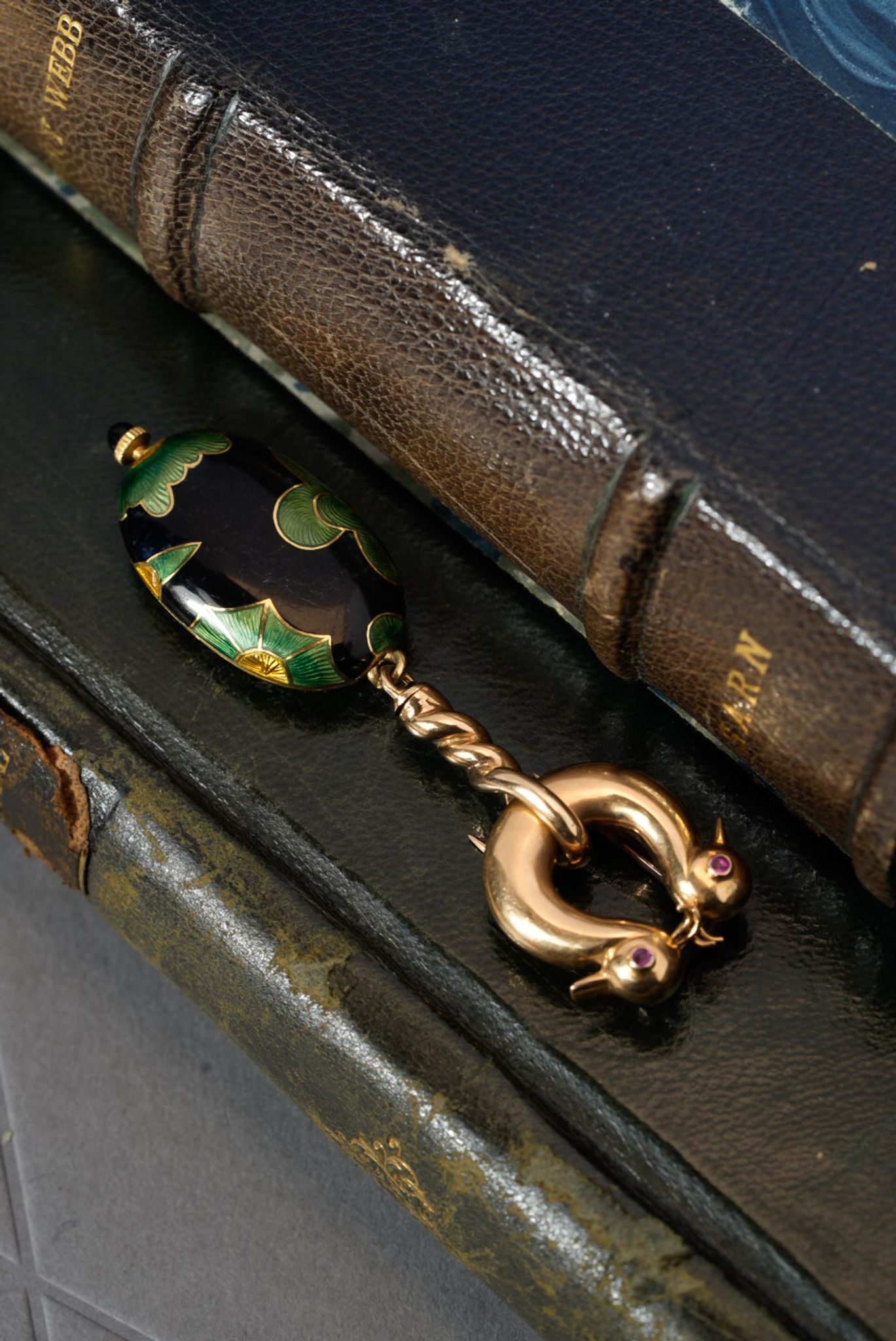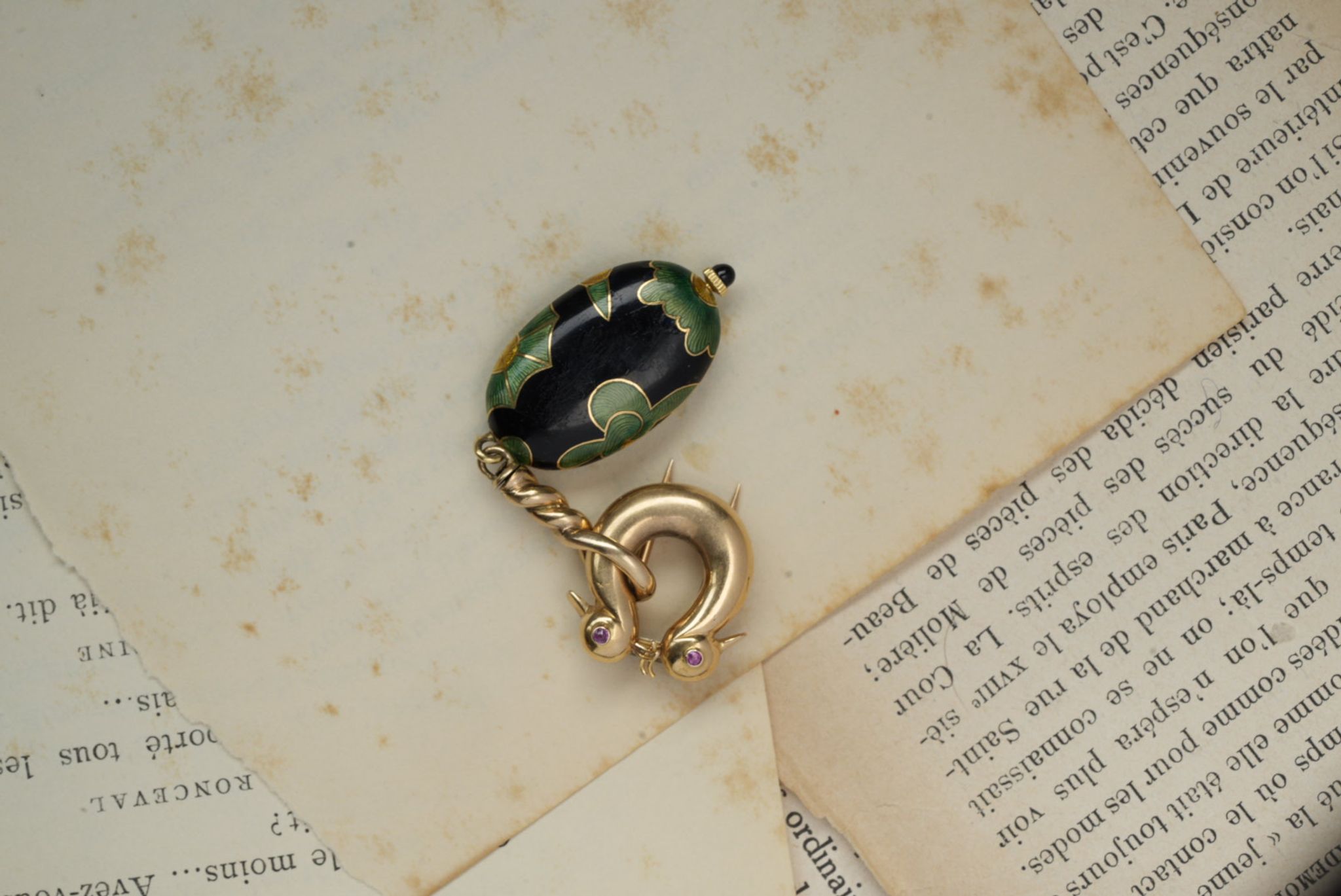 The brooch and case are made of 18k yellow gold, with vibrant enamel delicately applied to the case. The clasp is adorned with a pair of swallows’ heads, each set with ruby eyes.