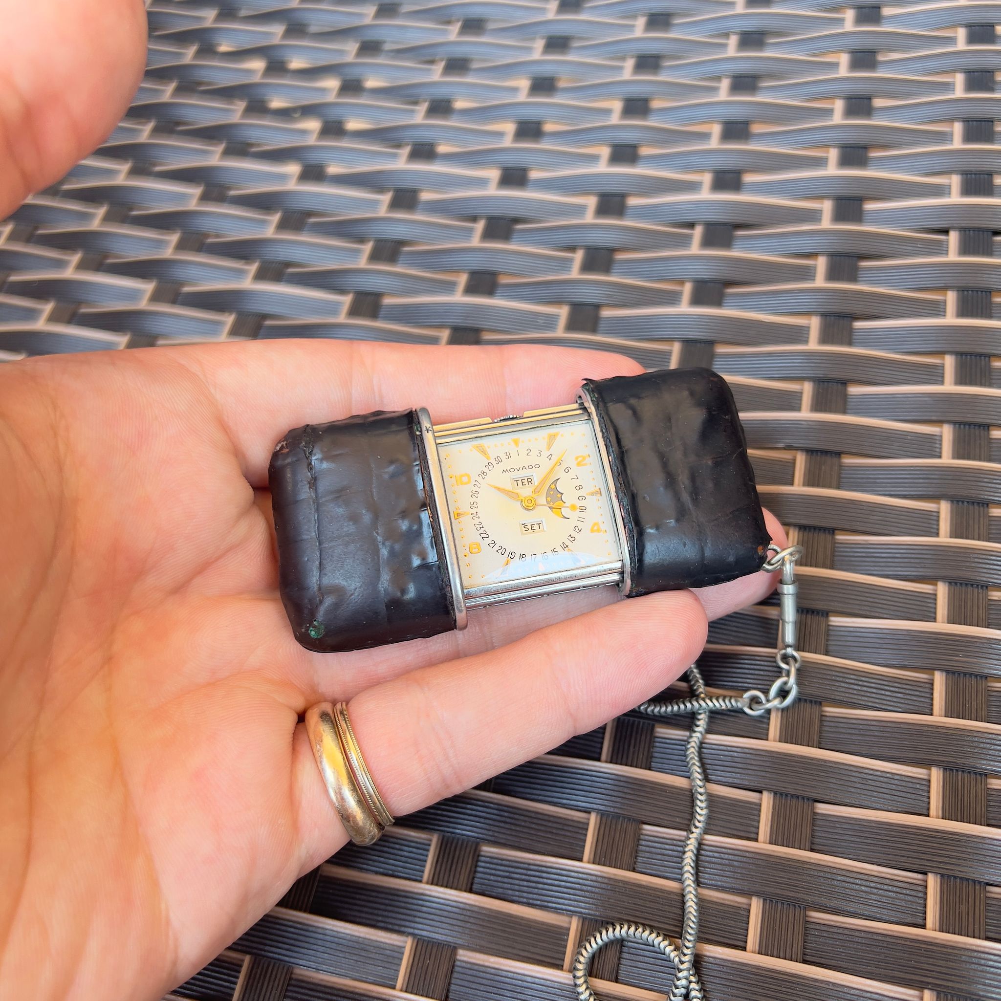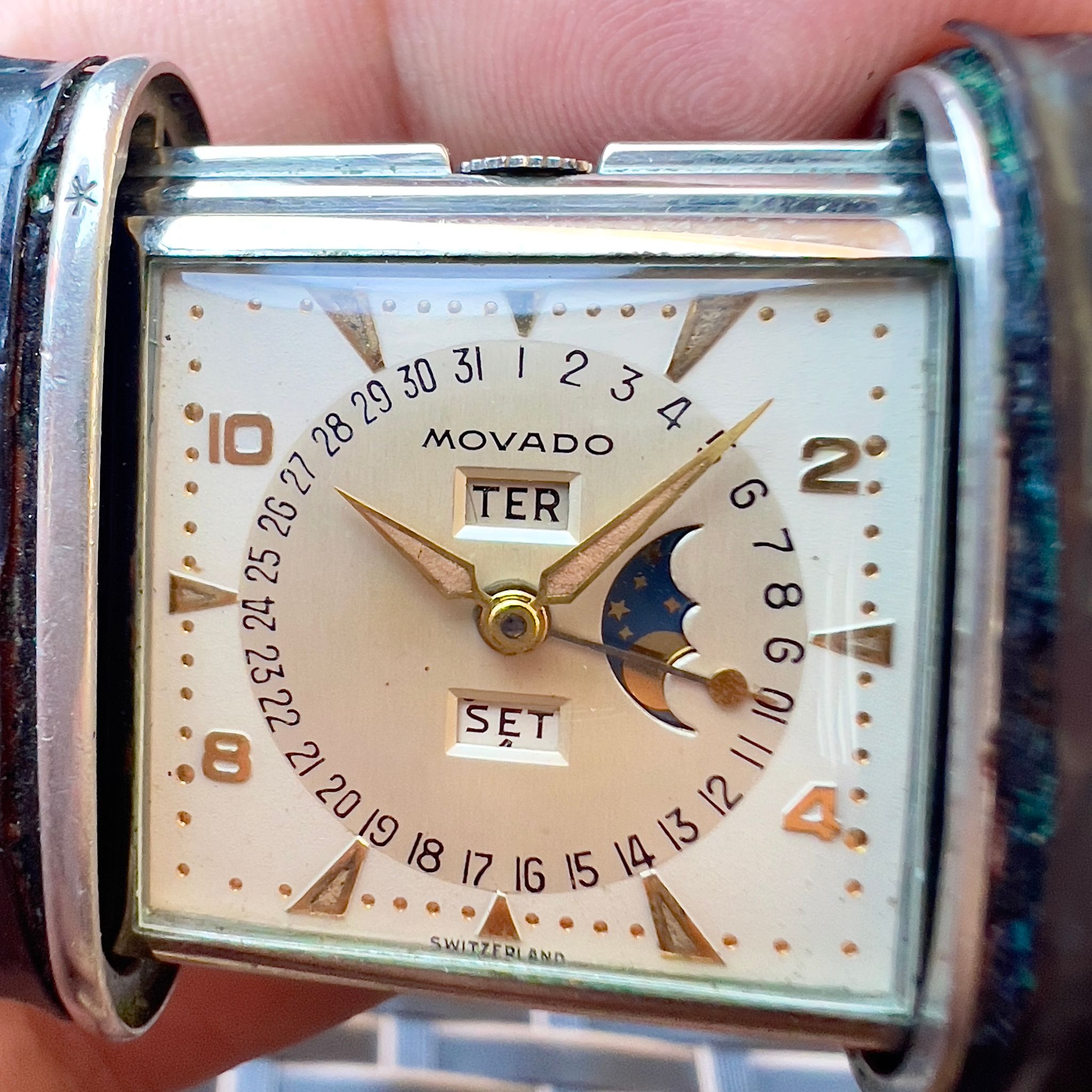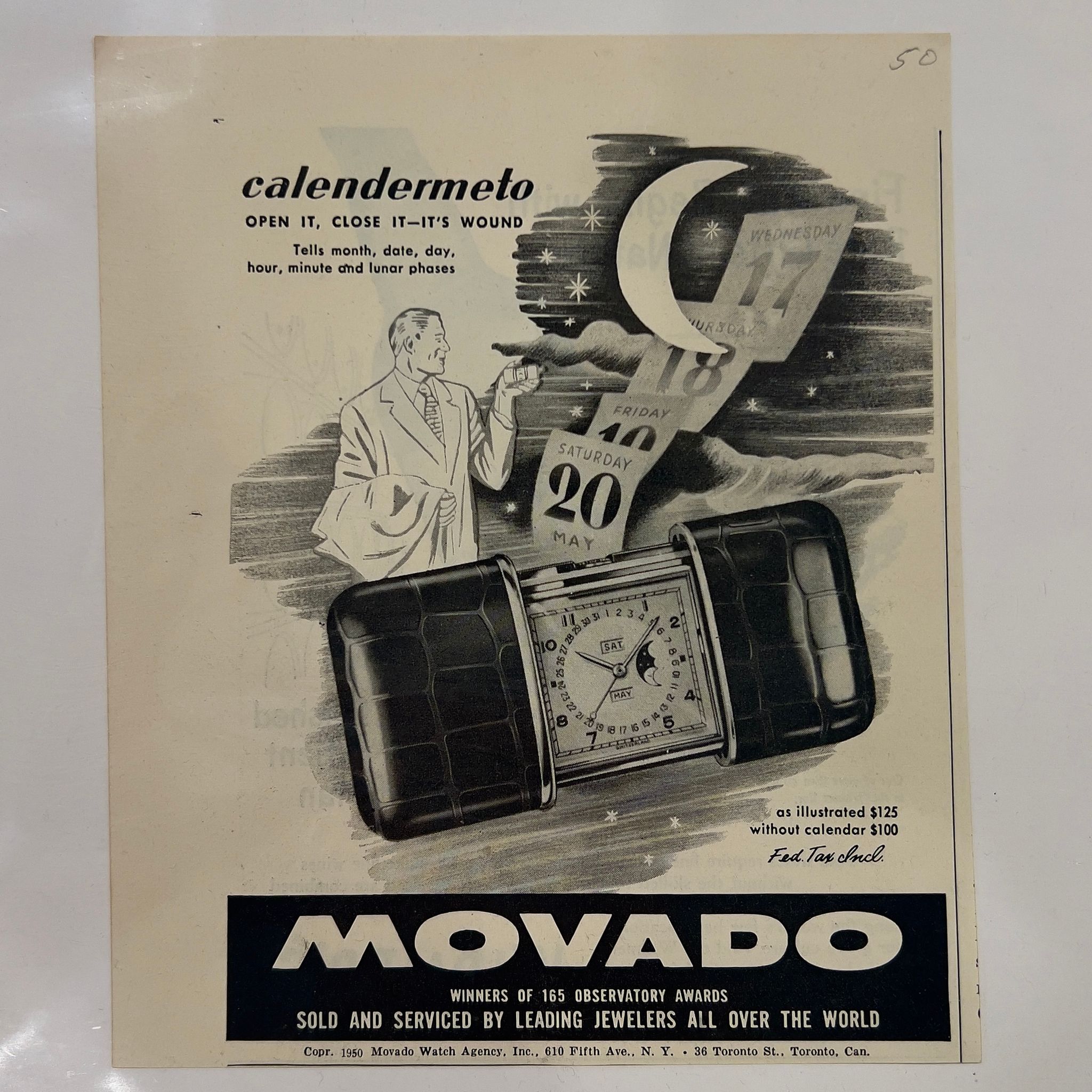A true all original Movado Calendermeto from the 40/50’s in a wonderful configuration coming in it’s original red suede Movado box and accompanied by an era appropriate magazine advertisement showcasing the same model (albeit a different dial). And yes the Ad does indeed come with the watch 😉