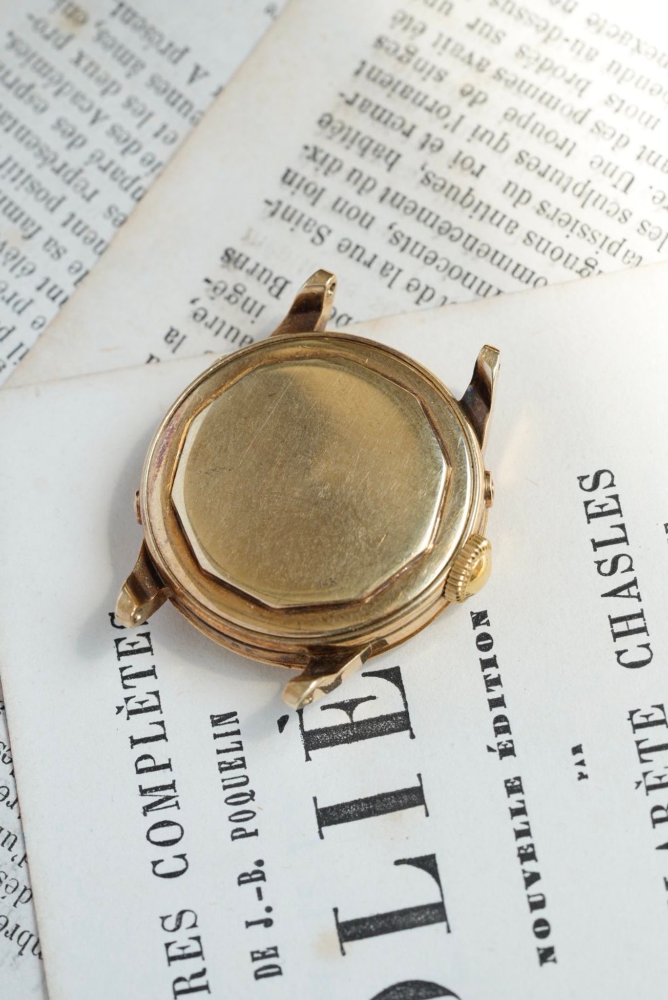 This example features a 34mm case in 14k gold, manufactured by François Borgel, with faceted lugs and visible oxidation patina that adds character to the watch.