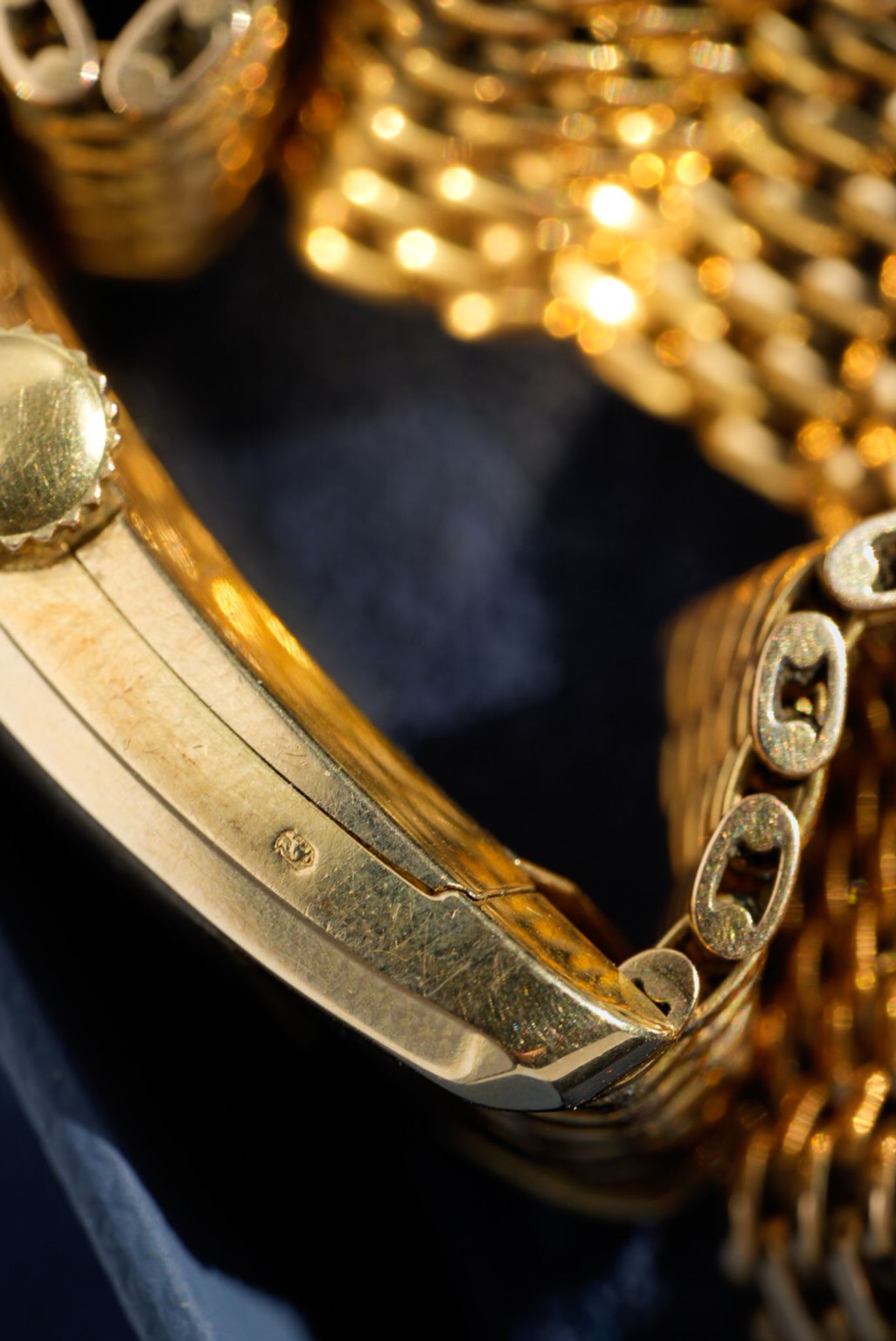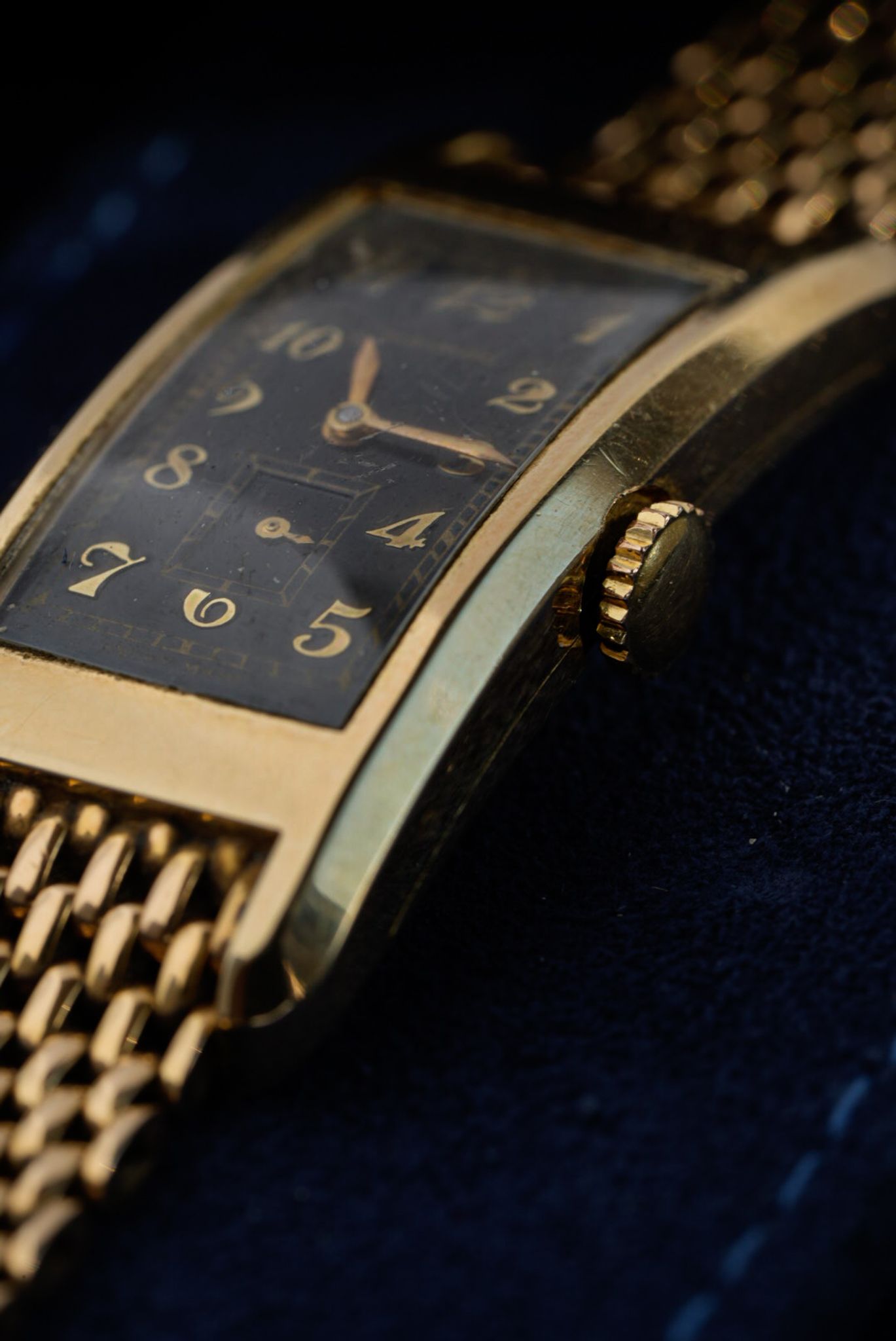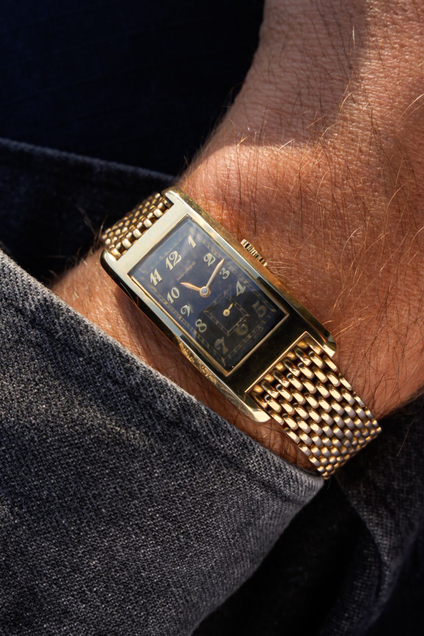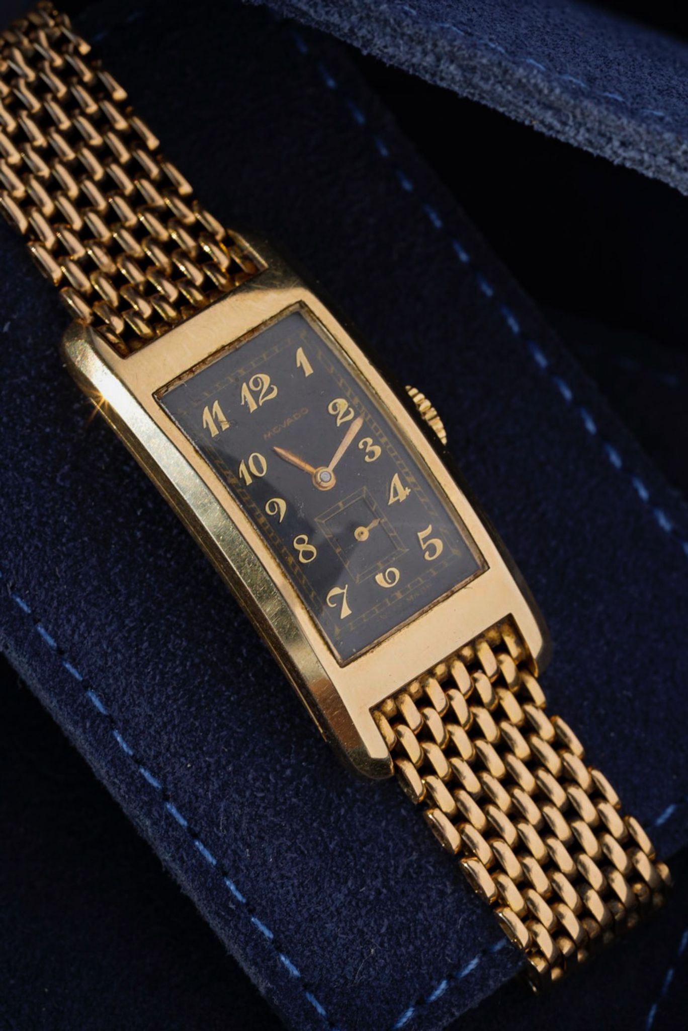 Rare and well preserved Movado Curviplan men’s wristwatch, circa 1935, measuring 20 x 44 mm and crafted in 14k yellow gold. The curved barrel-shaped case houses the manual-winding Movado Caliber 440 with small seconds. The untouched dial features applied gold Breguet numerals and elegant leaf hands. The watch is fitted with an integrated 18k yellow gold bracelet, with a total length of 20 cm.