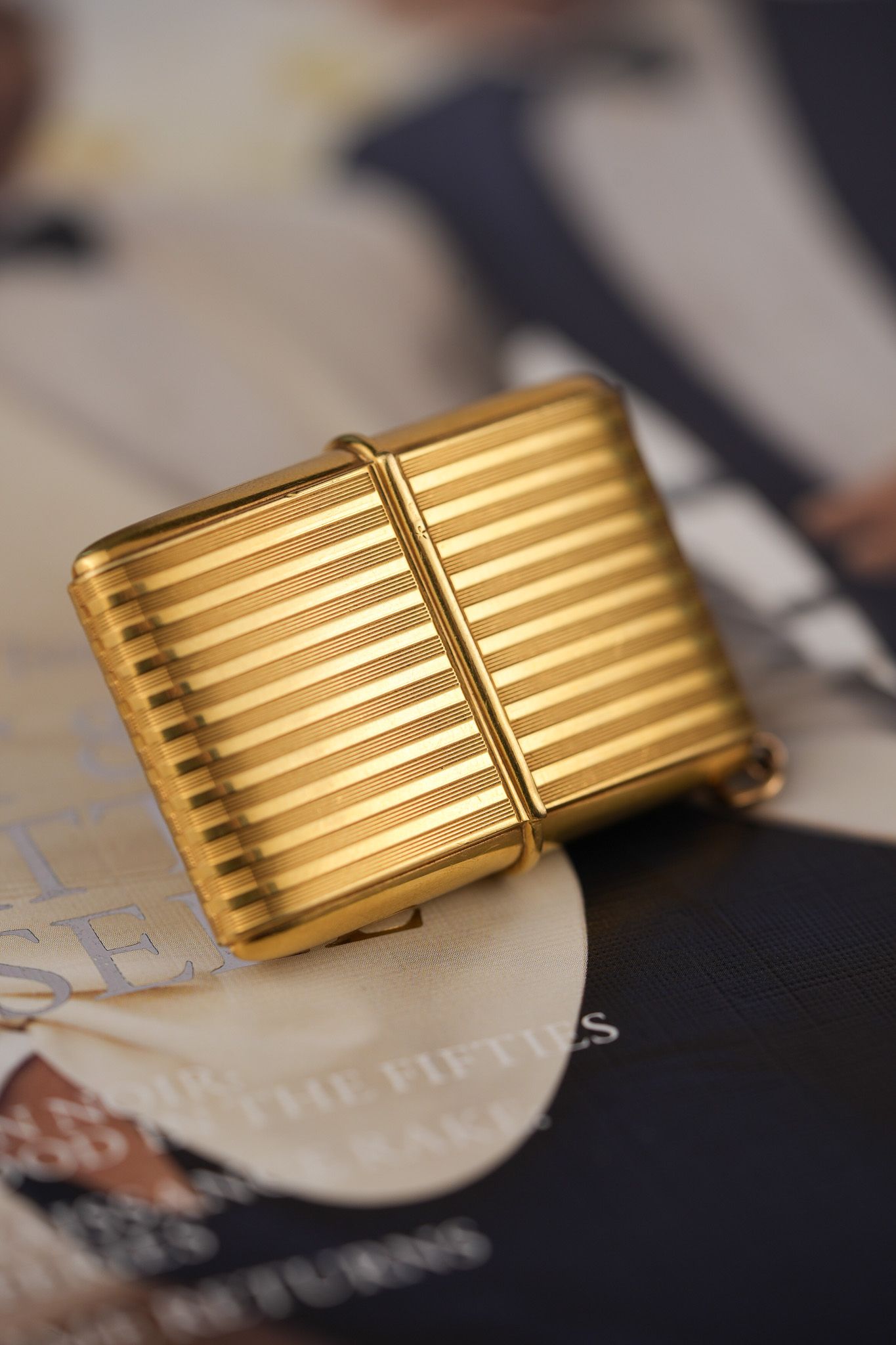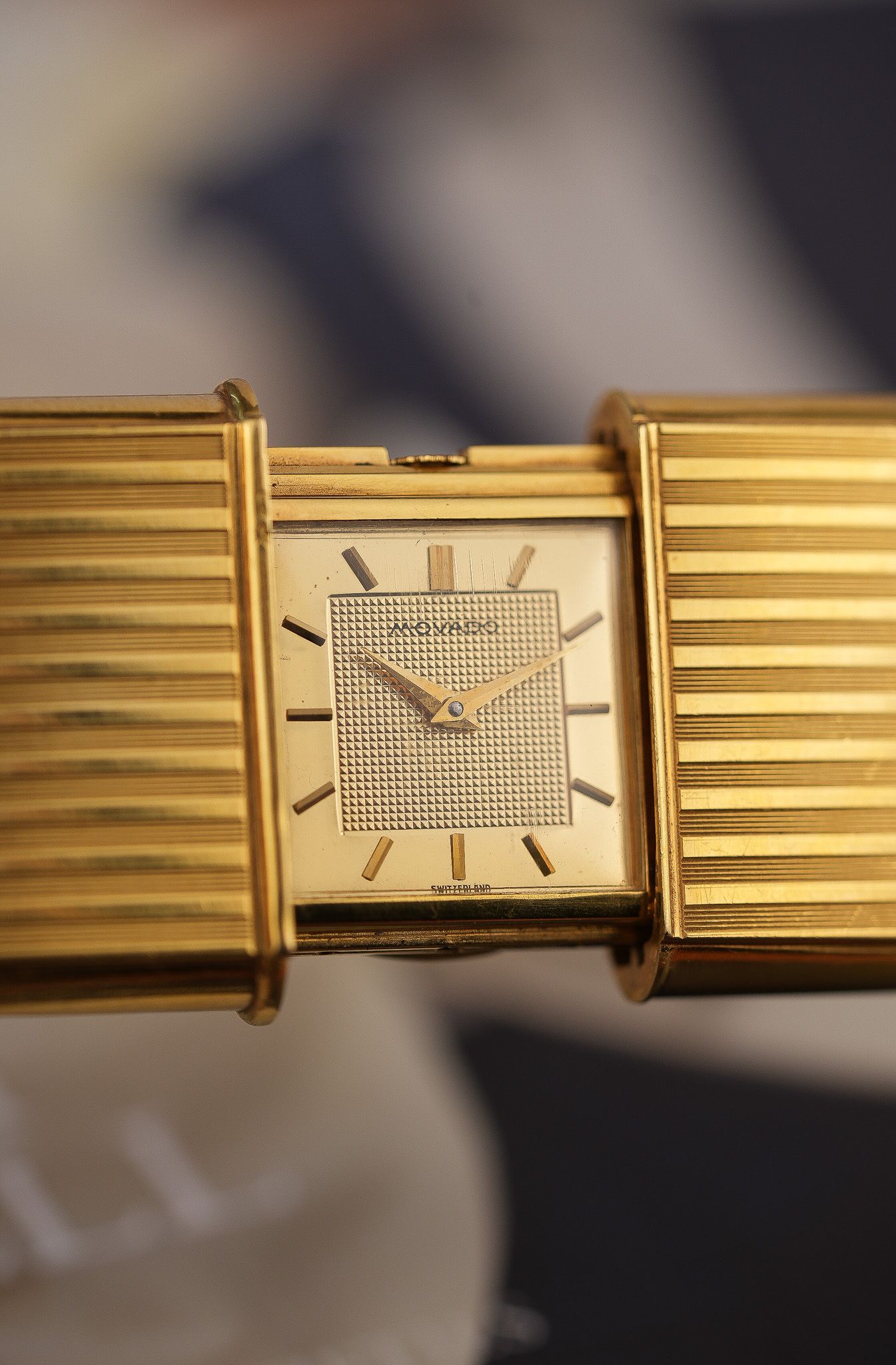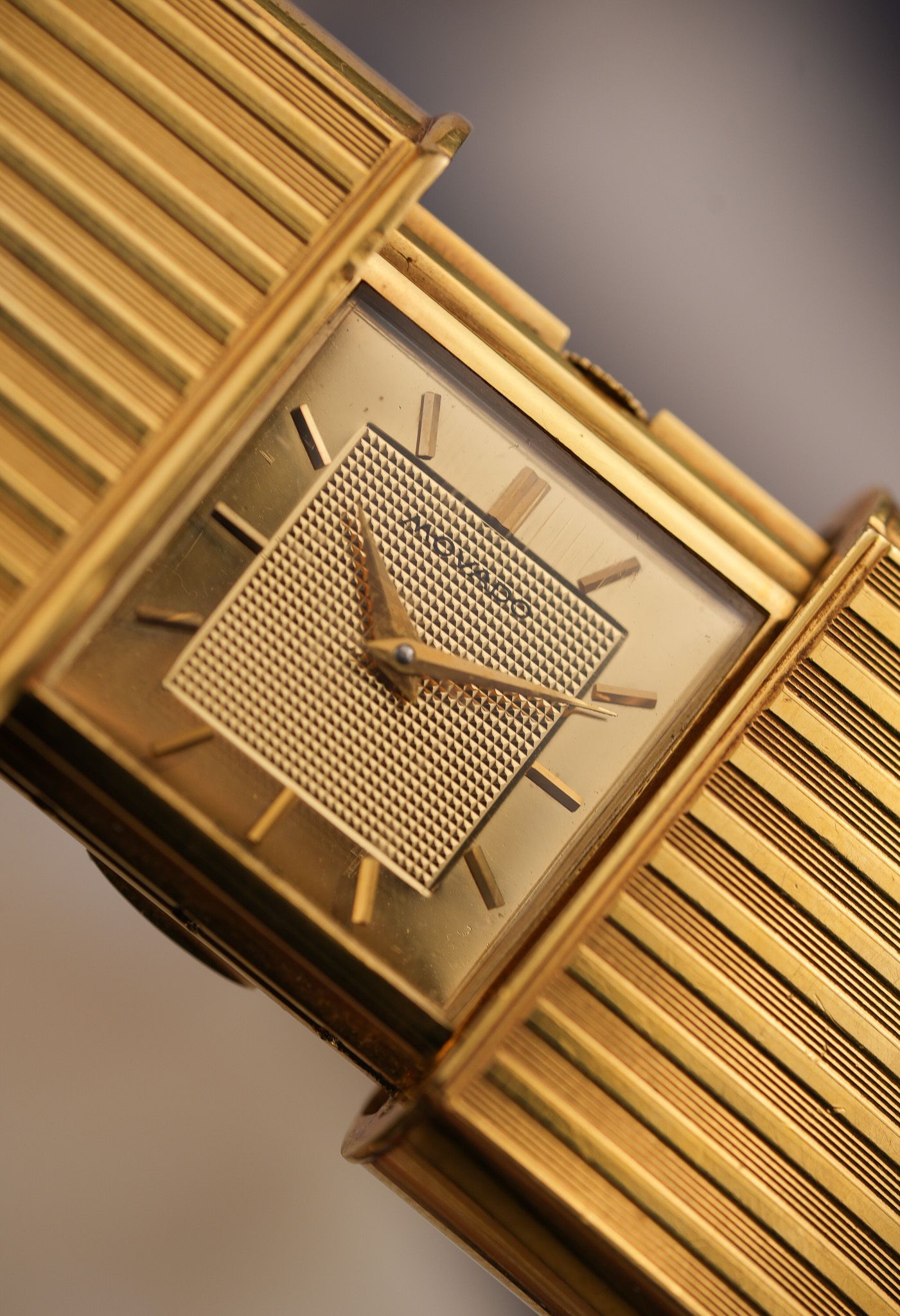 This particular example is the 18K yellow gold version. Which is to say: this was never meant to be discreet. With vertical ribbing across the shutters and a case that opens like a miniature Art Deco vault, it’s as much an object of design as it is a timekeeper. Even closed (45.5 x 31mm), it feels like something you’d find in a museum vitrine next to a Cartier cigarette case or a Van Cleef powder compact. Opened to its full 65.5mm, it reveals a dial that continues Movado’s design DNA: a square hobnail-textured center borrowed from their famed “Gentleman” wristwatch, bordered by sharp baton indices and clean dauphine hands. Every surface plays with light. Every angle has a reason.