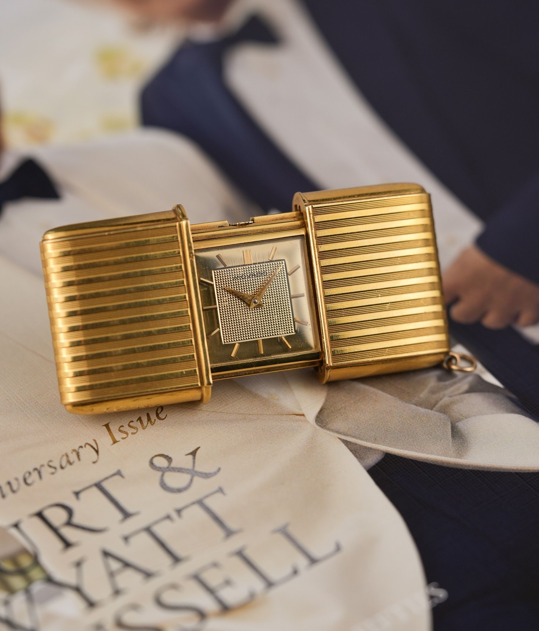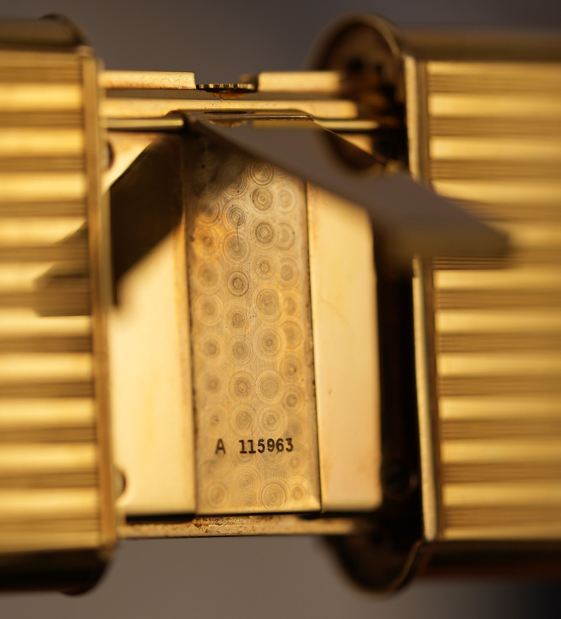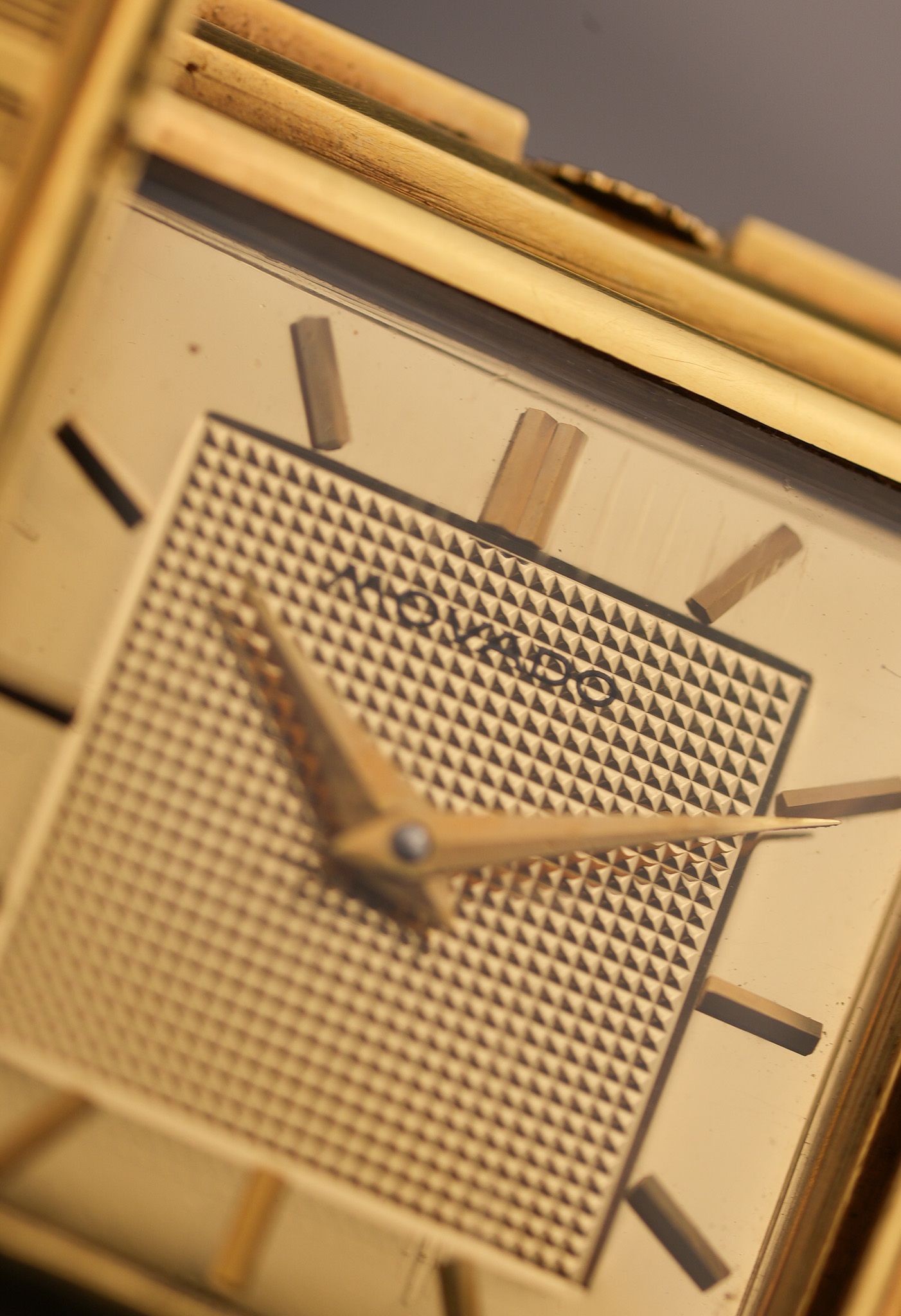 This particular example is the 18K yellow gold version. Which is to say: this was never meant to be discreet. With vertical ribbing across the shutters and a case that opens like a miniature Art Deco vault, it’s as much an object of design as it is a timekeeper. Even closed (45.5 x 31mm), it feels like something you’d find in a museum vitrine next to a Cartier cigarette case or a Van Cleef powder compact. Opened to its full 65.5mm, it reveals a dial that continues Movado’s design DNA: a square hobnail-textured center borrowed from their famed “Gentleman” wristwatch, bordered by sharp baton indices and clean dauphine hands. Every surface plays with light. Every angle has a reason.