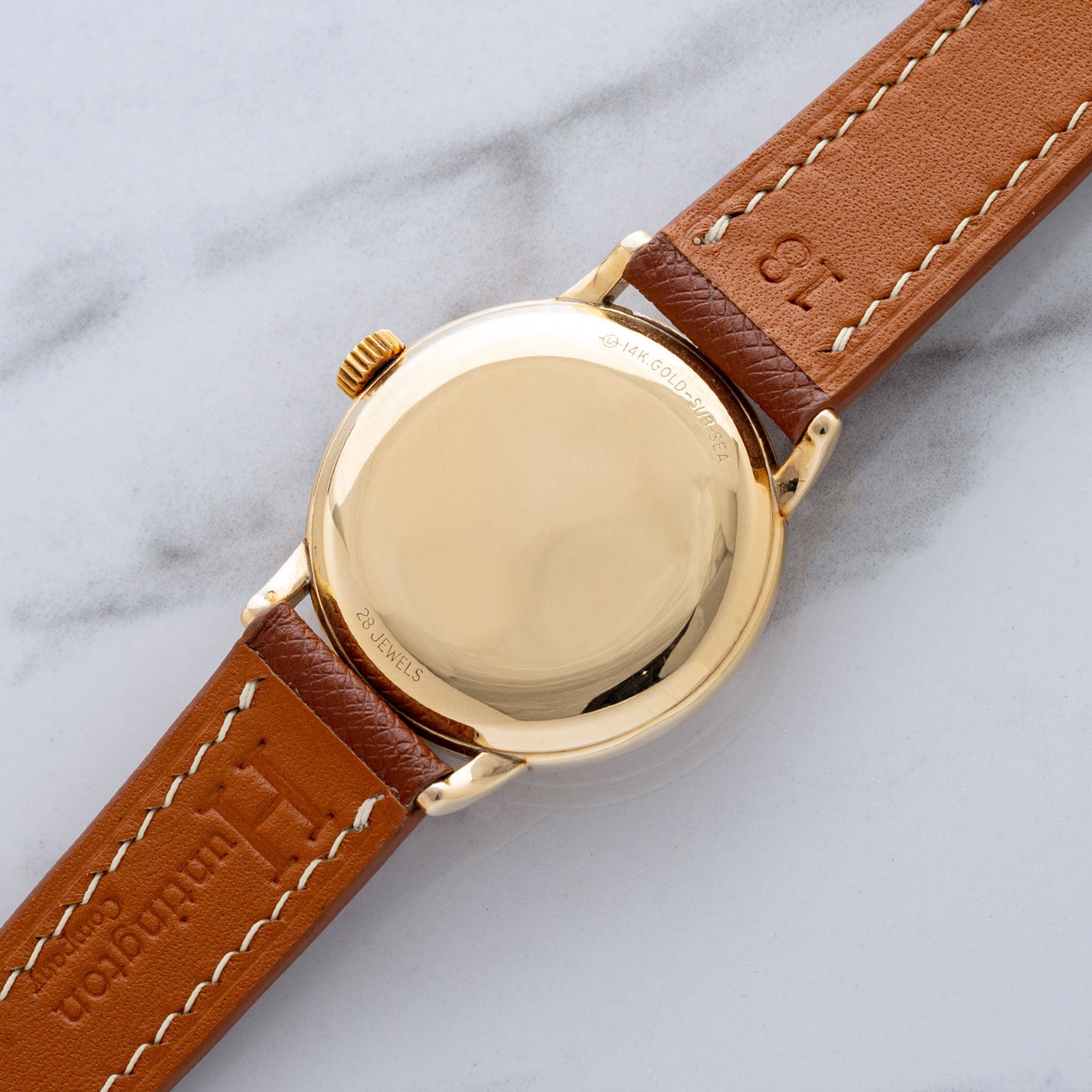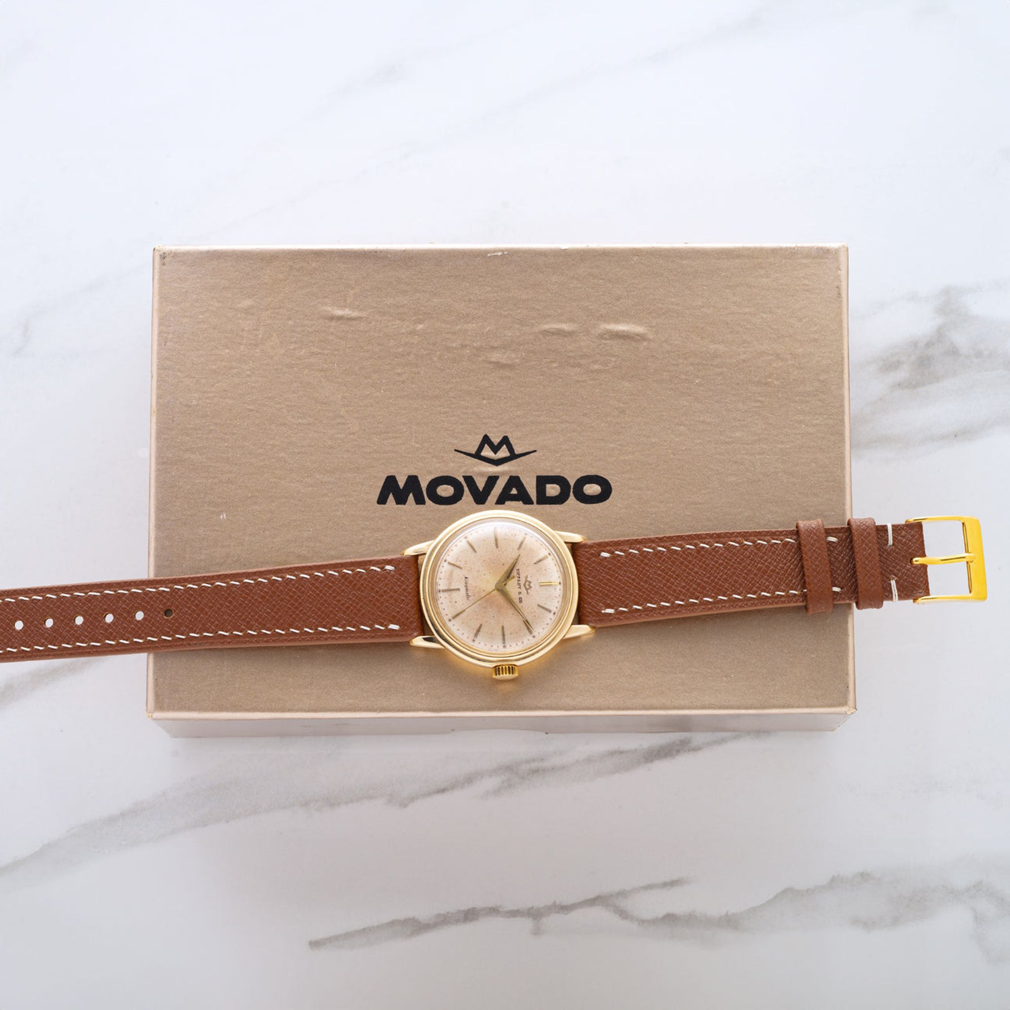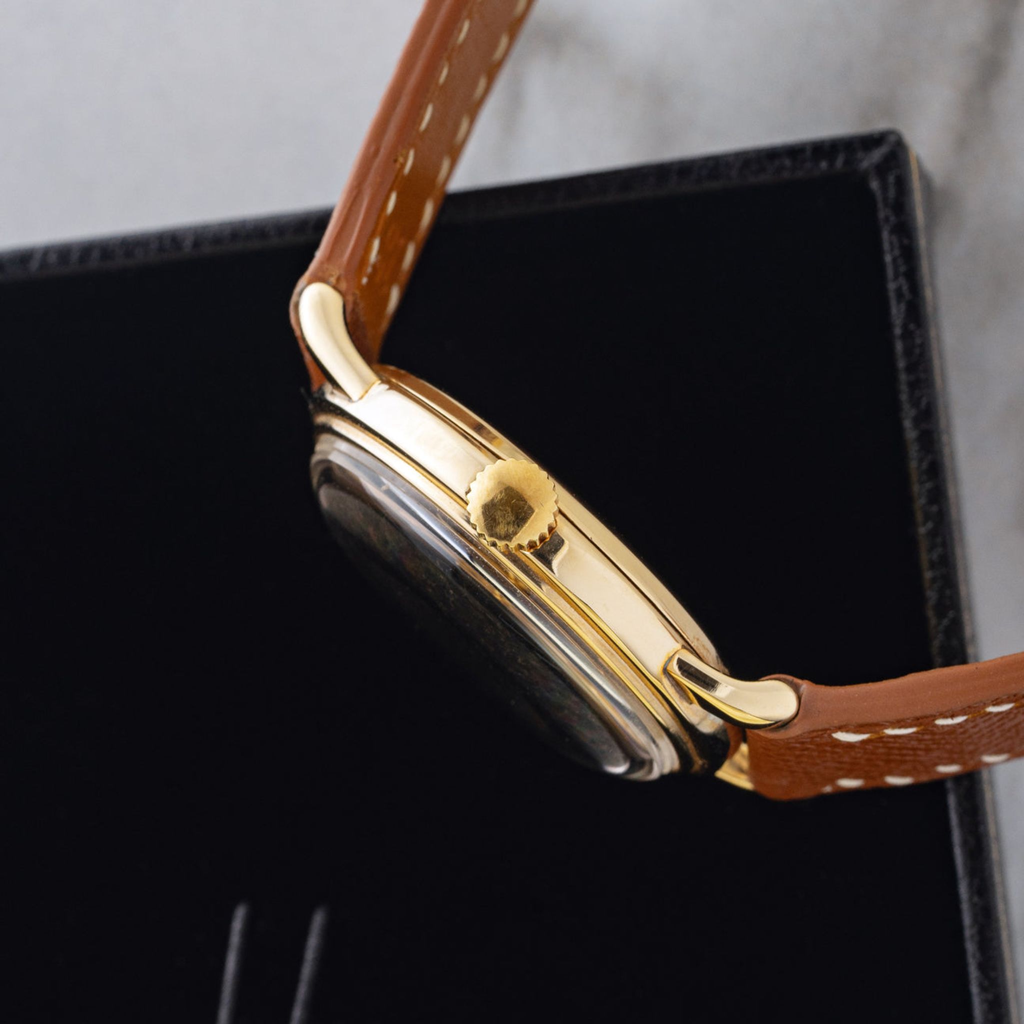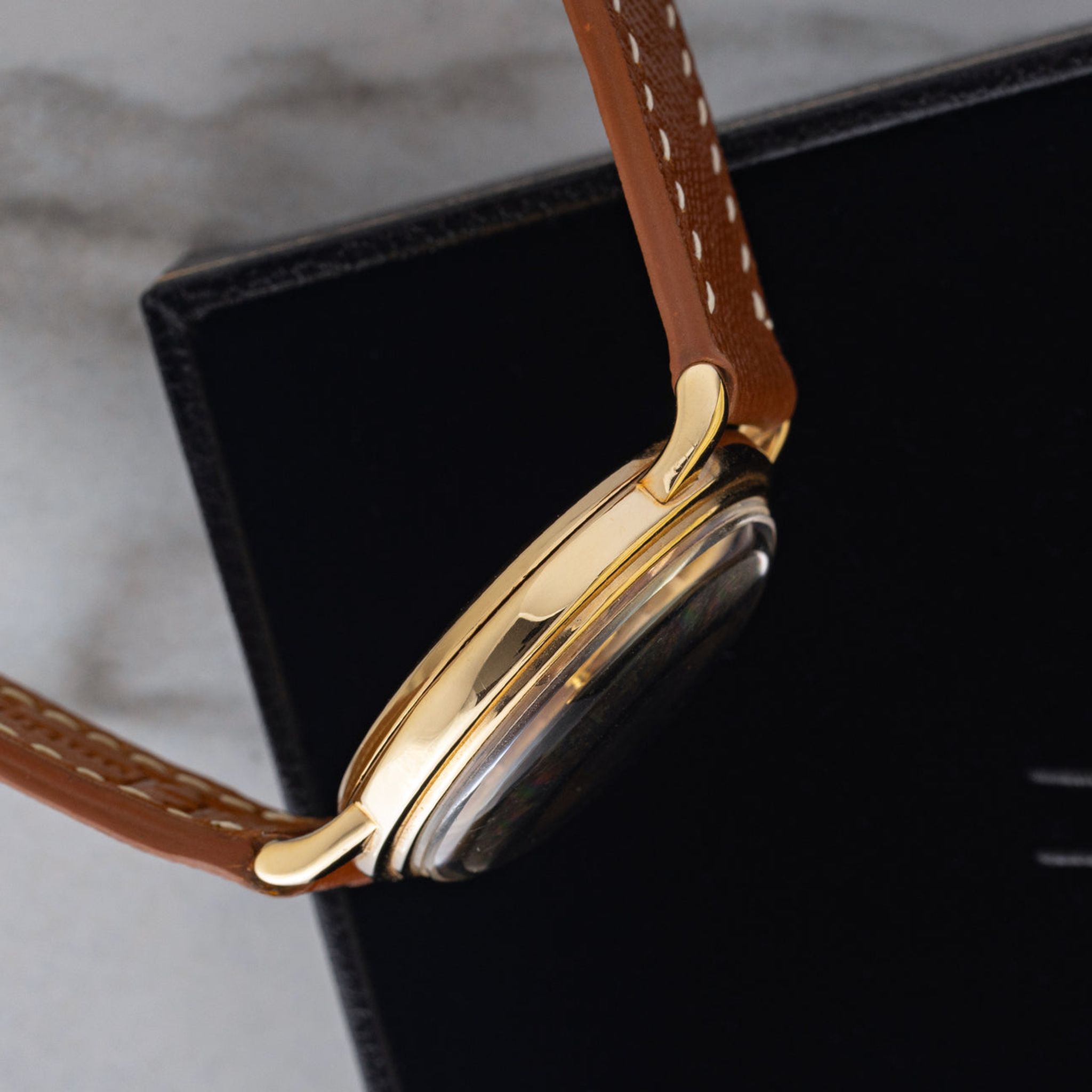 Vintage Movado watches have been greatly overlooked for decades but have garnered more attention from collectors of late. Some of their cases produced by FB were actually shared in Patek models and some would argue that their movement quality punches up to the level of Patek's watchmaking. The Kingmatic is a simple and classic time-only design with elegant and slender proportions coming in at 33mm. This example has taken on a stunning "stardust" patina on the dial and comes with its inner and outer boxes. If you're looking for an affordable dress watch, this 14k yellow gold example offers great value and timeless design.