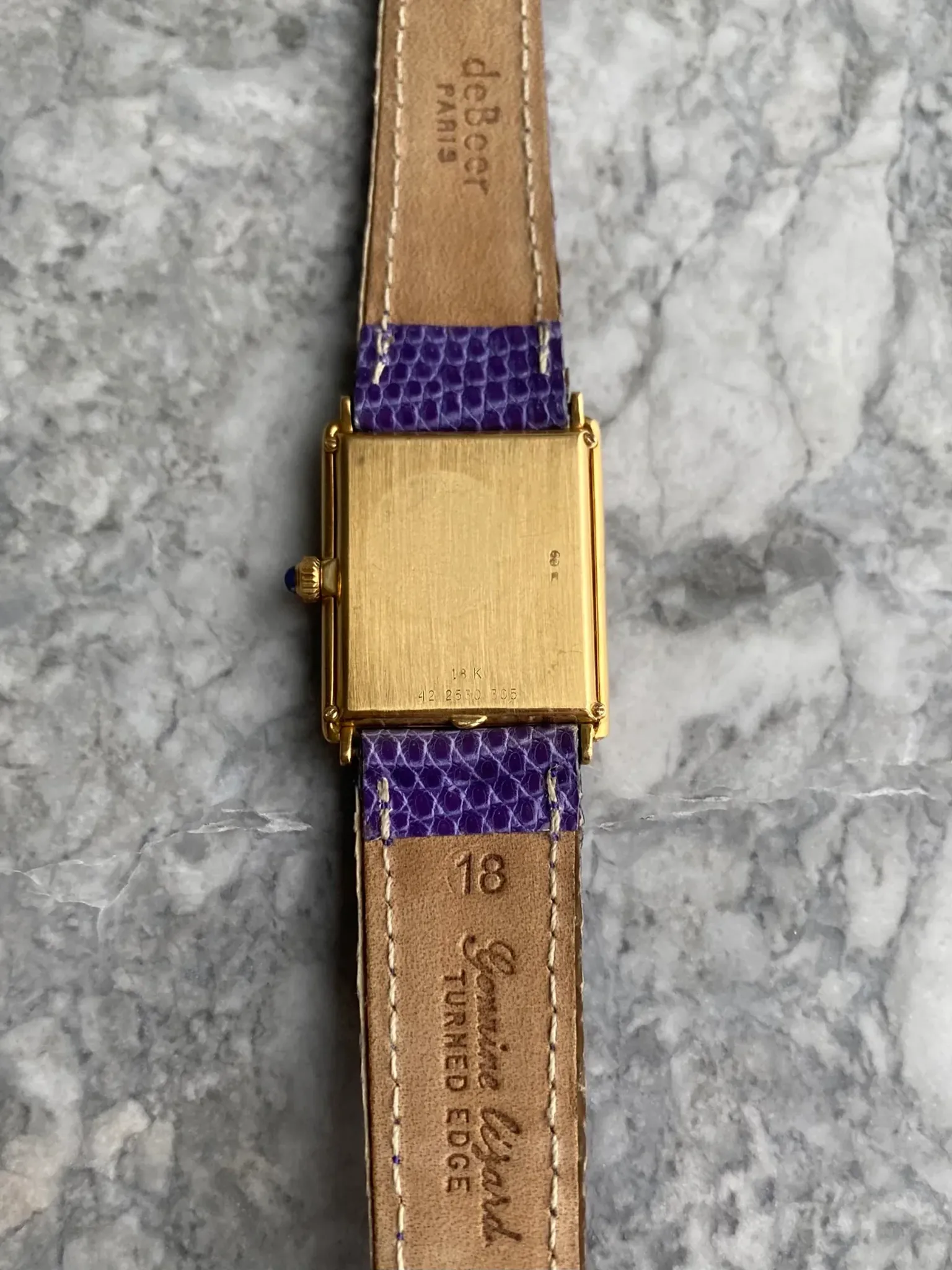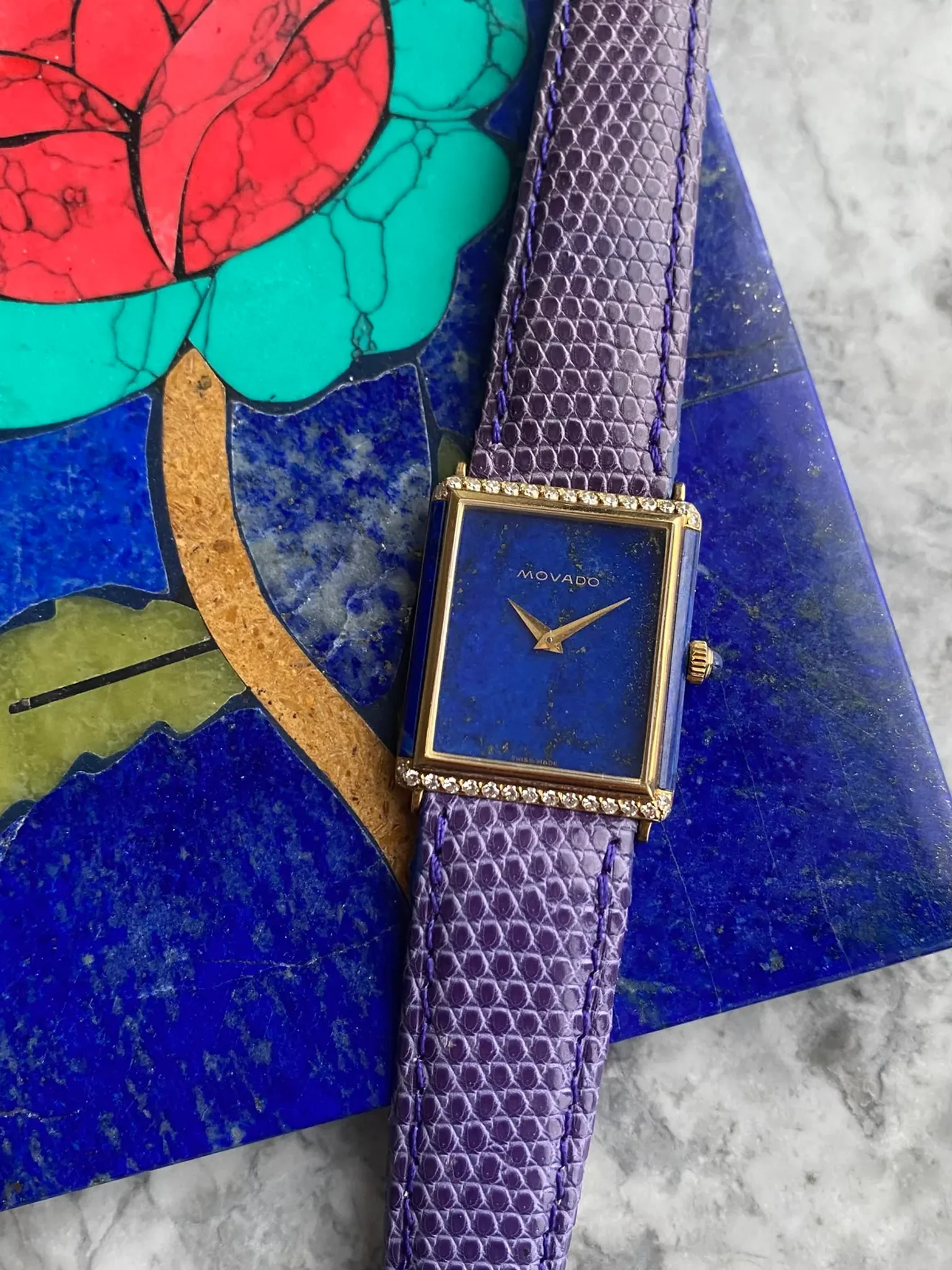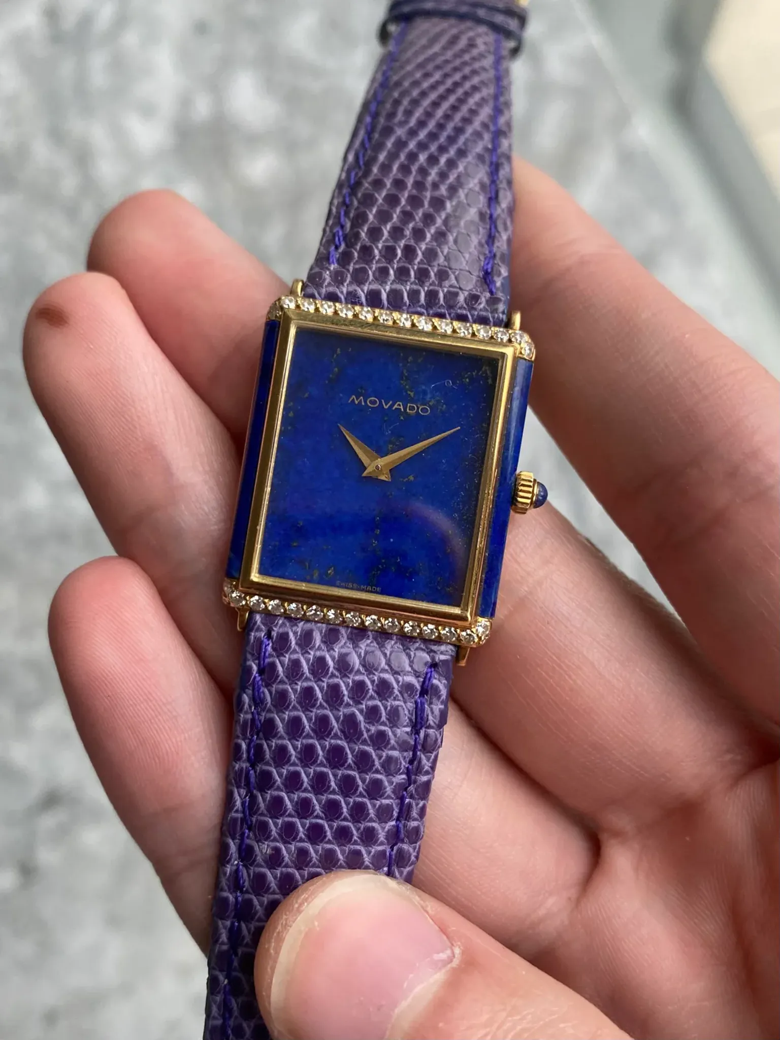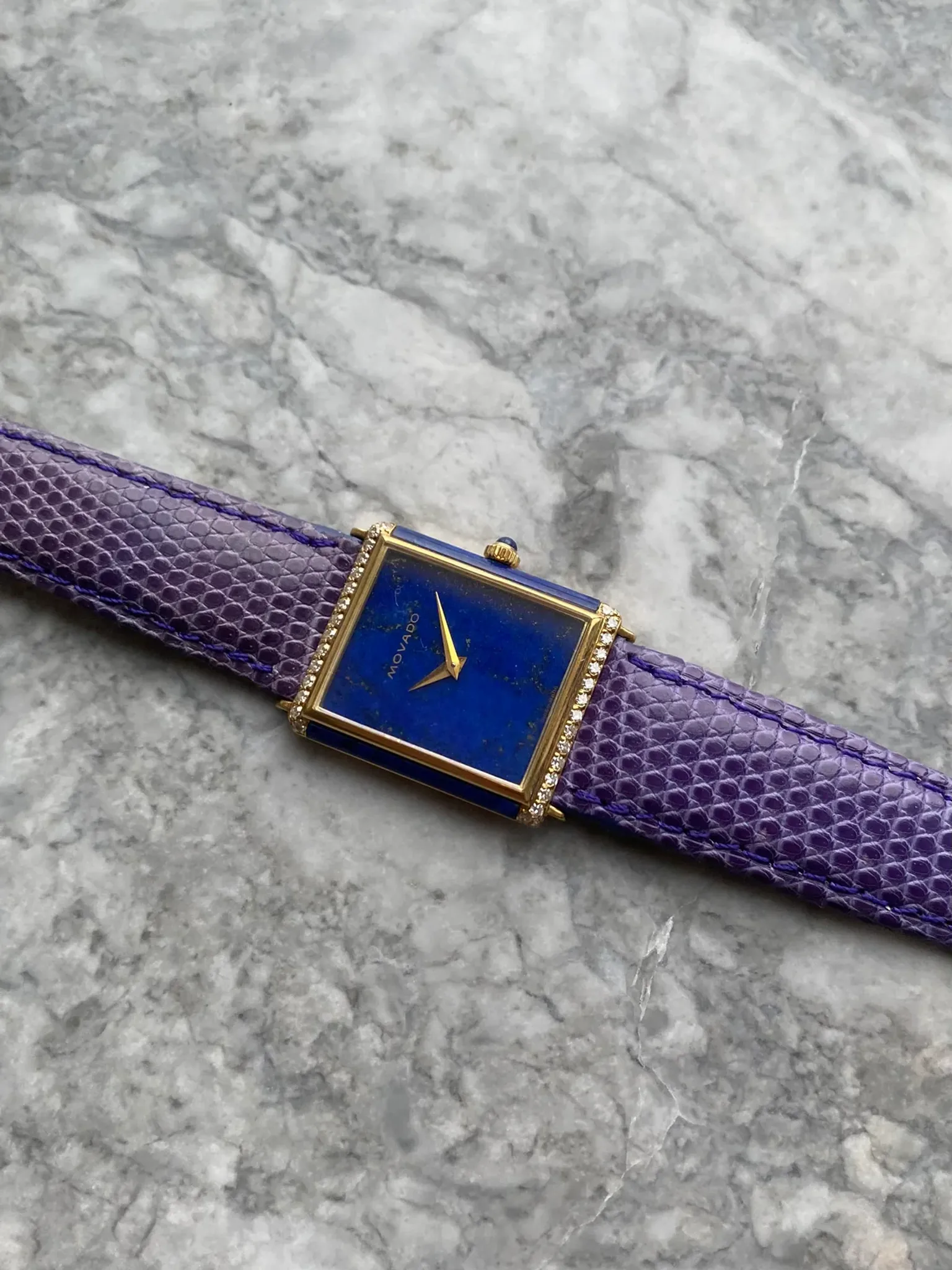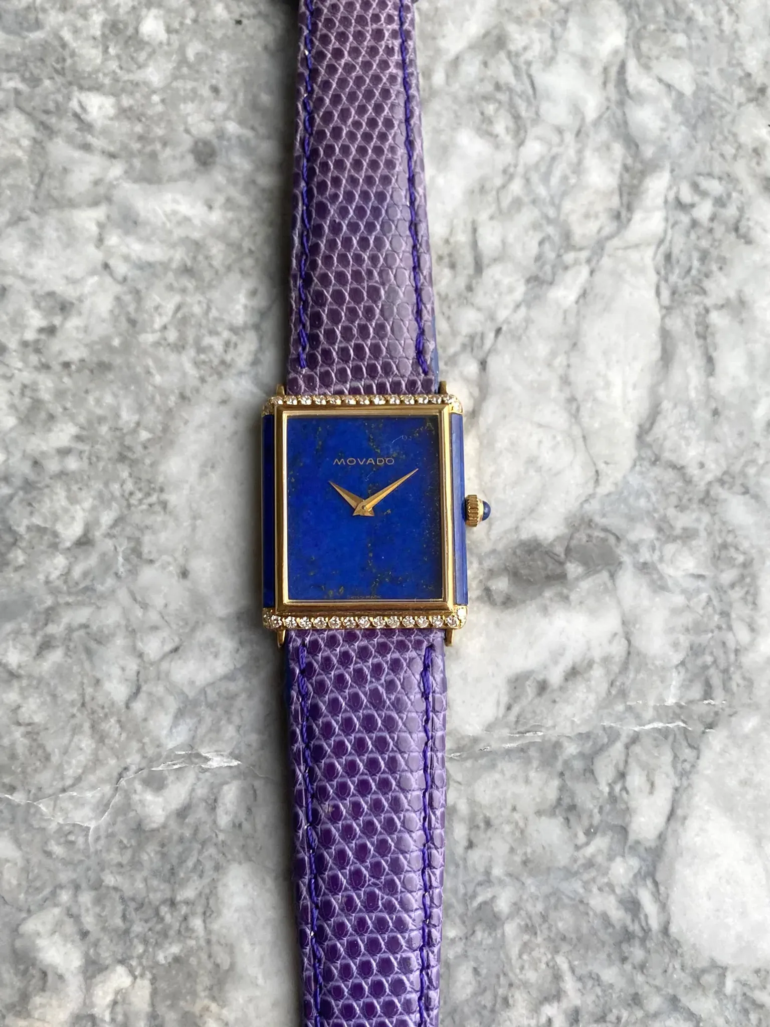 Here's a vintage Movado tank manual wind in 18K yellow gold with a blue lapis dial from the late 70s, early 80s. Keeps great time and is fully functional. Measurements include a 25x32mm tank case size and 18mm lug width. It's on an aftermarket purple lizard strap. Time only. Gold dauphine hands. Serial number on caseback: 422530305. Lapis on the dial, sides of the case, and the cabochon crown! These tanks are quite uncommon especially in this condition. Factory diamond setting on the bezel at both the 6 and 12 a clock position. The dial and the crystal is free from any scratches or marks. Makes for a great alternative from brands such as Piaget and Cartier. All parts are original including the dial, crown, movement, and caseback. Both the dial and case are in great cosmetic, untouched condition.