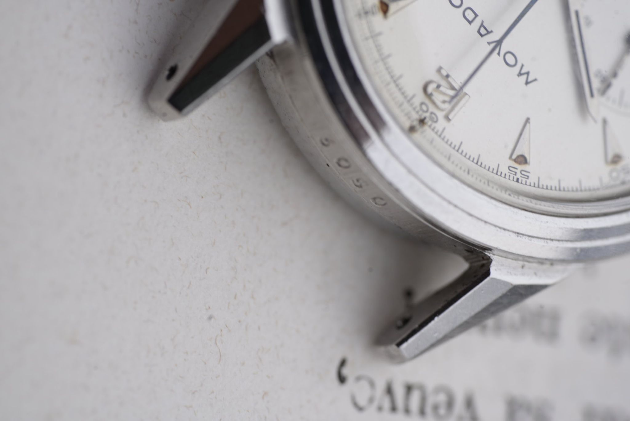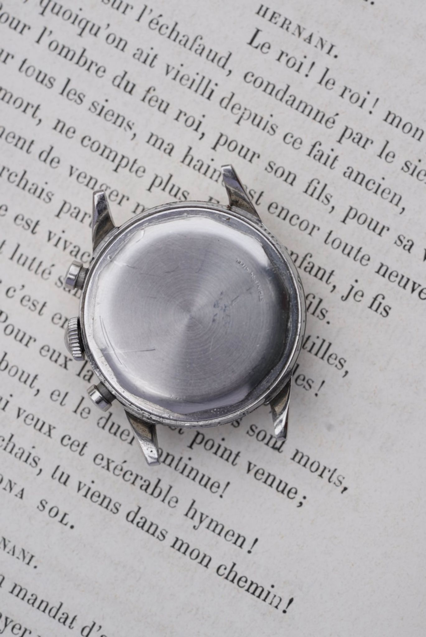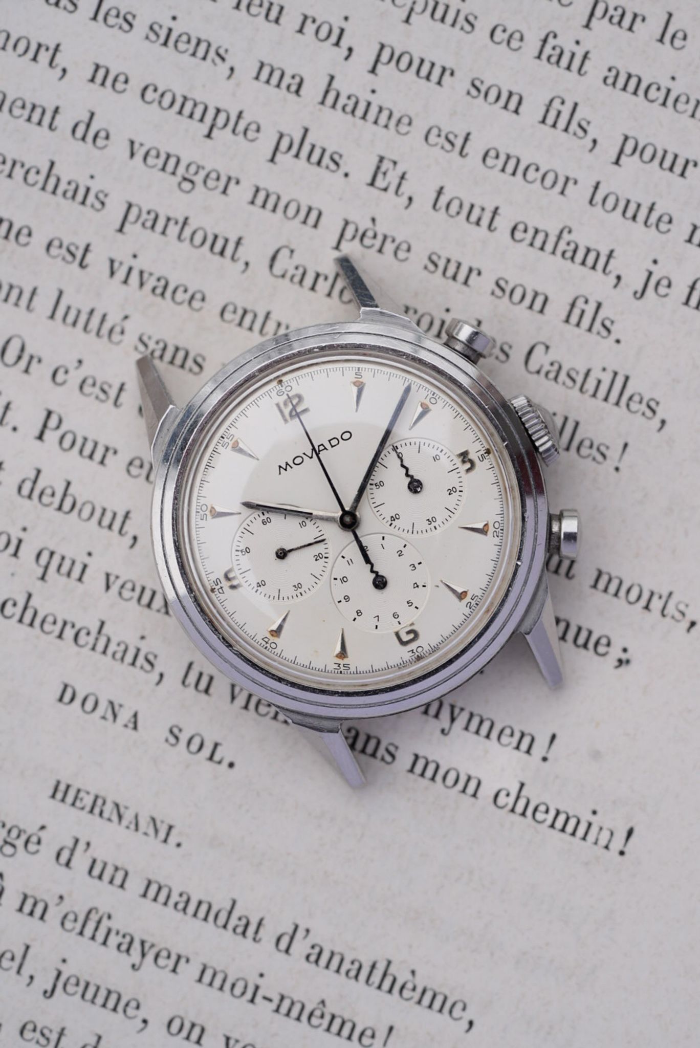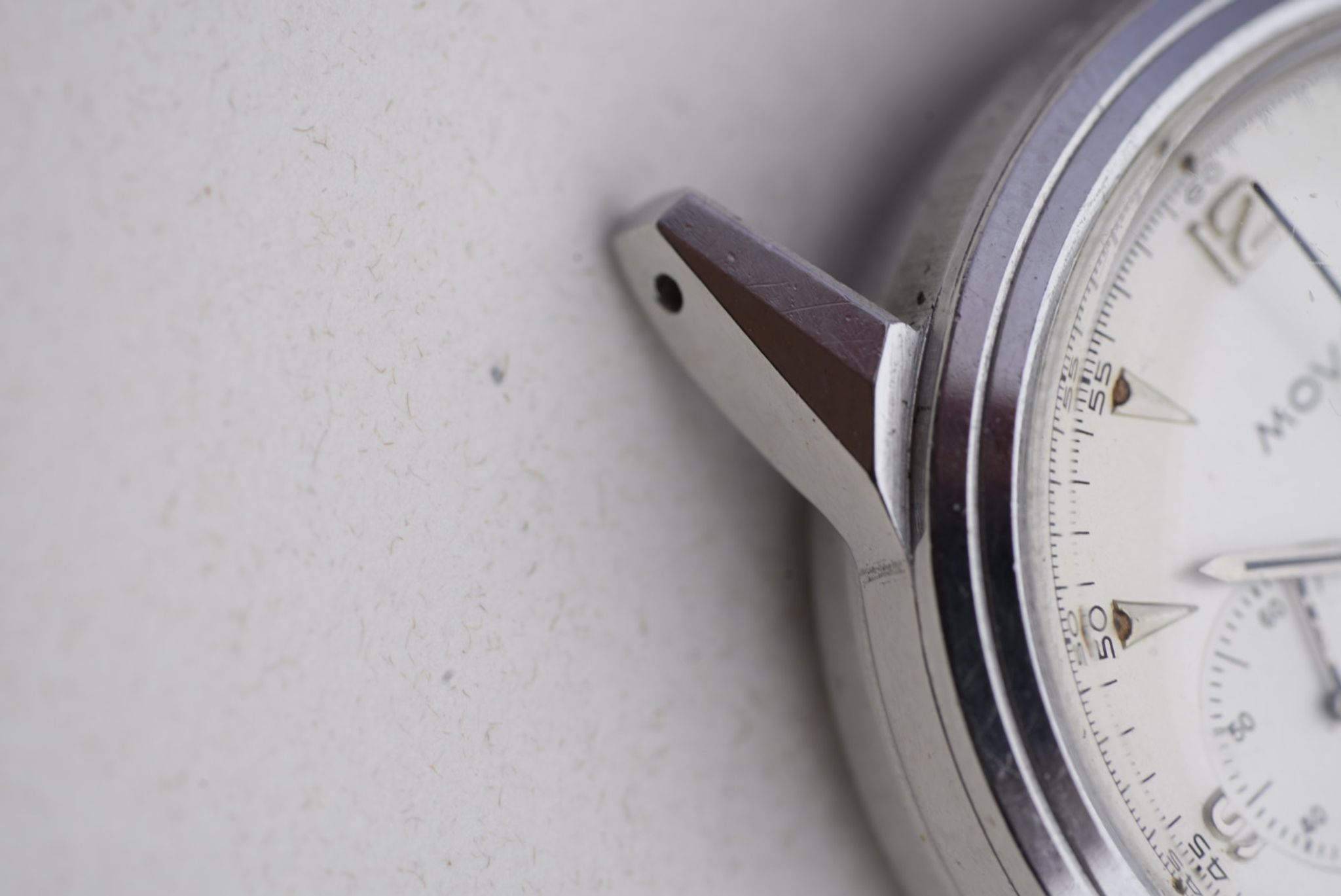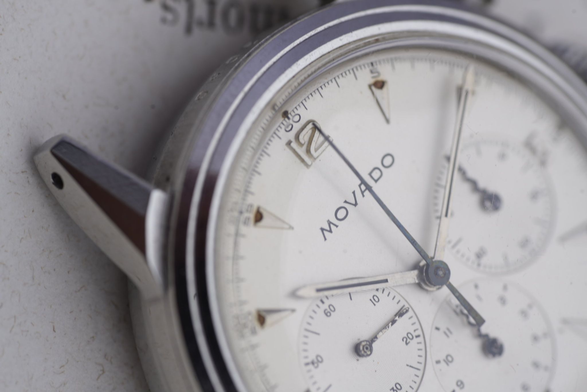 This Movado Chronograph Ref. 19038, produced in the 1940s, is a rare first-generation example featuring the combination of a triple-step case, faceted lugs, and a decagonal screw-back.