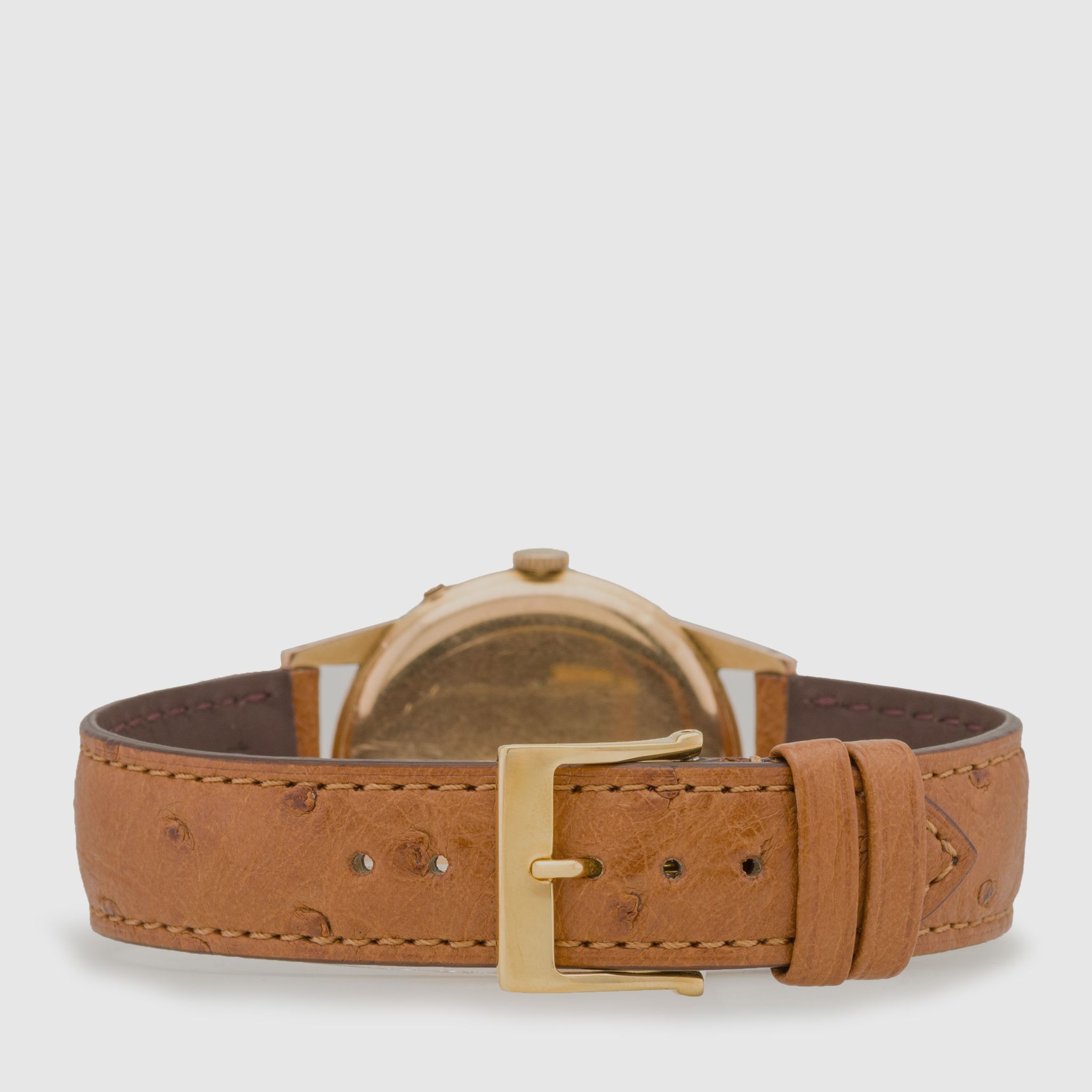 Bracelet/Strap: Cognac color Camille Fournet Ostrich strap with generic gold plated pin buckle.