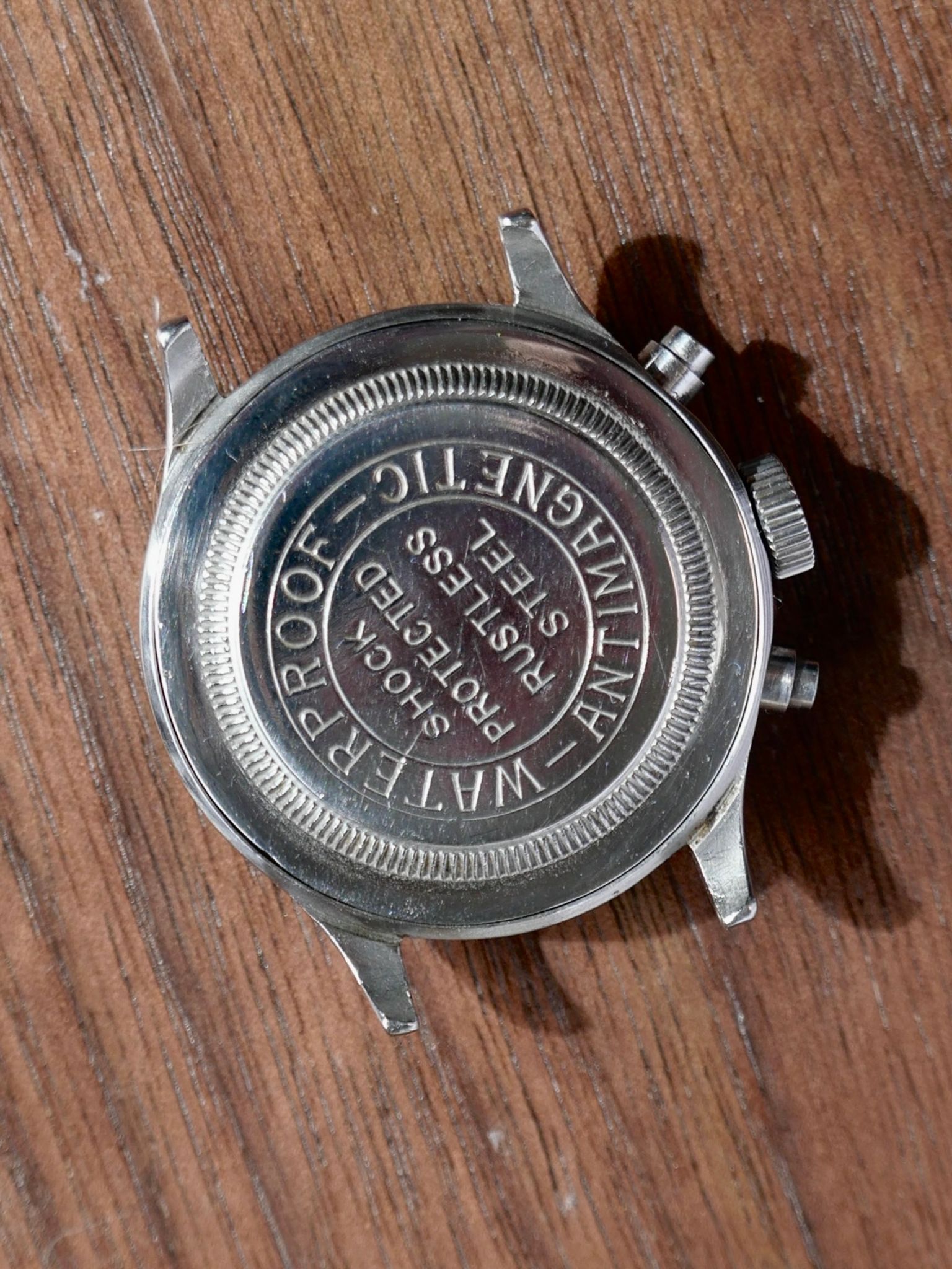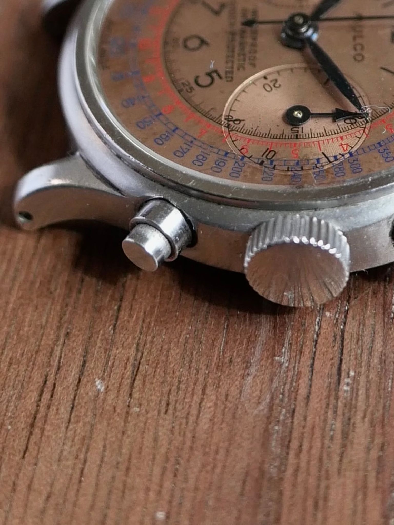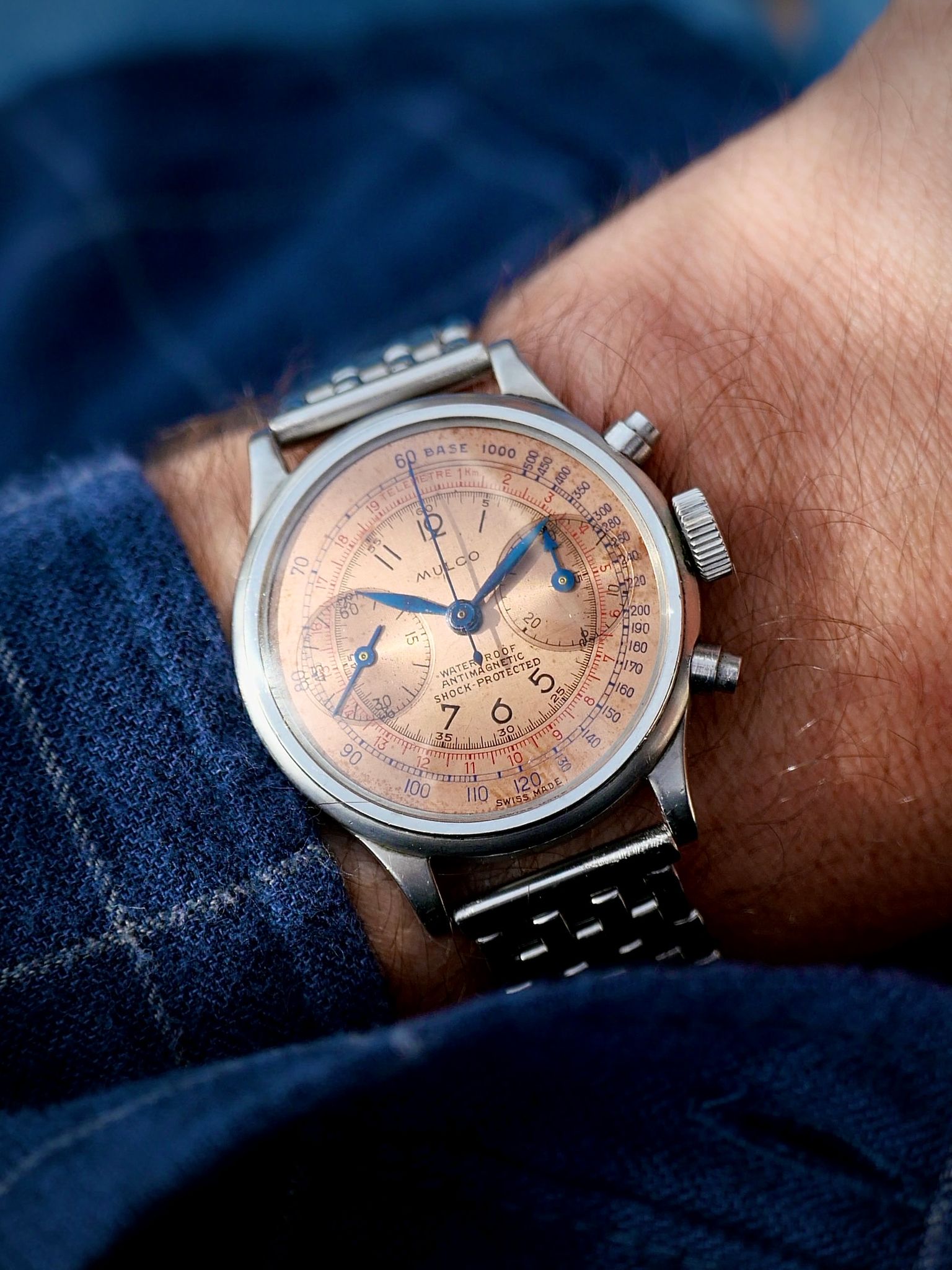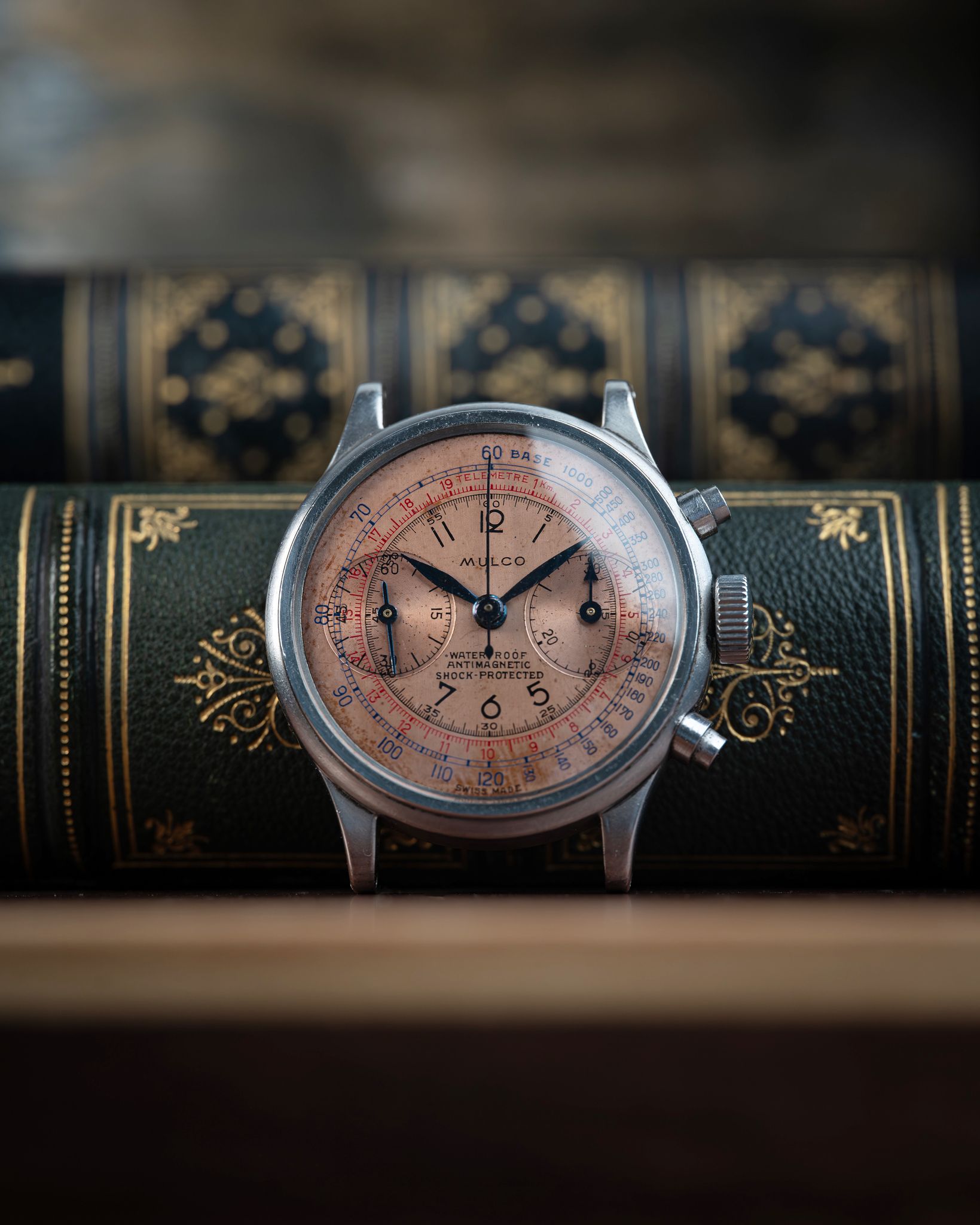 This exceptional timepiece is a Rare Mulco Chronograph from the 1940s, boasting antimagnetic, antishock, and waterproof features. Encased in the rarest Spillman case in 35mm with inverted pushers, it houses a manual winding movement caliber Valjoux 23. With its salmon dial and blue hands, every aspect of this watch is original and exudes elegance. Its lovely salmon dial adds to its impressive and refined appeal.
