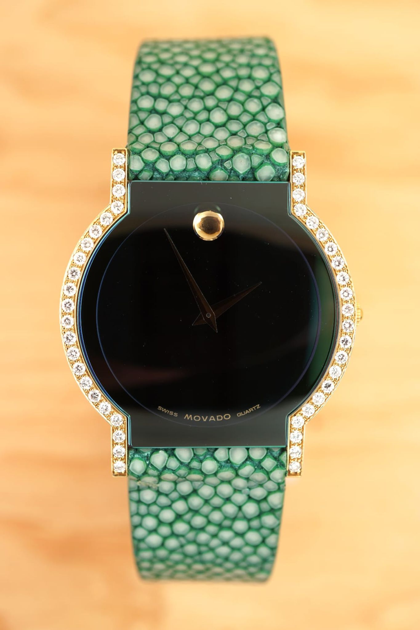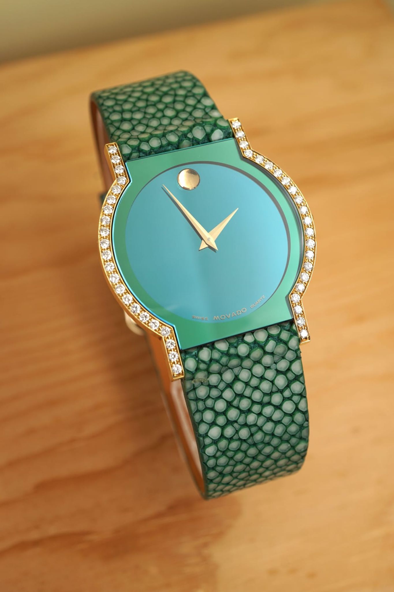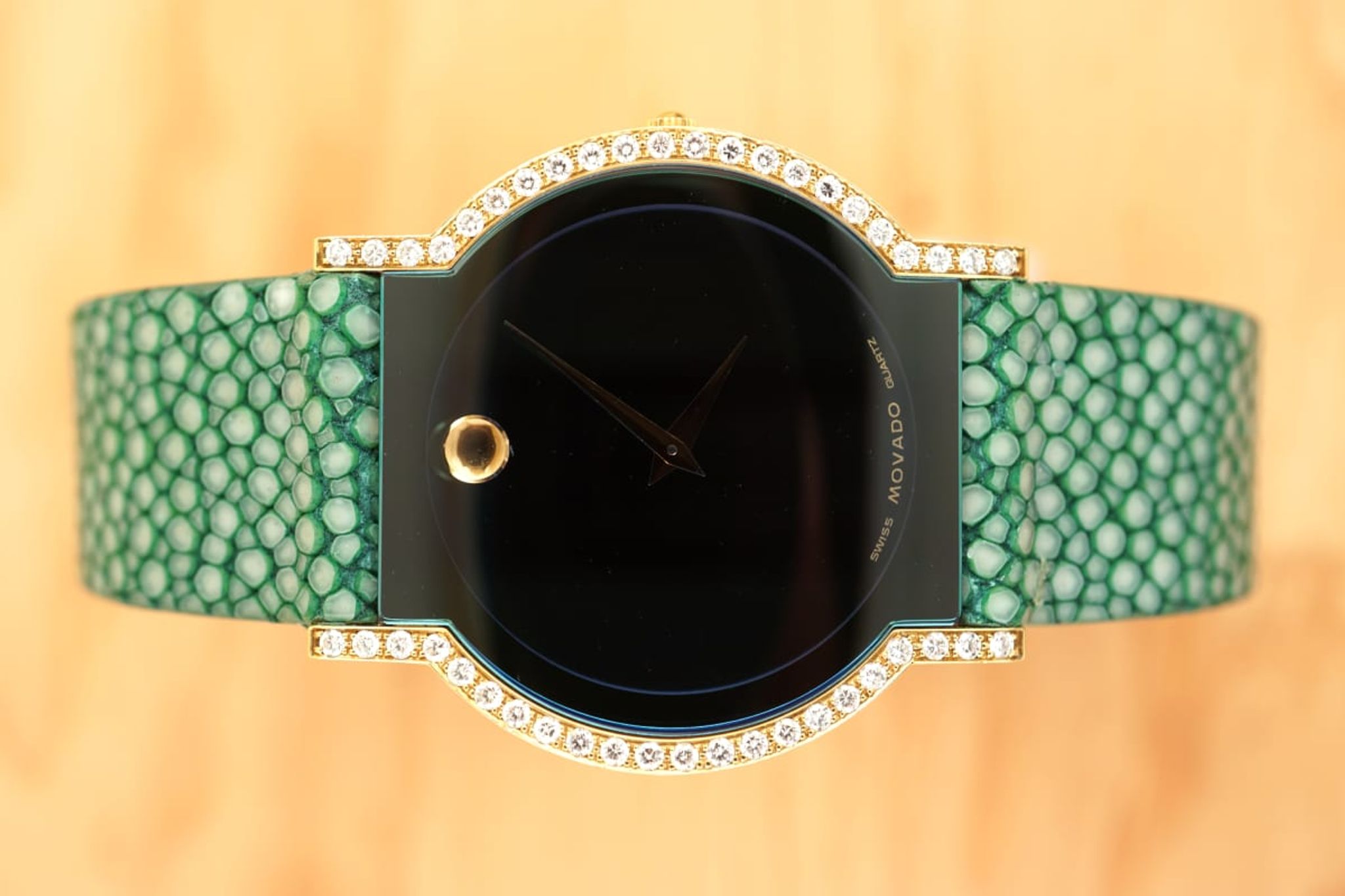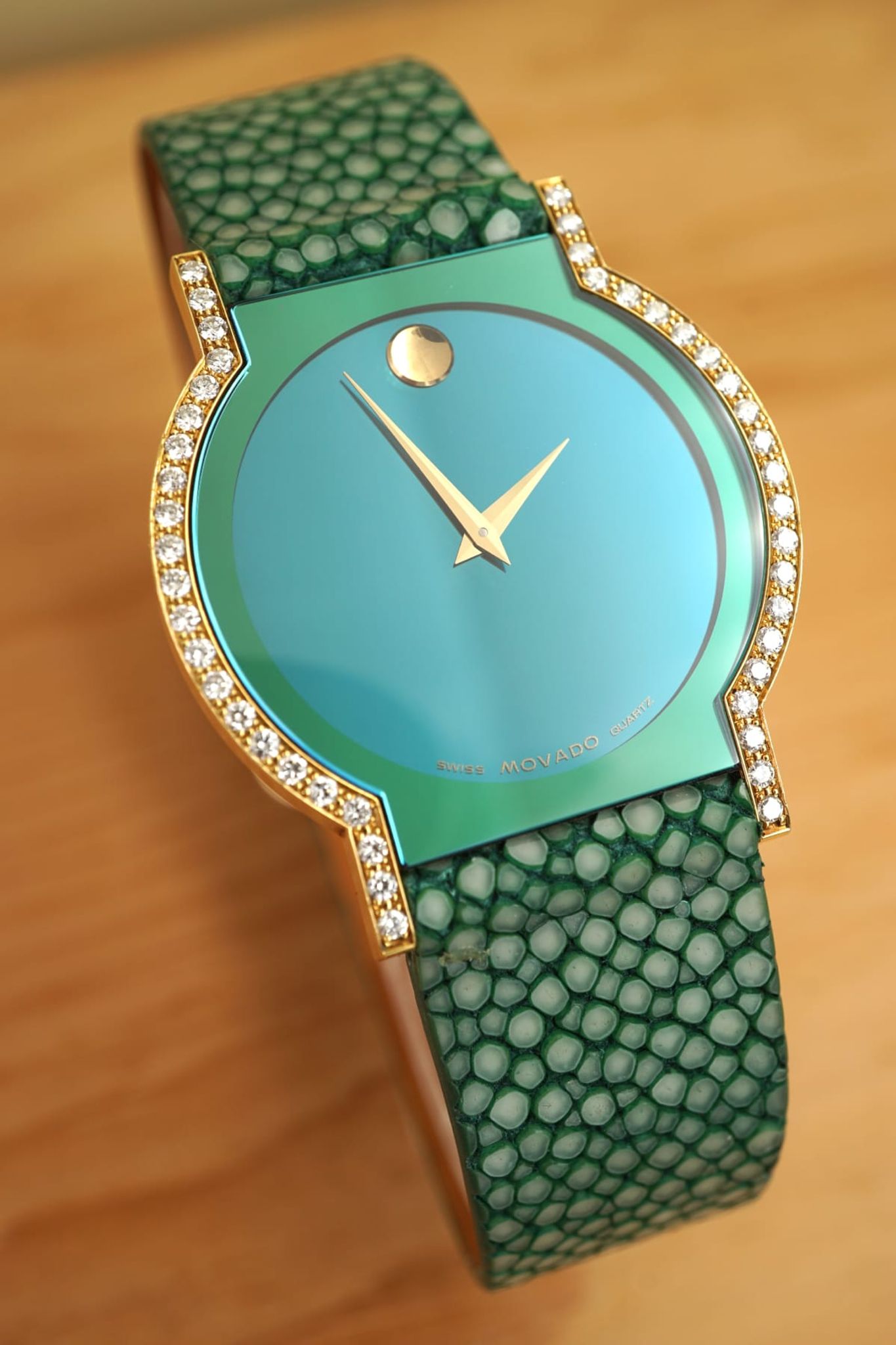 WHY WE LOVE IT? Because it is probably the most spectacular Movado Museum: 18K solid gold & factory-set diamonds decorate a mirroring green-blue morpho-dial under a curved sapphire-crystal.