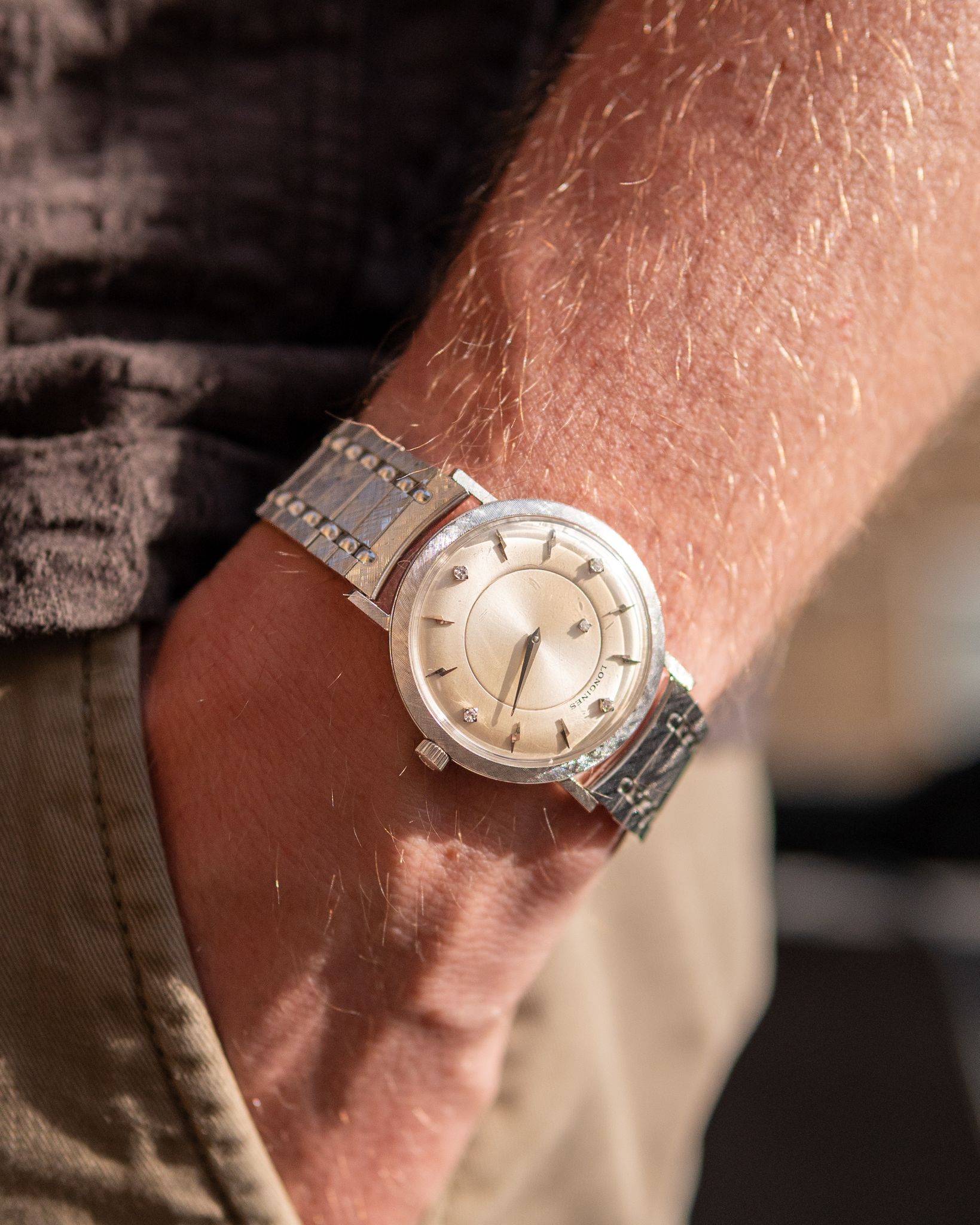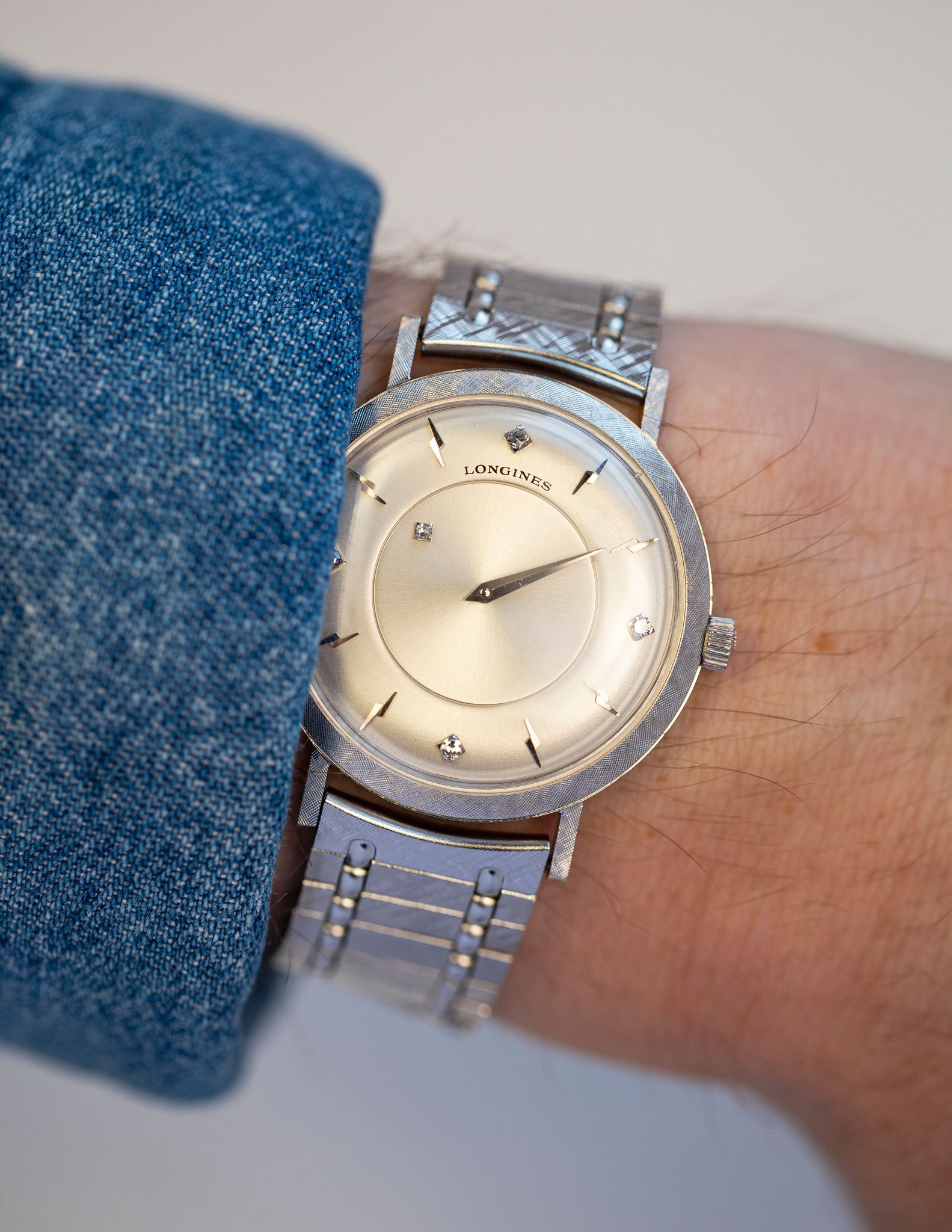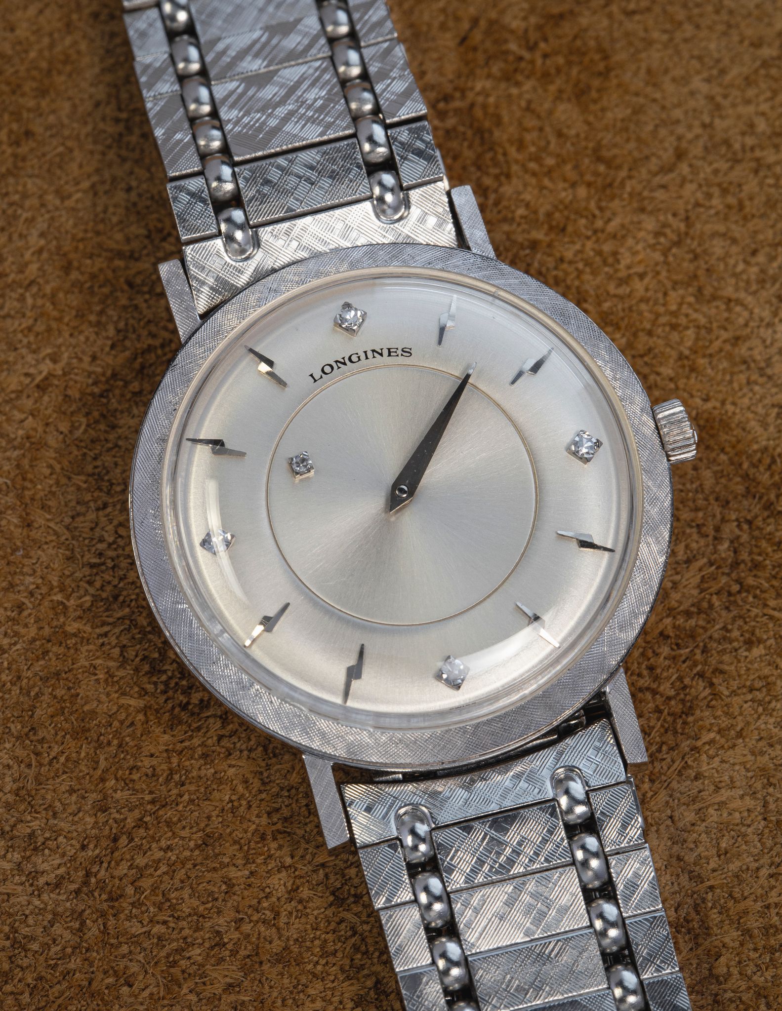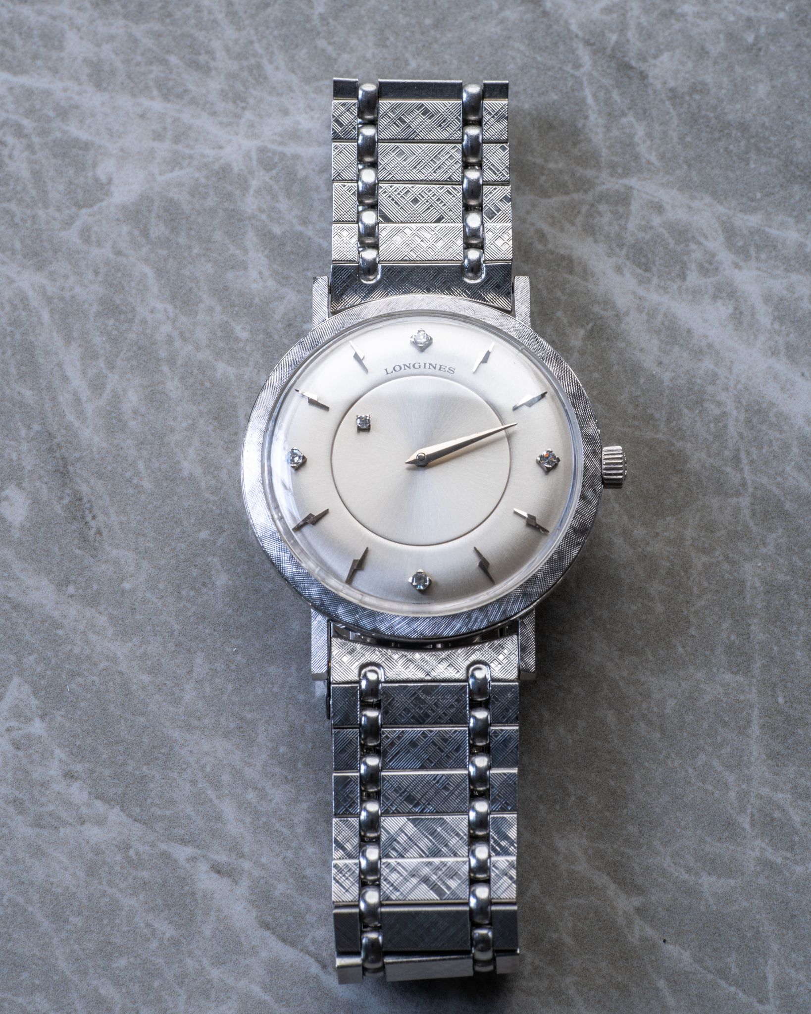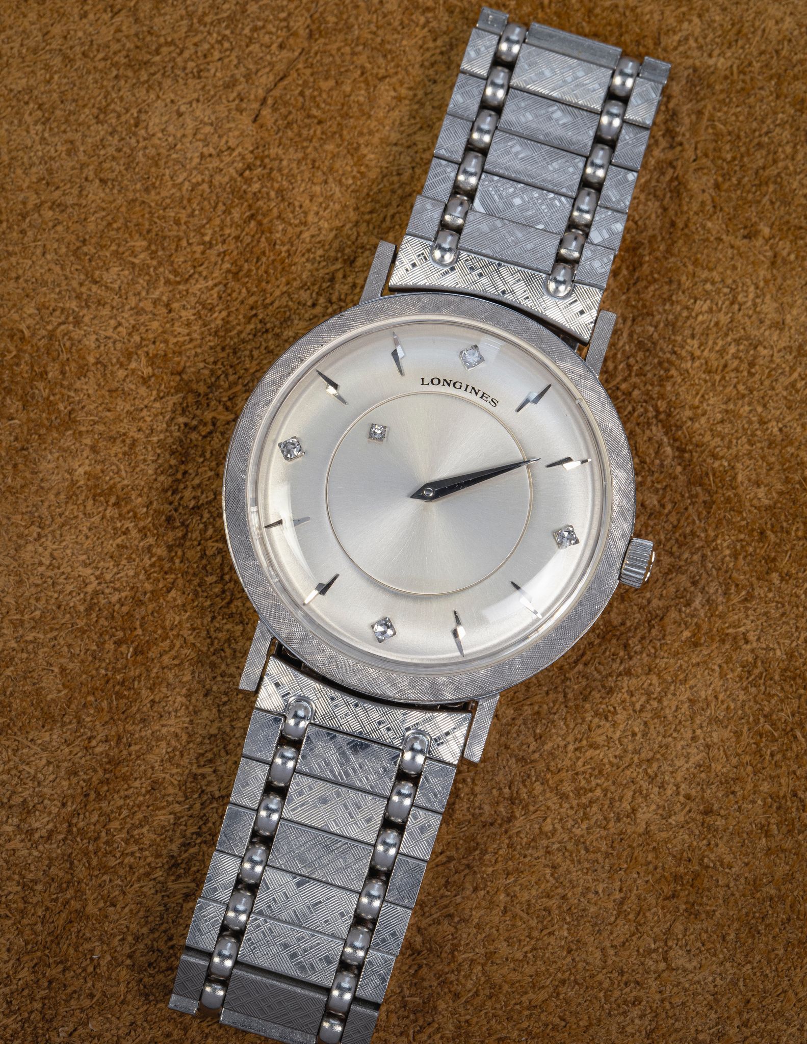 A beautifully preserved Longines Mystery Dial from the 50's, hewn in a 14k white gold with florentine finish, made for the American market, featuring diamond and lightning bolt markers.