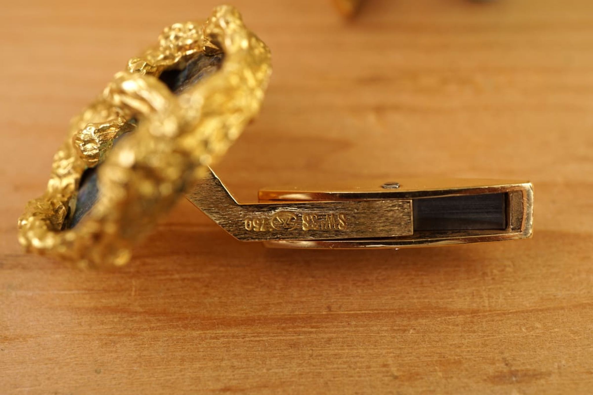 Made in the 1970s by Gubelin (stamped) in 18K-yellowgold and highest quality as one expects from the goldsmith-artisans from Lucerne, Gubelin. The iconic 1970s naturlistic design is attributed to Gilbert Albert and the "stonedials" are shimmering so colorful and are of course in immaculate condition.