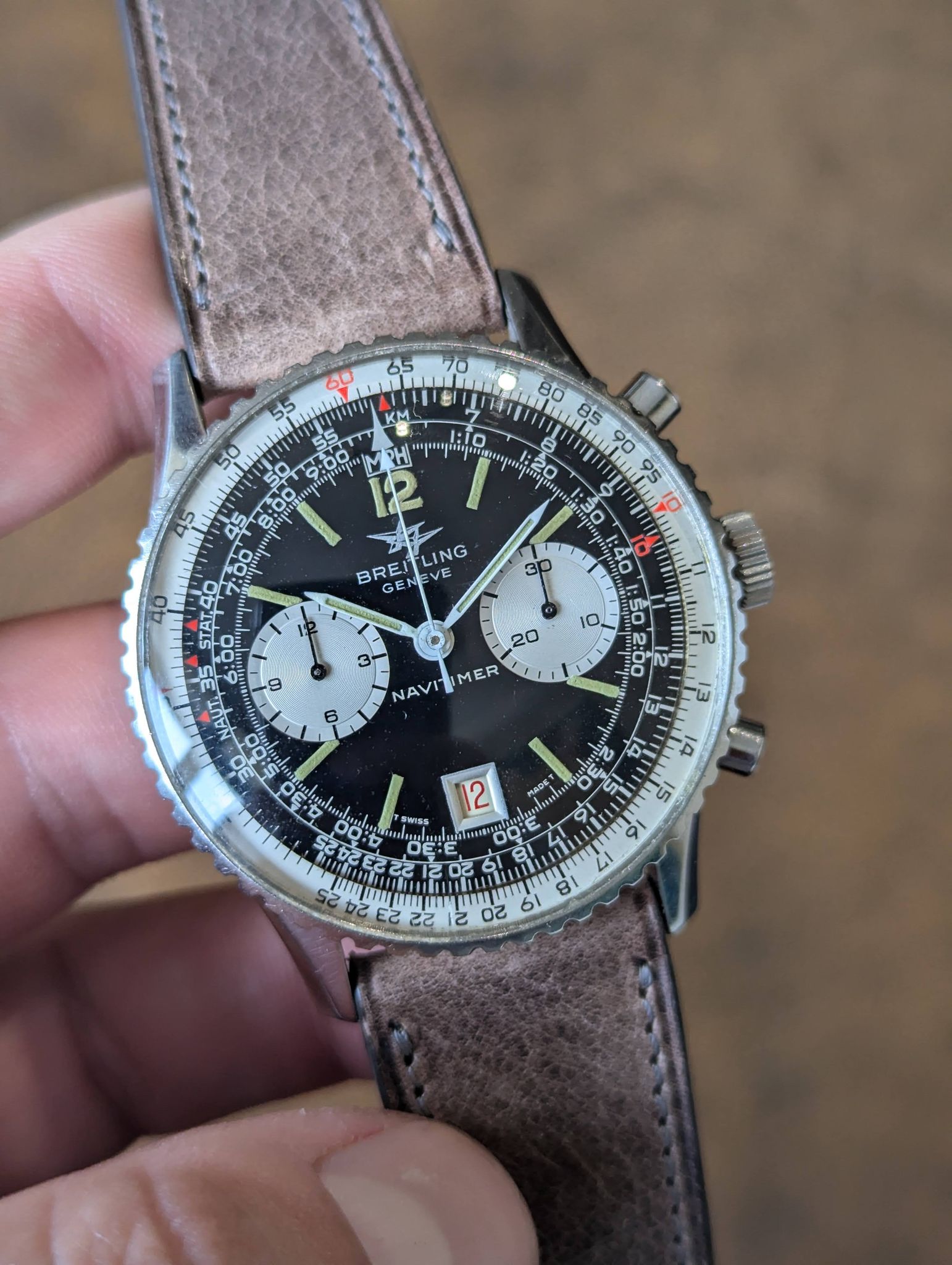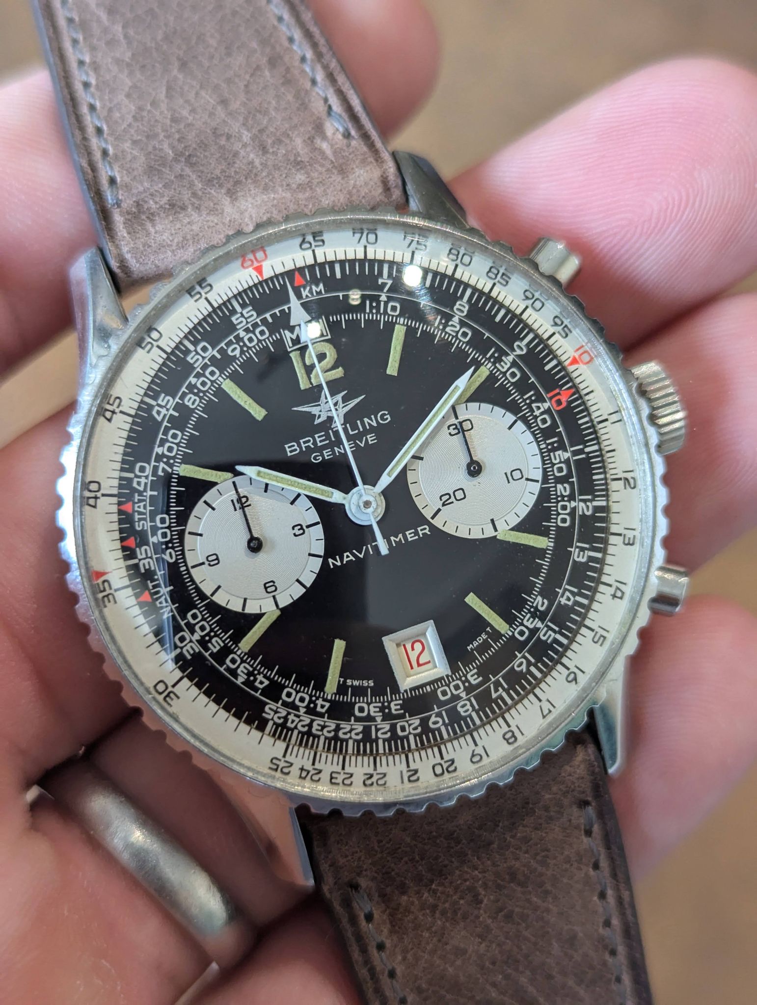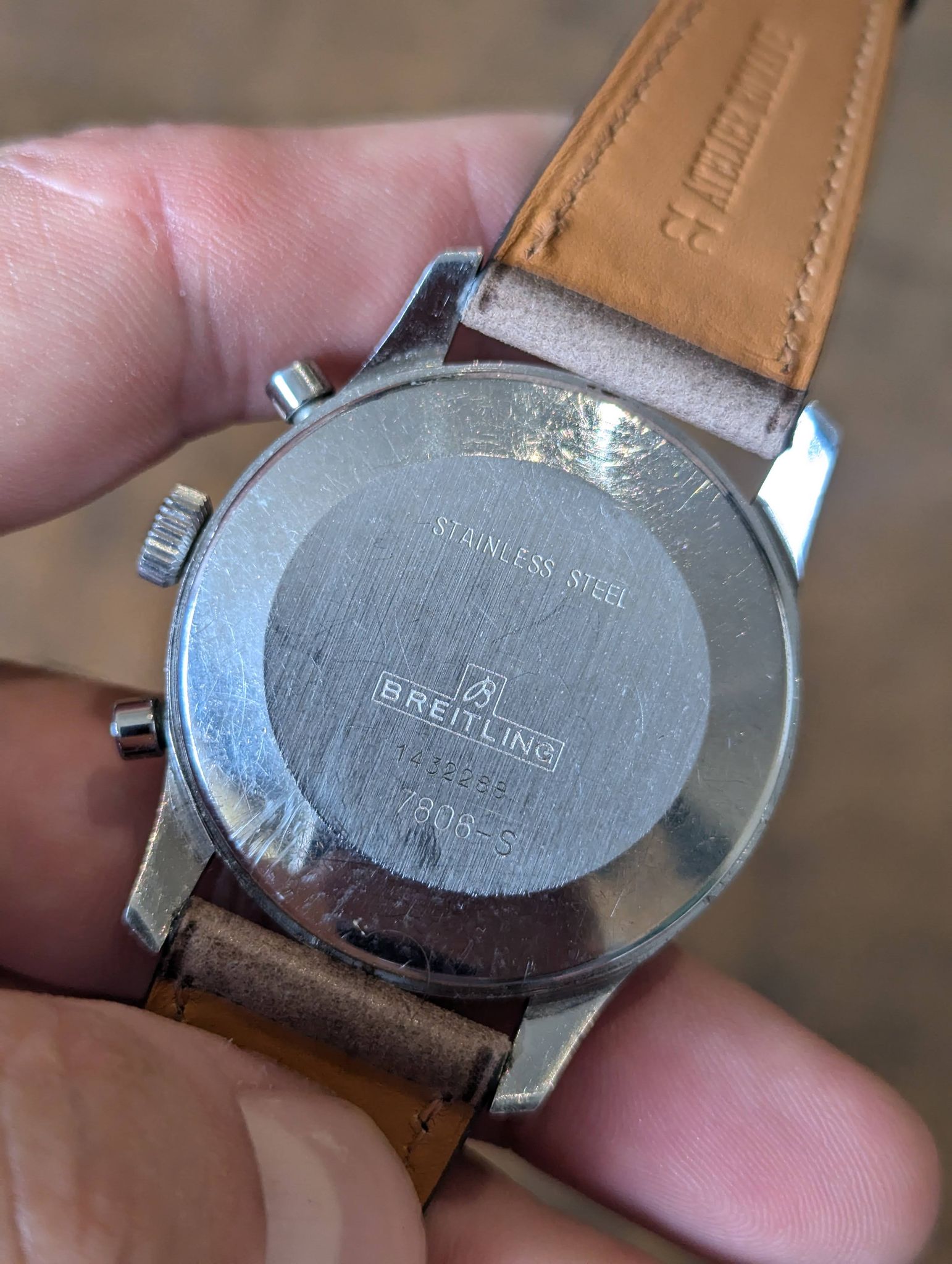 The Navitimer ref. 7806-S has “Big Eyes” hour and minute counters, but no small seconds sub-dial at 6 o'clock, where the date display is located.