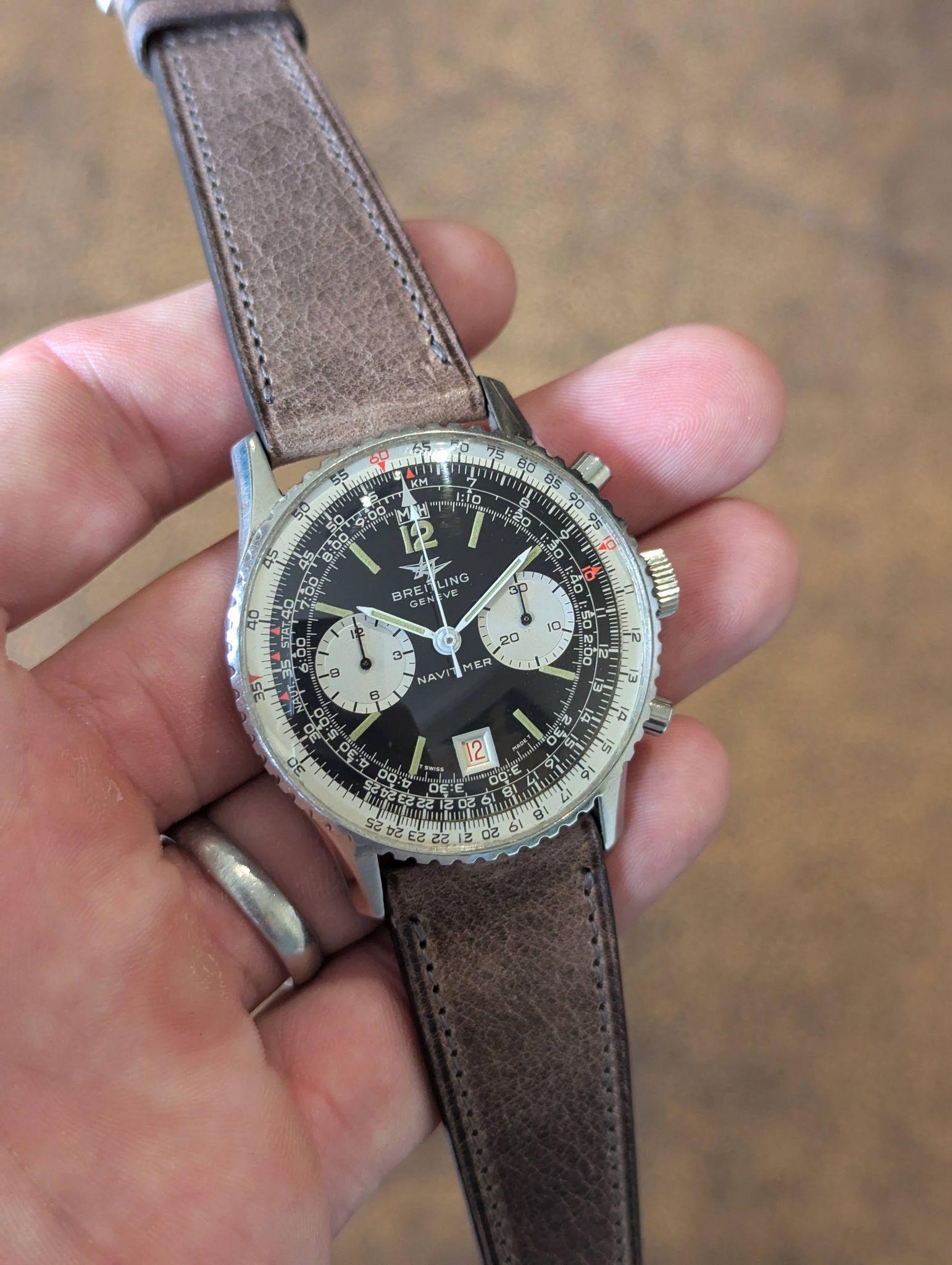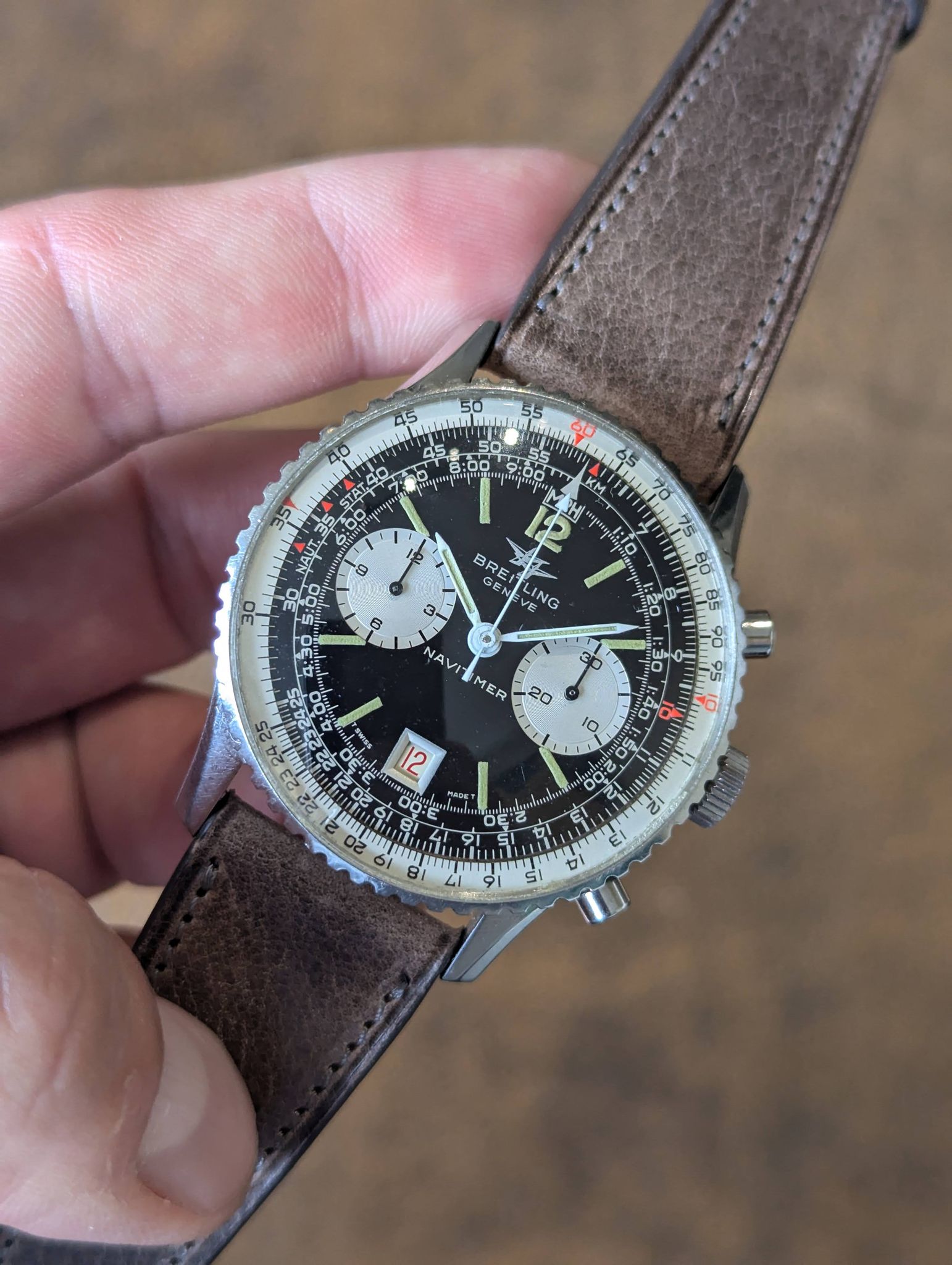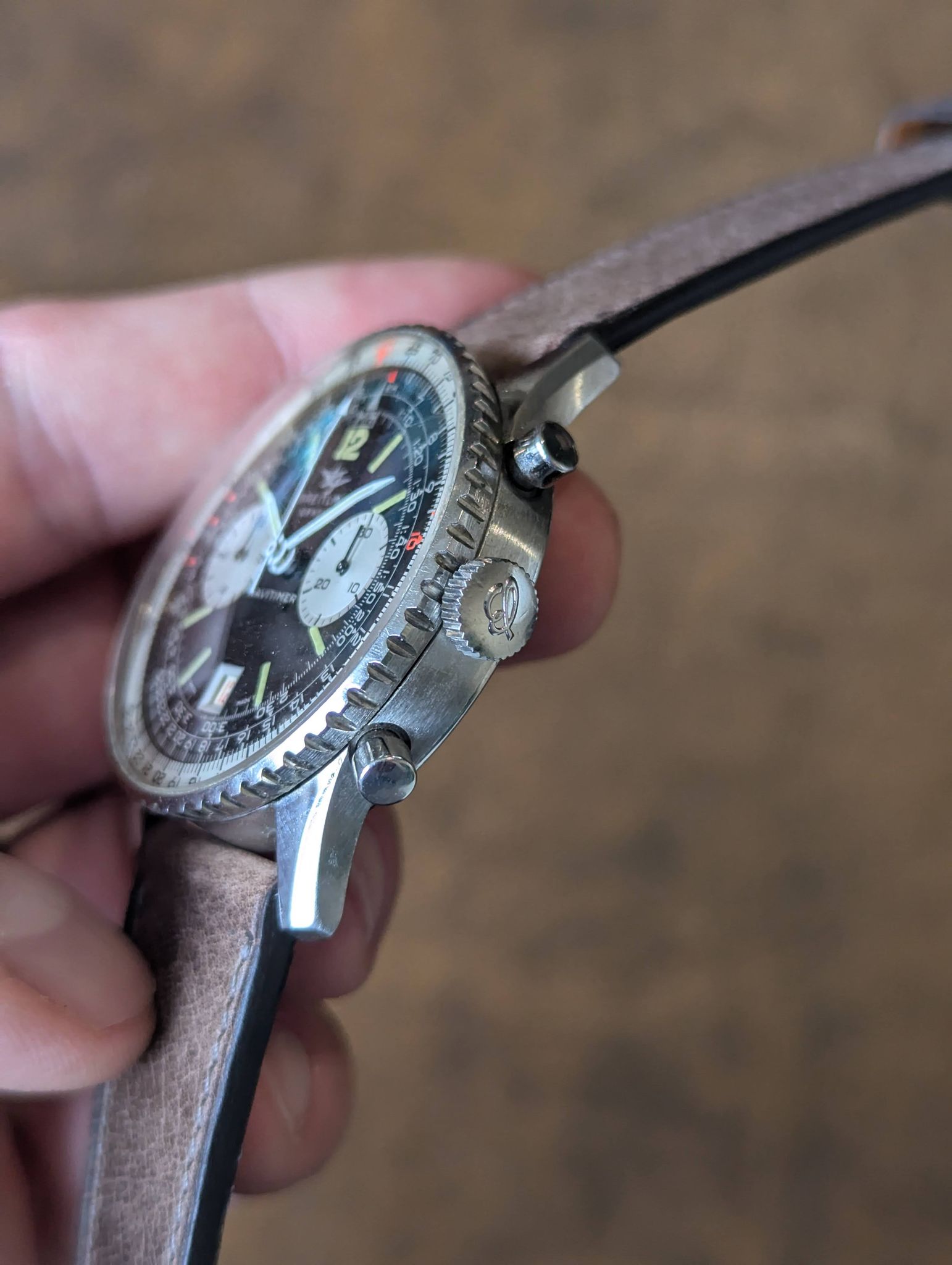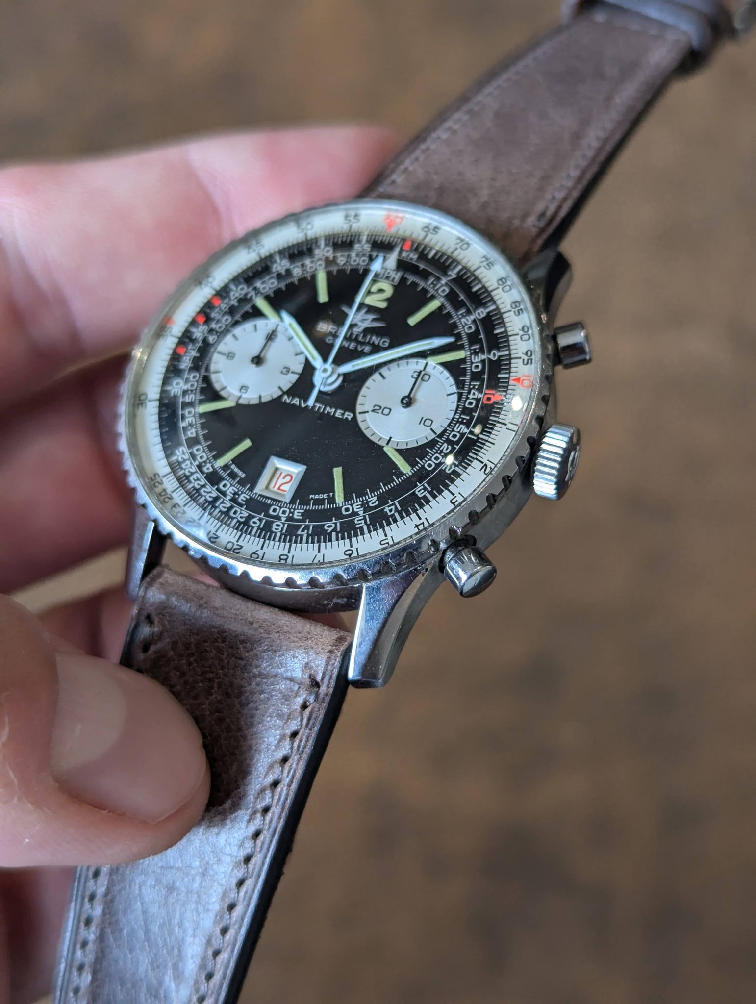 The Navitimer ref. 7806-S has “Big Eyes” hour and minute counters, but no small seconds sub-dial at 6 o'clock, where the date display is located.