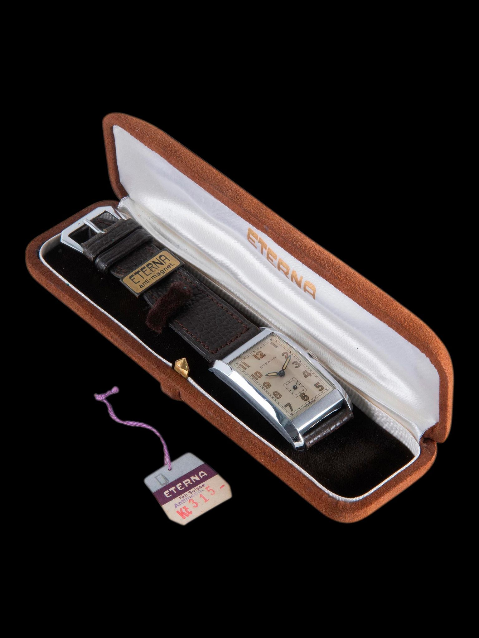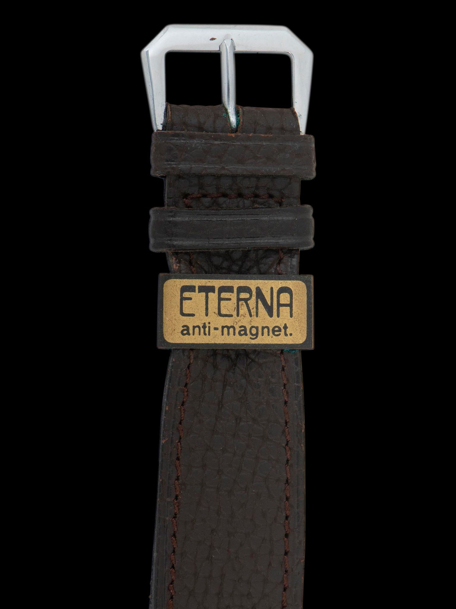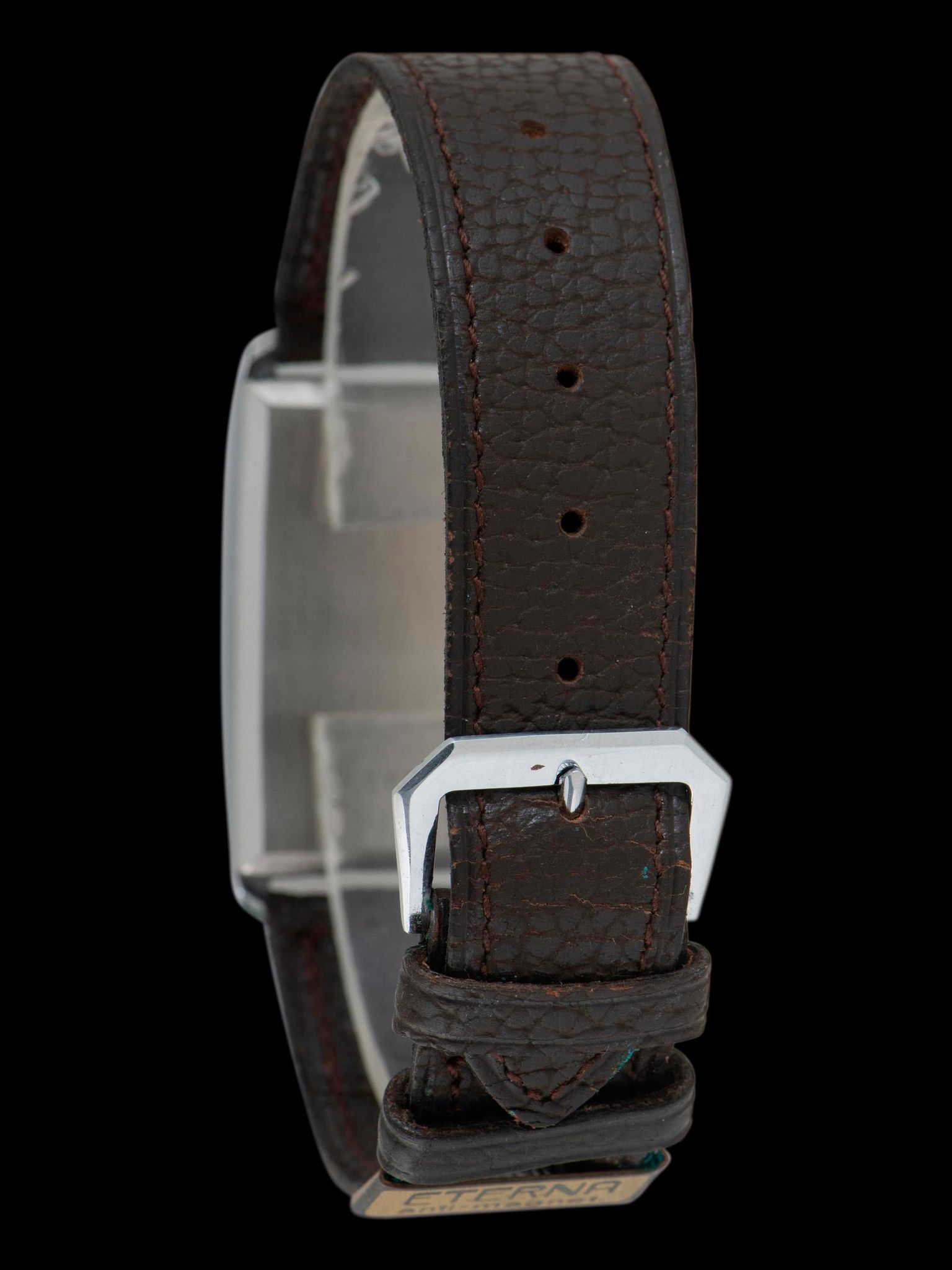 The beautiful and virtually unworn Cintree-esque rectangular case has remained unpolished all these years and retains its incredible lines and symmetrical, beveled lugs. The watch retains its original unsigned crown. The caseback is clean with zero signs of use, its factory brushing is still very apparent, and its engraved serial number is in clear and legible condition. The watch is supplied with its original Eterna two-piece leather strap, attached to the fixed strap bars, with the original unsigned tang buckle, and "Eterna anti-magnet" clip.