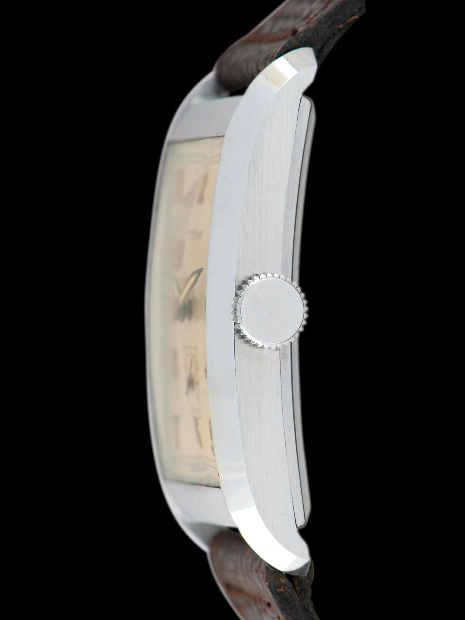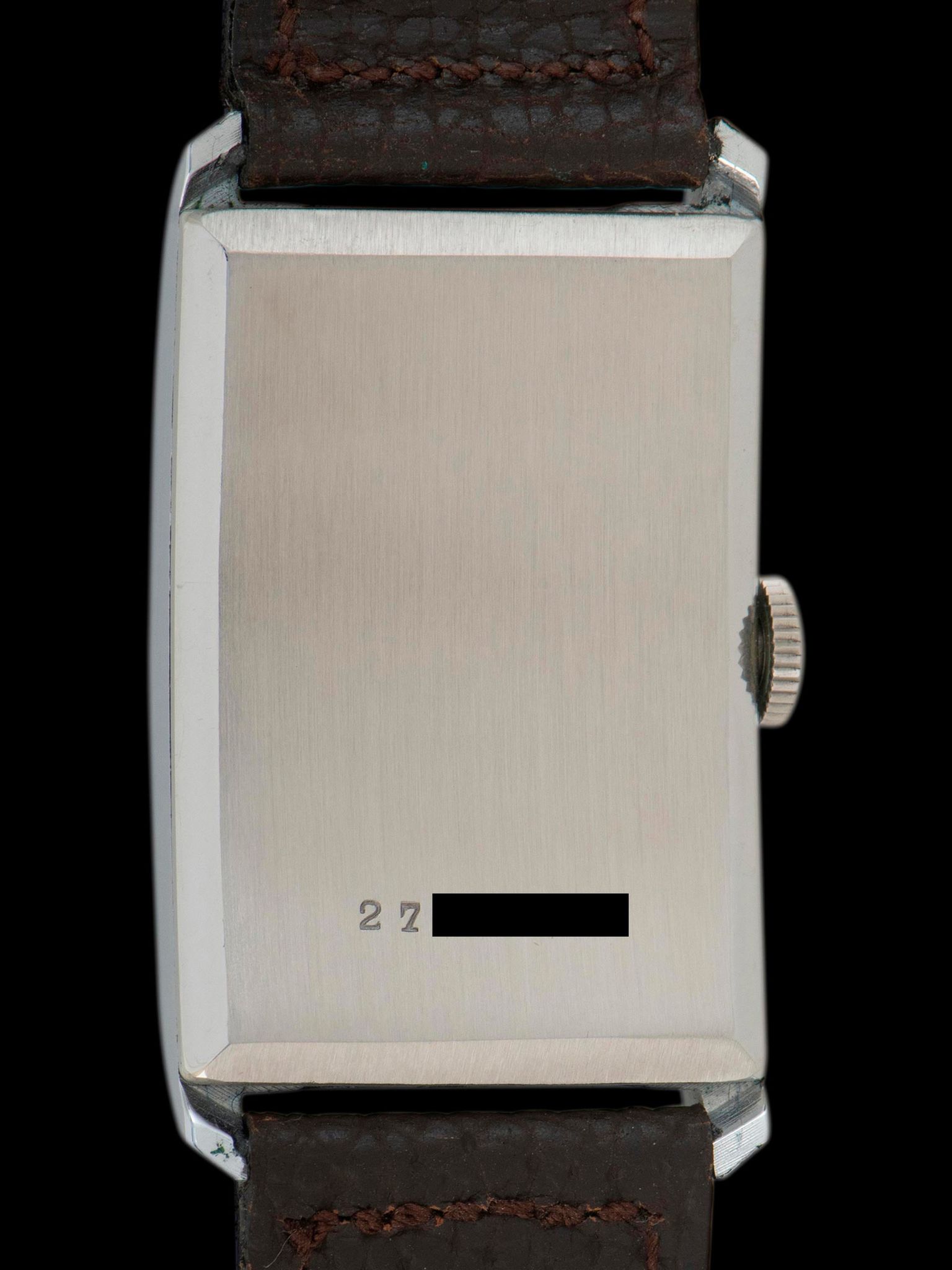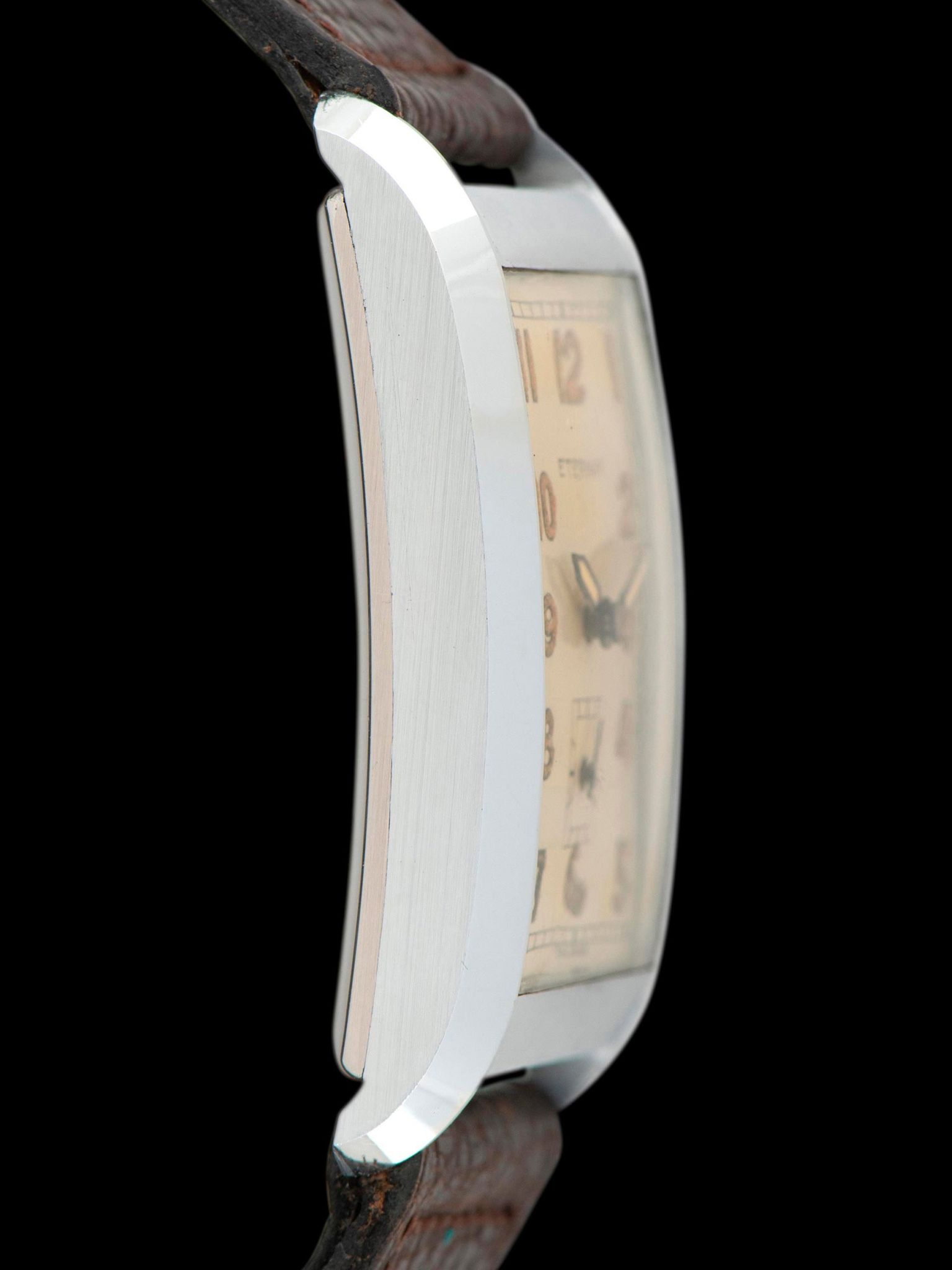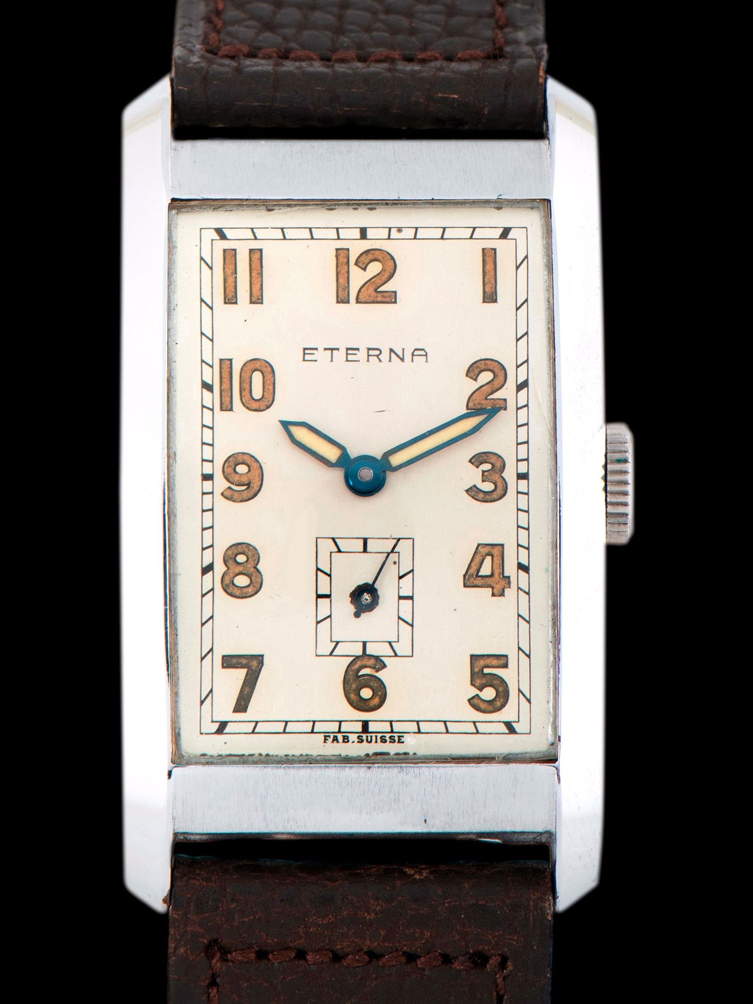 The beautiful and virtually unworn Cintree-esque rectangular case has remained unpolished all these years and retains its incredible lines and symmetrical, beveled lugs. The watch retains its original unsigned crown. The caseback is clean with zero signs of use, its factory brushing is still very apparent, and its engraved serial number is in clear and legible condition. The watch is supplied with its original Eterna two-piece leather strap, attached to the fixed strap bars, with the original unsigned tang buckle, and "Eterna anti-magnet" clip.
