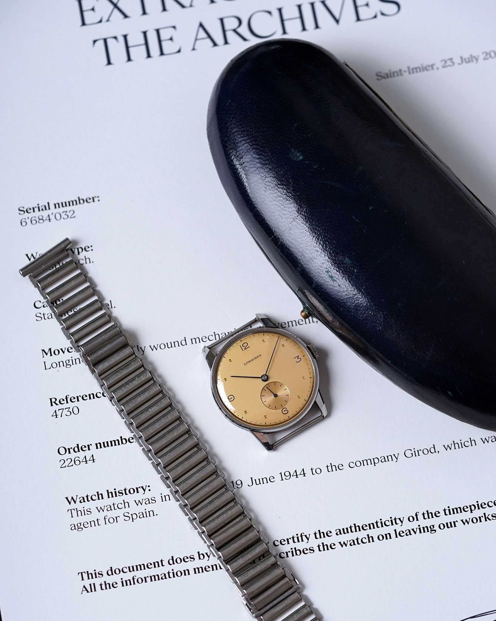 According to the Longines extract from the archives, the original serial number 6684xxx identifies a wristwatch in stainless steel bearing the reference 4730. It is fitted with a Longines manually wound mechanical movement, caliber 23M. It was invoiced on 19 June 1944 to the company Girod, in Spain.